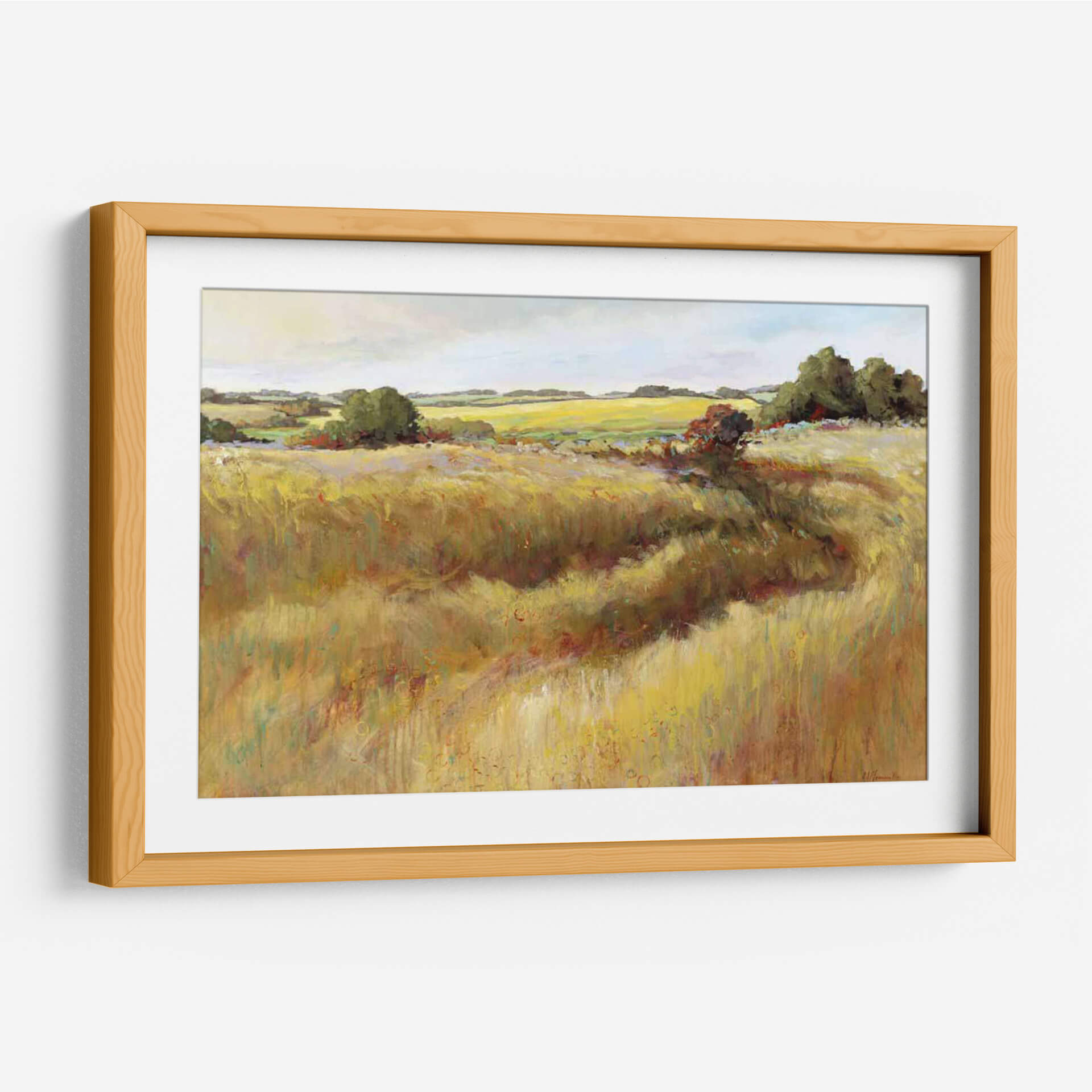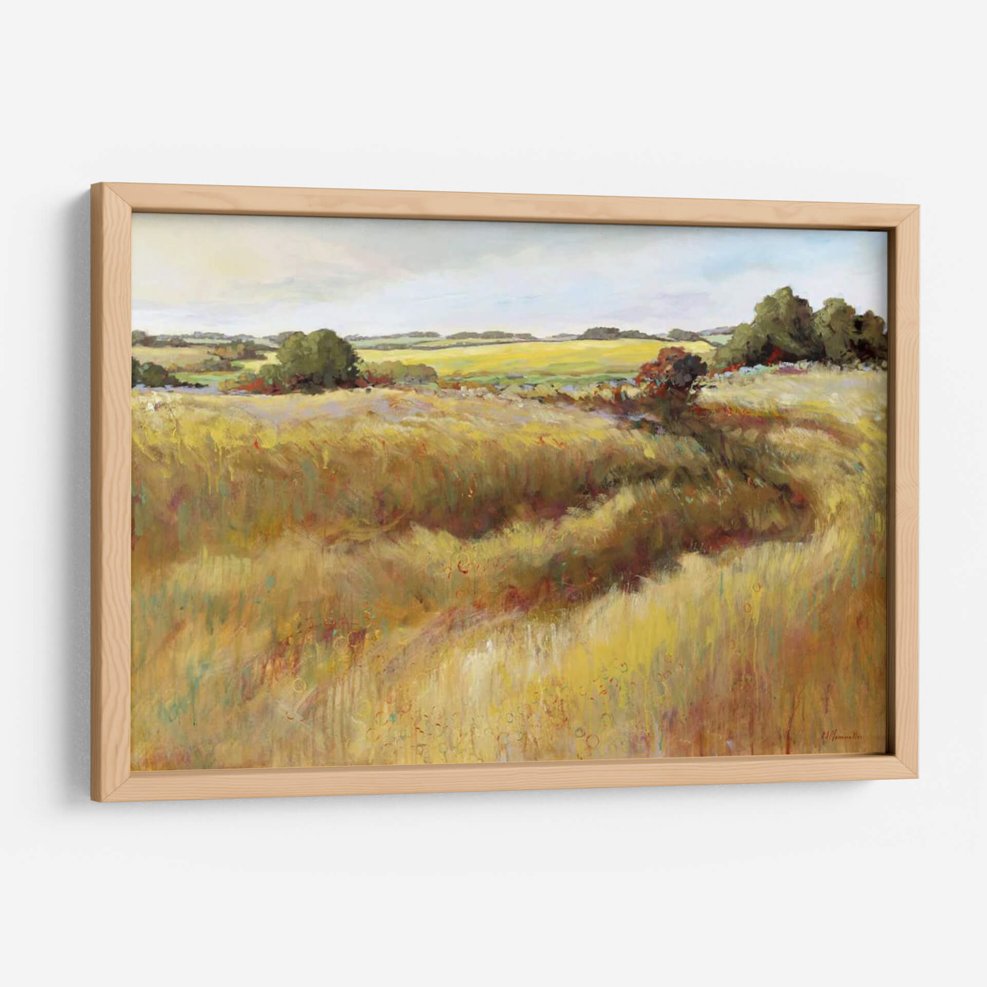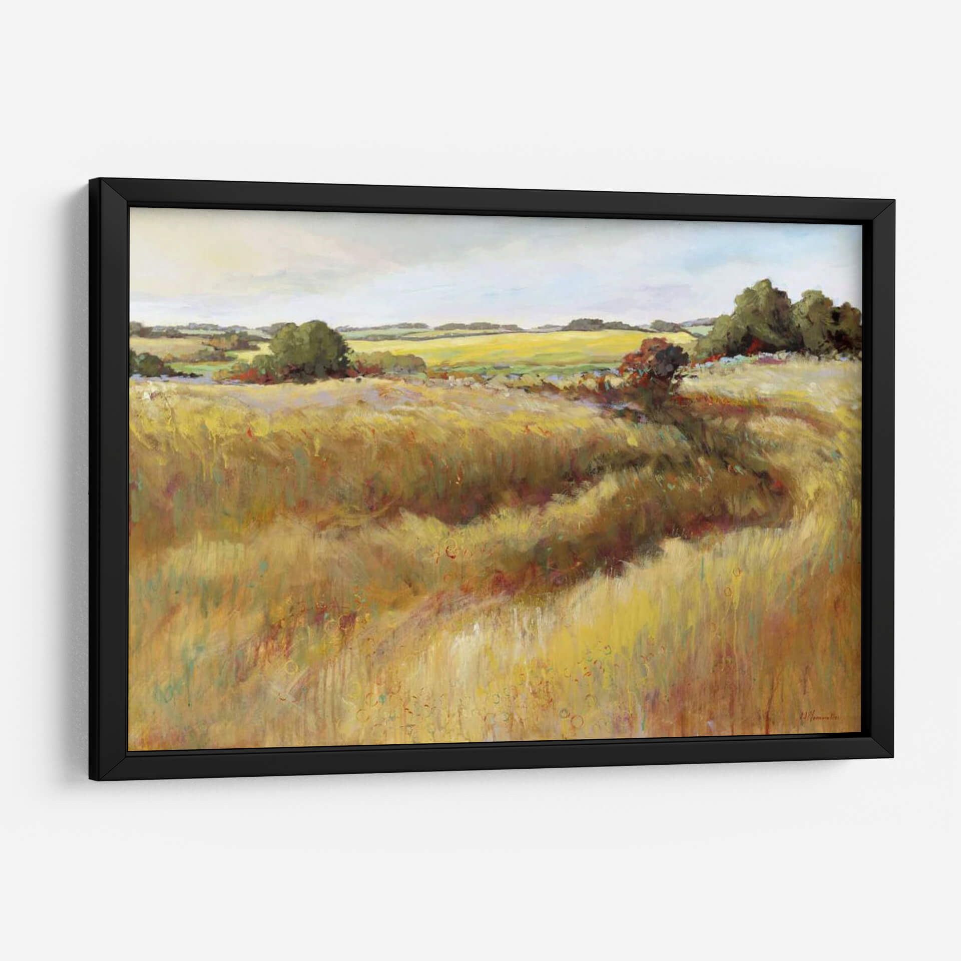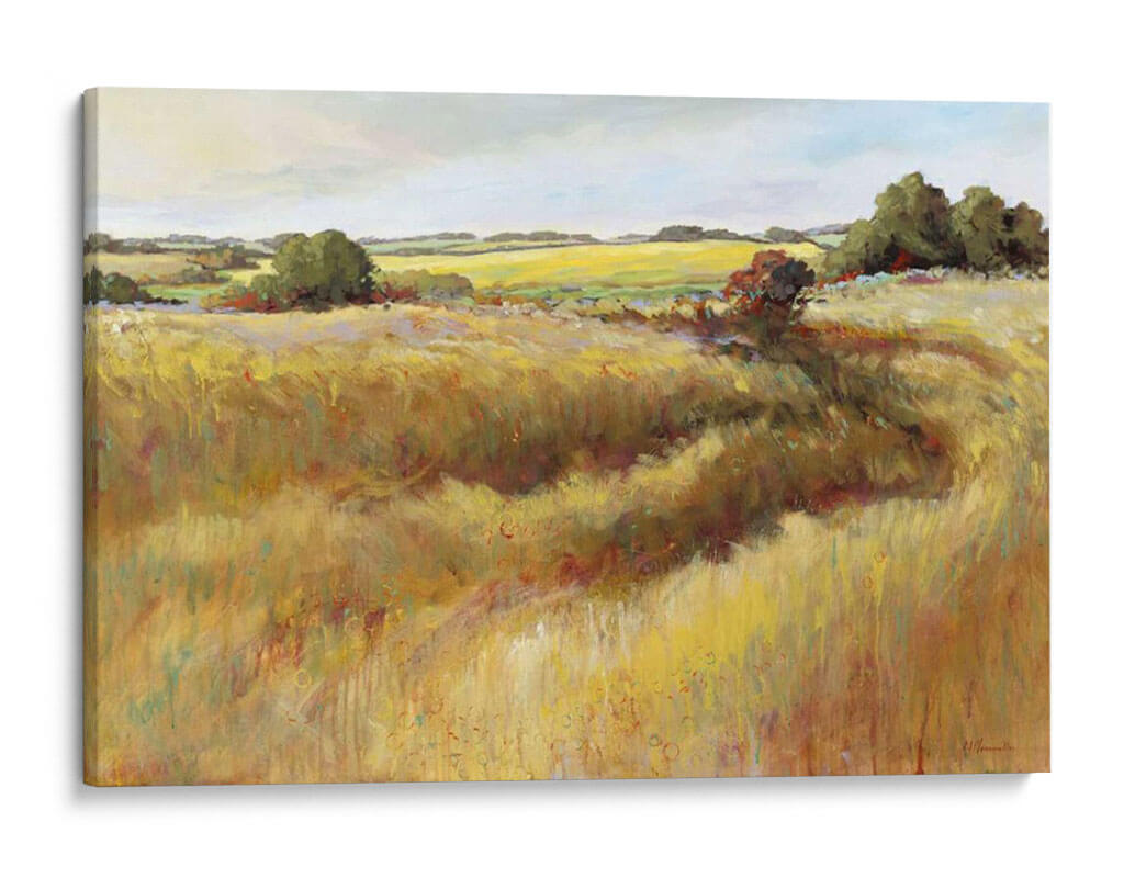 Sumérgete en la serenidad de un campo bañado por el sol con este evocador cuadro decorativo. La obra captura la esencia de un paisaje rural vibrante, dominado por tonos dorados y amarillos que evocan la calidez del verano y la abundancia de la cosecha. Una suave brisa parece mecer la alta hierba, creando un juego de luces y sombras que añade profundidad y movimiento a la composición. Al fondo, suaves colinas y un cielo etéreo completan la escena, invitando a la contemplación y la calma. Este cuadro paisajístico, con su estilo pictórico y atmosférico, es ideal para aportar una sensación de paz y conexión con la naturaleza a cualquier estancia. Perfecto para salones, dormitorios o estudios, este lienzo transformará tu espacio en un refugio de tranquilidad y belleza natural, capturando la luz dorada de un día perfecto en el campo.