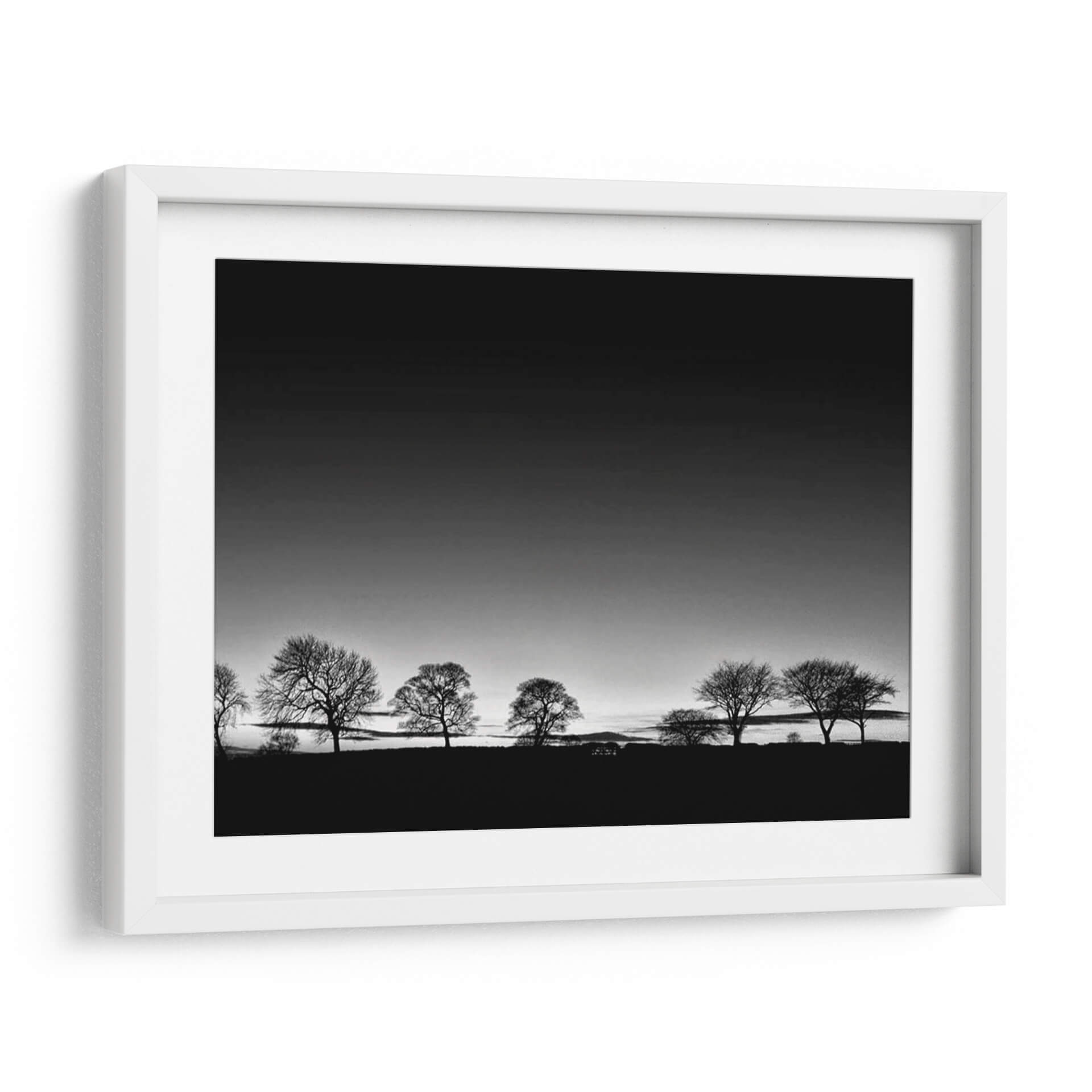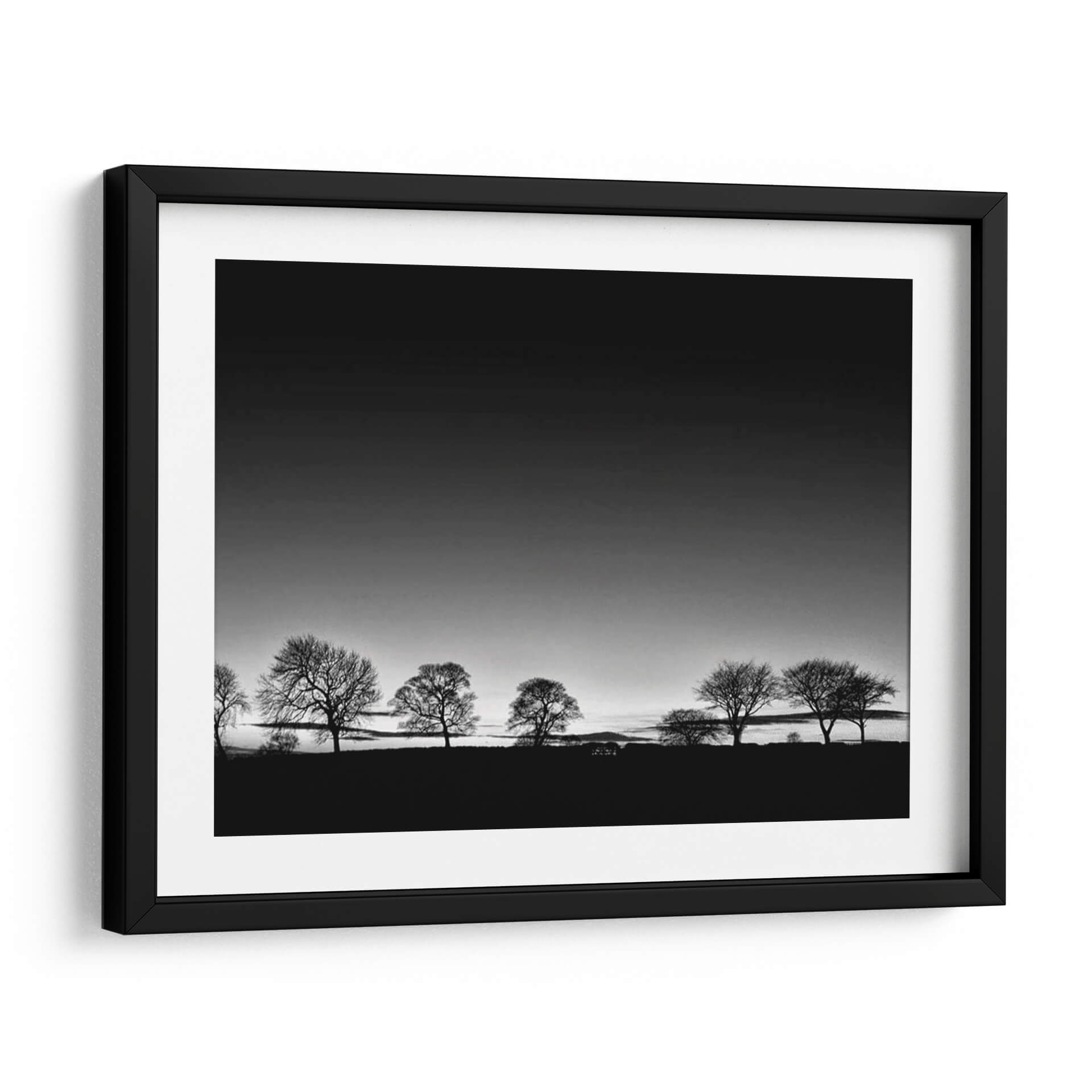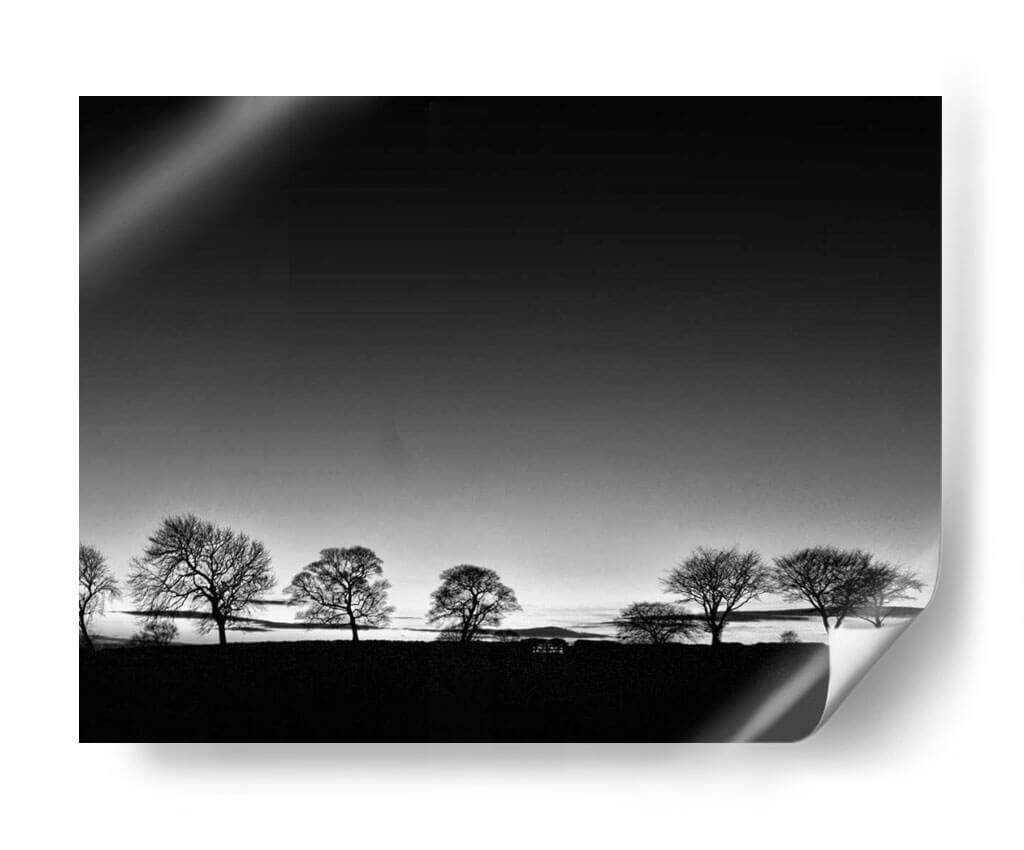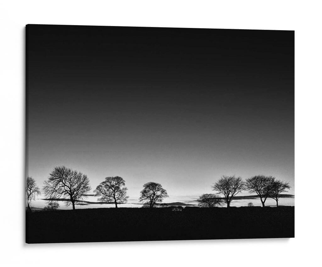 Captura la esencia de la naturaleza con "Línea de Árboles Luz", una obra de arte en blanco y negro del artista Martin Henson. Esta pieza evoca una atmósfera de serenidad y contemplación, presentando una hilera de árboles de invierno silueteados contra un cielo degradado que transita de un gris oscuro a uno más claro, sugiriendo el amanecer o el atardecer. La composición minimalista y la paleta monocromática realzan la belleza austera de los árboles, cuyas ramas desnudas crean un patrón intrincado contra el horizonte. El contraste entre la oscuridad del primer plano y la luz del cielo aporta profundidad y dramatismo a la escena. Este cuadro decorativo es ideal para espacios que buscan transmitir calma y elegancia, como un dormitorio, un estudio o una sala de estar. Su estilo atemporal y su temática universal lo convierten en una adición versátil y sofisticada a cualquier decoración, invitando a la reflexión y a la conexión con la tranquilidad del paisaje invernal. Añade un toque de arte contemporáneo y minimalista a tu hogar con esta pieza inspiradora.