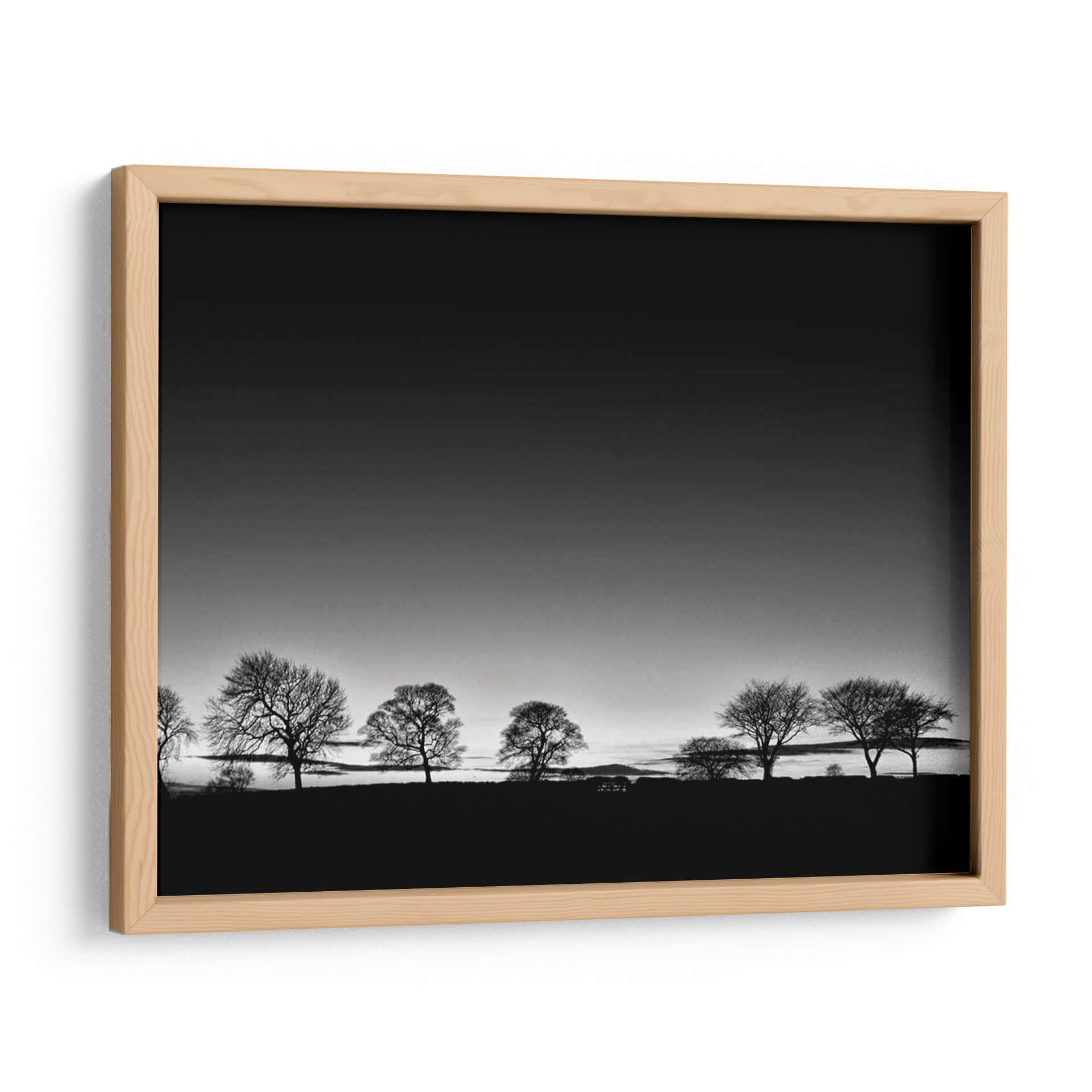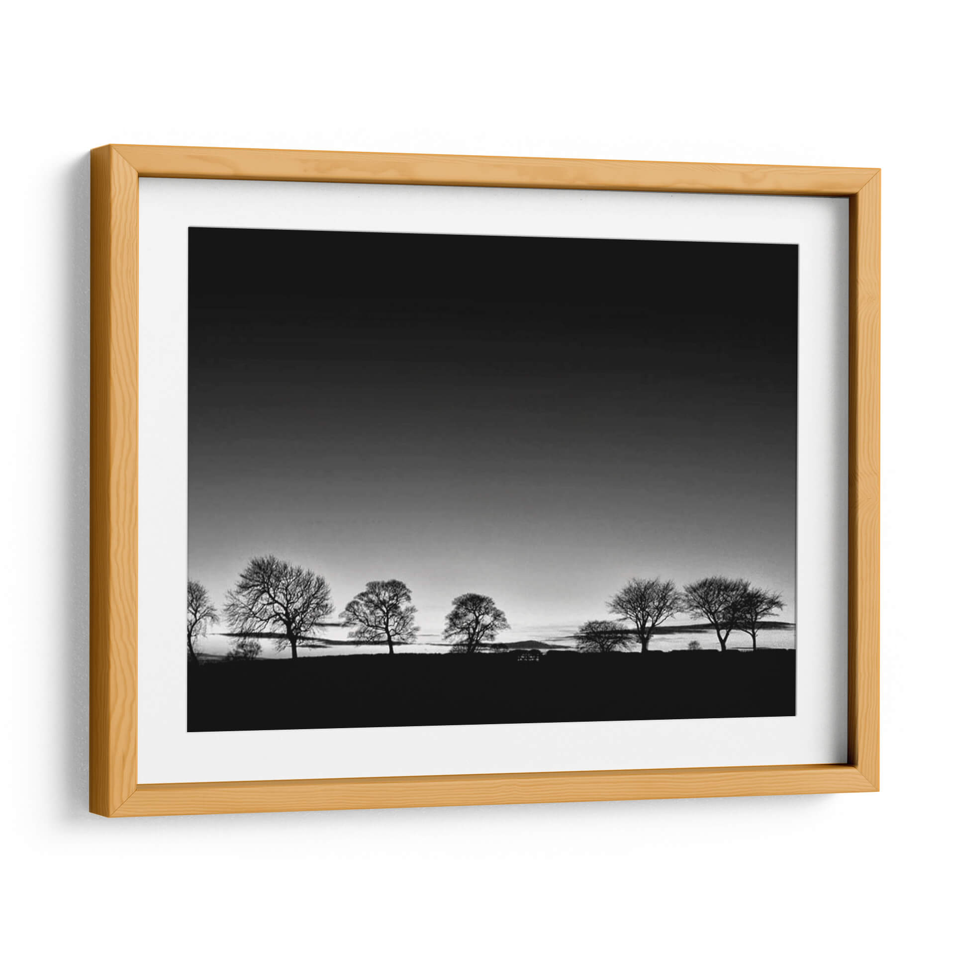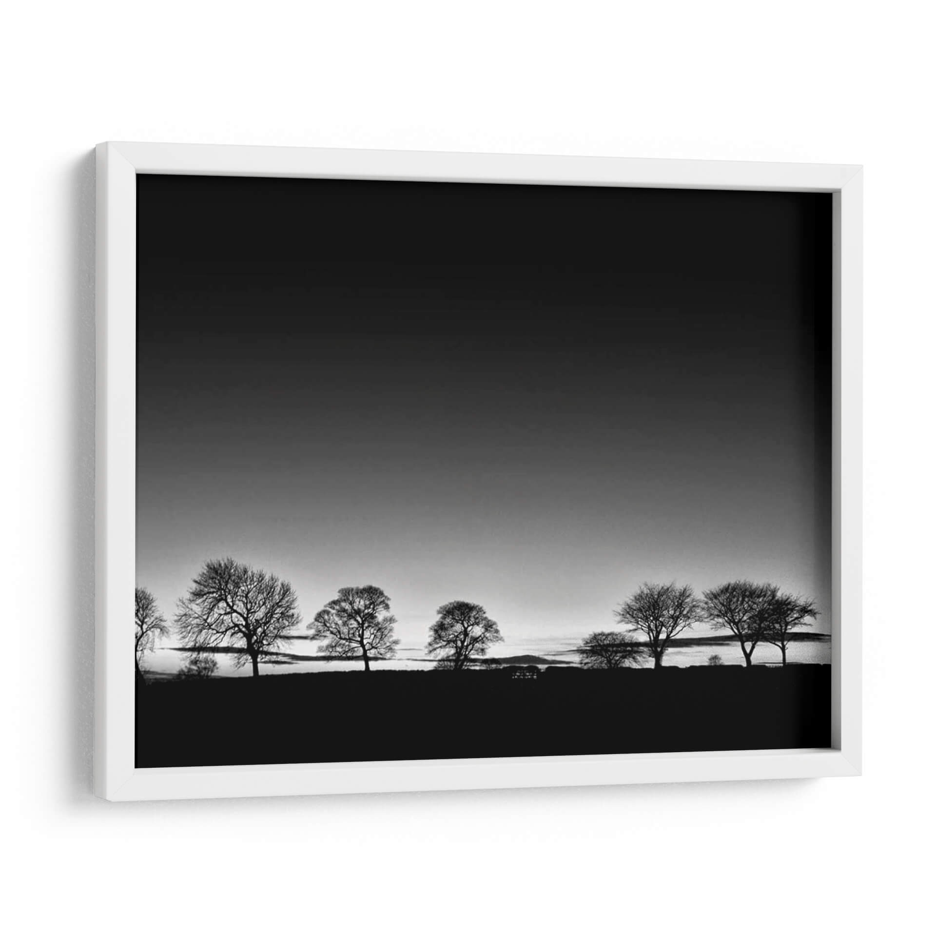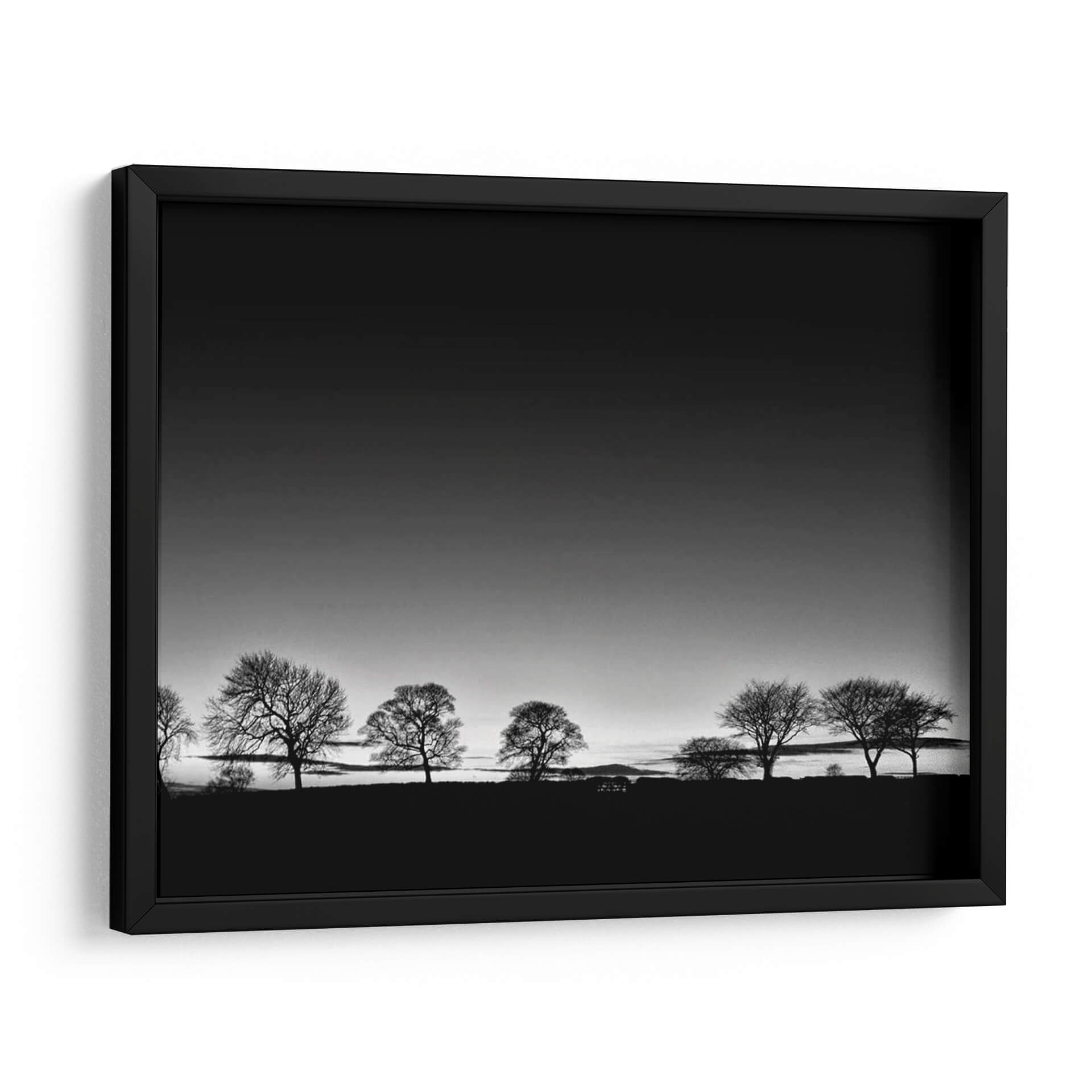 Captura la esencia de la naturaleza con "Línea de Árboles Luz", una obra de arte en blanco y negro del artista Martin Henson. Esta pieza evoca una atmósfera de serenidad y contemplación, presentando una hilera de árboles de invierno silueteados contra un cielo degradado que transita de un gris oscuro a uno más claro, sugiriendo el amanecer o el atardecer. La composición minimalista y la paleta monocromática realzan la belleza austera de los árboles, cuyas ramas desnudas crean un patrón intrincado contra el horizonte. El contraste entre la oscuridad del primer plano y la luz del cielo aporta profundidad y dramatismo a la escena. Este cuadro decorativo es ideal para espacios que buscan transmitir calma y elegancia, como un dormitorio, un estudio o una sala de estar. Su estilo atemporal y su temática universal lo convierten en una adición versátil y sofisticada a cualquier decoración, invitando a la reflexión y a la conexión con la tranquilidad del paisaje invernal. Añade un toque de arte contemporáneo y minimalista a tu hogar con esta pieza inspiradora.