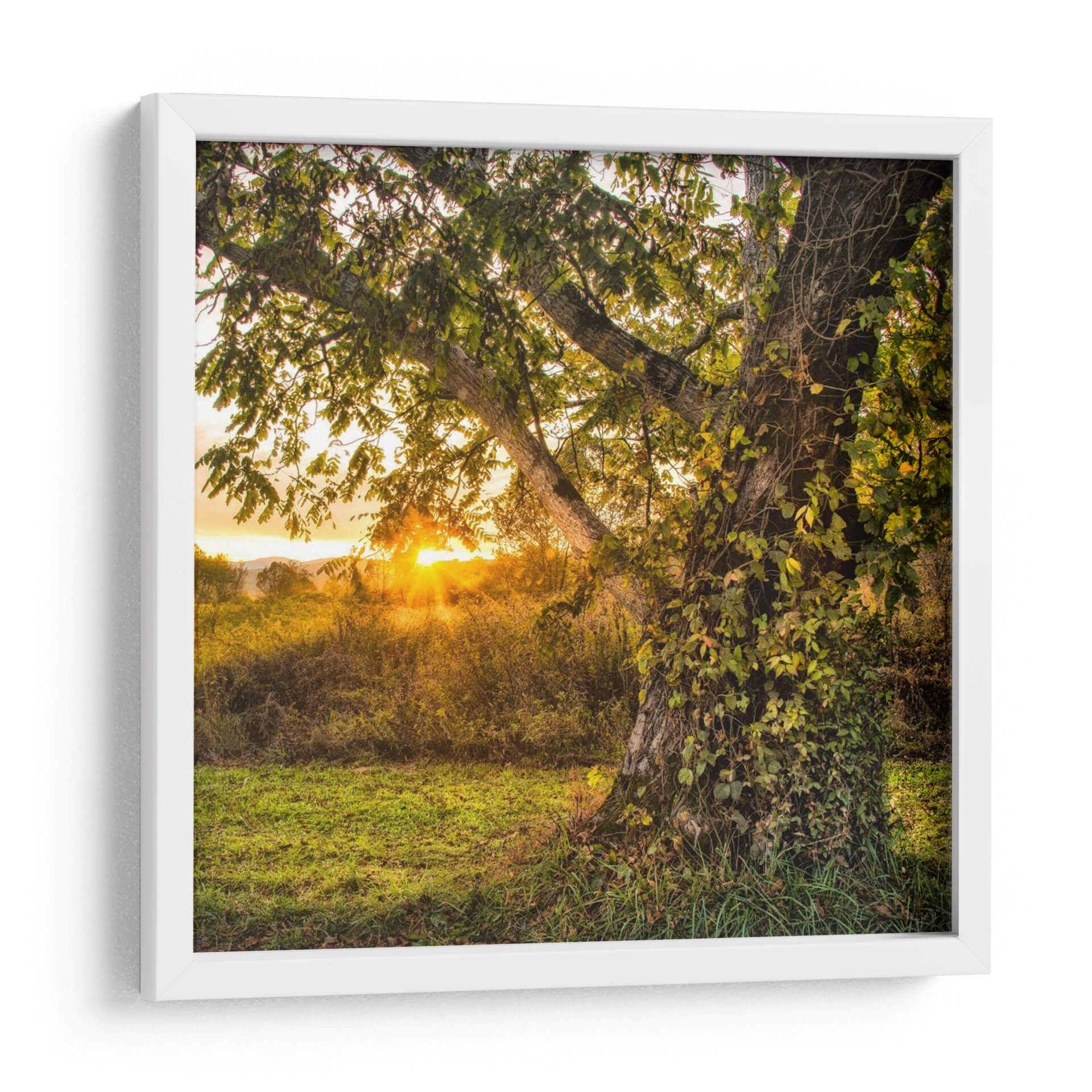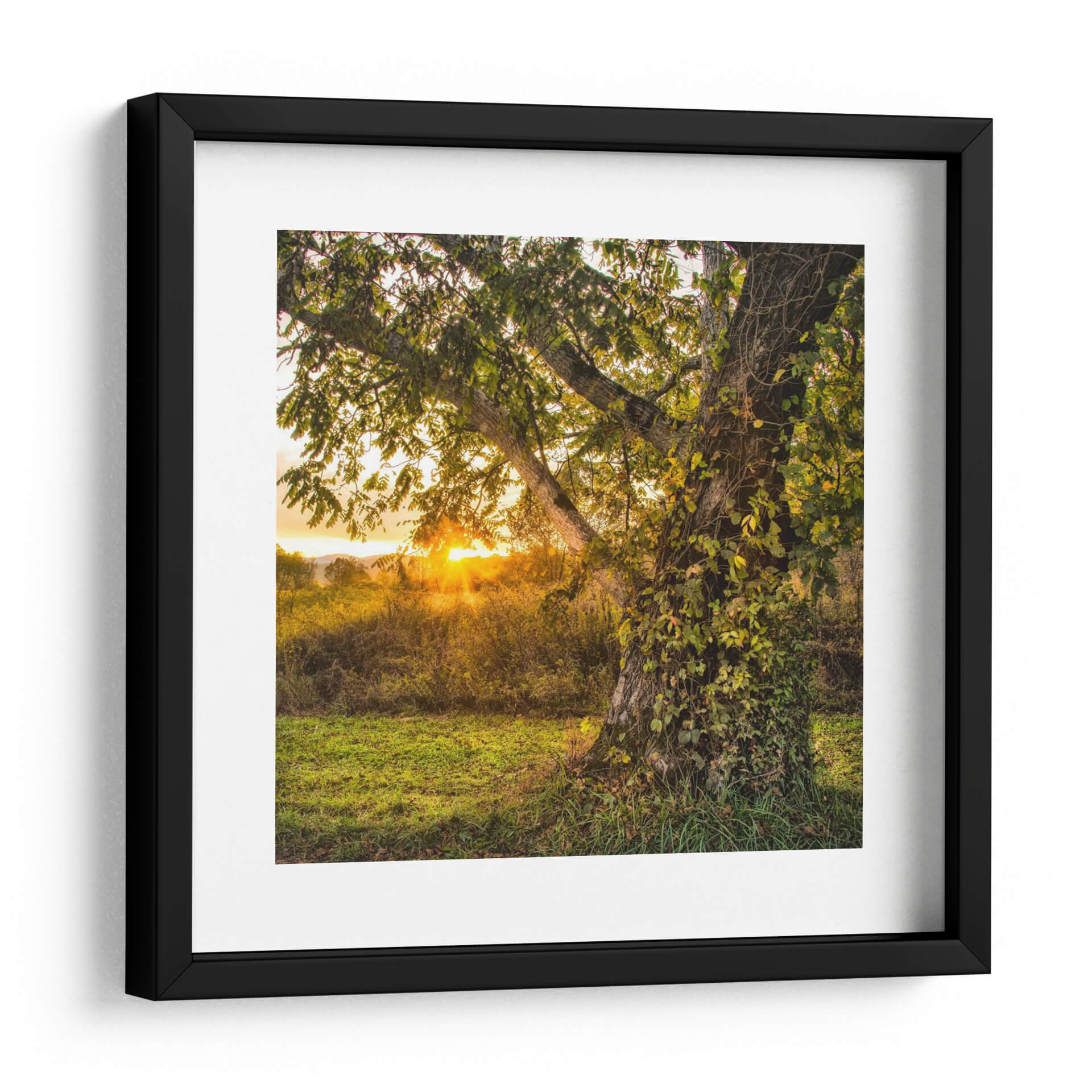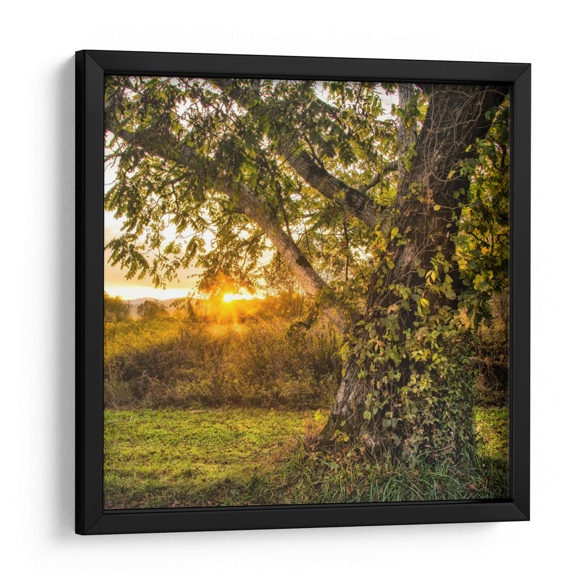 Adéntrate en la serenidad del atardecer con 'Llamándolo Un Día', una obra de arte que captura la magia de un bosque bañado por la luz dorada. El foco principal es un majestuoso árbol, cuya corteza texturizada se ve abrazada por enredaderas, creando una sensación de vida y antigüedad. Los rayos del sol se filtran a través de las hojas verdes y doradas, proyectando un resplandor cálido sobre la hierba y la vegetación circundante. La composición, con el árbol en primer plano y un paisaje brumoso al fondo, invita a la contemplación y a la evasión. Los tonos tierra y verdes vibrantes se mezclan con los naranjas y amarillos intensos del atardecer, creando una atmósfera de paz y asombro natural. Este cuadro decorativo es perfecto para infundir calma y belleza orgánica en cualquier estancia, desde una sala de estar acogedora hasta un tranquilo dormitorio o un despacho. Añade un toque de naturaleza y luz a tu hogar con esta pieza inspiradora que evoca la belleza efímera de un día perfecto en el campo. Ideal para amantes de la fotografía paisajística y el arte que celebra la tranquilidad de la naturaleza.