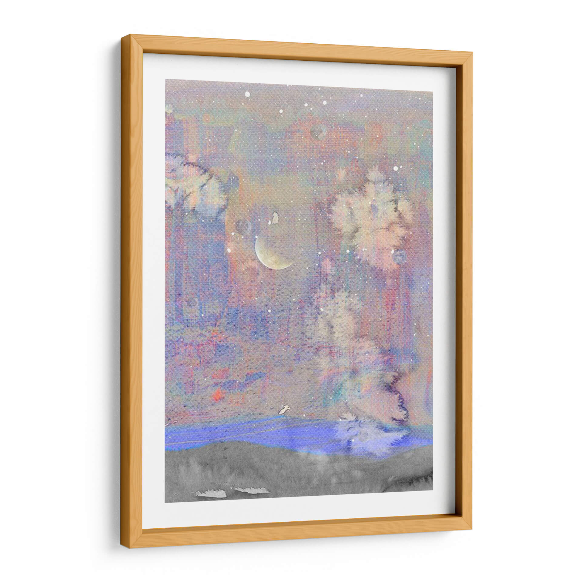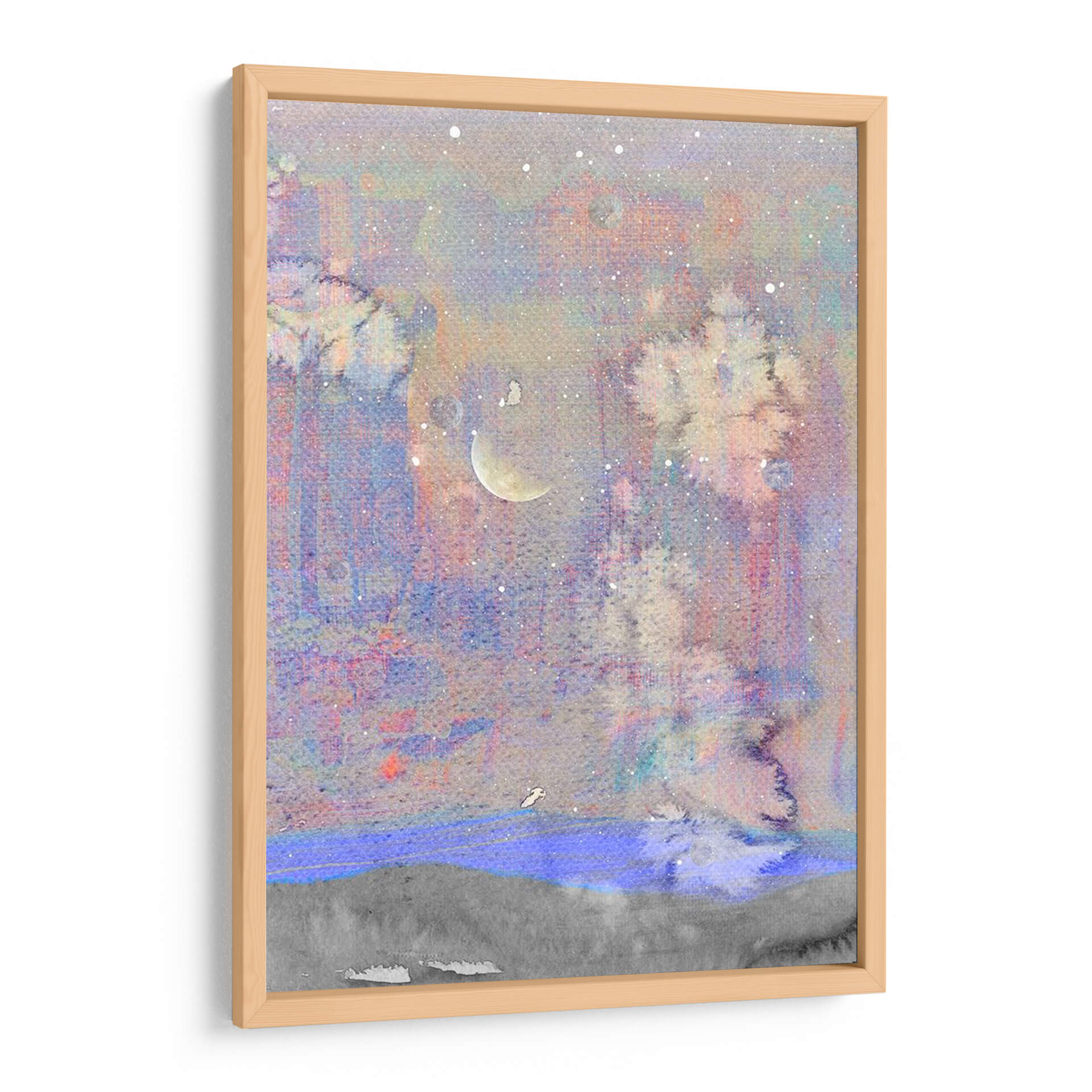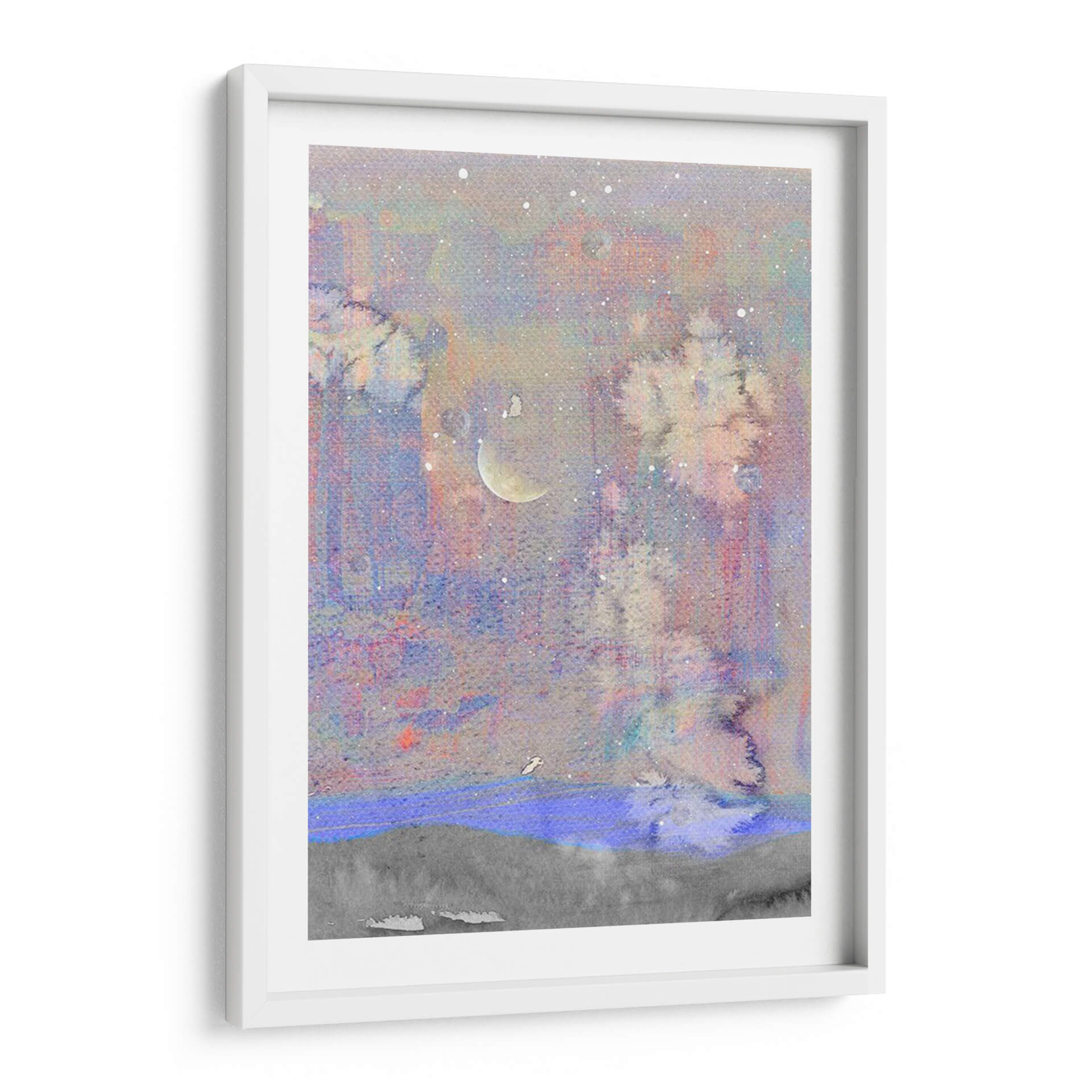 Sumérgete en la etérea belleza de "Luna Plateada I", una obra de arte contemporáneo de Alicia Ludwig que evoca la serenidad de una noche estrellada. Esta cautivadora pieza presenta una paleta de colores suaves, dominada por tonos pastel de lavanda, rosa pálido y azul cielo, salpicados con delicadas motas de luz que simulan estrellas. En el centro, una luna creciente plateada ilumina sutilmente la escena, creando un ambiente de ensueño y tranquilidad. Las texturas se mezclan creando una sensación de profundidad, con formas abstractas que sugieren un paisaje onírico o un cosmos distante. La composición, con su horizonte definido por una franja gris y un toque de azul vibrante, ancla la pieza mientras el cielo se expande en un misterio luminoso. "Luna Plateada I" es ideal para añadir un toque de calma y sofisticación a cualquier dormitorio, sala de estar o estudio. Este cuadro decorativo contemporáneo invita a la contemplación y transforma cualquier espacio en un refugio de paz. Es una elección perfecta para quienes buscan una pieza de arte que inspire serenidad y conexión con la inmensidad del universo, aportando elegancia y un toque de magia a la decoración de interiores.