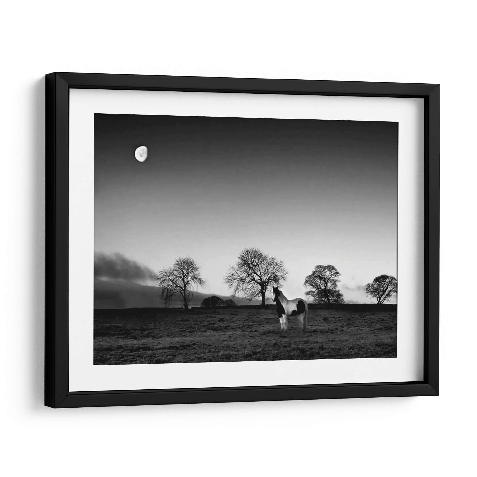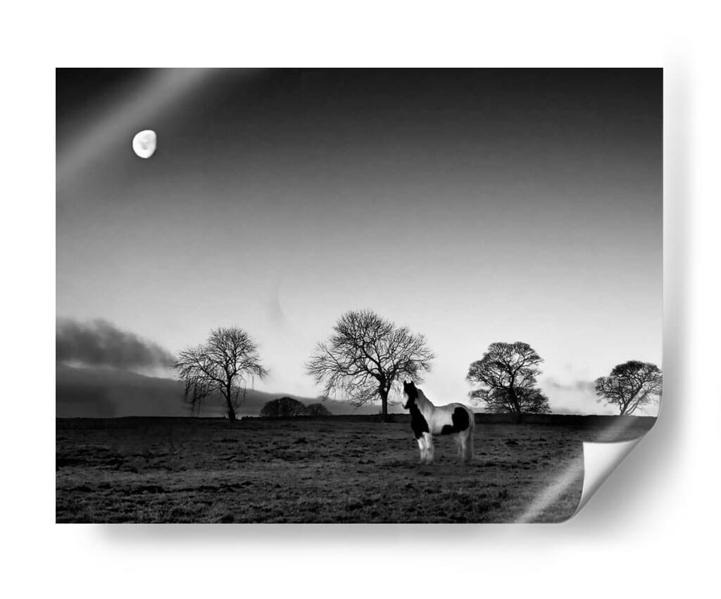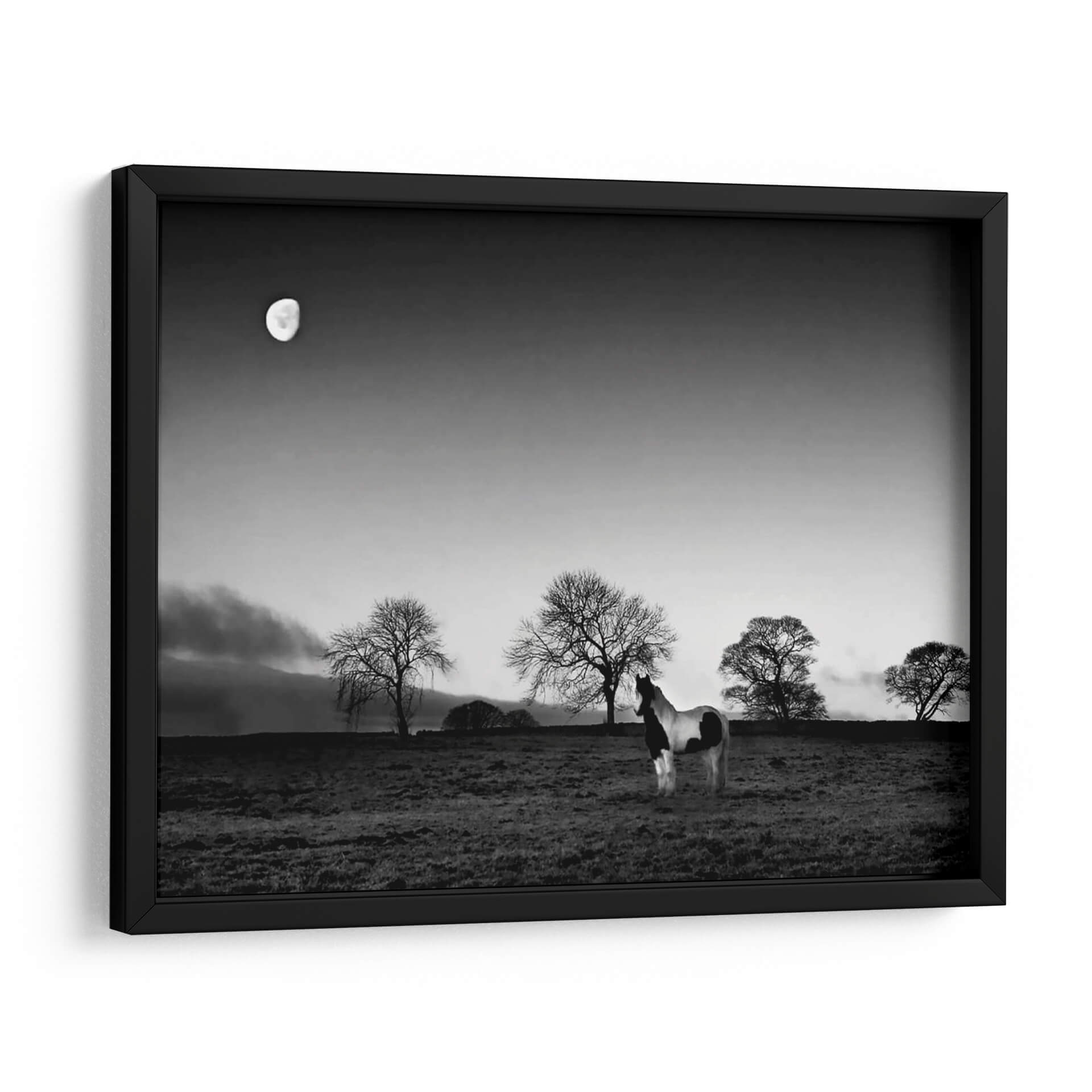 Sumérgete en la serenidad y el misterio del paisaje rural con "Luz De La Tarde IV", una obra de Martin Henson que captura la majestuosidad de un caballo en un prado al atardecer, bajo la tenue luz de la luna. Esta pieza, ejecutada en un evocador blanco y negro, resalta la textura del terreno y la silueta de árboles desnudos que se alzan contra un cielo sereno. El caballo, con su mirada serena y su presencia imponente, se convierte en el punto focal de una escena que transmite calma, introspección y una conexión profunda con la naturaleza. La composición minimalista y la paleta de grises sutiles invitan a la contemplación, haciendo de este cuadro decorativo una adición perfecta para espacios que buscan un toque de elegancia atemporal y un ambiente de tranquilidad. Ideal para salones modernos, estudios o dormitorios, "Luz De La Tarde IV" no es solo una imagen, sino una ventana a un momento de paz suspendido en el tiempo, capaz de transformar cualquier rincón en un santuario de serenidad y estilo.