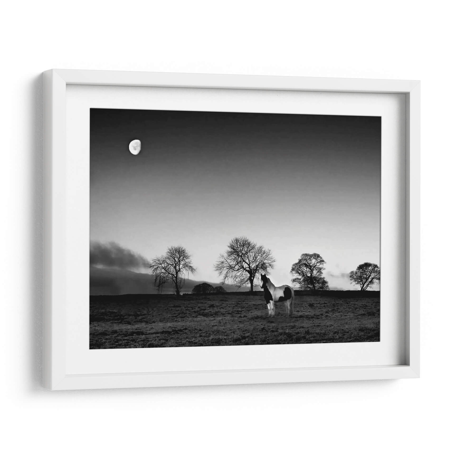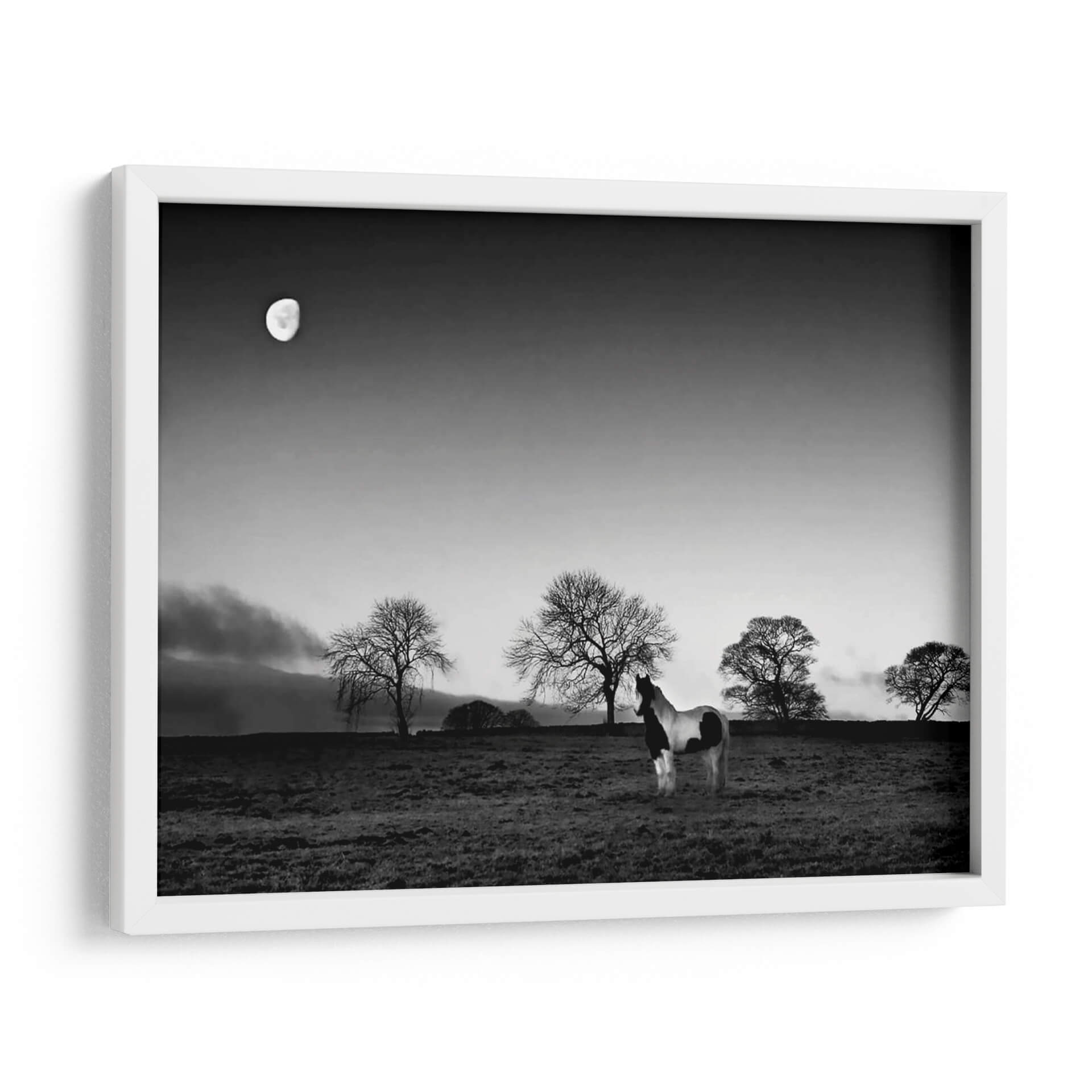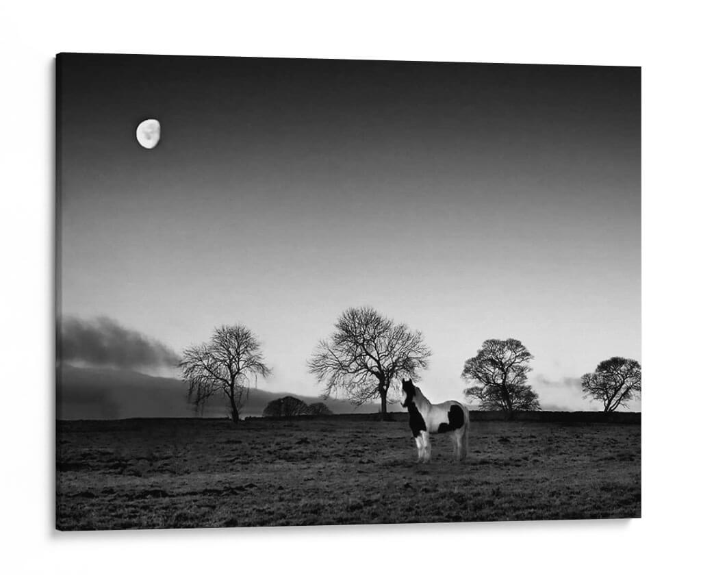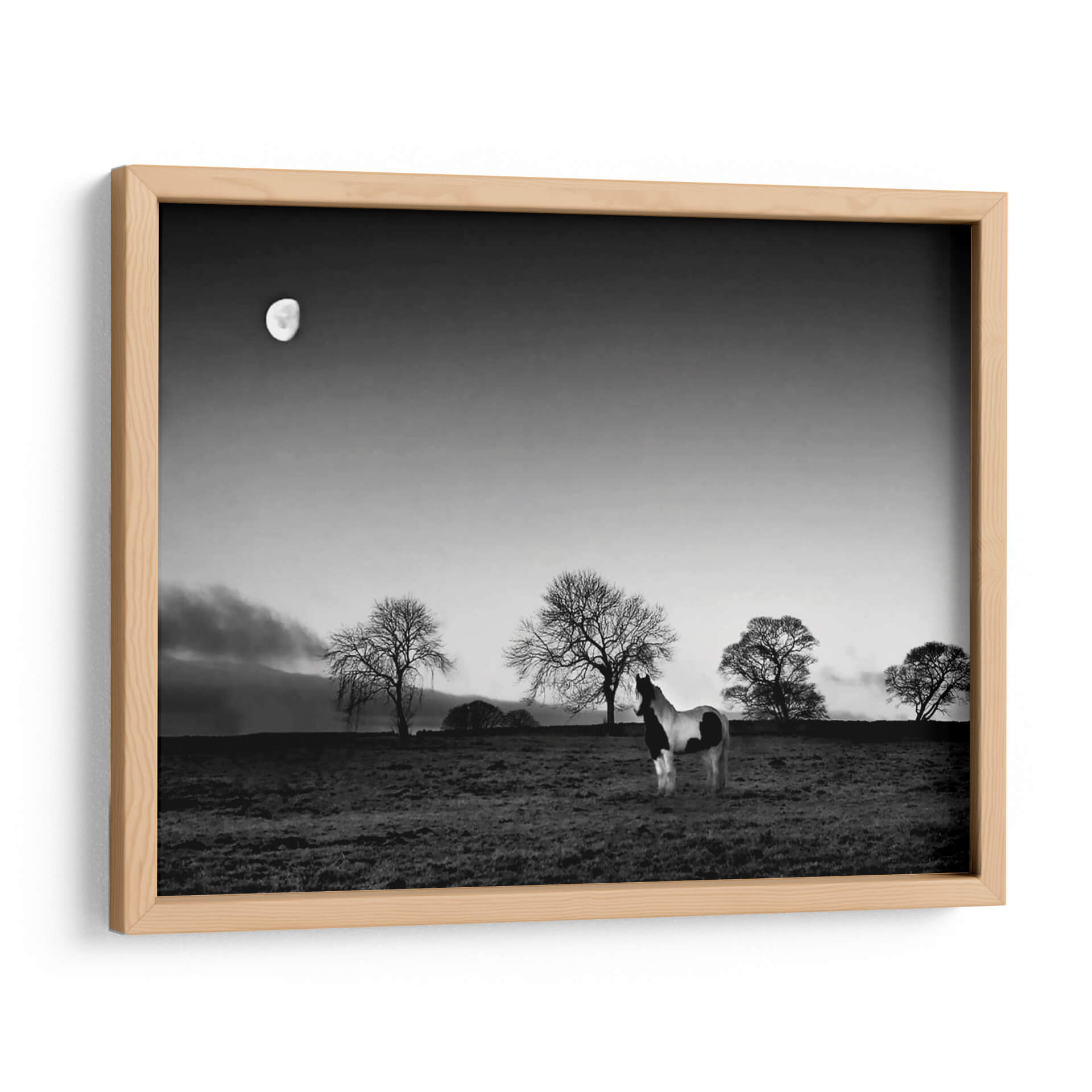 Sumérgete en la serenidad y el misterio del paisaje rural con "Luz De La Tarde IV", una obra de Martin Henson que captura la majestuosidad de un caballo en un prado al atardecer, bajo la tenue luz de la luna. Esta pieza, ejecutada en un evocador blanco y negro, resalta la textura del terreno y la silueta de árboles desnudos que se alzan contra un cielo sereno. El caballo, con su mirada serena y su presencia imponente, se convierte en el punto focal de una escena que transmite calma, introspección y una conexión profunda con la naturaleza. La composición minimalista y la paleta de grises sutiles invitan a la contemplación, haciendo de este cuadro decorativo una adición perfecta para espacios que buscan un toque de elegancia atemporal y un ambiente de tranquilidad. Ideal para salones modernos, estudios o dormitorios, "Luz De La Tarde IV" no es solo una imagen, sino una ventana a un momento de paz suspendido en el tiempo, capaz de transformar cualquier rincón en un santuario de serenidad y estilo.