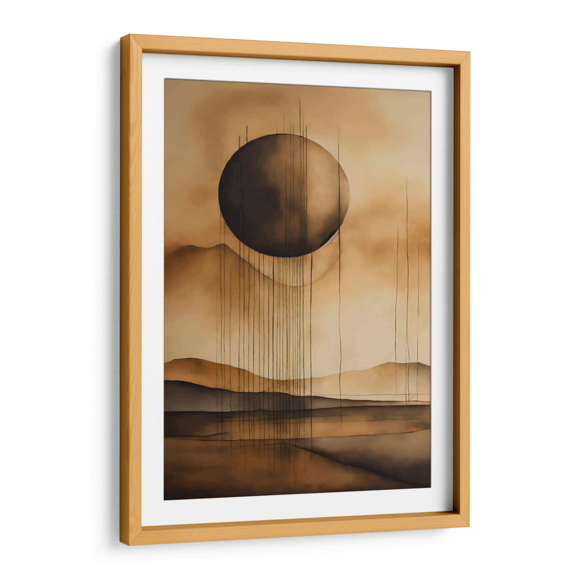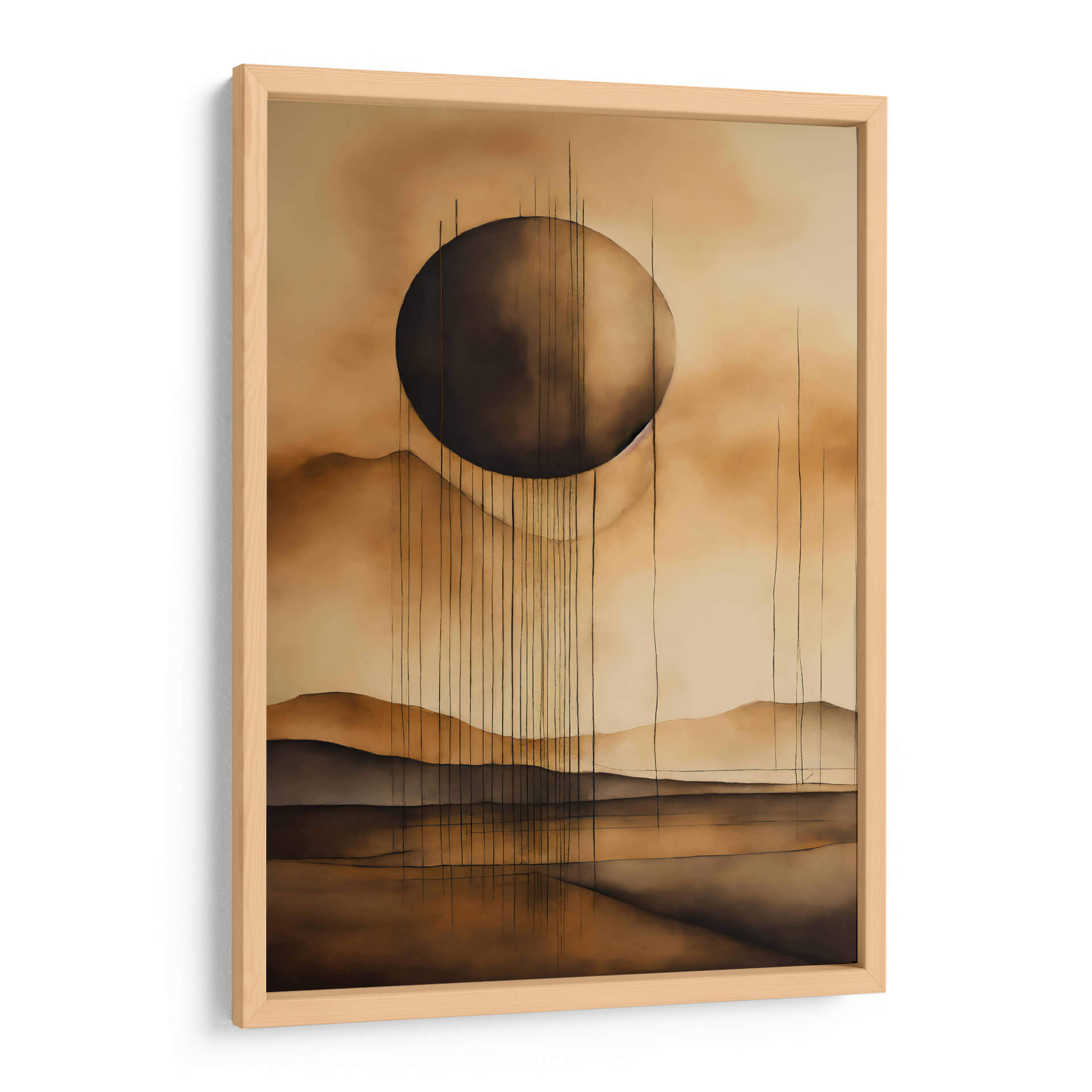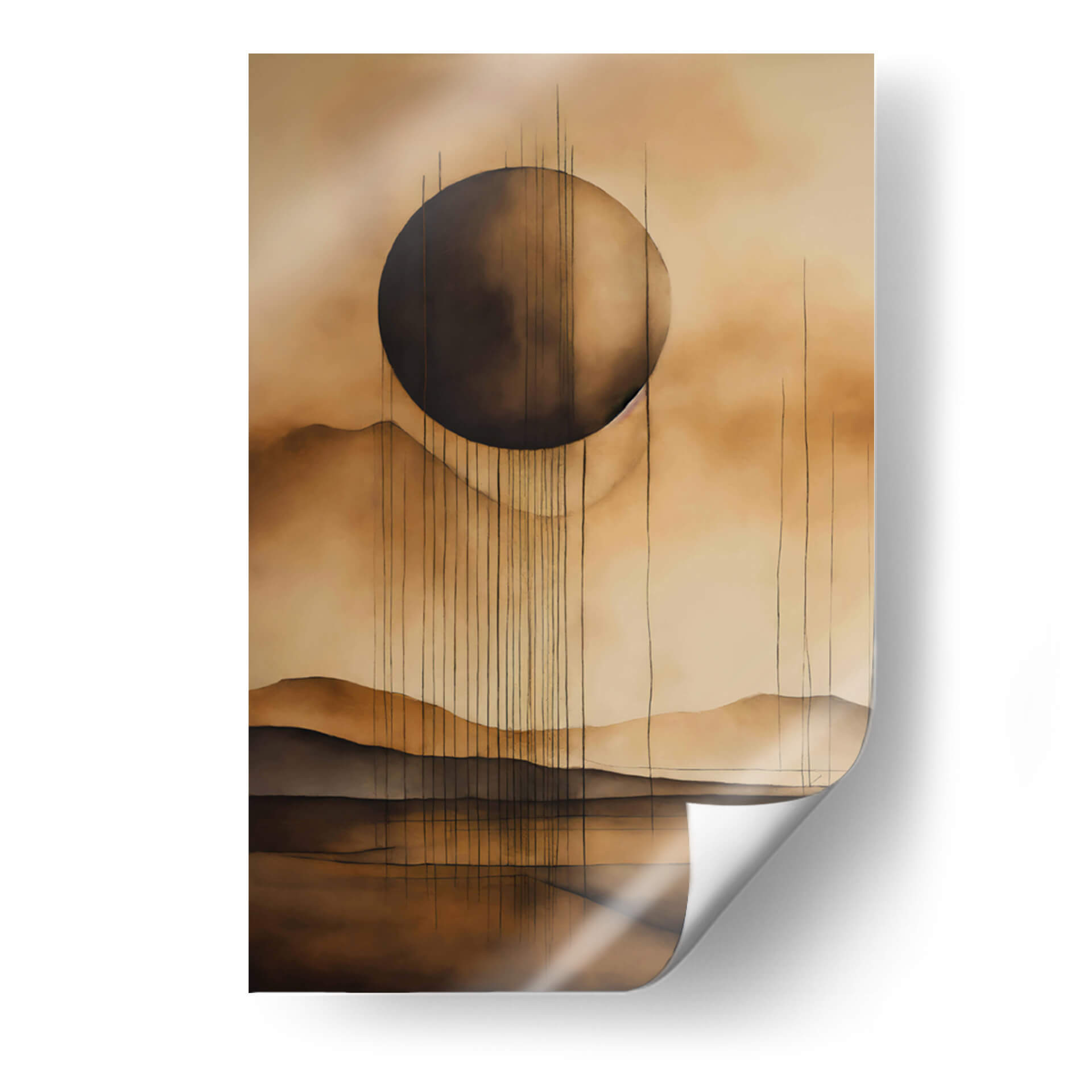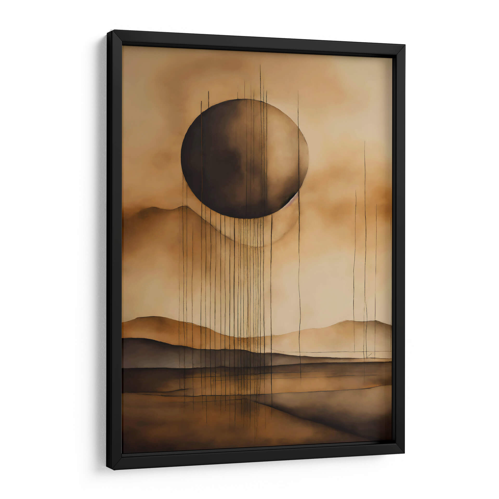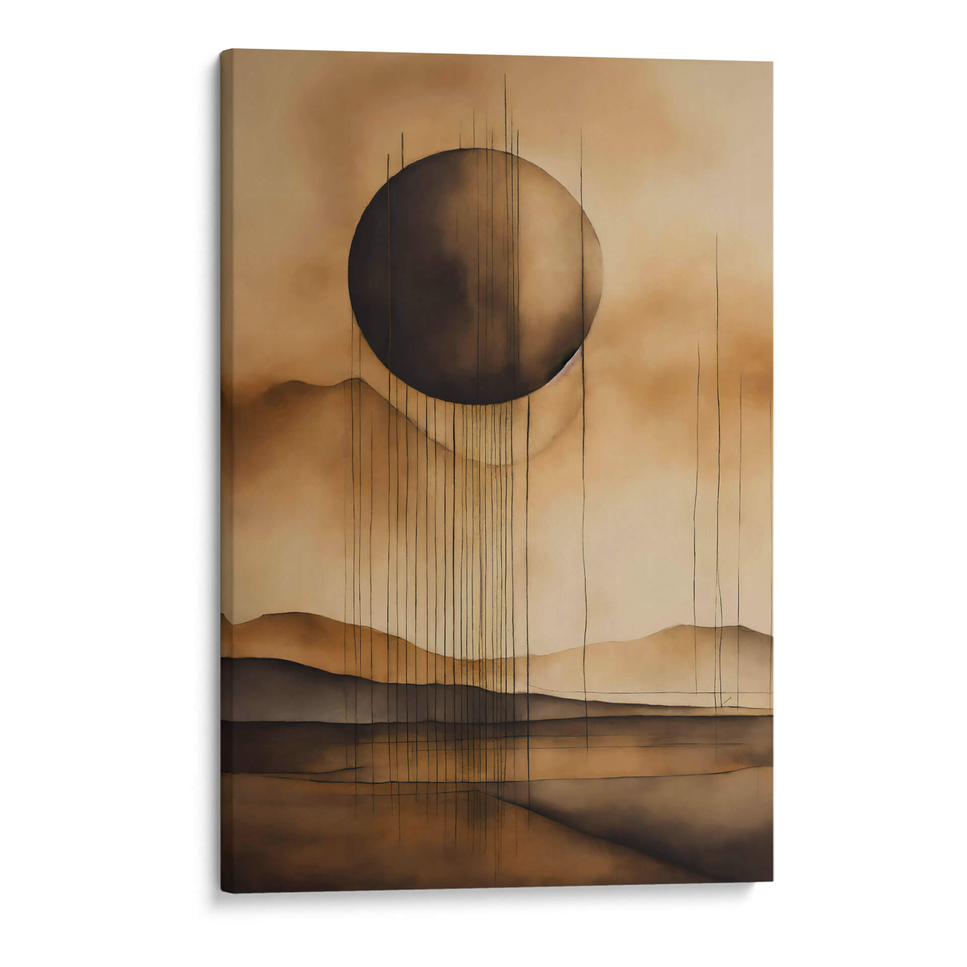 Sumérgete en la serenidad de "Mocha Mousse Cat MM 101", una obra de arte abstracto que evoca paisajes oníricos y atmósferas contemplativas. El cuadro presenta una paleta de colores cálidos y terrosos, dominada por tonos marrones y beiges, que crean una sensación de calma y calidez. La composición se centra en un gran círculo oscuro suspendido sobre un paisaje de colinas estilizadas, con finas líneas verticales que descienden, sugiriendo lluvia o quizás una conexión etérea. El estilo minimalista y etéreo, con degradados suaves y una ausencia de detalles figurativos explícitos, invita a la introspección y a la interpretación personal. Esta pieza es perfecta para añadir un toque de sofisticación y tranquilidad a tu salón, dormitorio u oficina. Su diseño contemporáneo y su profundidad visual la convierten en un punto focal que estimula la conversación y la admiración, ideal para quienes buscan un arte que combine elegancia moderna con una pizca de misterio. Transforma tu espacio con este cautivador cuadro decorativo que promete ser una adición atemporal a tu colección de arte.