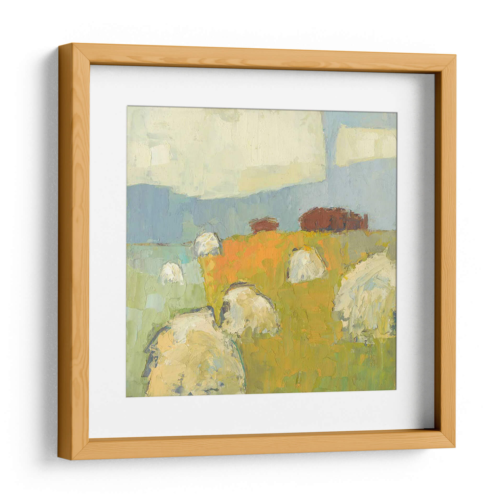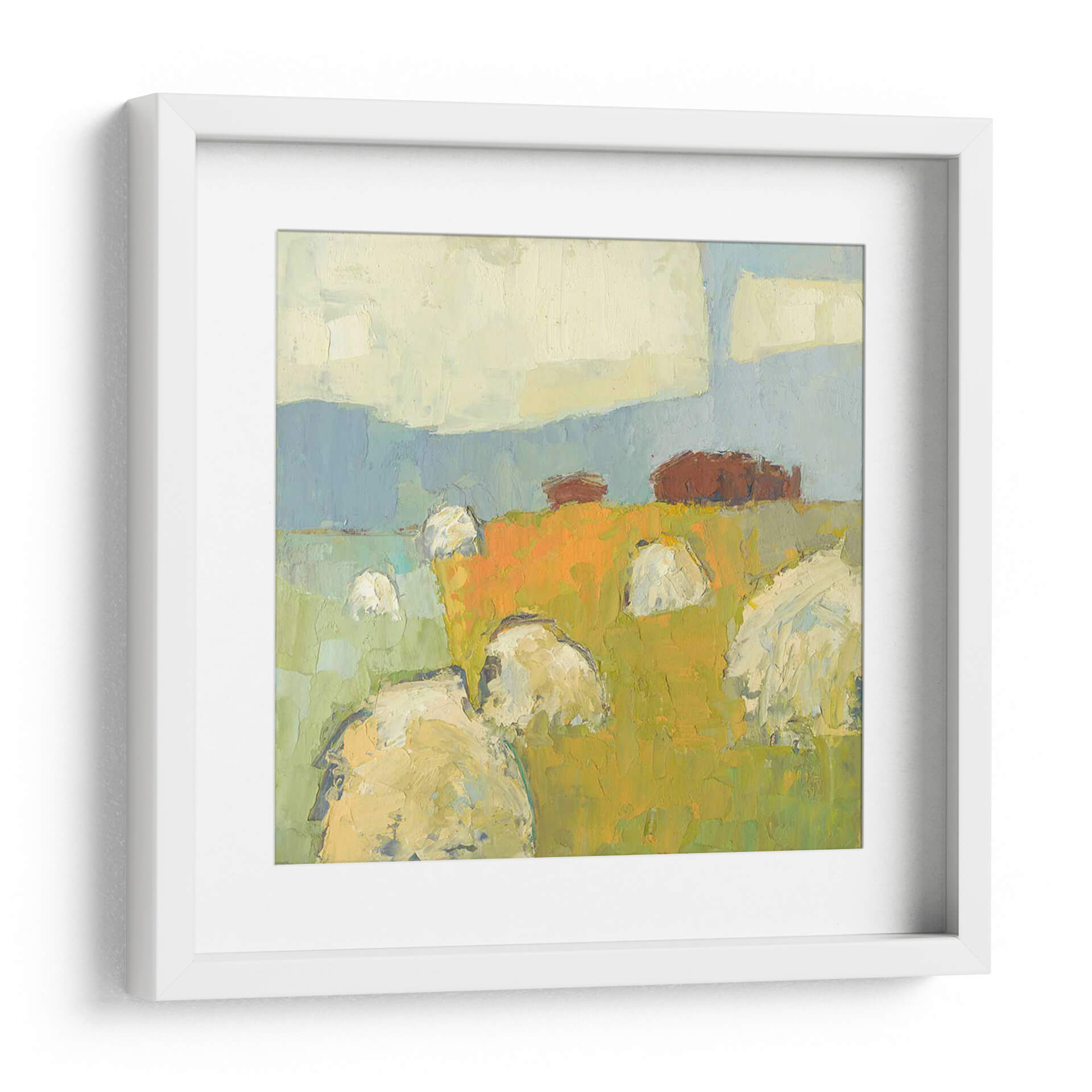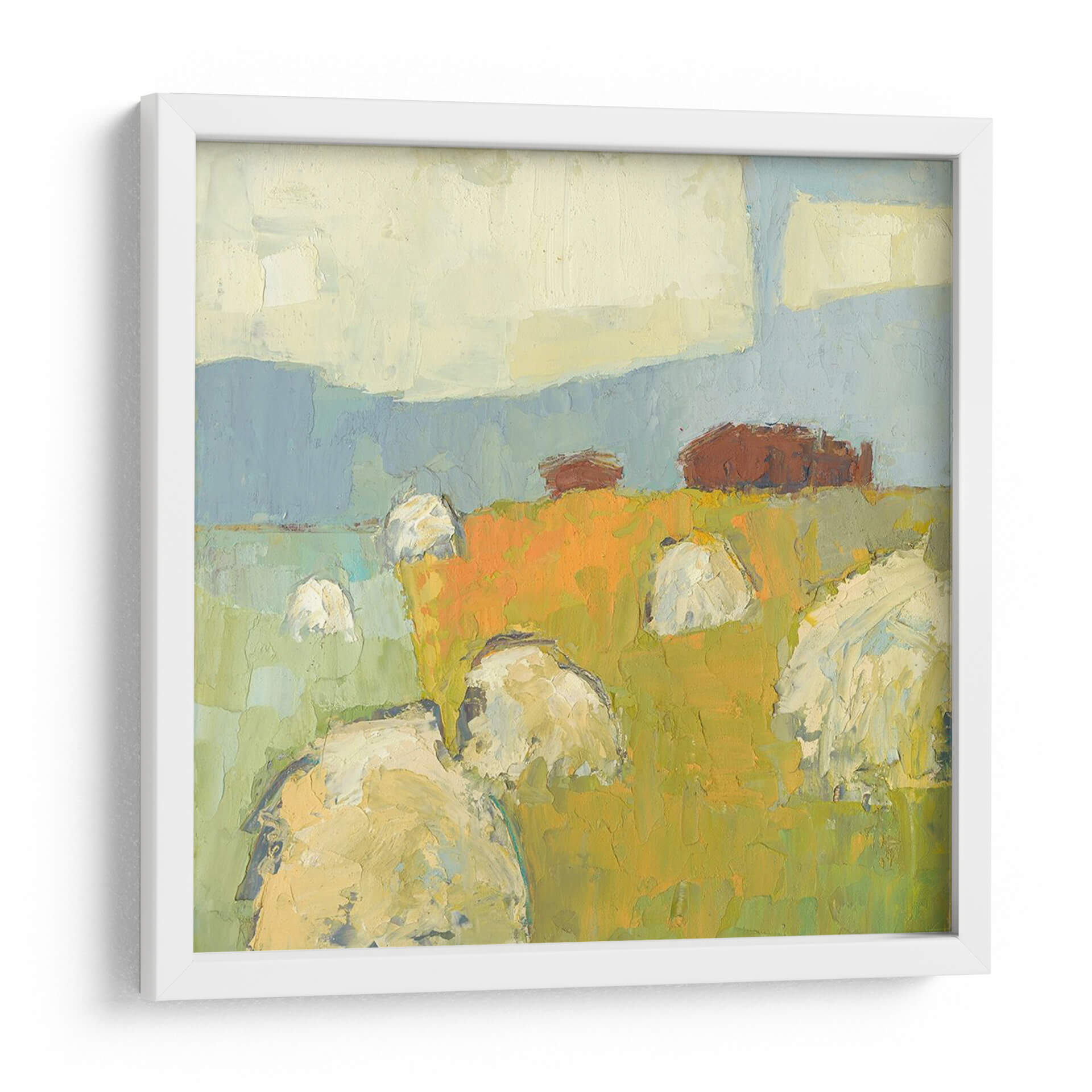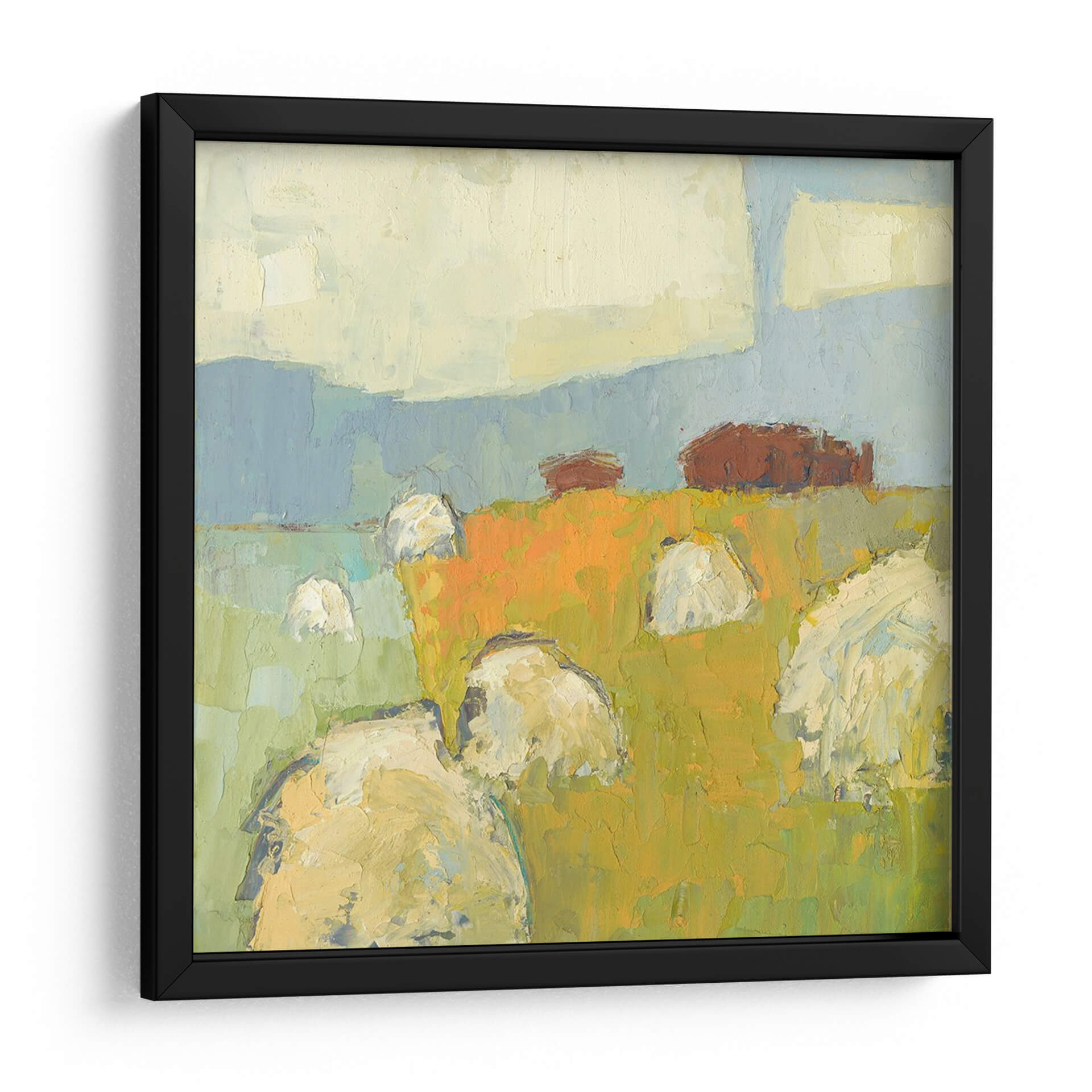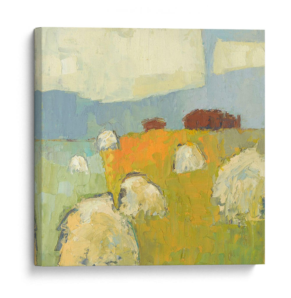 Sumérgete en la serena belleza del campo con "New Glarus Gran", una cautivadora obra de arte de Sue Jachimiec. Este cuadro decorativo abstracto captura la esencia de un paisaje rural con una pincelada expresiva y una paleta de colores vibrantes. La composición presenta pacas de heno o fardos bajo un cielo vasto, evocando una sensación de tranquilidad y conexión con la naturaleza. Los tonos terrosos y cálidos del campo, dominados por naranjas y amarillos intensos, contrastan armoniosamente con los azules suaves del cielo y las verdes colinas, creando una atmósfera acogedora y rústica. El estilo pictórico, con sus texturas visibles y formas simplificadas, aporta una modernidad sutil a la escena, haciendo de esta pieza una adición versátil para cualquier hogar u oficina. Ideal para espacios que buscan un toque de calidez, arte campestre o una representación artística del ciclo de la cosecha. Este cuadro abstracto es perfecto para salas de estar, comedores o incluso estudios, añadiendo profundidad y carácter a tu decoración.