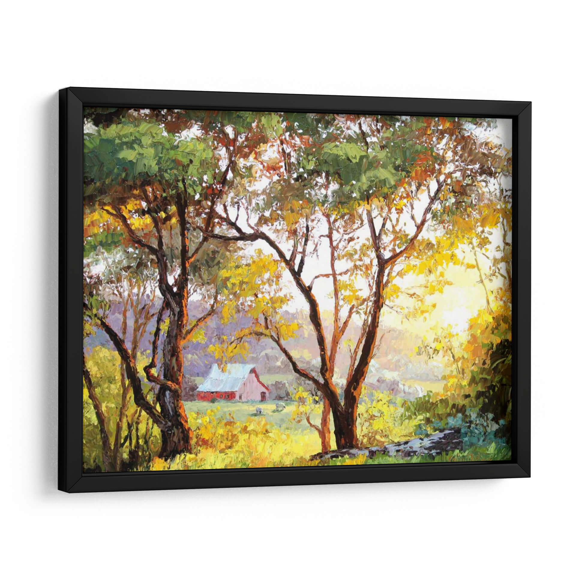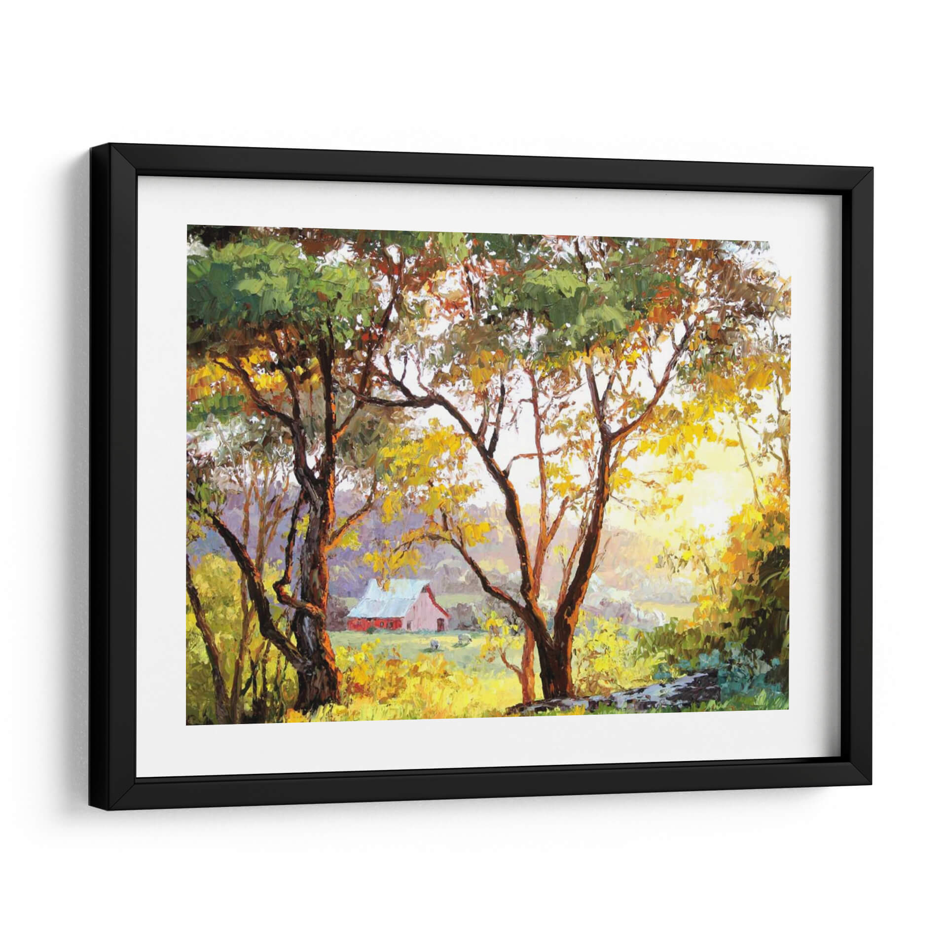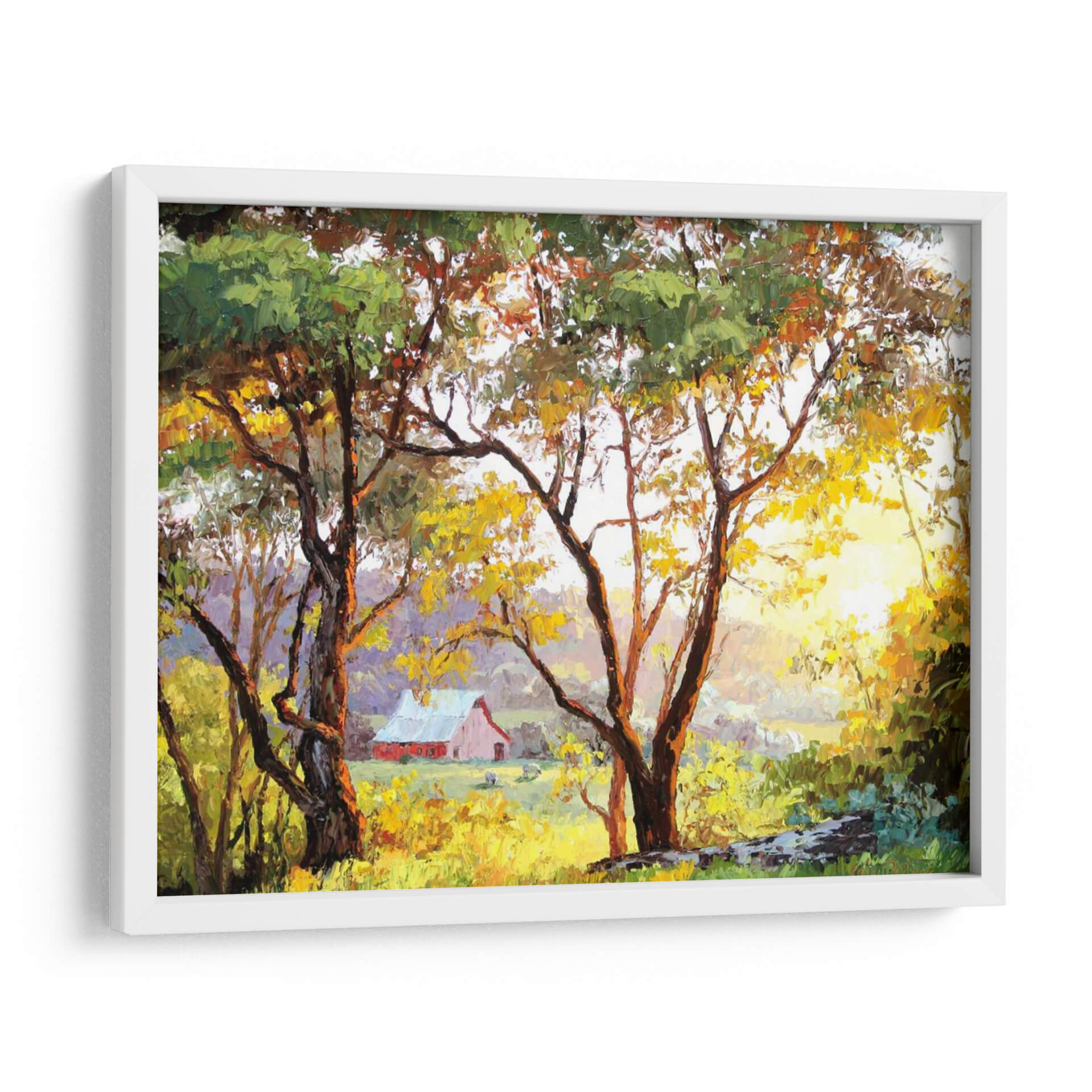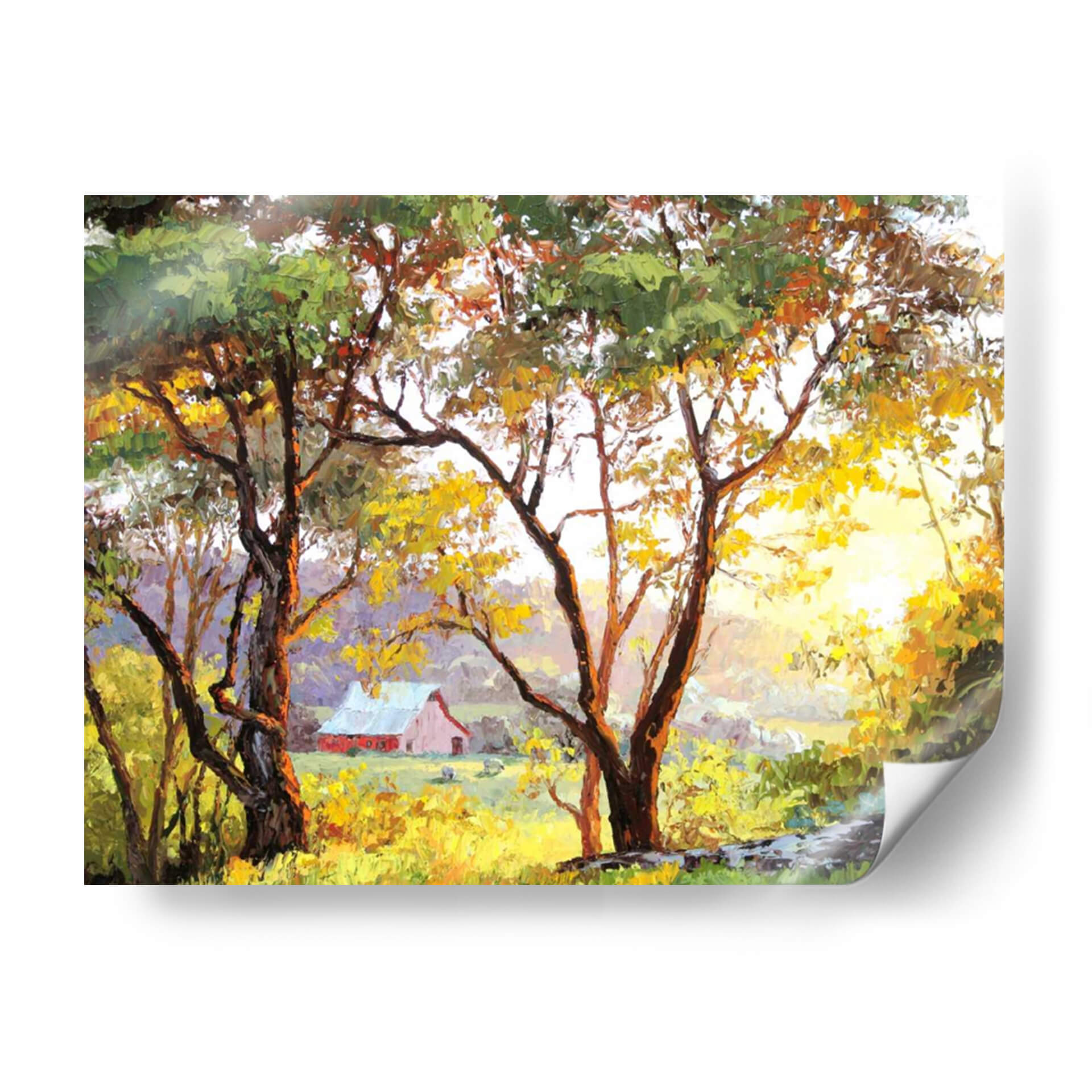 Sumérgete en la calidez y serenidad del campo con este cuadro decorativo "Paisaje Bruñido" de Erin Dertner. La obra captura un momento idílico de un atardecer o amanecer campestre, donde la luz dorada se filtra a través de las hojas de árboles robustos, proyectando un brillo cálido sobre un prado exuberante. En el fondo, una granja de color rojo pálido se asoma entre la vegetación, evocando una sensación de paz y nostalgia. Las pinceladas expresivas y la rica paleta de colores, que va desde verdes vibrantes y amarillos dorados hasta tonos terrosos y toques de violeta en las sombras, crean una atmósfera acogedora y envolvente. Este cuadro decorativo es perfecto para añadir un toque de naturaleza y tranquilidad a cualquier hogar u oficina. Su estilo impresionista y su composición equilibrada lo convierten en una pieza versátil, ideal para salas de estar, comedores o estudios donde se busca crear un ambiente relajante y estético. "Paisaje Bruñido" no es solo una obra de arte, es una ventana a un refugio sereno, una invitación a la contemplación y al disfrute de la belleza simple de la vida rural. Transforme su espacio con esta pieza única que captura la esencia de la luz y la naturaleza.