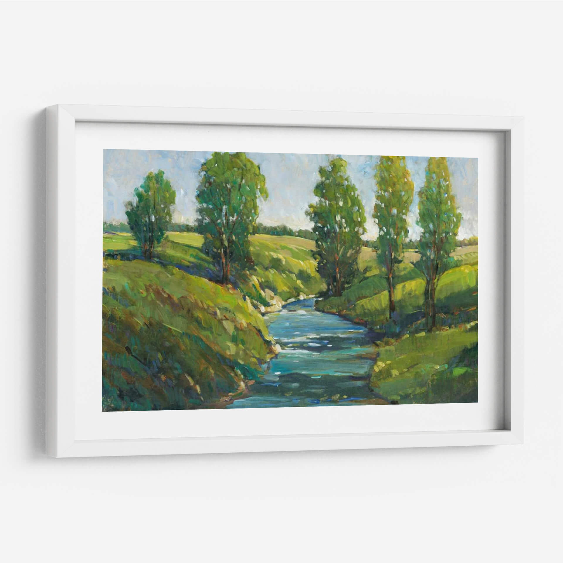 Sumérgete en la serenidad de la naturaleza con "Paisaje Exuberante III", una obra de arte cautivadora del artista Tim O'Toole. Este cuadro decorativo captura la esencia de un día soleado en el campo, donde un río serpenteante fluye a través de colinas verdes y exuberantes. La paleta de colores vibrantes, dominada por tonos de verde, azul y toques de luz solar, evoca una sensación de paz y vitalidad. Las pinceladas audaces y expresivas del artista dan vida al paisaje, transmitiendo la textura de la hierba y el movimiento del agua con una energía palpable. Es una pieza ideal para añadir un toque de frescura y tranquilidad a cualquier estancia, ya sea un salón moderno, un comedor acogedor o un espacio de trabajo inspirador. La composición, que guía la mirada a través del cauce del río hacia el horizonte, crea una sensación de profundidad y perspectiva, invitando a la contemplación. "Paisaje Exuberante III" es más que una simple decoración de pared; es una ventana a la belleza del mundo natural, una invitación a pausar y apreciar los pequeños detalles que nos rodean, aportando una atmósfera de calma y renovación a tu hogar.