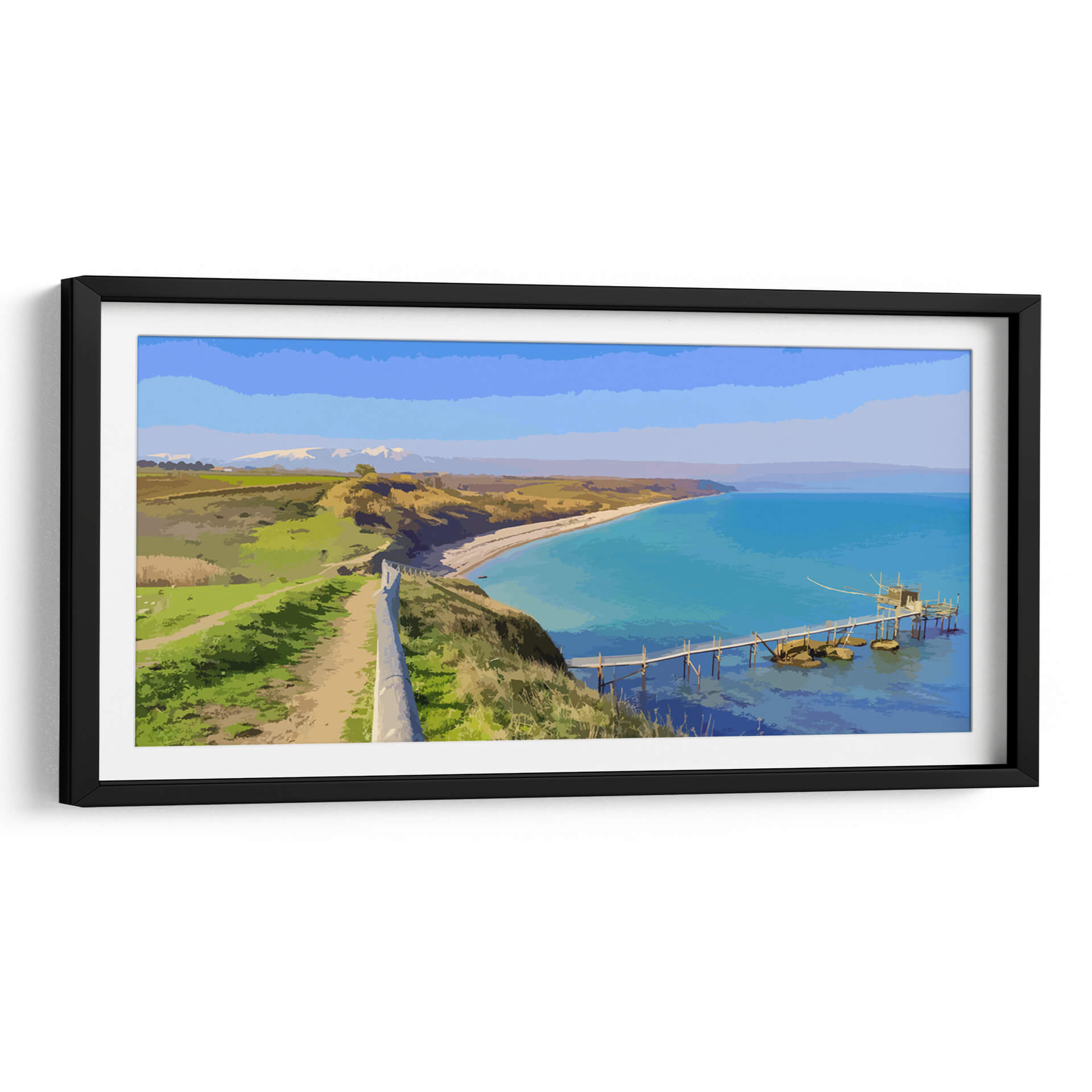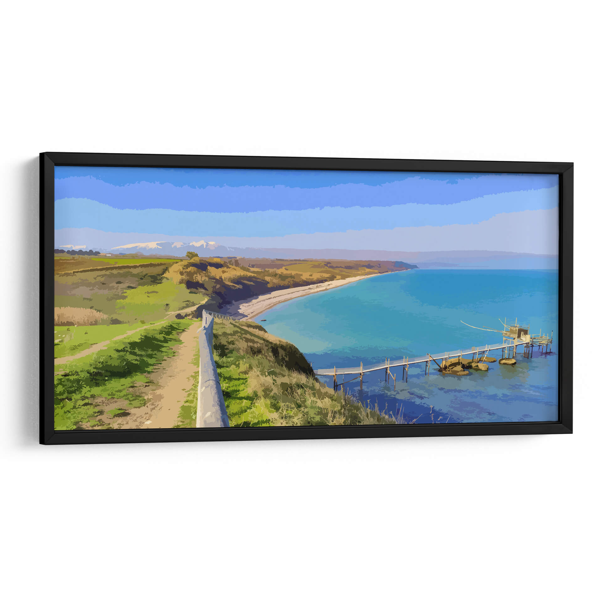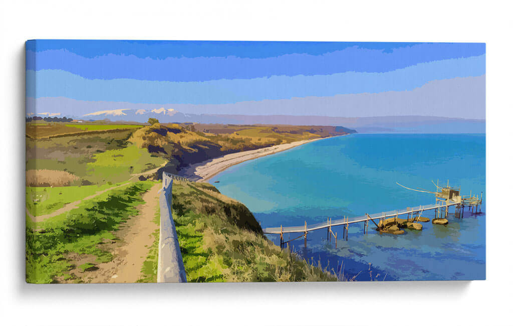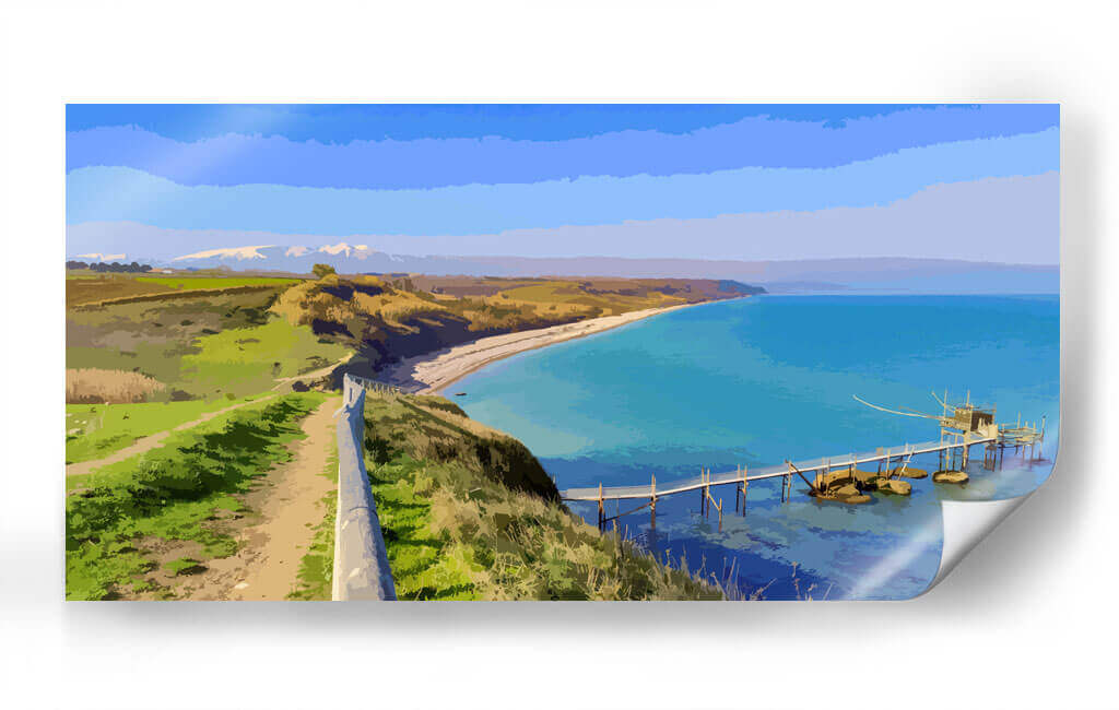 Sumérgete en la serenidad de "Paisaje Real", una cautivadora obra de arte digital que captura la esencia de una costa idílica. El artista Jabin Adiel nos transporta a un rincón donde la tierra se encuentra con el mar en una armonía de colores vibrantes y formas estilizadas. La composición se despliega desde un sendero que serpentea por una colina verde exuberante, bordeada por un muro de piedra que guía la mirada hacia el horizonte. A lo lejos, montañas nevadas coronan un paisaje de campos dorados y verdes, evocando una sensación de paz y amplitud. El protagonista indiscutible es el mar turquesa, cuyas aguas cristalinas invitan a la contemplación. Un pintoresco embarcadero de madera se adentra en el mar, culminando en una estructura tradicional que añade un toque de encanto rústico a la escena. La paleta de colores, dominada por azules intensos, verdes vivos y ocres cálidos, crea una atmósfera de tranquilidad y frescura, ideal para cualquier espacio que busque transmitir calma y belleza natural. Este cuadro decorativo es perfecto para añadir un punto focal sereno a tu salón, dormitorio u oficina, transformando cualquier ambiente en un refugio de paz y inspiración visual.