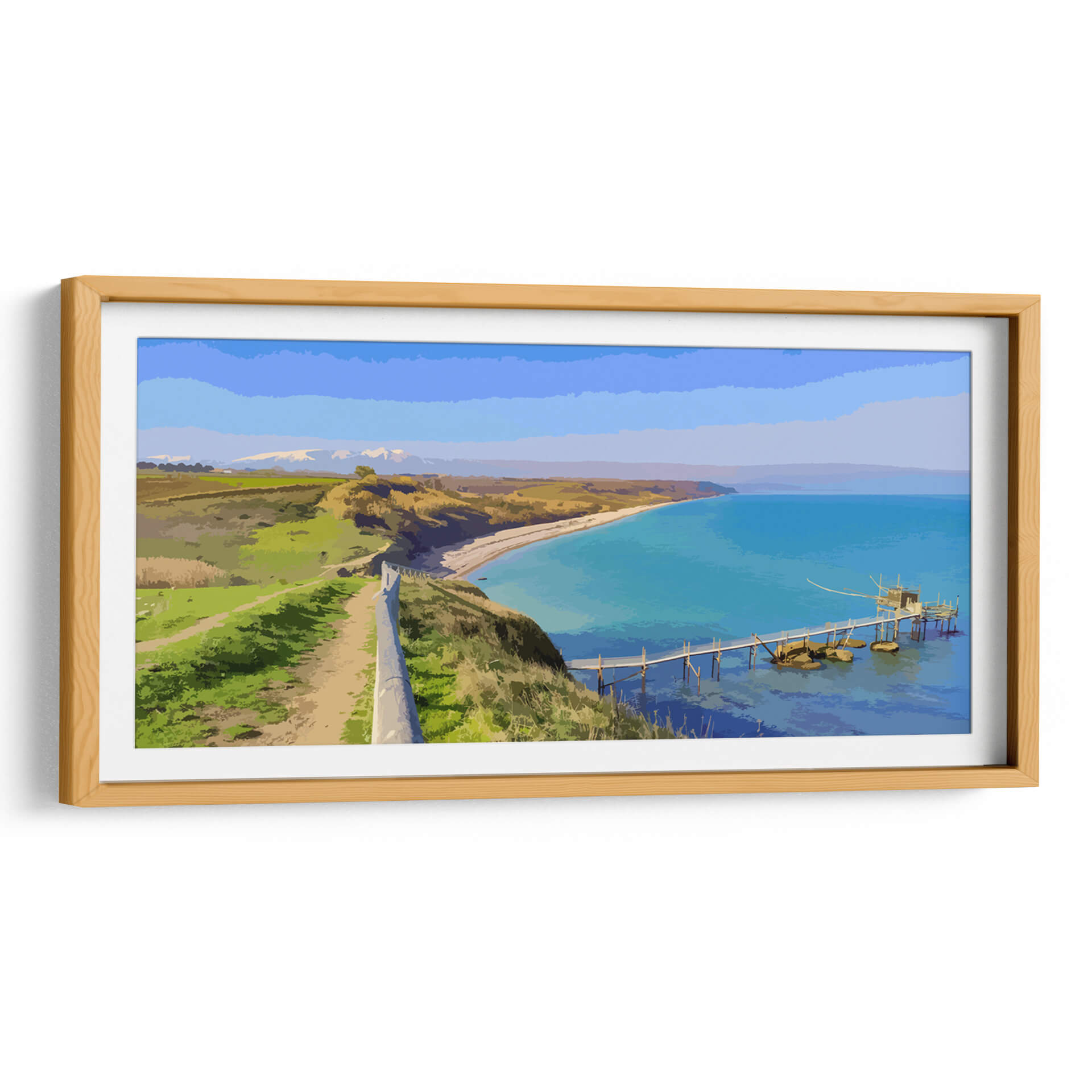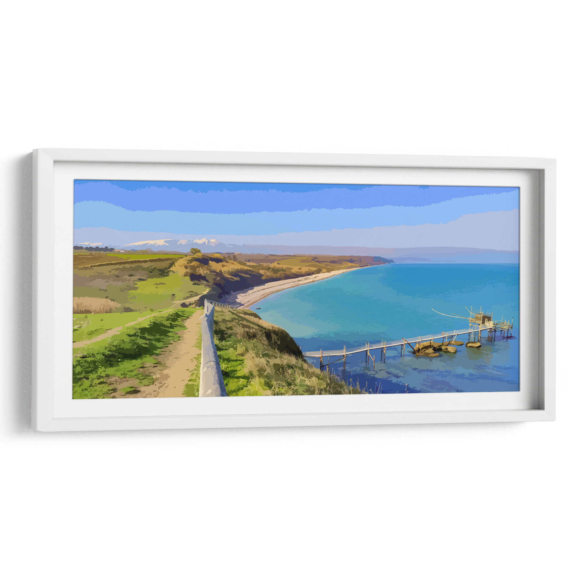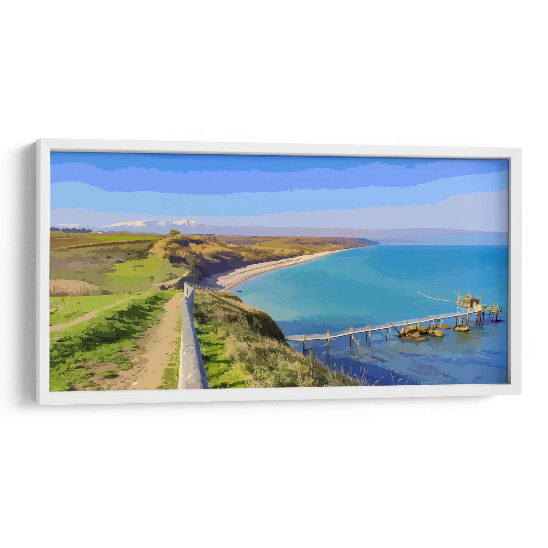 Sumérgete en la serenidad de "Paisaje Real", una cautivadora obra de arte digital que captura la esencia de una costa idílica. El artista Jabin Adiel nos transporta a un rincón donde la tierra se encuentra con el mar en una armonía de colores vibrantes y formas estilizadas. La composición se despliega desde un sendero que serpentea por una colina verde exuberante, bordeada por un muro de piedra que guía la mirada hacia el horizonte. A lo lejos, montañas nevadas coronan un paisaje de campos dorados y verdes, evocando una sensación de paz y amplitud. El protagonista indiscutible es el mar turquesa, cuyas aguas cristalinas invitan a la contemplación. Un pintoresco embarcadero de madera se adentra en el mar, culminando en una estructura tradicional que añade un toque de encanto rústico a la escena. La paleta de colores, dominada por azules intensos, verdes vivos y ocres cálidos, crea una atmósfera de tranquilidad y frescura, ideal para cualquier espacio que busque transmitir calma y belleza natural. Este cuadro decorativo es perfecto para añadir un punto focal sereno a tu salón, dormitorio u oficina, transformando cualquier ambiente en un refugio de paz y inspiración visual.