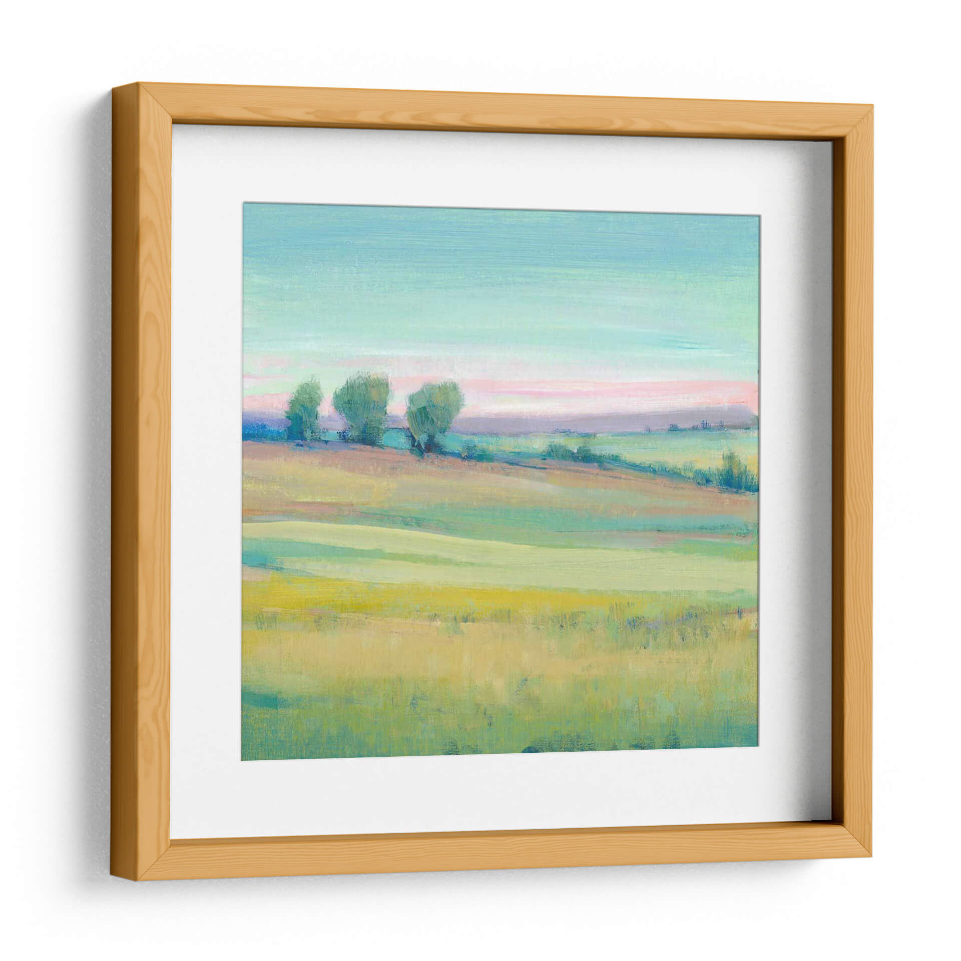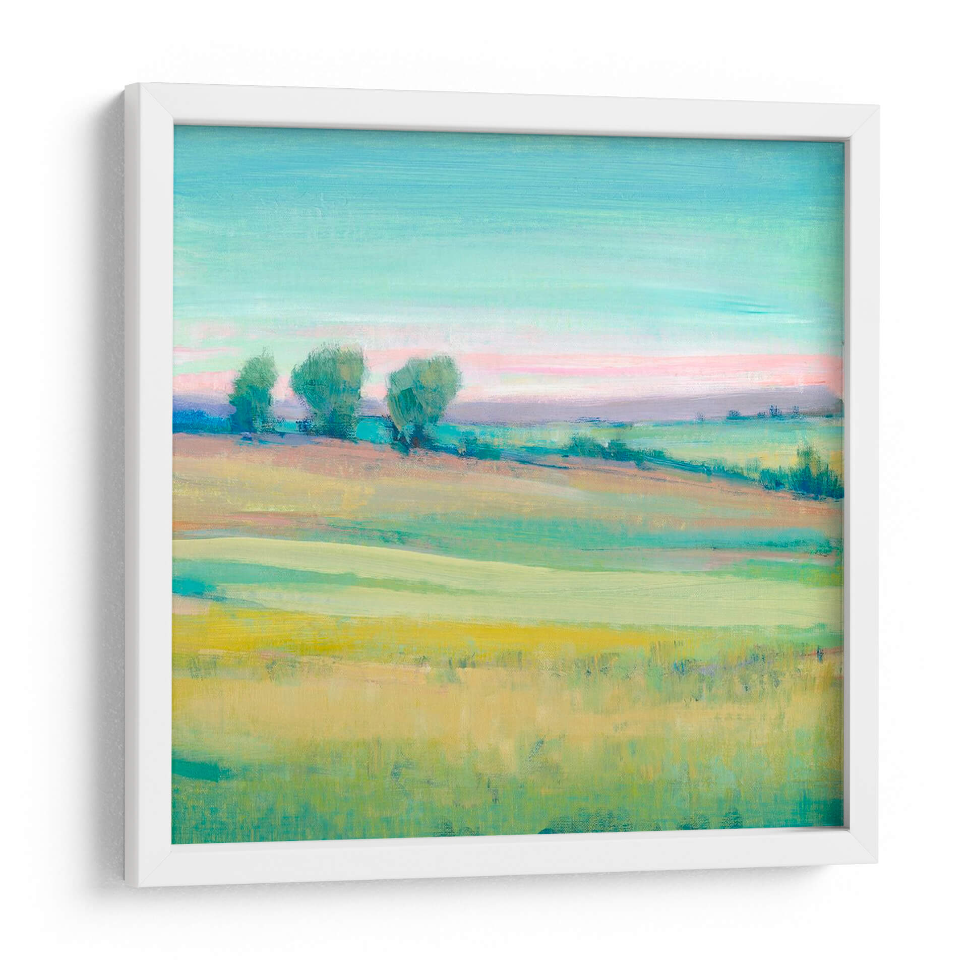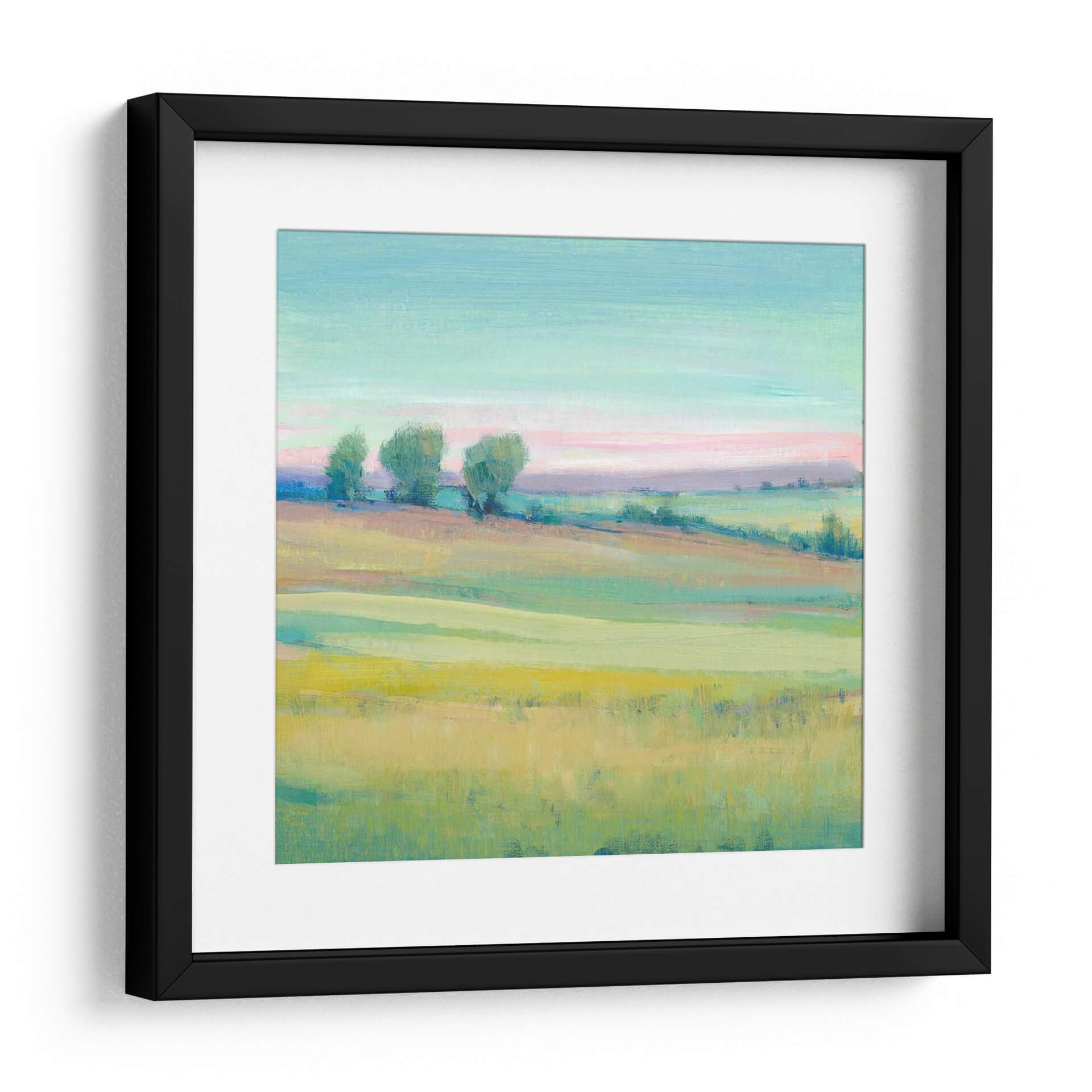 Sumérgete en la serenidad de "Paisaje Vivo V", una cautivadora obra de arte que captura la esencia de un campo vibrante bañado por la luz del amanecer o el atardecer. Las pinceladas sueltas y expresivas de Tim O'Toole dan vida a colinas ondulantes y árboles estilizados, creando una atmósfera de paz y contemplación. La paleta de colores, dominada por tonos celestes, rosas pálidos, verdes frescos y toques de amarillo dorado, evoca una sensación de calma y optimismo, perfecta para infundir serenidad en cualquier espacio. Este cuadro decorativo es ideal para quienes buscan añadir un toque de naturaleza y arte contemporáneo a su hogar u oficina. Su estilo evocador y su composición equilibrada lo convierten en una pieza versátil, capaz de complementar desde una sala de estar moderna hasta un dormitorio tranquilo o un estudio inspirador. "Paisaje Vivo V" no es solo una imagen, es una invitación a la introspección y a la apreciación de la belleza efímera del mundo natural, transformando tu pared en una ventana a un mundo de color y tranquilidad.