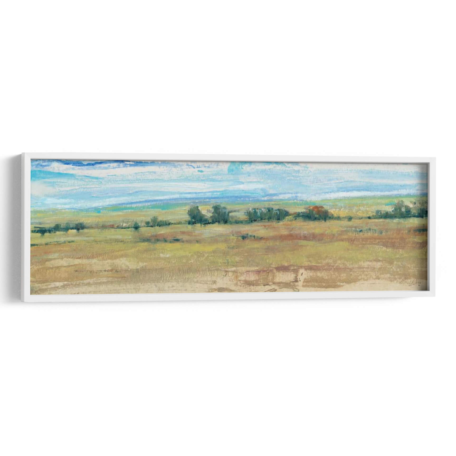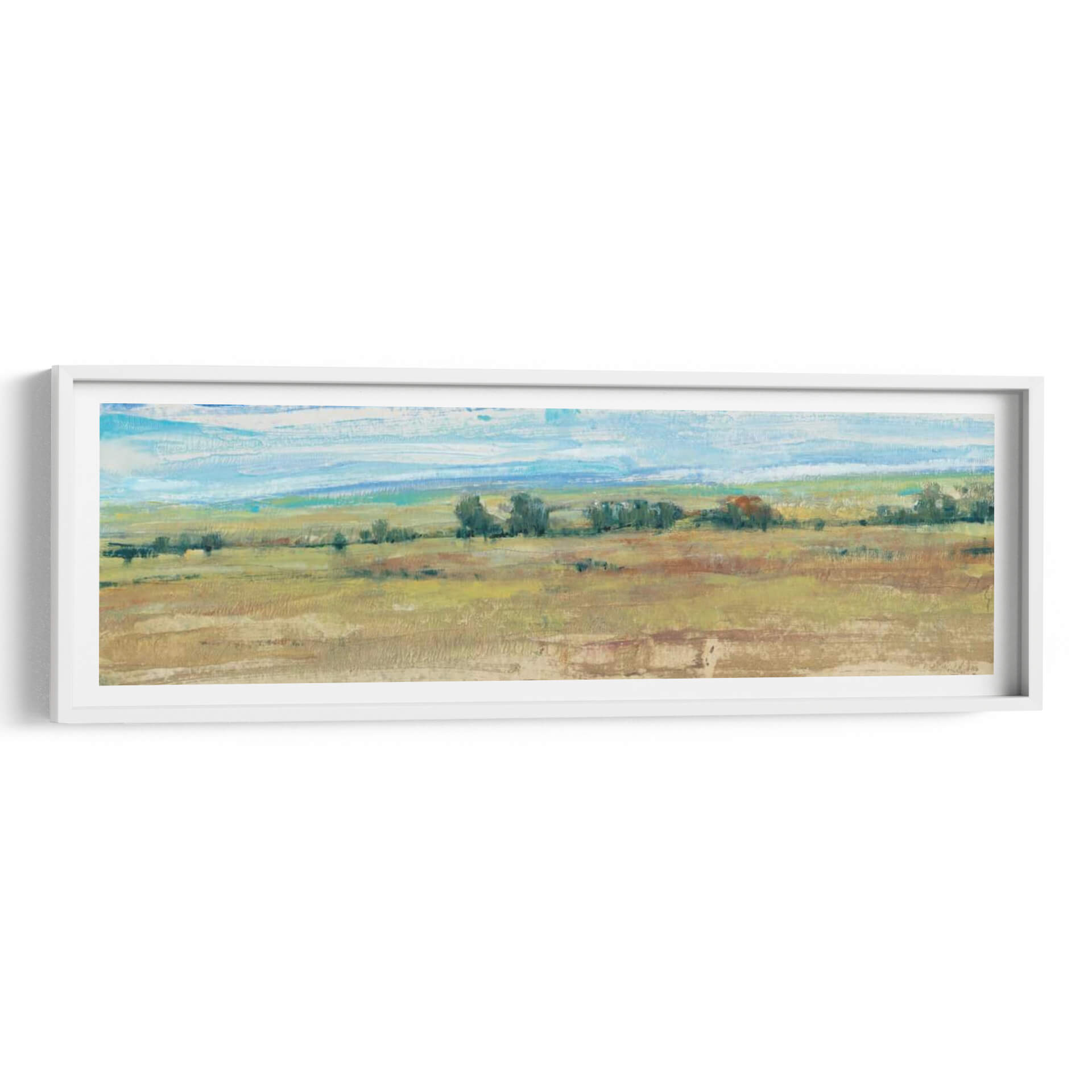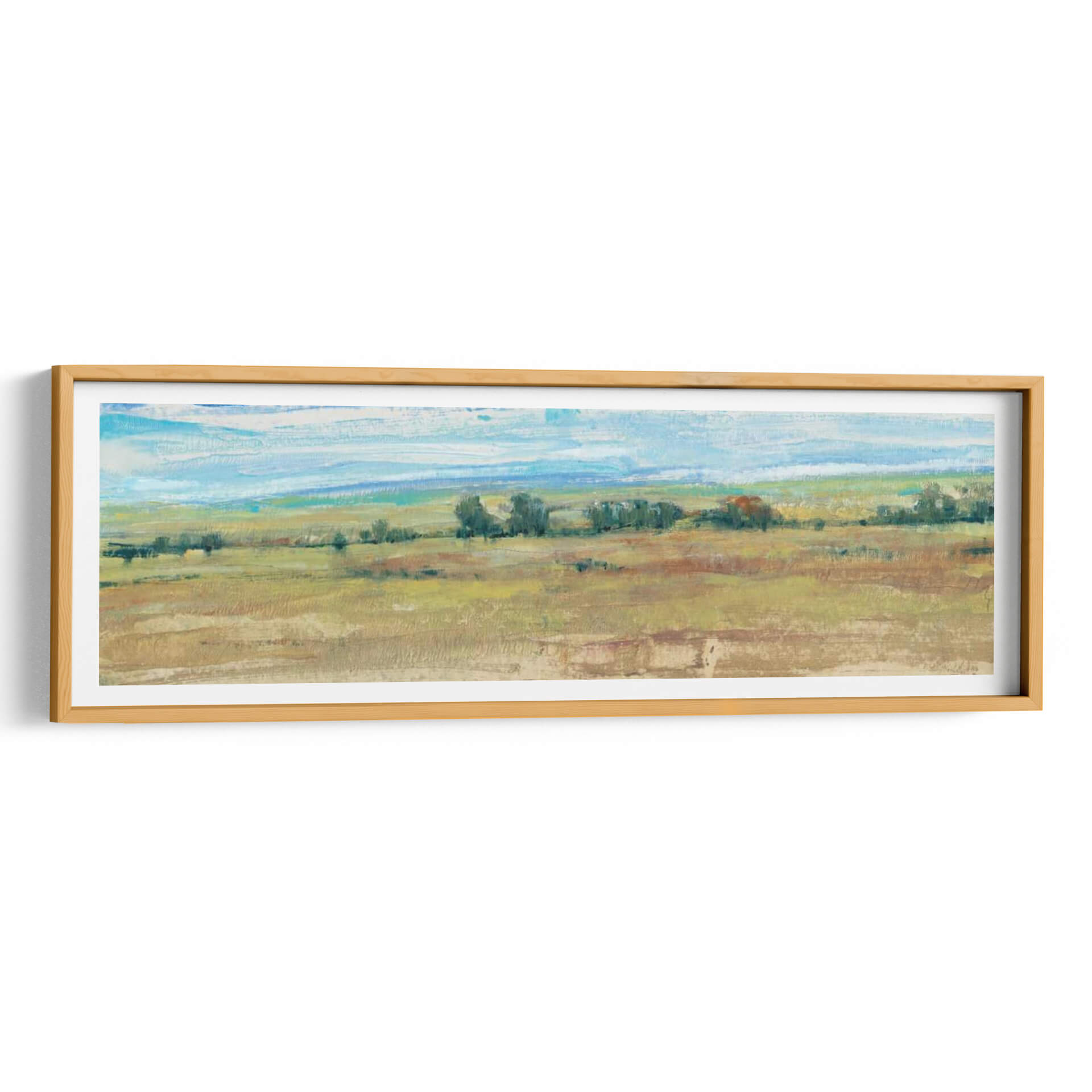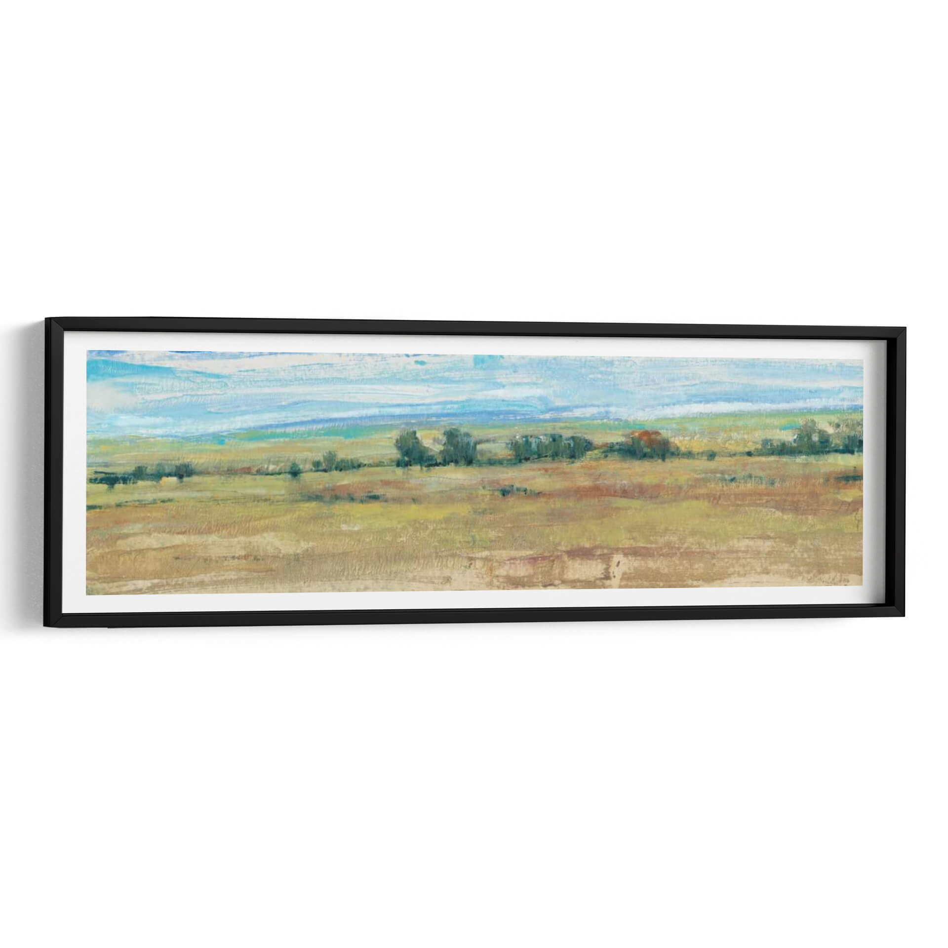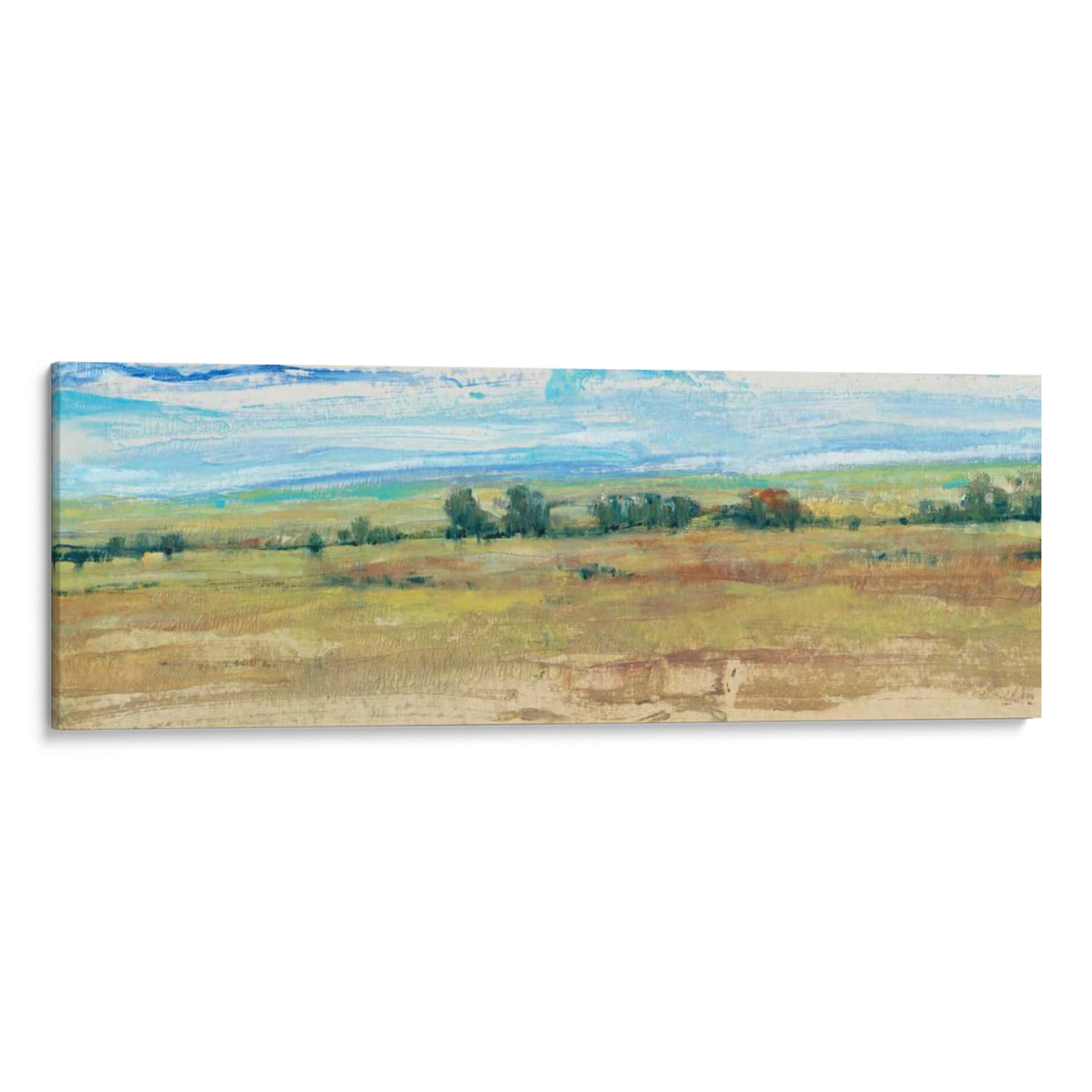 Sumérgete en la serenidad de 'Panel Distante De Treeline I', una obra de arte contemporáneo que captura la esencia de un paisaje campestre con una perspectiva evocadora. El artista Tim O'Toole utiliza una paleta de colores terrosos, verdes suaves y azules celestes, aplicados con pinceladas sueltas y expresivas que sugieren movimiento y vida. La composición panorámica se extiende horizontalmente, invitando a la contemplación de la vastedad del horizonte y la sutil presencia de árboles distantes. Esta pieza evoca una sensación de calma y conexión con la naturaleza, perfecta para añadir un toque de tranquilidad a tu hogar u oficina. Ideal para salones, dormitorios o cualquier espacio que busque un refugio visual de la rutina diaria. Transforma tu pared en una ventana a un mundo de paz y belleza natural con este cuadro decorativo único. Su estilo impresionista moderno se integra fácilmente en diversas decoraciones, aportando un aire de sofisticación artística y serenidad.