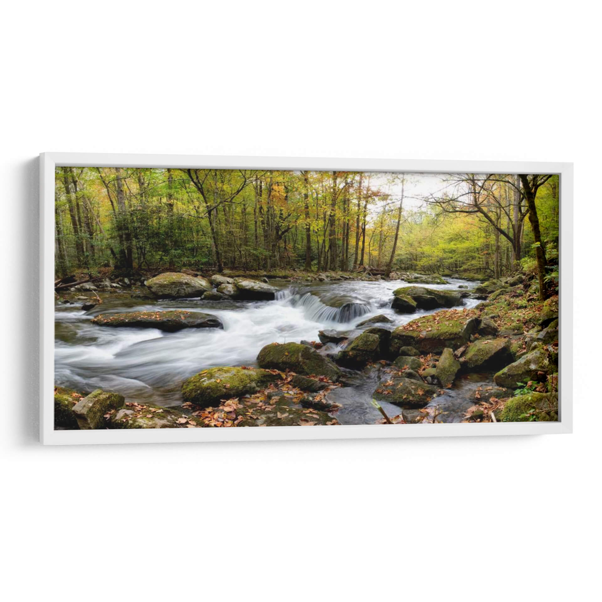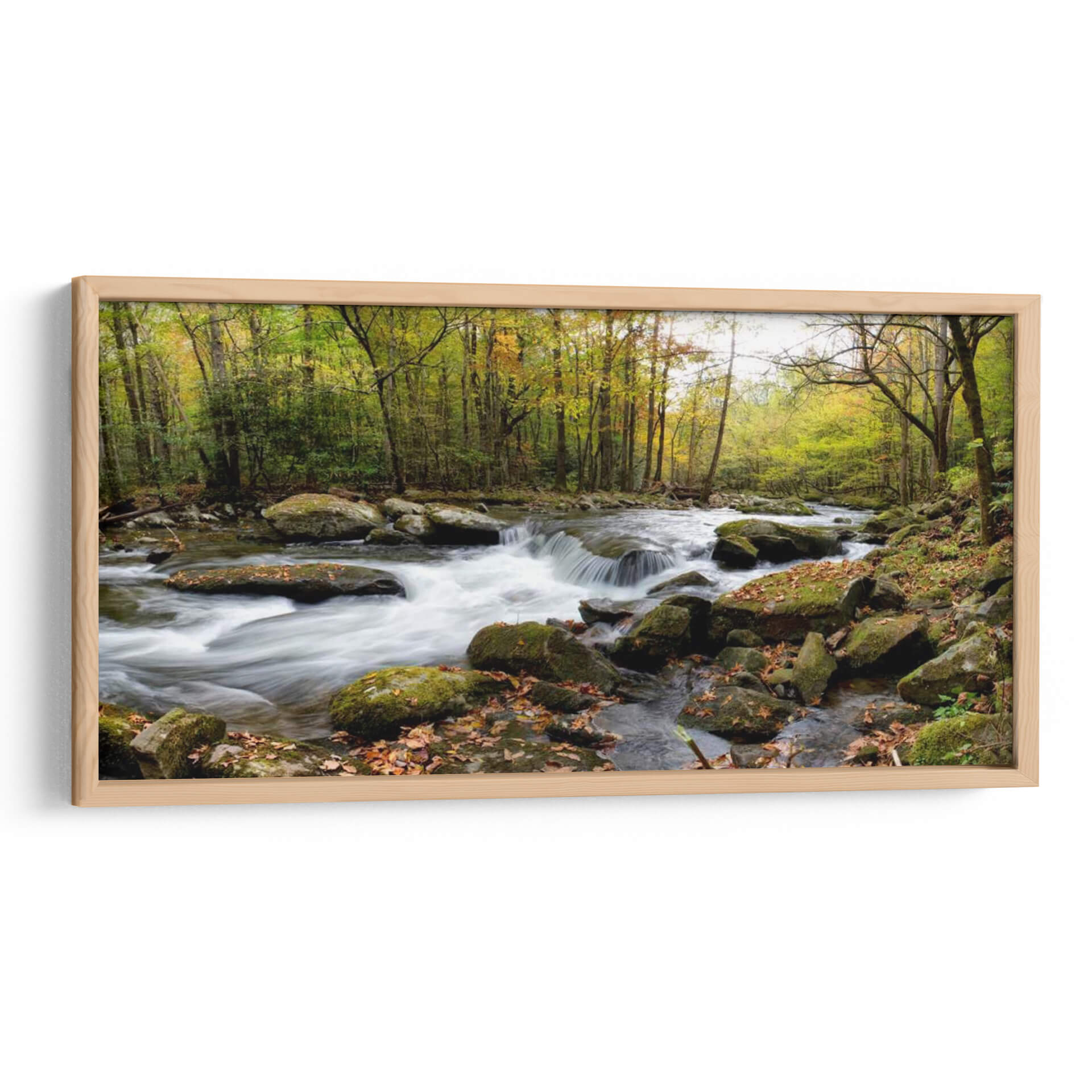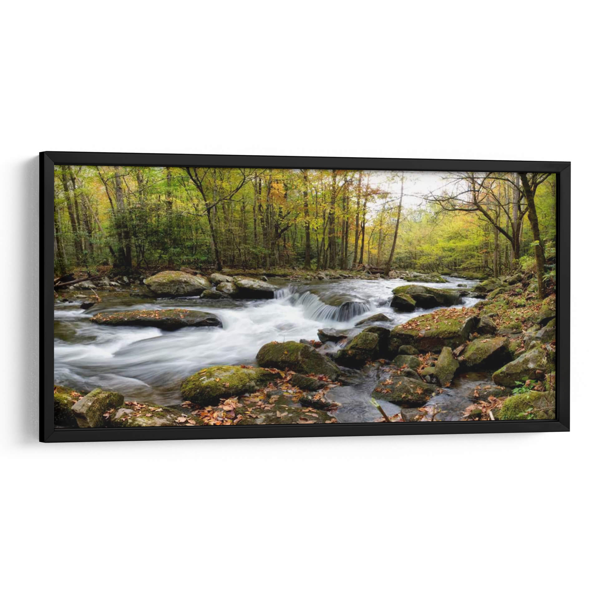 Sumérgete en la serenidad de la naturaleza con "Panorama De Flujo Sobre Flujo", una cautivadora obra de arte de Danny Head que captura la esencia de un río serpenteante a través de un bosque frondoso. La imagen presenta un flujo de agua dinámico y arremolinado, flanqueado por rocas cubiertas de musgo y la exuberante vegetación otoñal. Los vibrantes tonos verdes de los árboles se mezclan con los cálidos ocres y dorados de las hojas caídas, creando una paleta de colores rica y armoniosa que evoca una sensación de paz y conexión con la naturaleza. La técnica fotográfica, que utiliza una larga exposición, suaviza el movimiento del agua, dándole una cualidad etérea y casi pictórica a la escena. Este cuadro decorativo es ideal para añadir un toque de tranquilidad y belleza natural a cualquier espacio, ya sea un salón moderno, una acogedora sala de estar o un sereno dormitorio. Su composición panorámica ofrece una vista expansiva que invita a la contemplación, convirtiéndose en un punto focal inspirador que transporta al espectador a un remanso de calma. "Panorama De Flujo Sobre Flujo" no es solo una decoración, es una ventana a la belleza intemporal de la naturaleza.