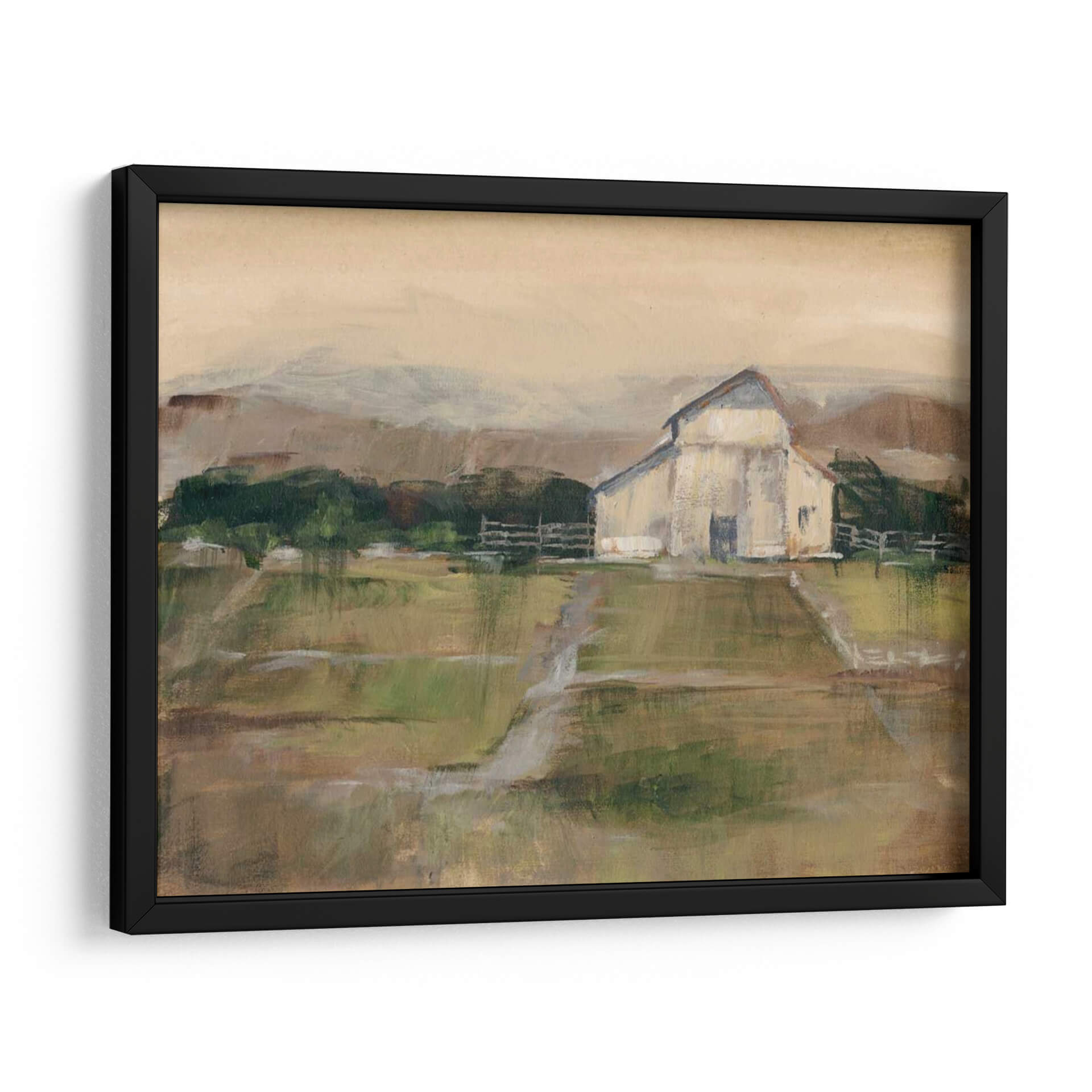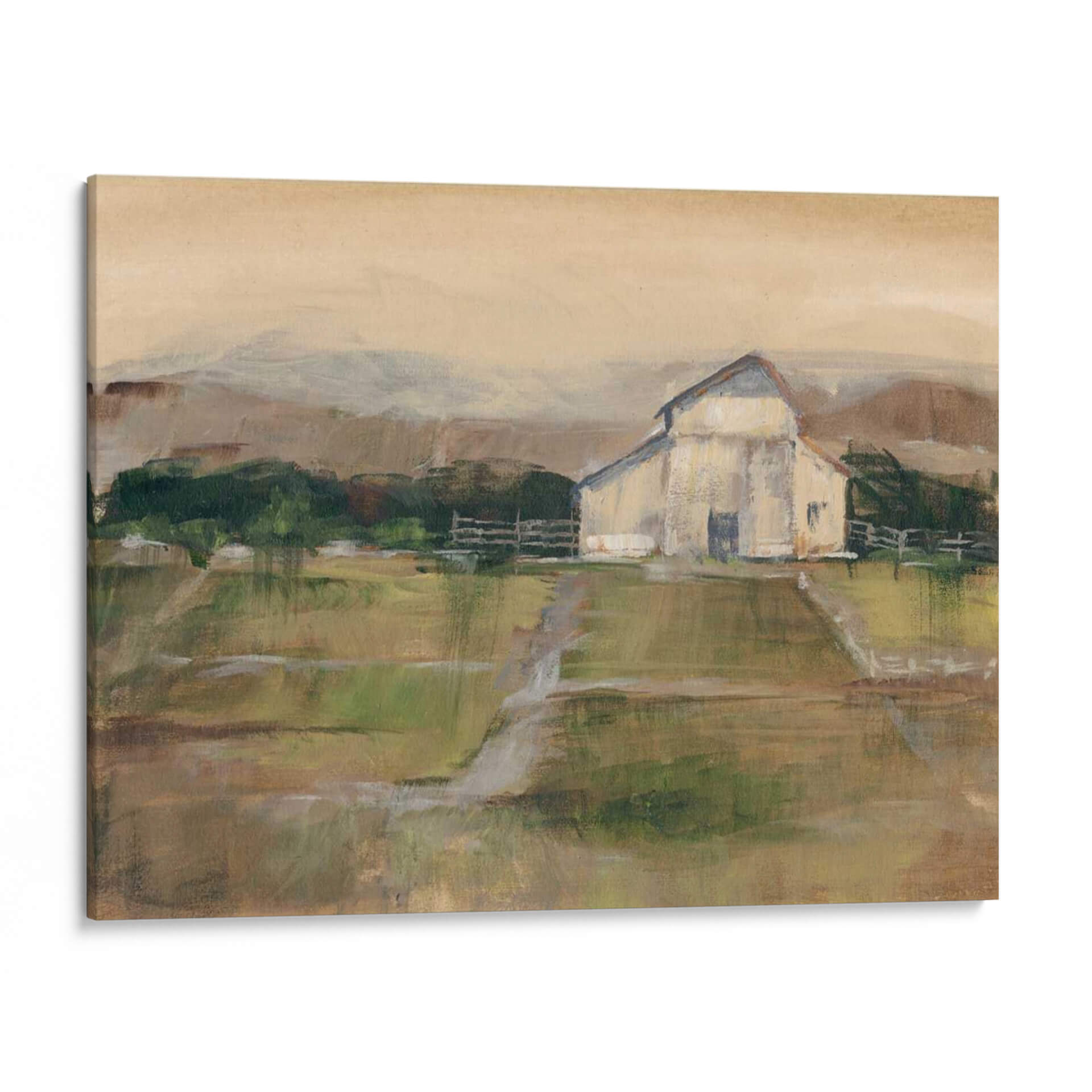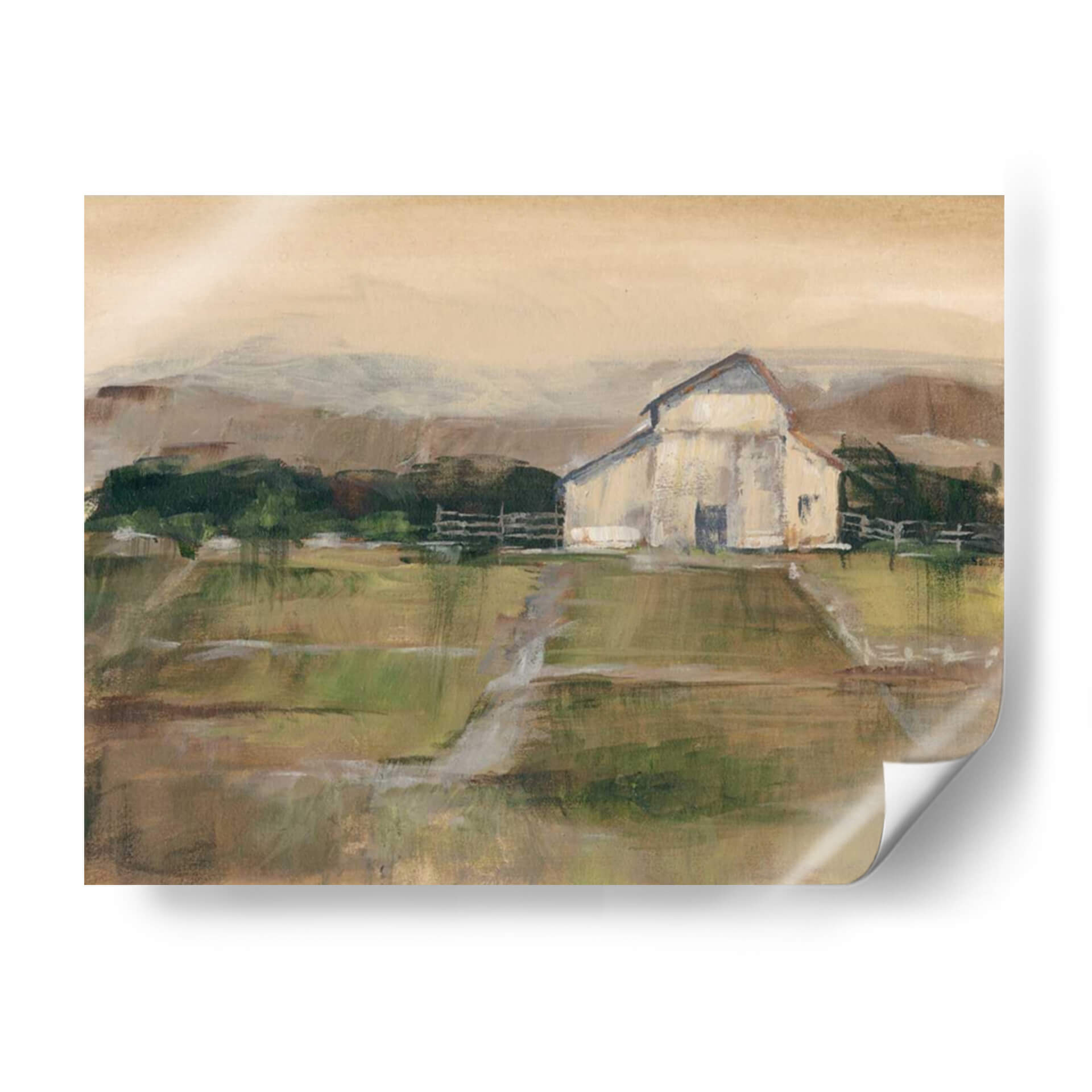 Sumérgete en la serenidad del campo con 'Piedra Simile II', una obra de arte que captura la esencia de un paisaje rural con una paleta de colores tierra y verdes suaves. El artista Ethan Harper nos presenta una interpretación impresionista y evocadora de un granero blanco enmarcado por colinas y un cielo de tonos ocre, transmitiendo una atmósfera de calma y nostalgia. Las pinceladas sueltas y la textura visual invitan a la contemplación, creando un punto focal perfecto para cualquier espacio que busque un toque de naturaleza y tranquilidad. Este cuadro decorativo es ideal para salones, dormitorios o estudios, aportando una sensación de paz y conexión con lo terrenal. Su estilo atemporal y su composición equilibrada lo convierten en una pieza versátil, capaz de complementar desde decoraciones rústicas hasta ambientes más modernos que buscan un respiro natural. 'Piedra Simile II' no es solo una imagen, es una invitación a ralentizar el ritmo y apreciar la belleza serena de la vida rural, añadiendo profundidad y carácter a tu hogar u oficina con su encanto sutil y su calidad artística.