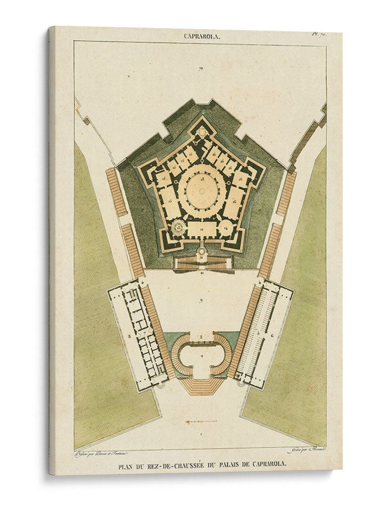 Descubre el "Plan Du Rez De Chaussee Du Palais", una obra maestra arquitectónica del renombrado Bonnard, que transporta la elegancia y la historia a tus espacios. Este detallado plano de planta del Palacio de Caprarola revela una simetría impecable y una disposición intrincada que evoca el diseño renacentista y la planificación urbanística de antaño. La paleta de colores, dominada por tonos tierra, verdes apagados y toques de sepia, imparte una atmósfera de sofisticación atemporal y un aire de erudición. Cada línea y cada sección del plano están representadas con una claridad exquisita, invitando a la contemplación de la genialidad arquitectónica. Este cuadro decorativo es ideal para estudios, bibliotecas, oficinas o cualquier estancia donde se valore la historia, la precisión y un diseño que inspire intelectualidad. Transforma tu pared en una ventana a la historia de la arquitectura, añadiendo un toque de distinción y profundidad a tu decoración. La elegancia de esta pieza trasciende el tiempo, convirtiéndola en una adición valiosa para coleccionistas y amantes del diseño clásico.