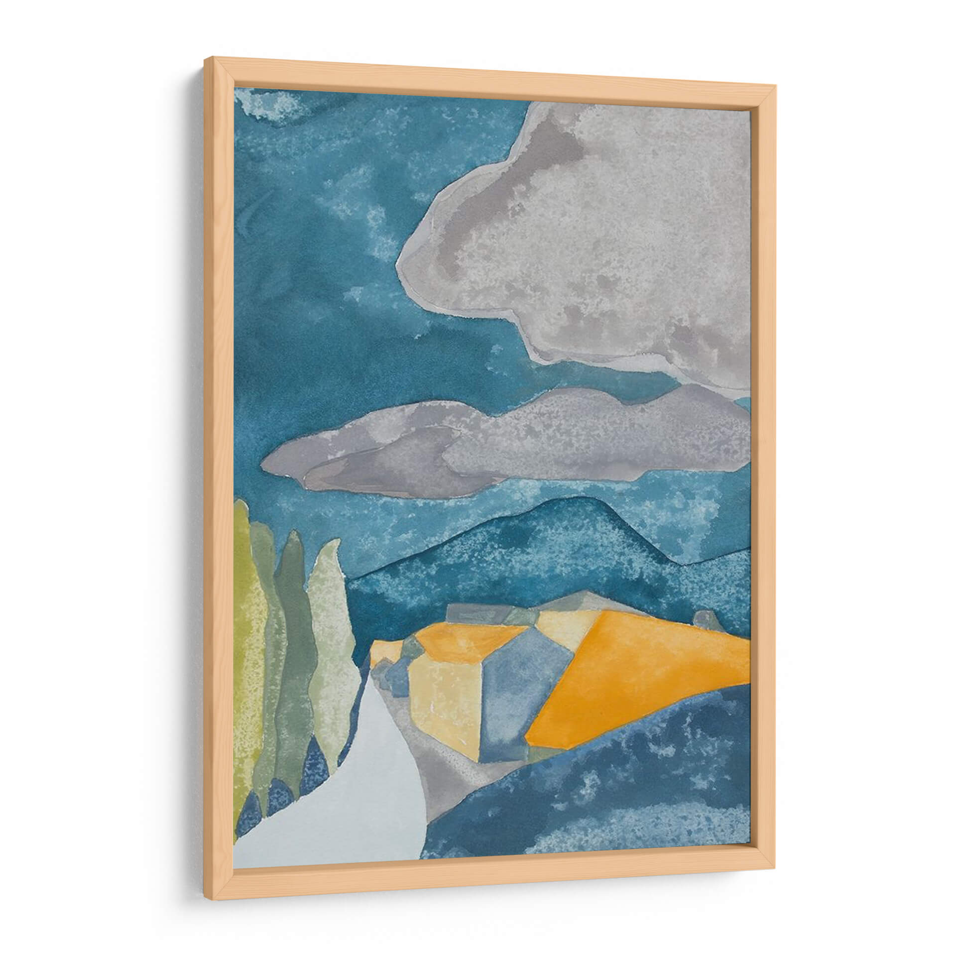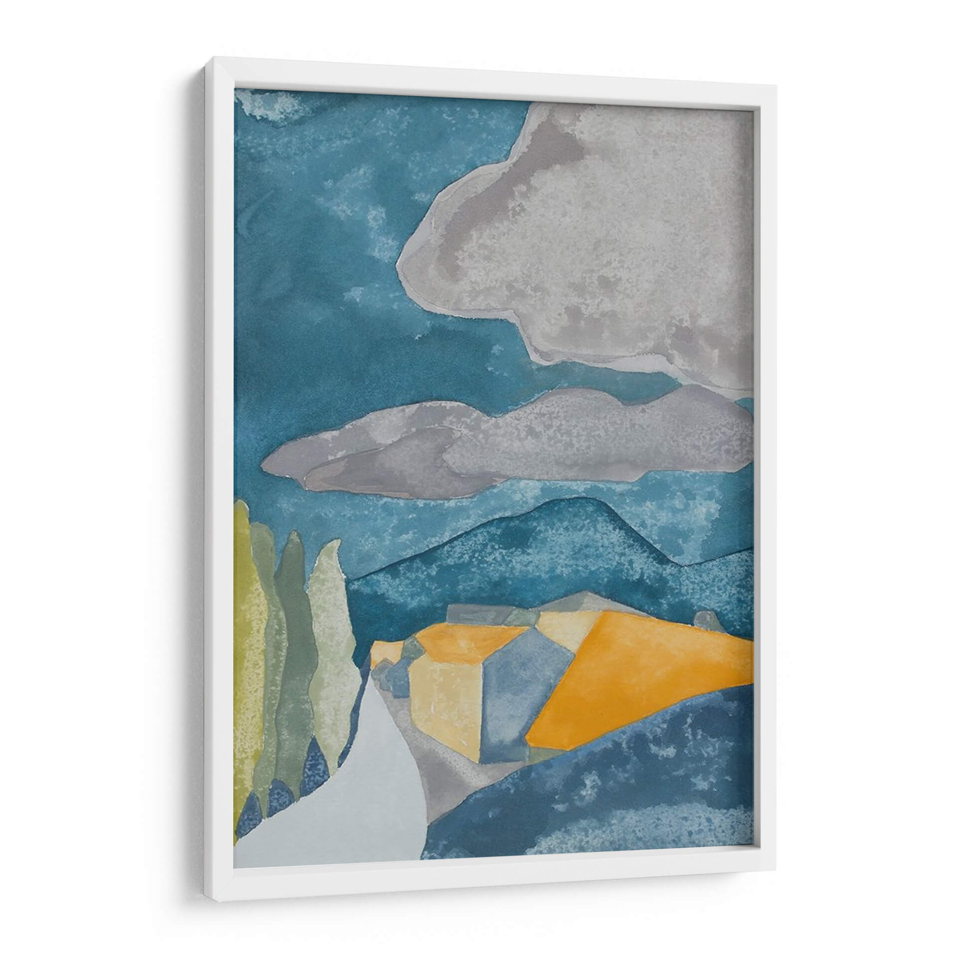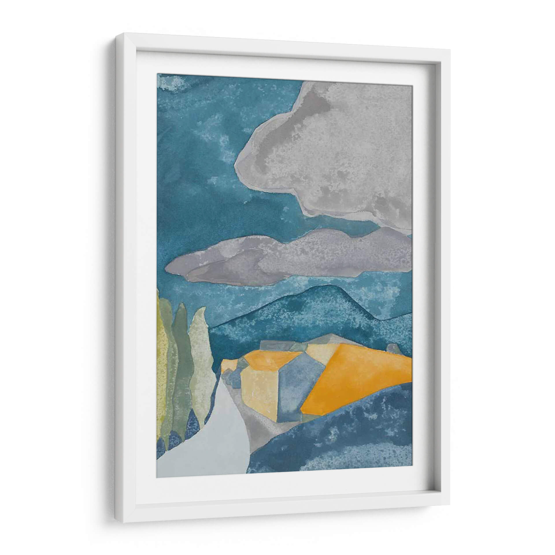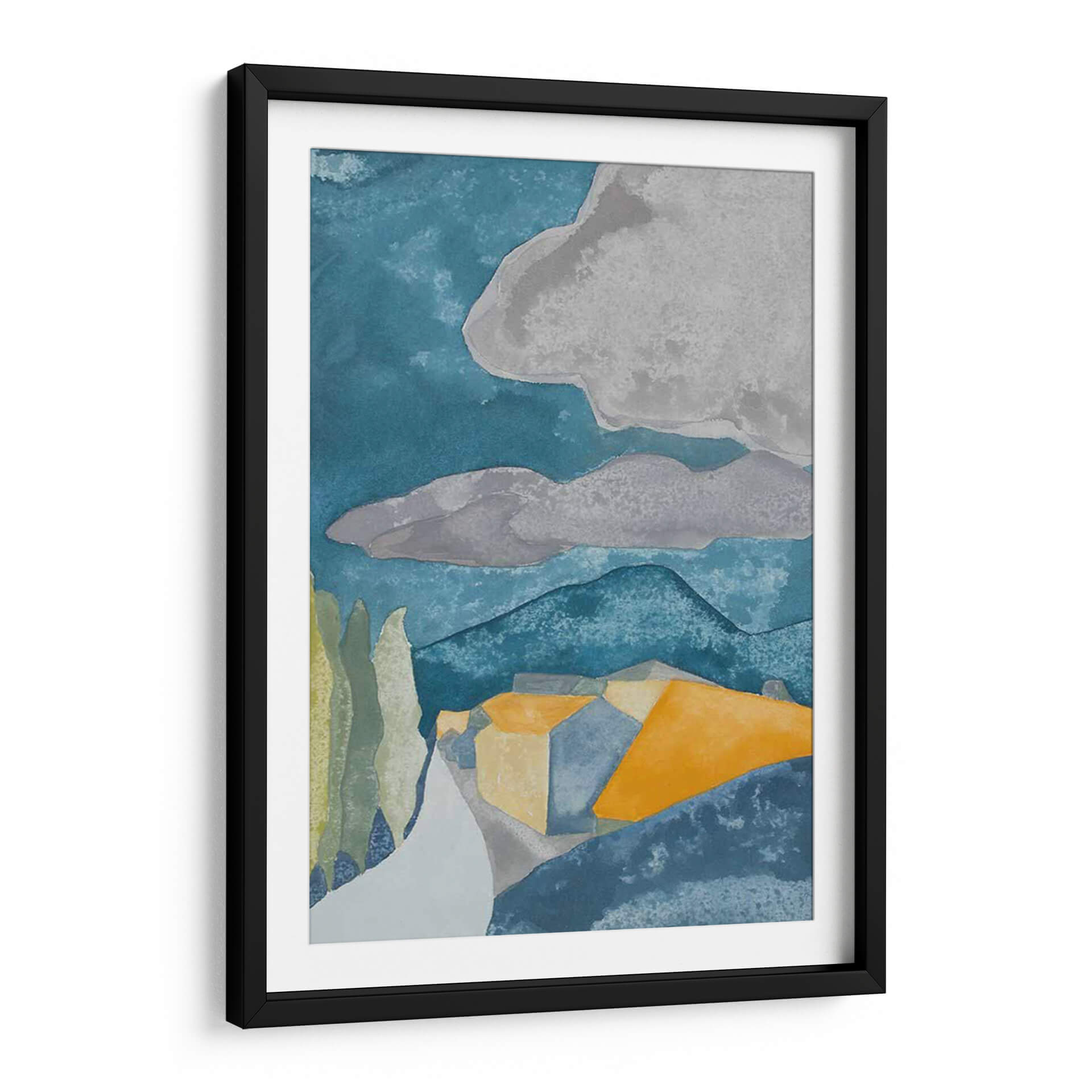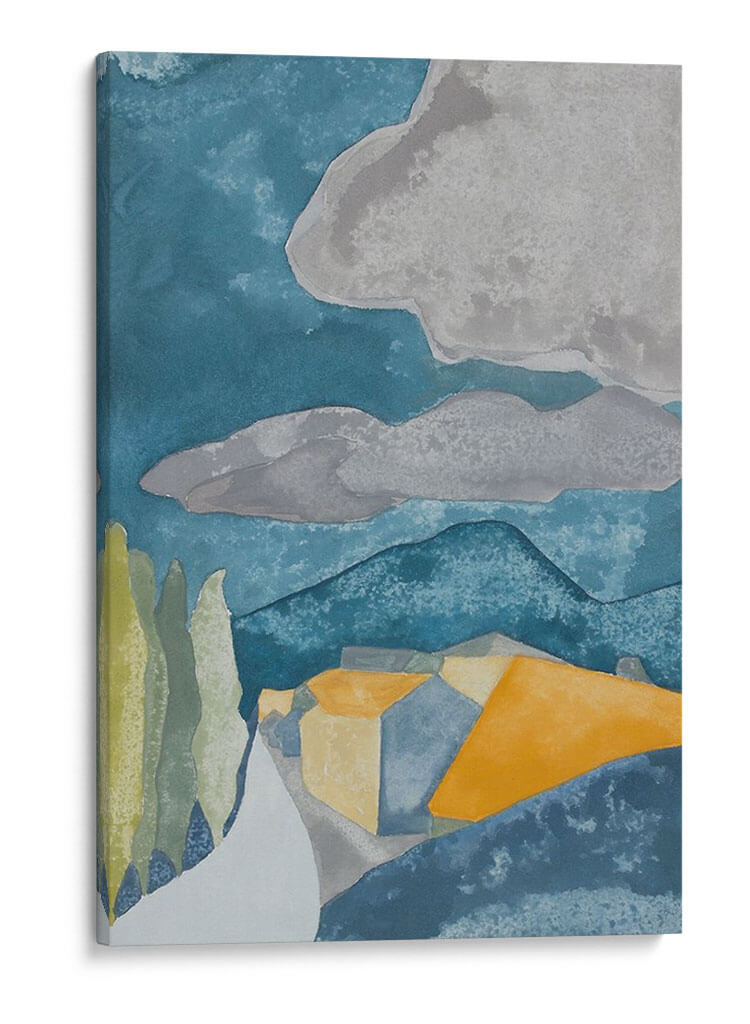 Sumérgete en la serena belleza de "Pueblo Francés I", una obra de arte cautivadora de Rob Delamater. Este cuadro decorativo abstracto evoca la atmósfera de un pintoresco pueblo francés a través de una paleta de colores cuidadosamente seleccionada. Las profundas tonalidades azules del cielo y las montañas contrastan armoniosamente con los cálidos ocres y amarillos de las casas, creando una sensación de profundidad y calidez. Las formas geométricas y simplificadas de la arquitectura, junto con las siluetas estilizadas de los árboles, confieren a la pieza un aire moderno y estilizado, reminiscente de las acuarelas pero con una estructura sólida. Las nubes grises en el cielo aportan un toque melancólico y contemplativo, sugiriendo un momento de calma antes de una brisa. "Pueblo Francés I" es ideal para añadir un toque de sofisticación y un aire de escapismo a cualquier sala de estar, estudio o dormitorio. Su composición equilibrada y su uso evocador del color lo convierten en un punto focal perfecto para espacios que buscan una conexión con la naturaleza y la arquitectura mediterránea, aportando serenidad y un toque artístico distintivo a tu decoración.