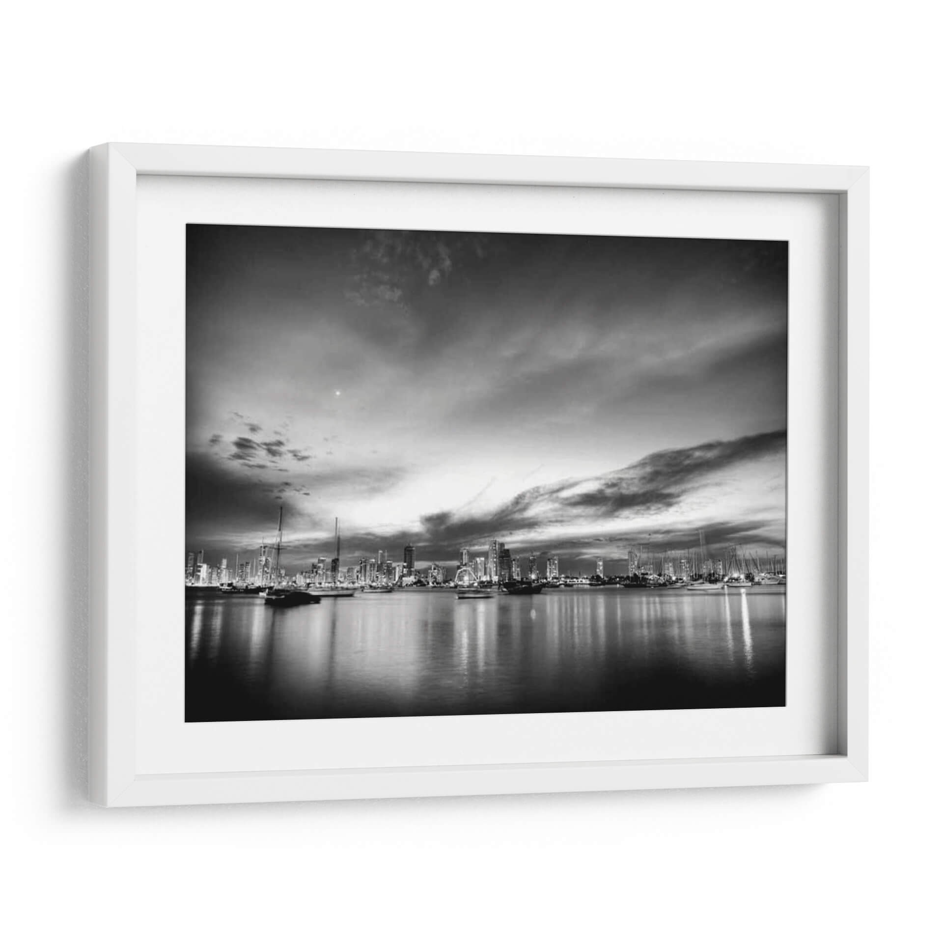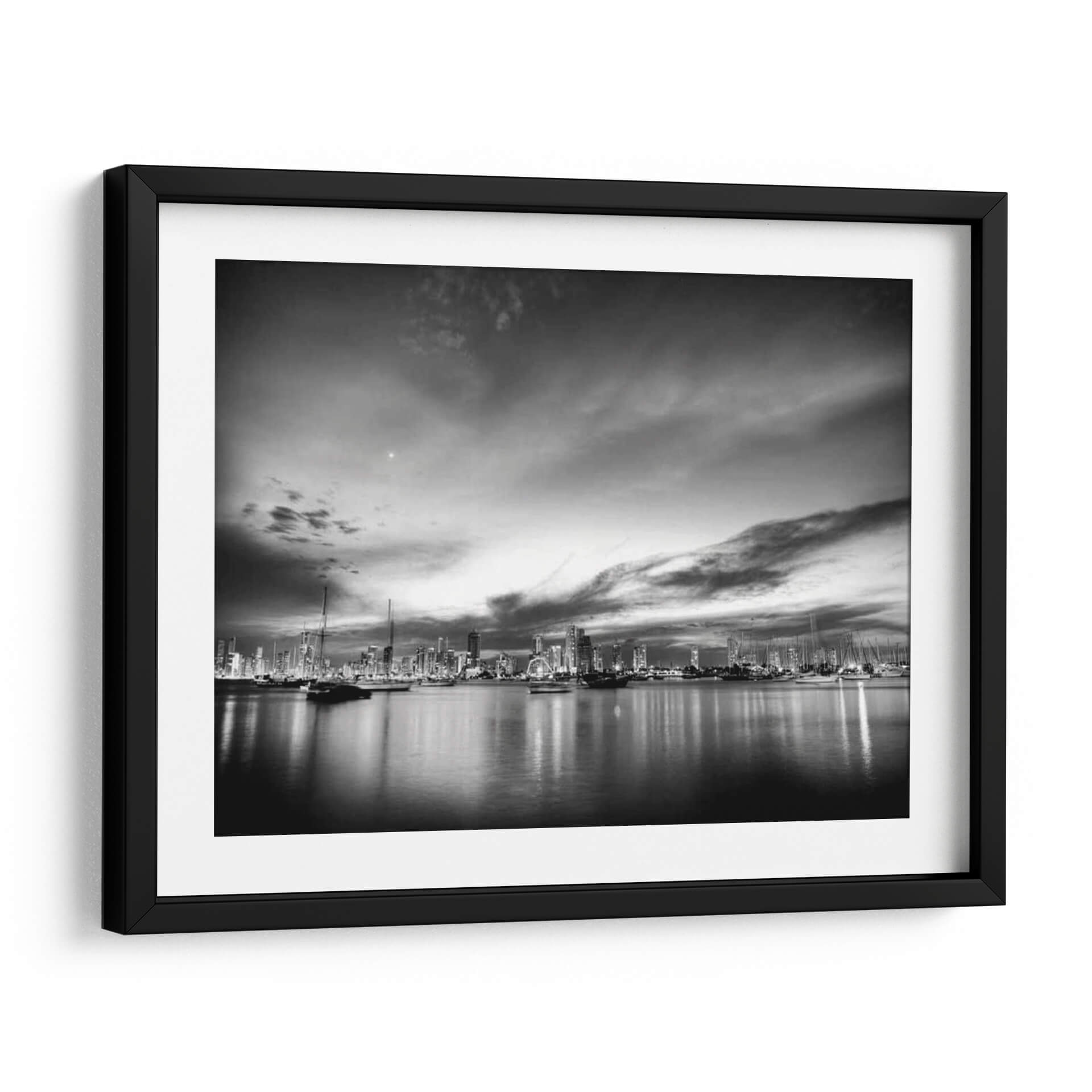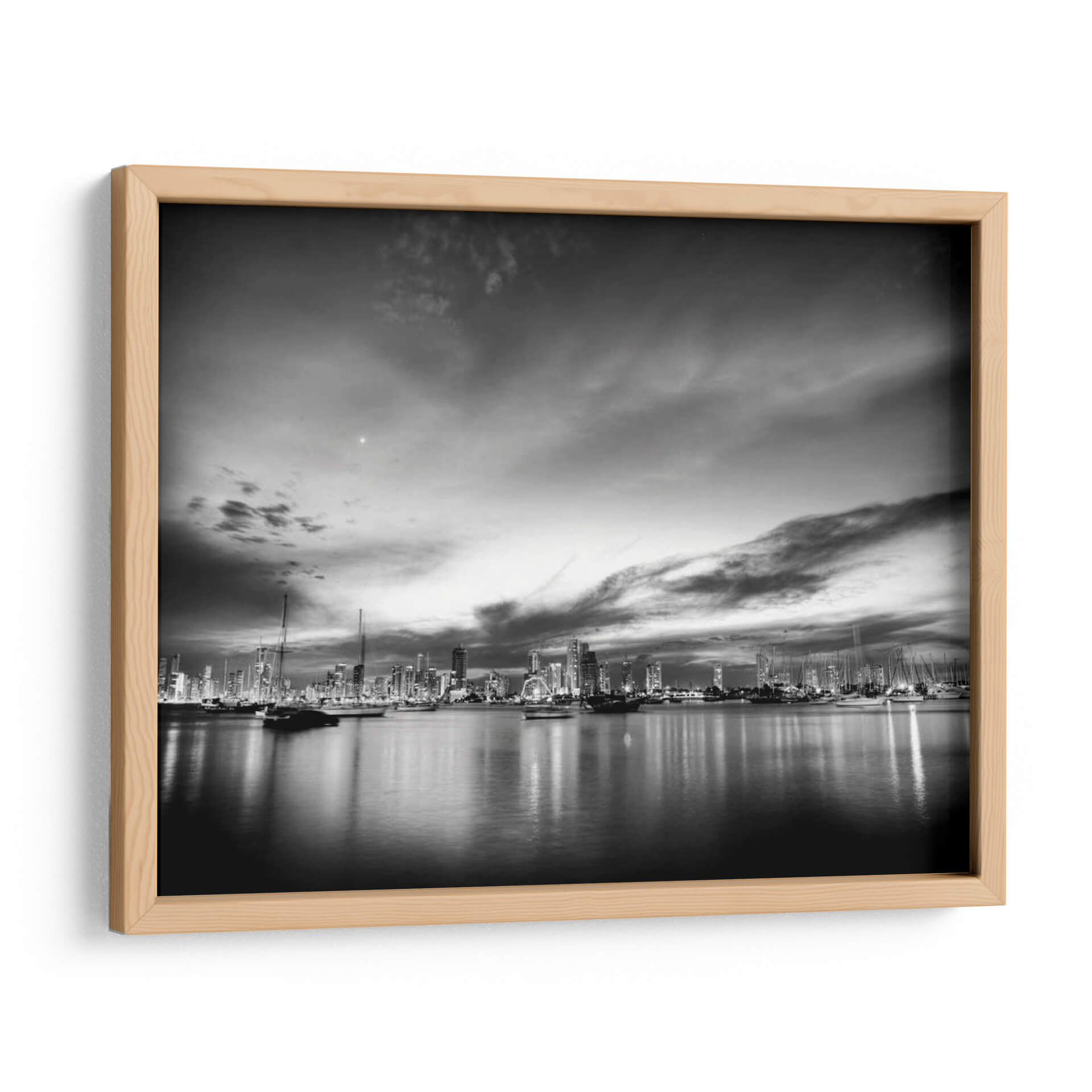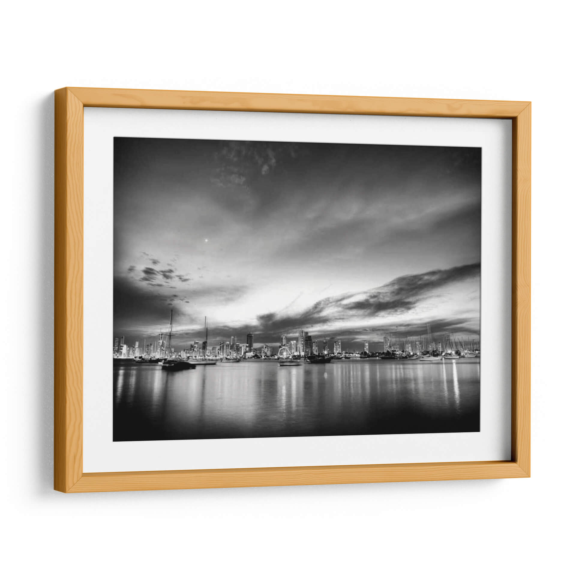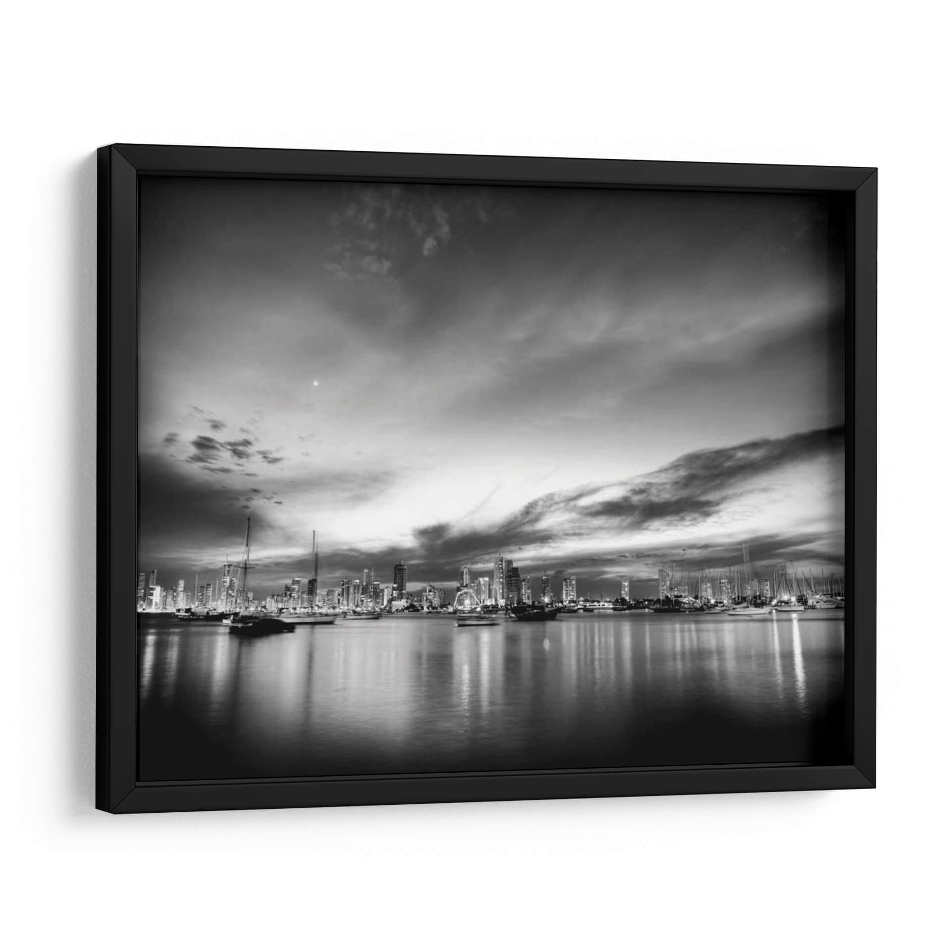 Captura la majestuosidad de un horizonte urbano al atardecer con este impresionante cuadro decorativo en blanco y negro. La obra, titulada "Puesta De Sol De Banda Reflejos" del artista Nish Nalbandian, presenta una vista panorámica de una ciudad costera iluminada, con rascacielos que se elevan contra un cielo dramático y nubes texturizadas. El primer plano está dominado por la serena superficie del agua, que refleja las luces de la ciudad y las siluetas de los veleros anclados, creando una atmósfera de calma y sofisticación. La paleta monocromática acentúa el contraste entre la luz y la sombra, aportando una profundidad y un carácter atemporal a la composición. Este cuadro decorativo es ideal para añadir un toque de elegancia y serenidad a cualquier espacio, ya sea una sala de estar moderna, un estudio o una oficina. Su diseño evocador invita a la contemplación, transportando al espectador a un momento de paz justo antes de que la noche cubra la ciudad. La composición equilibrada y la riqueza de detalles lo convierten en una pieza central que sin duda captará la atención y complementará diversos estilos de decoración, desde el contemporáneo hasta el clásico.