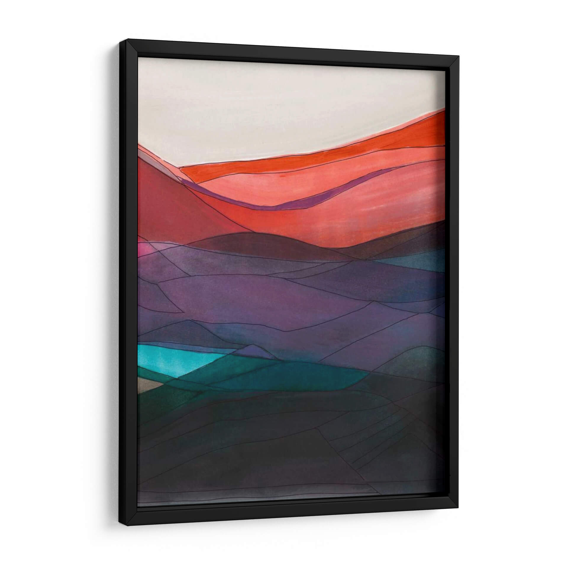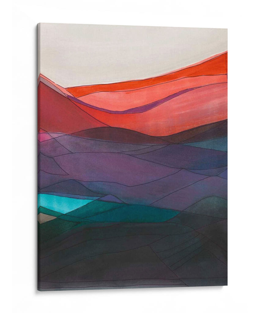 Sumérgete en la evocadora belleza de "Red Hills II" de Jodi Fuchs, un cuadro decorativo que captura la esencia de un paisaje montañoso con un giro contemporáneo. Esta obra maestra presenta una paleta de colores vibrante y audaz, que transita desde cálidos tonos rojizos y anaranjados en la cima hasta profundos púrpuras y misteriosos azules verdosos en las capas inferiores, culminando en una base oscura y terrosa. Las líneas finas y definidas segmentan las formas, aportando una estructura gráfica y moderna a la fluidez natural de las colinas. La composición crea una sensación de profundidad y perspectiva, invitando al espectador a explorar sus distintas capas. "Red Hills II" es una pieza ideal para infundir energía y sofisticación en cualquier espacio, ya sea una sala de estar moderna, un estudio o una oficina. Su estilo abstracto y la riqueza cromática lo convierten en un punto focal cautivador, perfecto para aquellos que buscan añadir un toque de arte contemporáneo con carácter y emoción a su decoración. Transforma tu hogar u oficina con este cautivador cuadro decorativo que combina la fuerza de la naturaleza con una visión artística única.