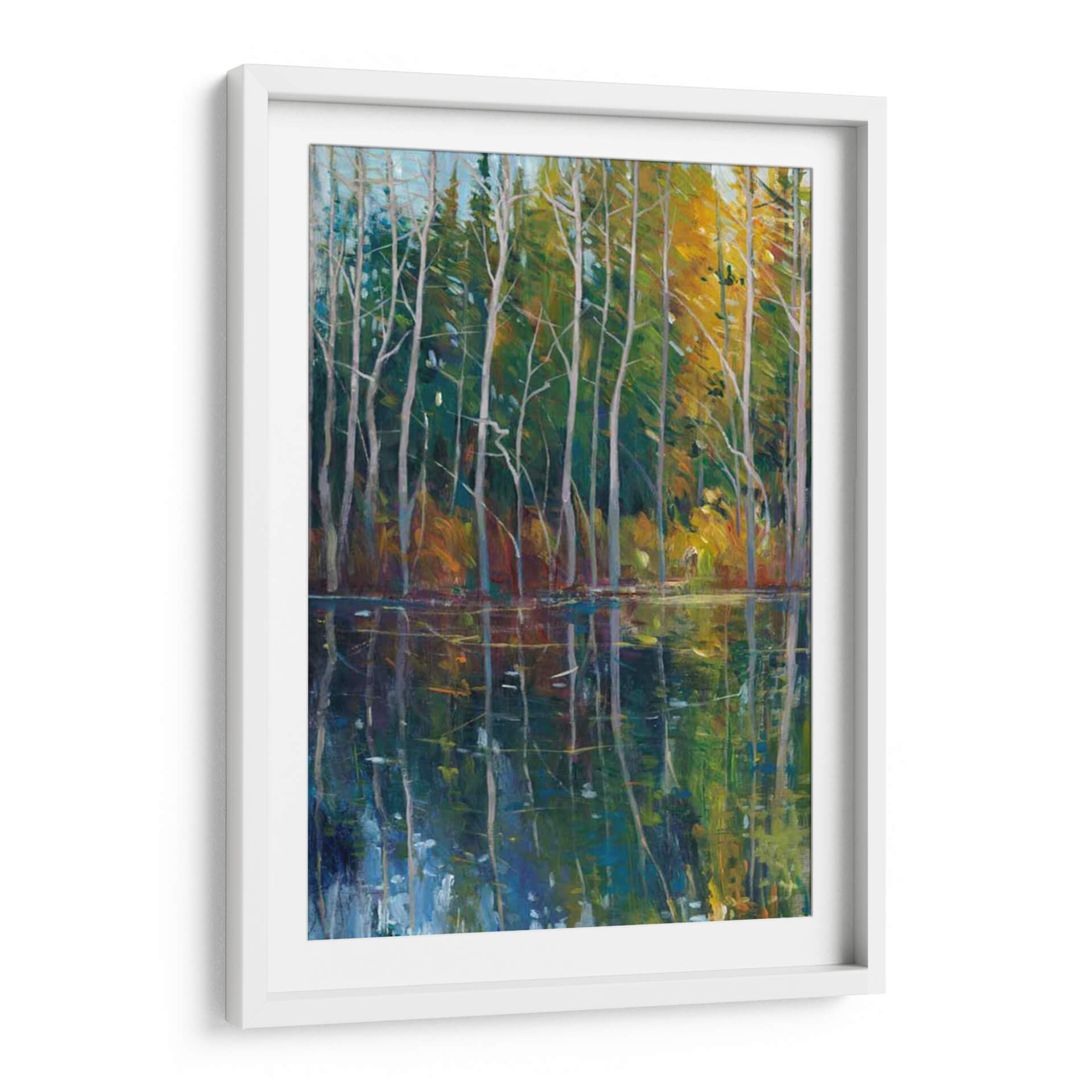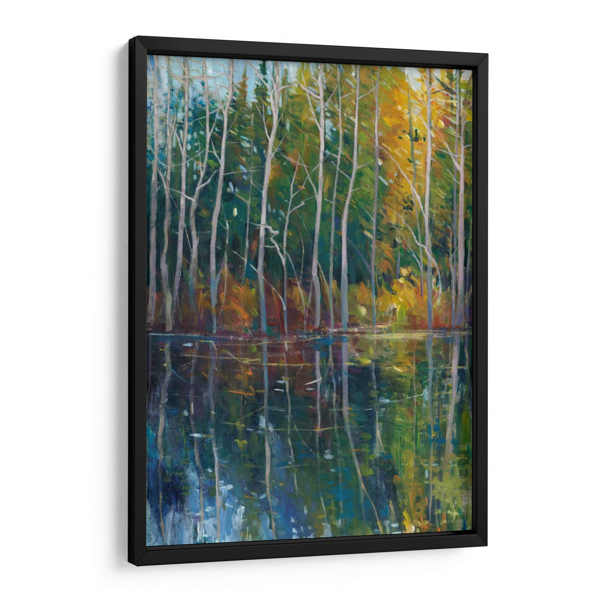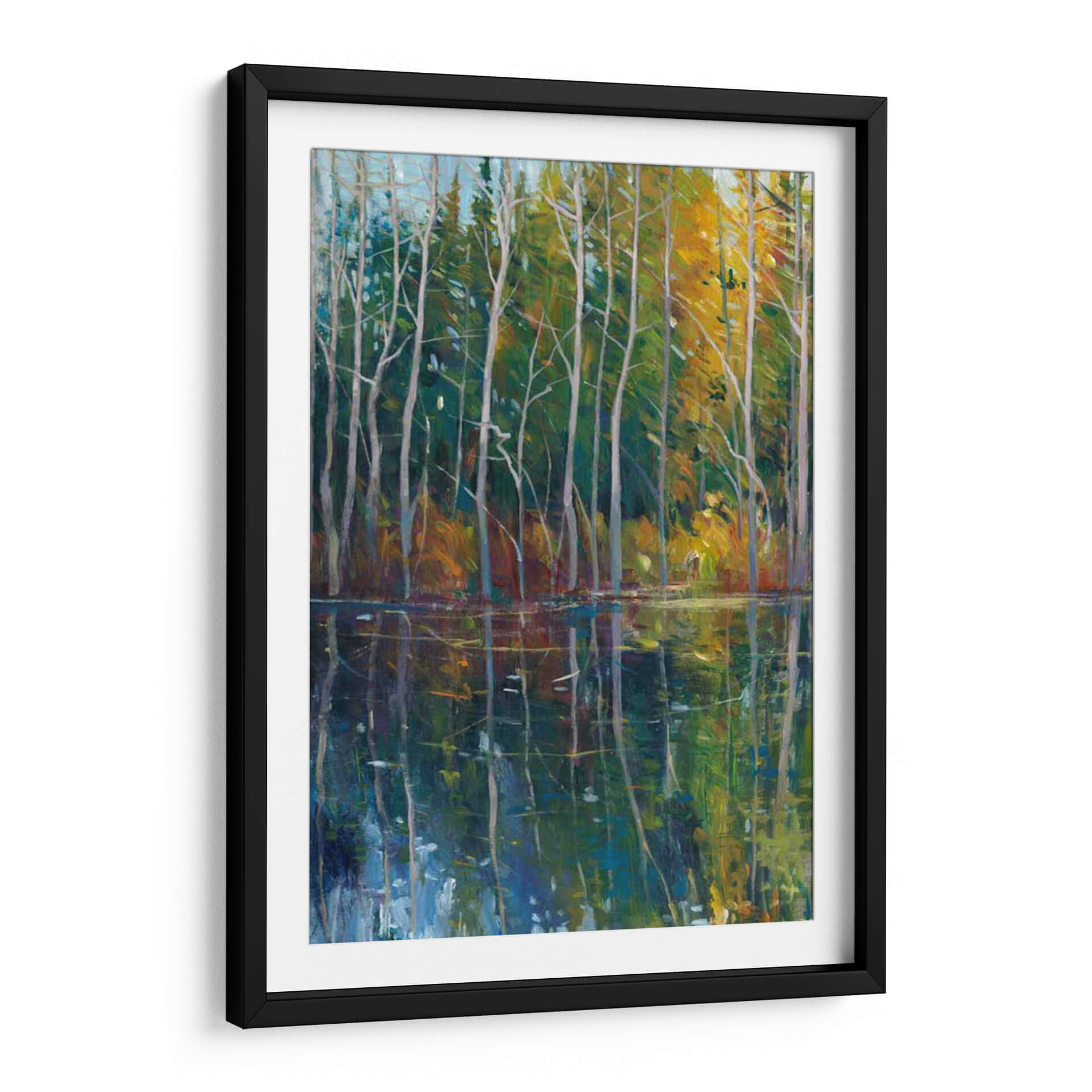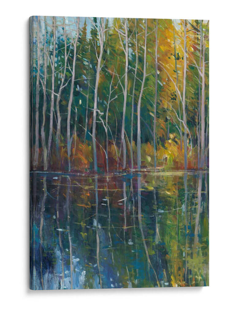 Sumérgete en la serenidad de 'Reflexión De Pino II', una obra maestra de Tim O'Toole que captura la serena belleza de un bosque junto a un cuerpo de agua tranquilo. Los vibrantes tonos verdes y amarillos del follaje otoñal se reflejan vívidamente en las aguas oscuras y profundas, creando un efecto hipnotizante. Los esbeltos troncos de pino se alzan como centinelas silenciosos, sus ramas esqueléticas dibujando intrincados patrones contra el cielo azul pálido. La técnica impresionista de O'Toole da vida a la escena con pinceladas audaces y un juego de luces y sombras que invita a la contemplación. Este cuadro decorativo es perfecto para añadir un toque de naturaleza y calma a cualquier espacio, ya sea una sala de estar, un dormitorio o una oficina. Su atmósfera pacífica y su composición cautivadora lo convierten en una pieza ideal para aquellos que buscan un refugio visual y una conexión con la naturaleza. Transforma tu hogar en un oasis de tranquilidad con esta evocadora representación del paisaje, donde cada detalle invita a la meditación y al disfrute estético.