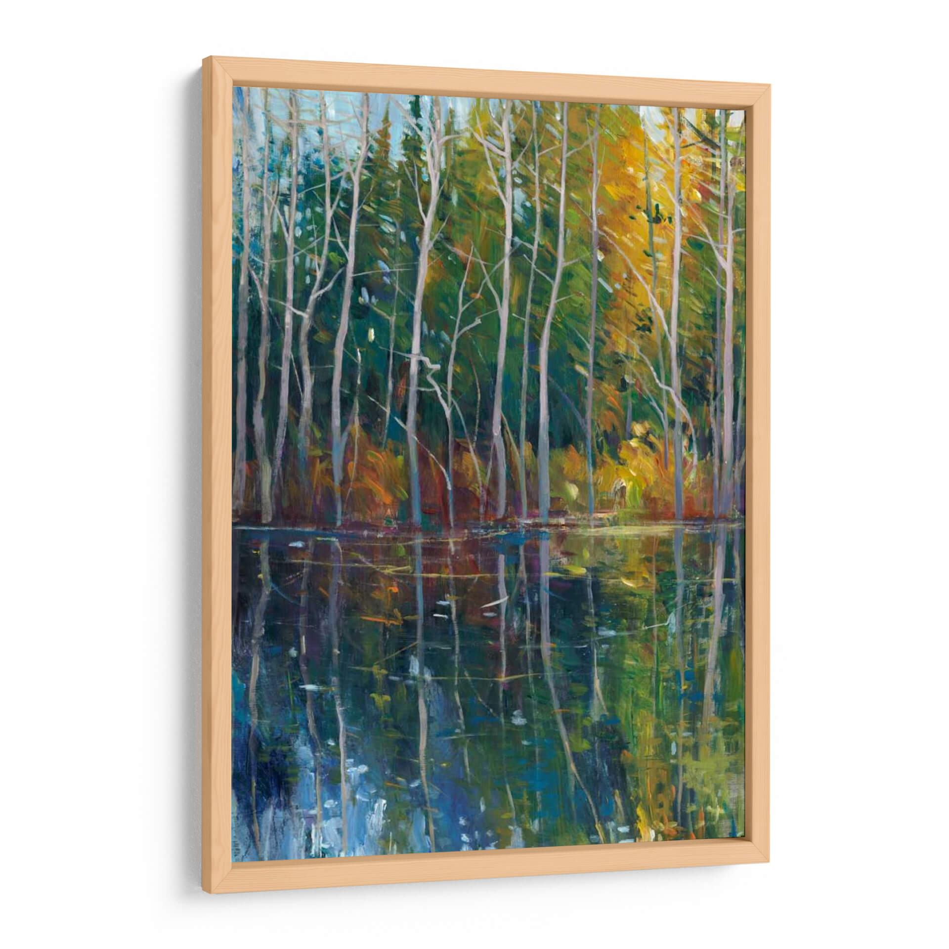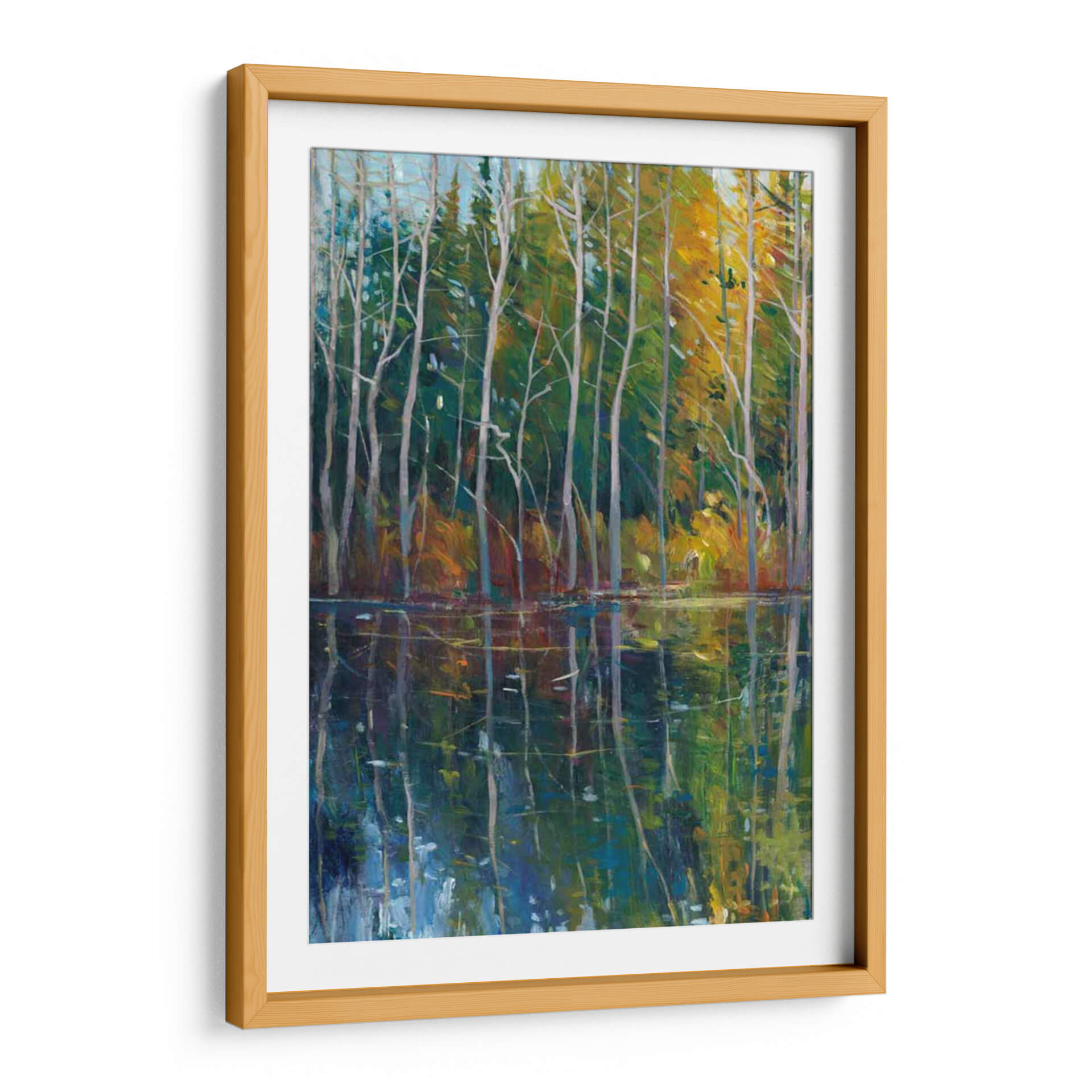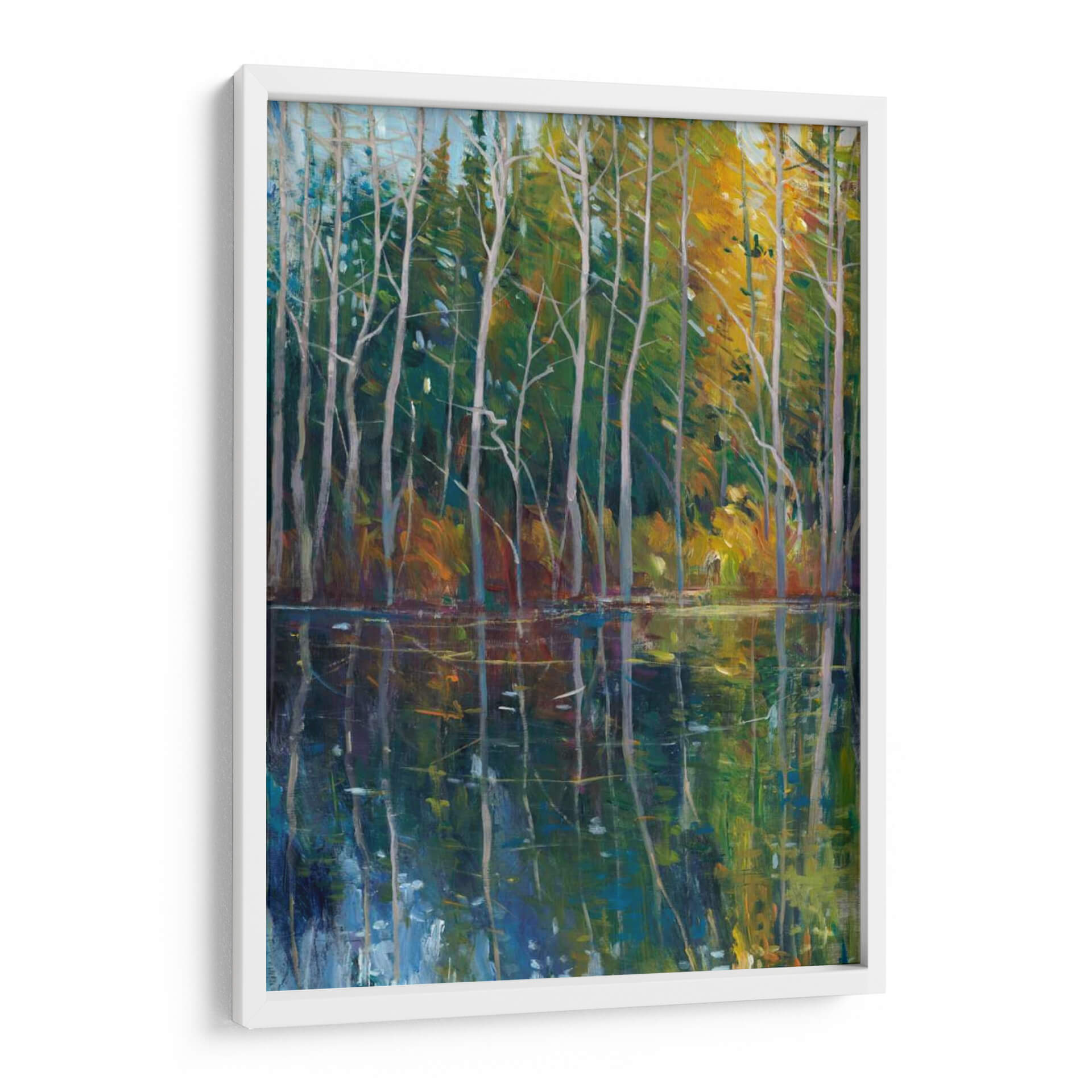 Sumérgete en la serenidad de 'Reflexión De Pino II', una obra maestra de Tim O'Toole que captura la serena belleza de un bosque junto a un cuerpo de agua tranquilo. Los vibrantes tonos verdes y amarillos del follaje otoñal se reflejan vívidamente en las aguas oscuras y profundas, creando un efecto hipnotizante. Los esbeltos troncos de pino se alzan como centinelas silenciosos, sus ramas esqueléticas dibujando intrincados patrones contra el cielo azul pálido. La técnica impresionista de O'Toole da vida a la escena con pinceladas audaces y un juego de luces y sombras que invita a la contemplación. Este cuadro decorativo es perfecto para añadir un toque de naturaleza y calma a cualquier espacio, ya sea una sala de estar, un dormitorio o una oficina. Su atmósfera pacífica y su composición cautivadora lo convierten en una pieza ideal para aquellos que buscan un refugio visual y una conexión con la naturaleza. Transforma tu hogar en un oasis de tranquilidad con esta evocadora representación del paisaje, donde cada detalle invita a la meditación y al disfrute estético.