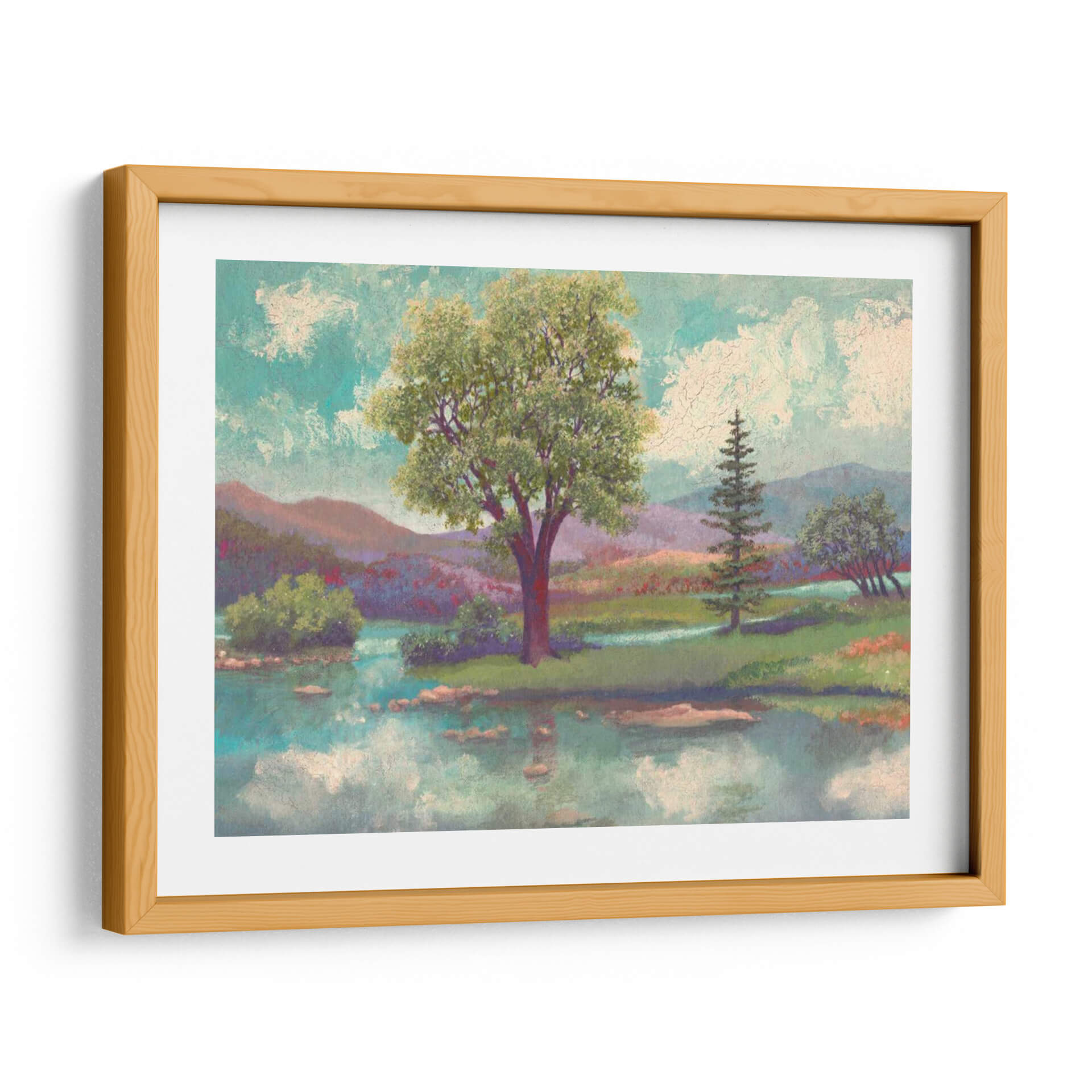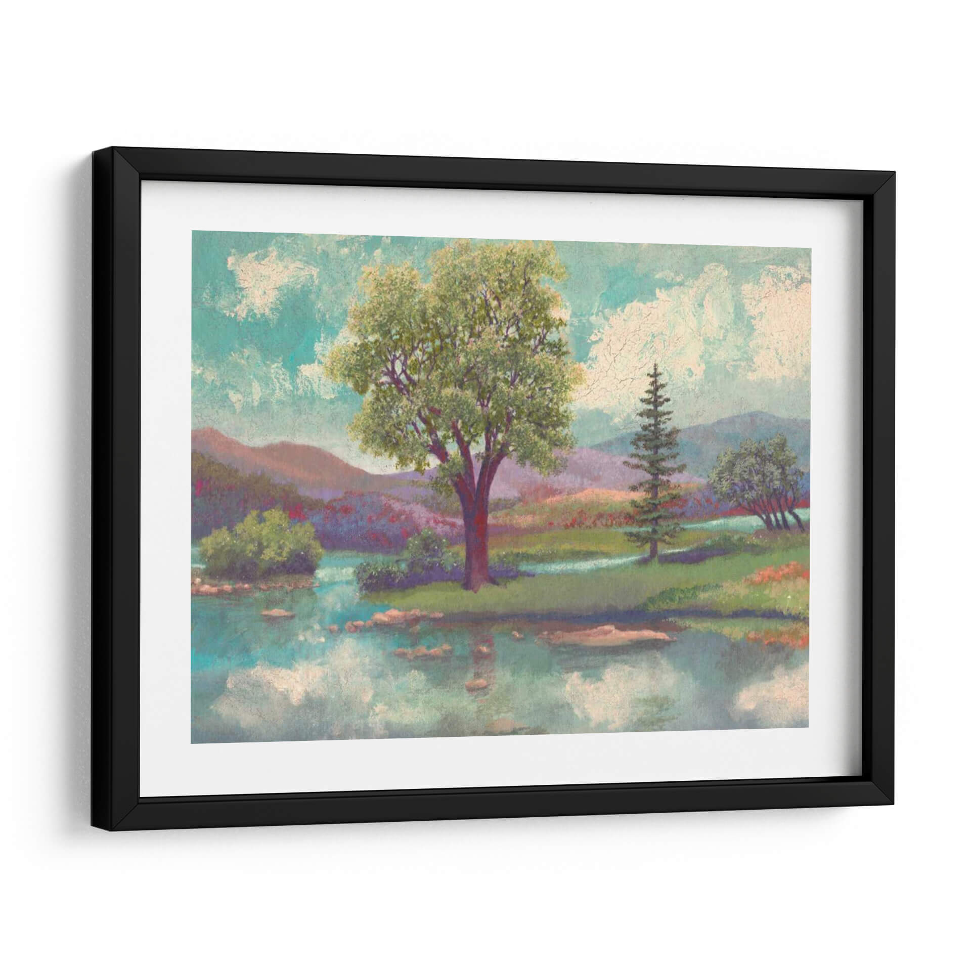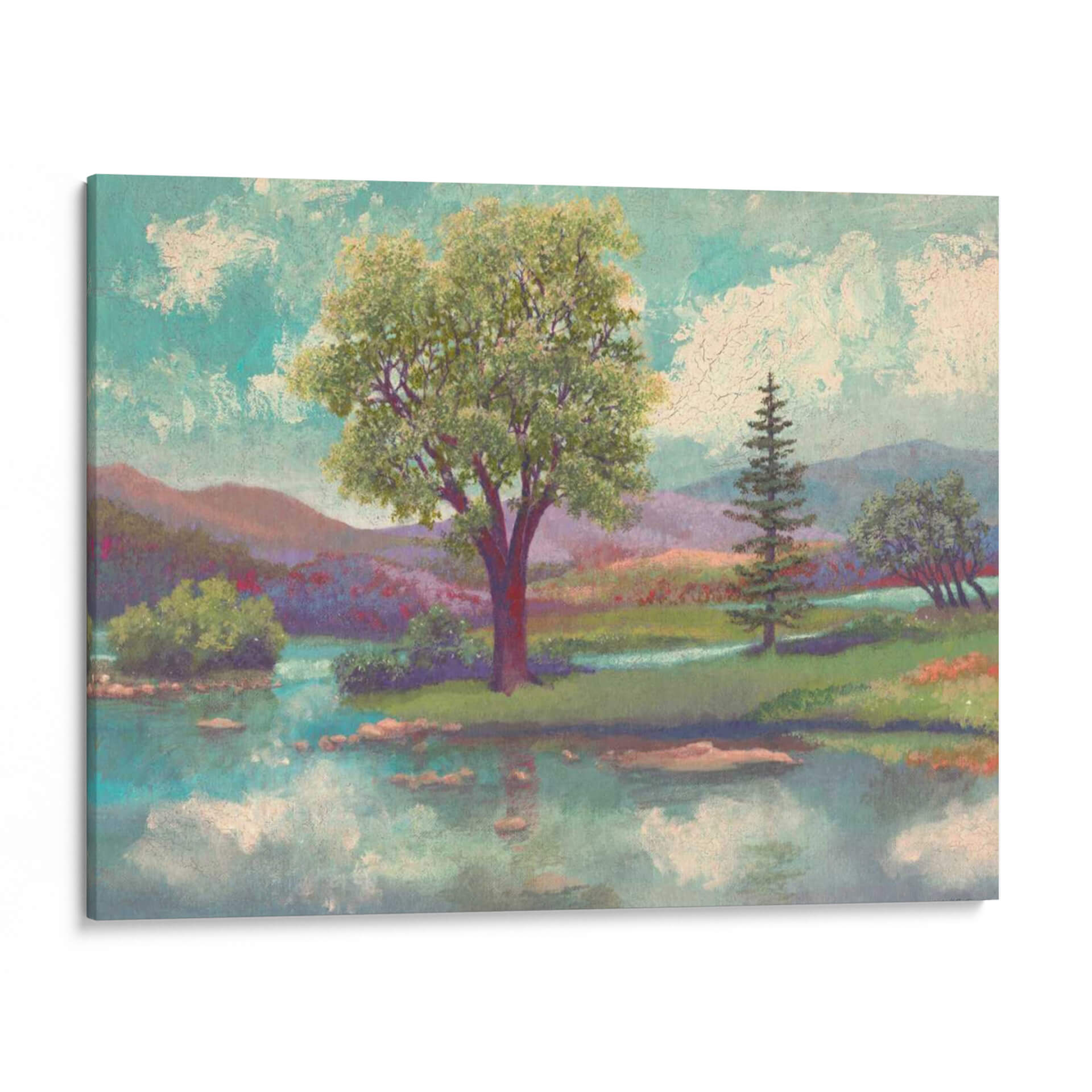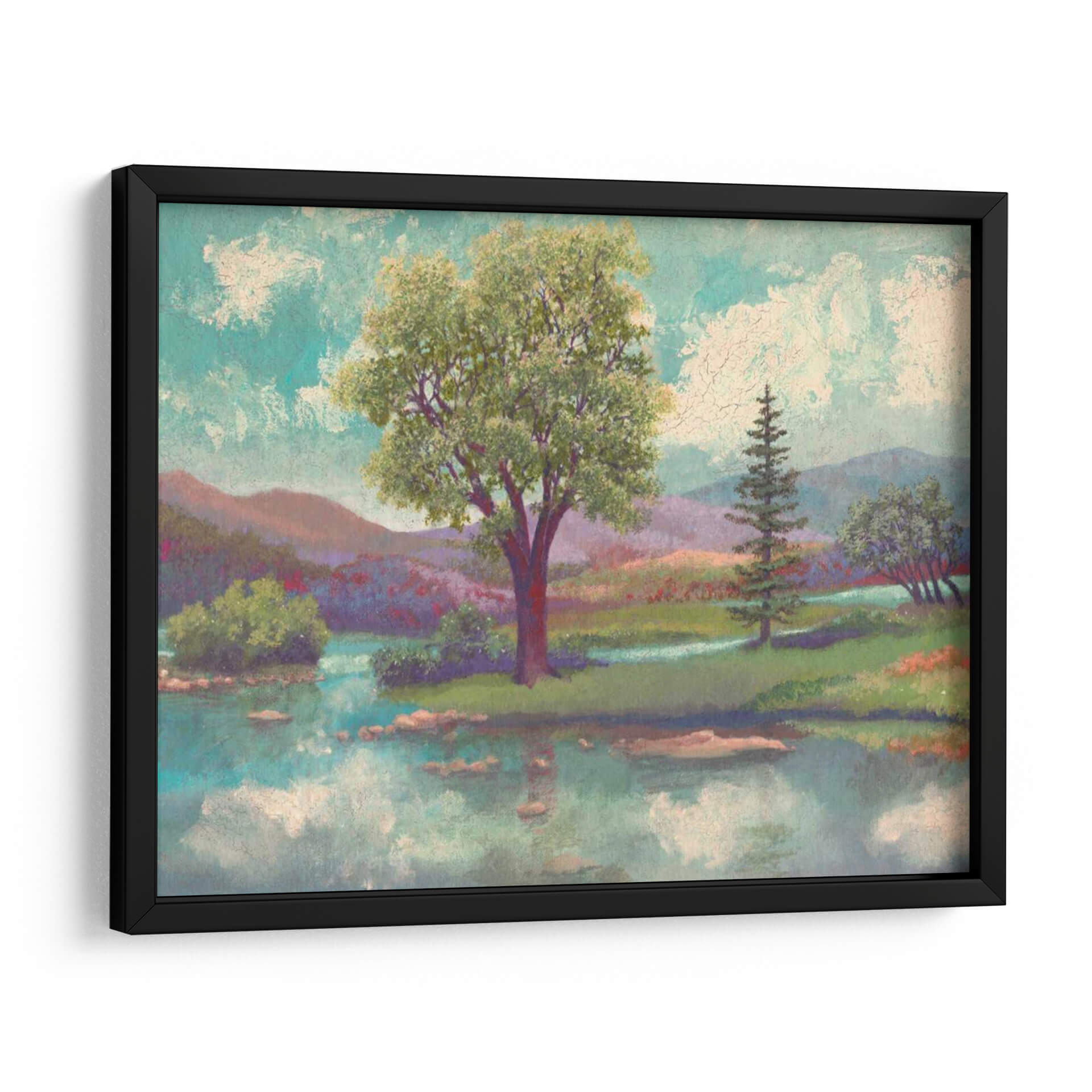 Sumérgete en la serenidad de "Riverscape II", una cautivadora obra de Victor Valla que captura la esencia de un paisaje fluvial idílico. Este cuadro decorativo te transporta a un oasis de calma con su vibrante paleta de azules celestes, verdes exuberantes y toques de morado y rosa en el follaje y las colinas distantes. La composición, dominada por un majestuoso árbol a la izquierda y un esbelto pino a la derecha, enmarca un río sereno cuyas aguas reflejan el cielo y las nubes con un realismo etéreo. Las pinceladas evocan una textura rica y una atmósfera casi soñadora, invitando a la contemplación y al descanso. Ideal para salones, dormitorios o estudios, "Riverscape II" aporta una sensación de paz y conexión con la naturaleza a cualquier espacio. Es una pieza que no solo embellece, sino que también inspira tranquilidad y eleva el espíritu, convirtiéndose en un punto focal armonioso y lleno de vida para tu hogar u oficina. Añade esta obra maestra paisajística a tu colección y transforma tu entorno en un refugio de belleza natural.