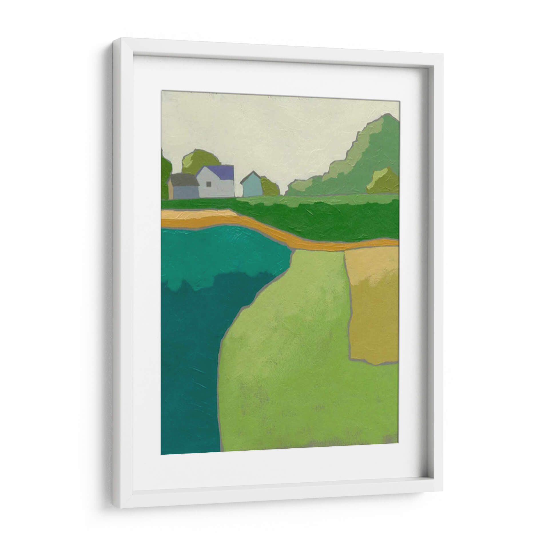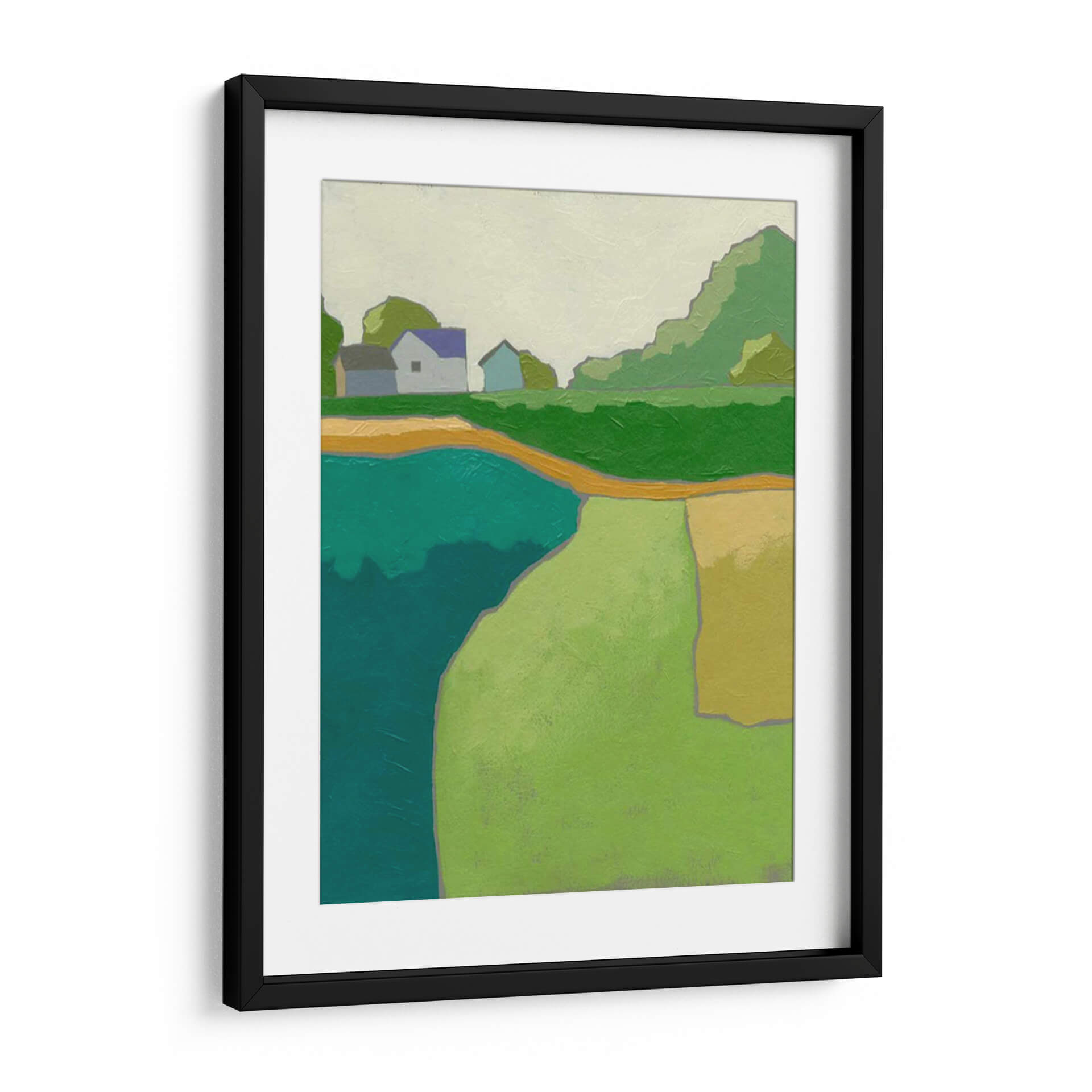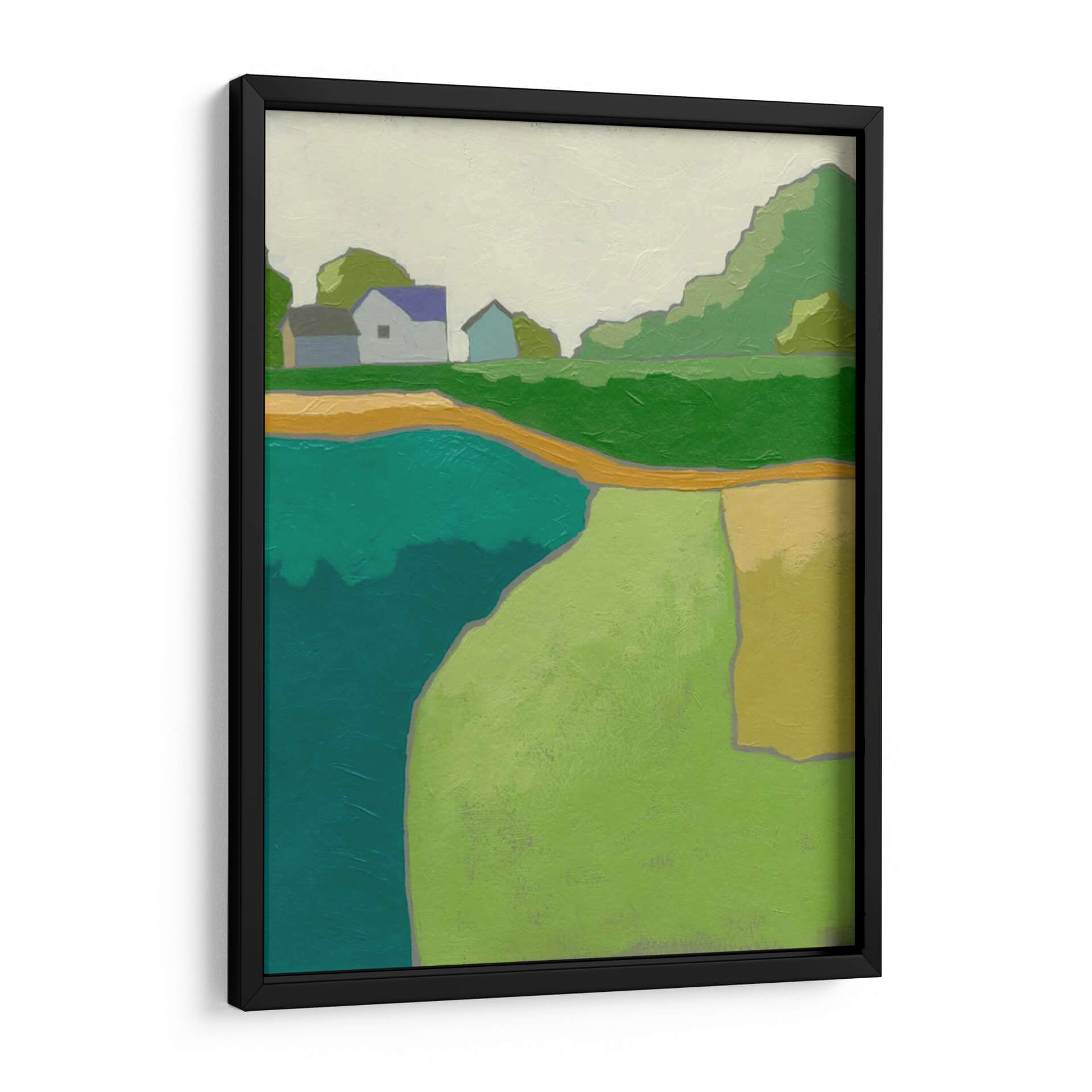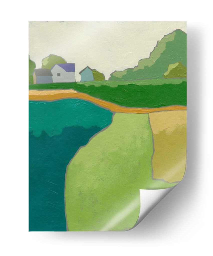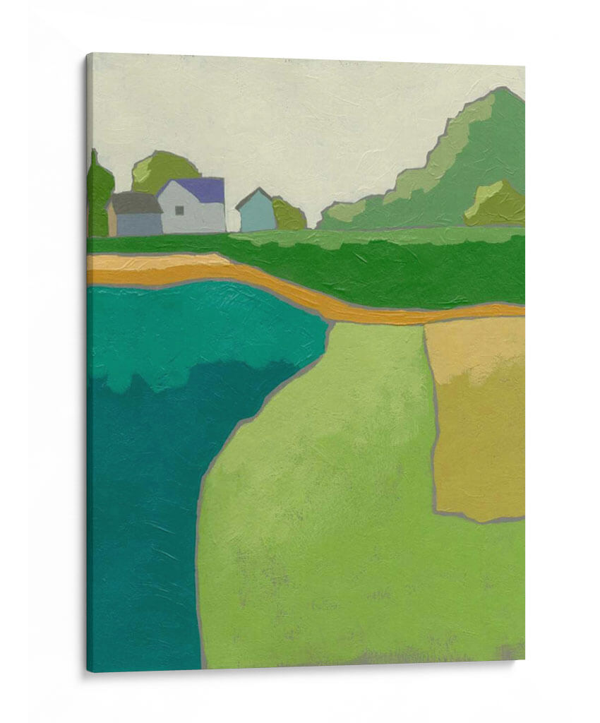 Sumérgete en la serenidad campestre con 'Rural Vista II', una obra de arte contemporáneo que captura la esencia de un paisaje rural estilizado. Los tonos verdes vibrantes, el azul profundo del agua y los toques cálidos de amarillo y ocre se combinan para crear una atmósfera de paz y tranquilidad. La composición simplificada, con formas geométricas y líneas limpias, evoca una sensación de modernidad sin perder la conexión con la naturaleza. Este cuadro decorativo es ideal para aquellos que buscan infundir calma y una conexión con el entorno natural en sus hogares u oficinas. Las casas modestas y los árboles estilizados sugieren un refugio apacible, mientras que la abstracción de las formas permite una interpretación personal y emotiva. 'Rural Vista II' es una pieza versátil que se adapta a diversos estilos de decoración, desde el escandinavo hasta el contemporáneo, aportando un toque de color y serenidad. Descubre cómo esta obra puede transformar tu espacio, invitando a la contemplación y al bienestar.