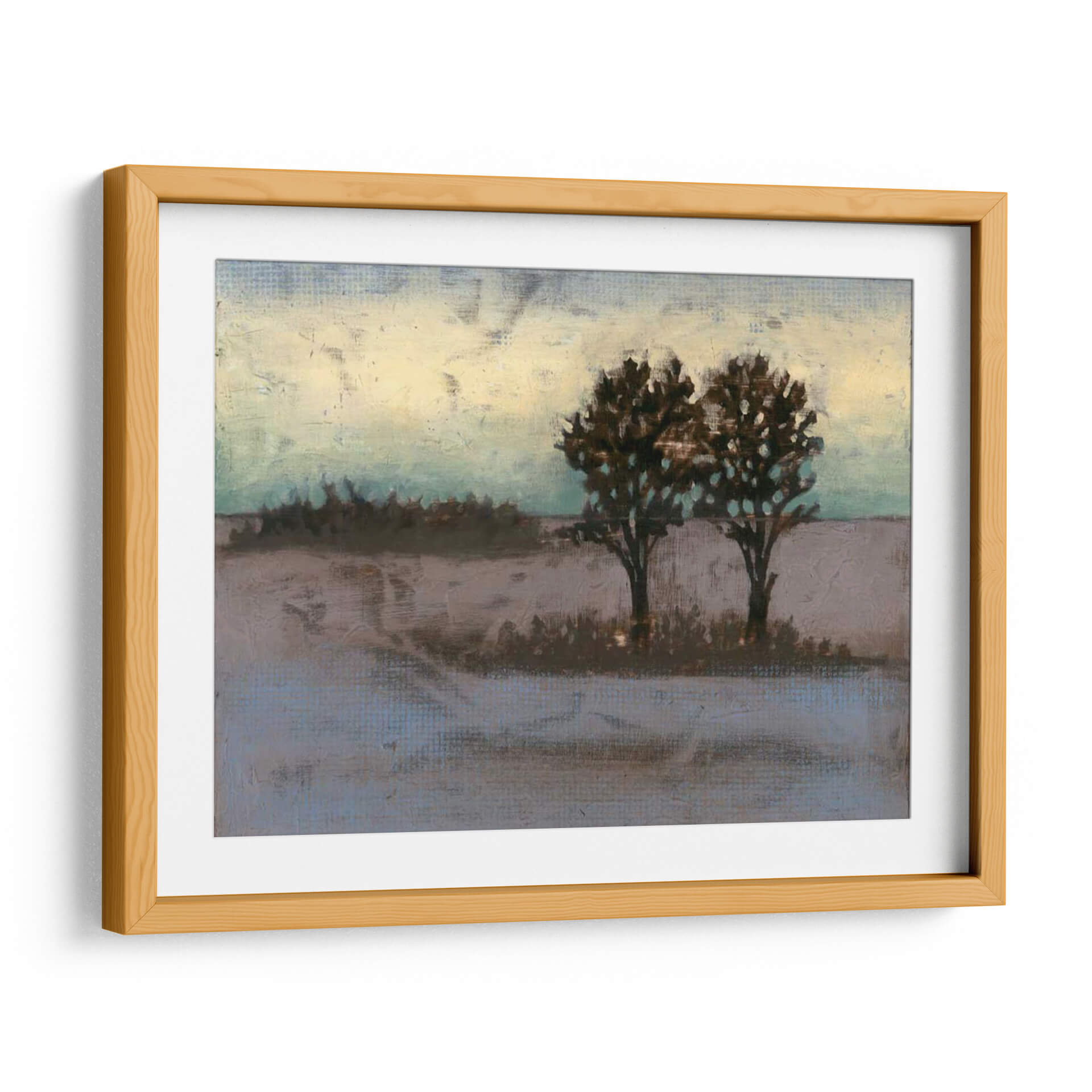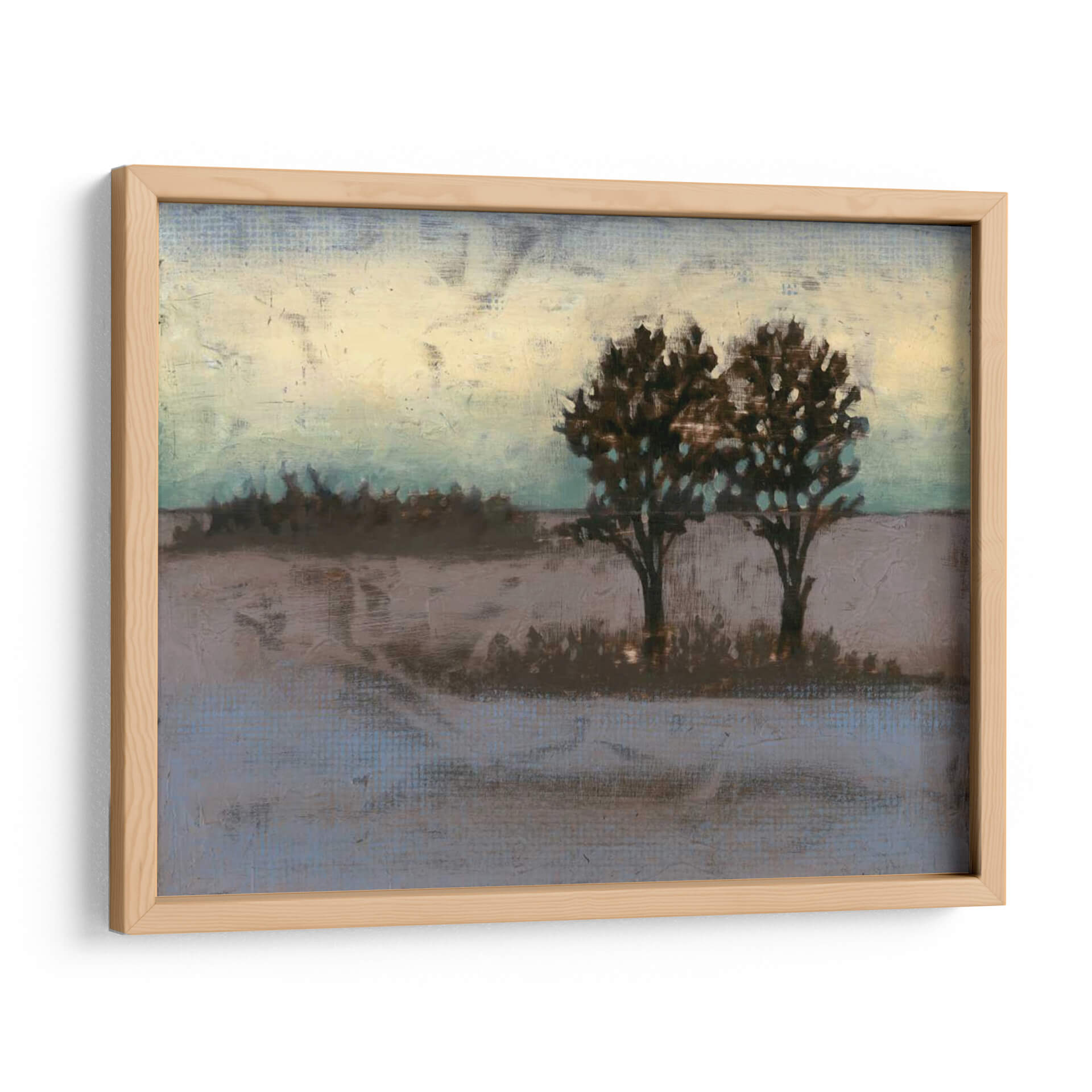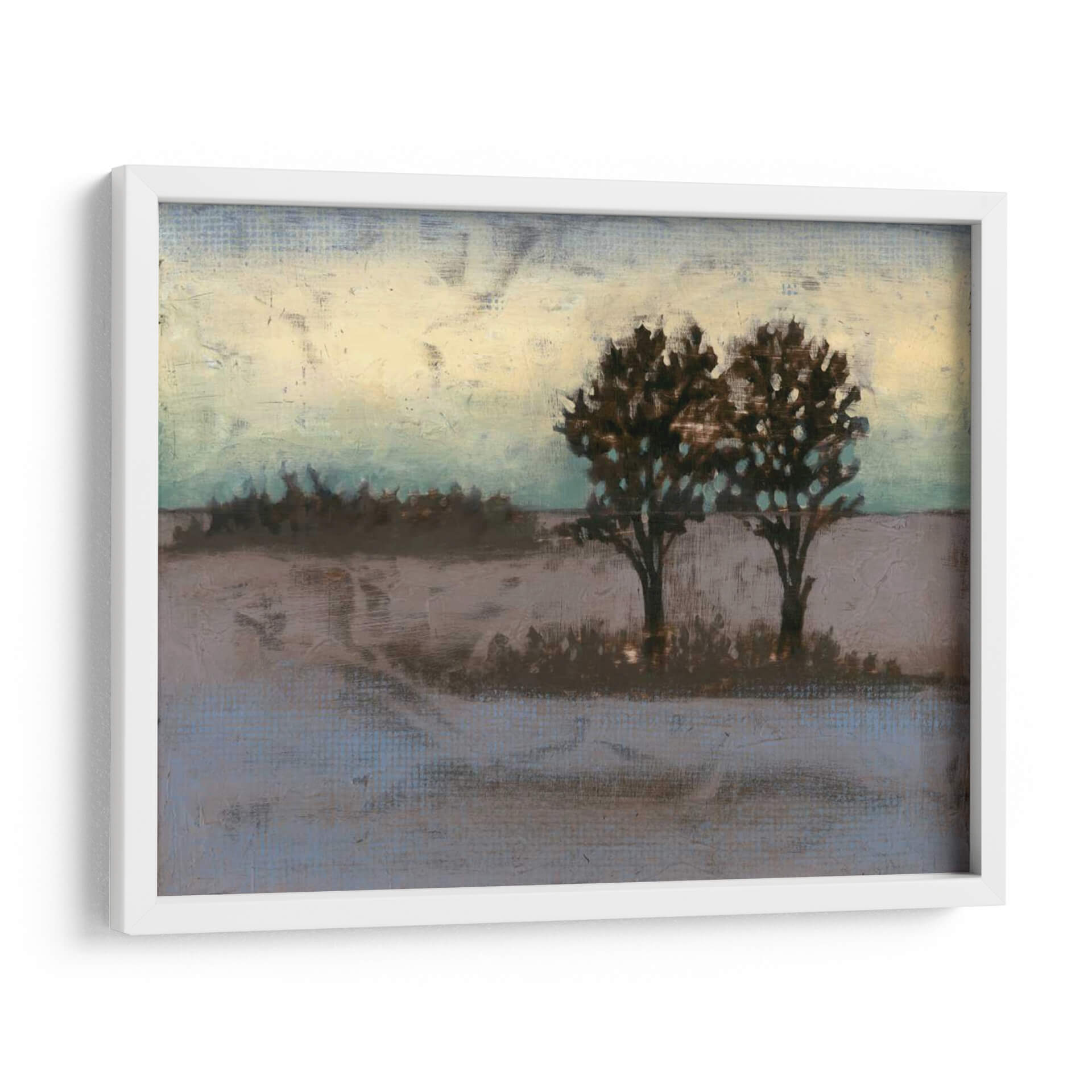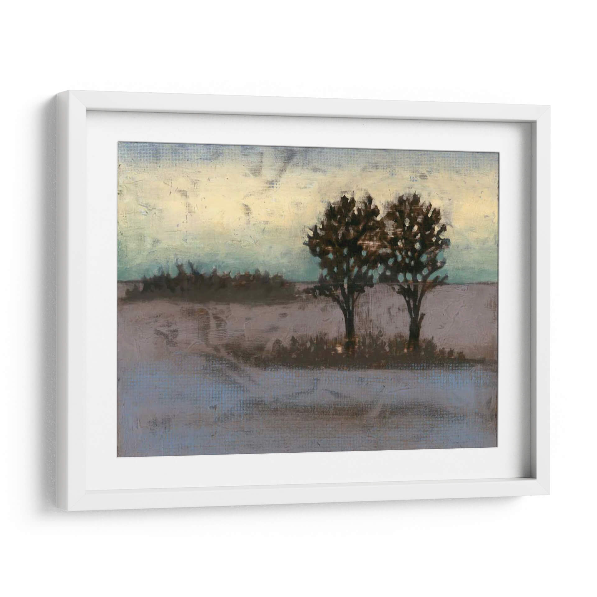Sumérgete en la serena belleza del paisaje rural con "Rústico Prado II", una obra de arte contemporáneo que captura la esencia de la naturaleza en su forma más evocadora. La artista Jennifer Goldberger nos transporta a un campo tranquilo, dominado por dos árboles robustos cuyas siluetas oscuras contrastan con un cielo etéreo que transita entre tonos cálidos de amarillo pálido y azules verdosos sutiles. La paleta de colores, compuesta por tonos tierra, grises suaves y toques de aguamarina, crea una atmósfera de calma y contemplación, perfecta para añadir un toque de serenidad a cualquier espacio. Las pinceladas texturizadas y el estilo semi-abstracto invitan a la introspección, sugiriendo la belleza efímera de un atardecer o amanecer en el campo. Este cuadro decorativo es ideal para salones, dormitorios o estudios, aportando un aire de sofisticación rústica y una conexión palpable con la naturaleza. "Rústico Prado II" no es solo una pieza decorativa, sino una ventana a un momento de paz y reflexión, un recordatorio de la belleza que se encuentra en la simplicidad del mundo natural, transformando cualquier pared en un refugio de tranquilidad y estilo.