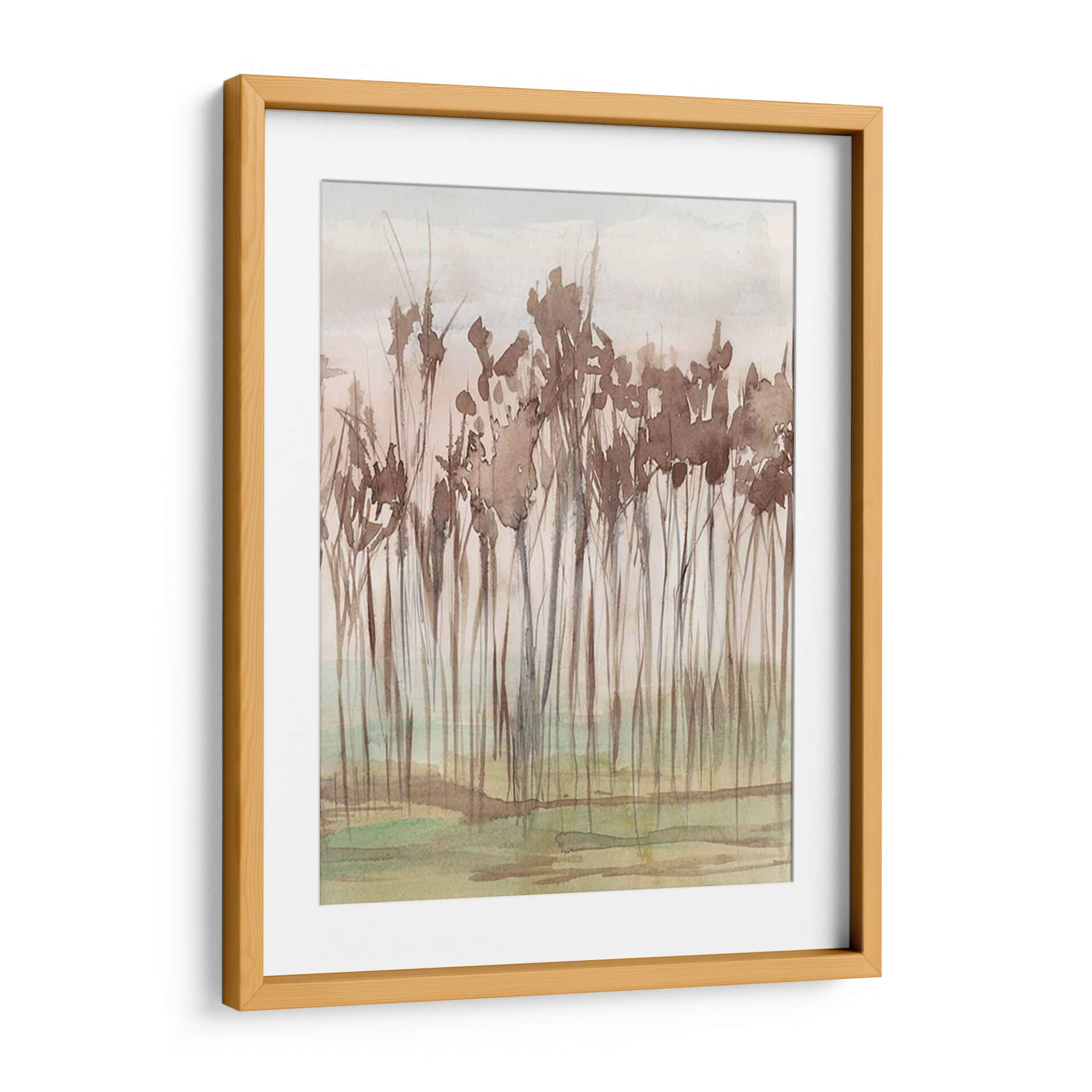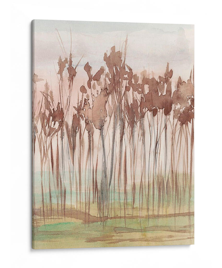 Sumérgete en la serenidad de la naturaleza con "Sienna Treeline II", una obra de arte cautivadora de Jennifer Goldberger. Este cuadro decorativo captura la delicadeza de un paisaje boscoso con una técnica de acuarela etérea. Las formas estilizadas de los árboles, en tonos marrones terrosos y ocres, se alzan sobre un fondo suave que evoca un cielo tenue y una pradera sutilmente teñida de verde y amarillo. La paleta de colores cálidos y apagados crea una atmósfera de paz y tranquilidad, ideal para infundir calma en cualquier espacio. El estilo, que oscila entre lo figurativo y lo abstracto, invita a la contemplación, permitiendo que cada observador encuentre su propia conexión emocional con la pieza. La composición vertical y la sutileza de las pinceladas aportan una elegancia discreta que complementa tanto ambientes modernos como rústicos. "Sienna Treeline II" es más que una simple decoración; es una ventana a un momento de quietud y belleza natural, perfecta para añadir un toque de sofisticación y armonía a tu hogar u oficina, convirtiéndose en un punto focal de serenidad.
