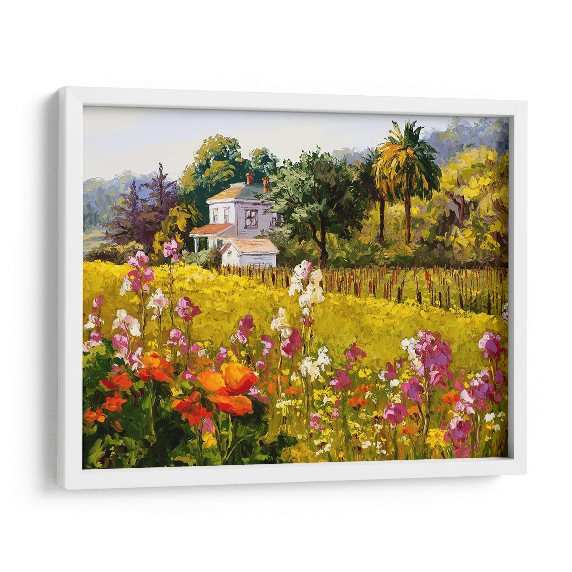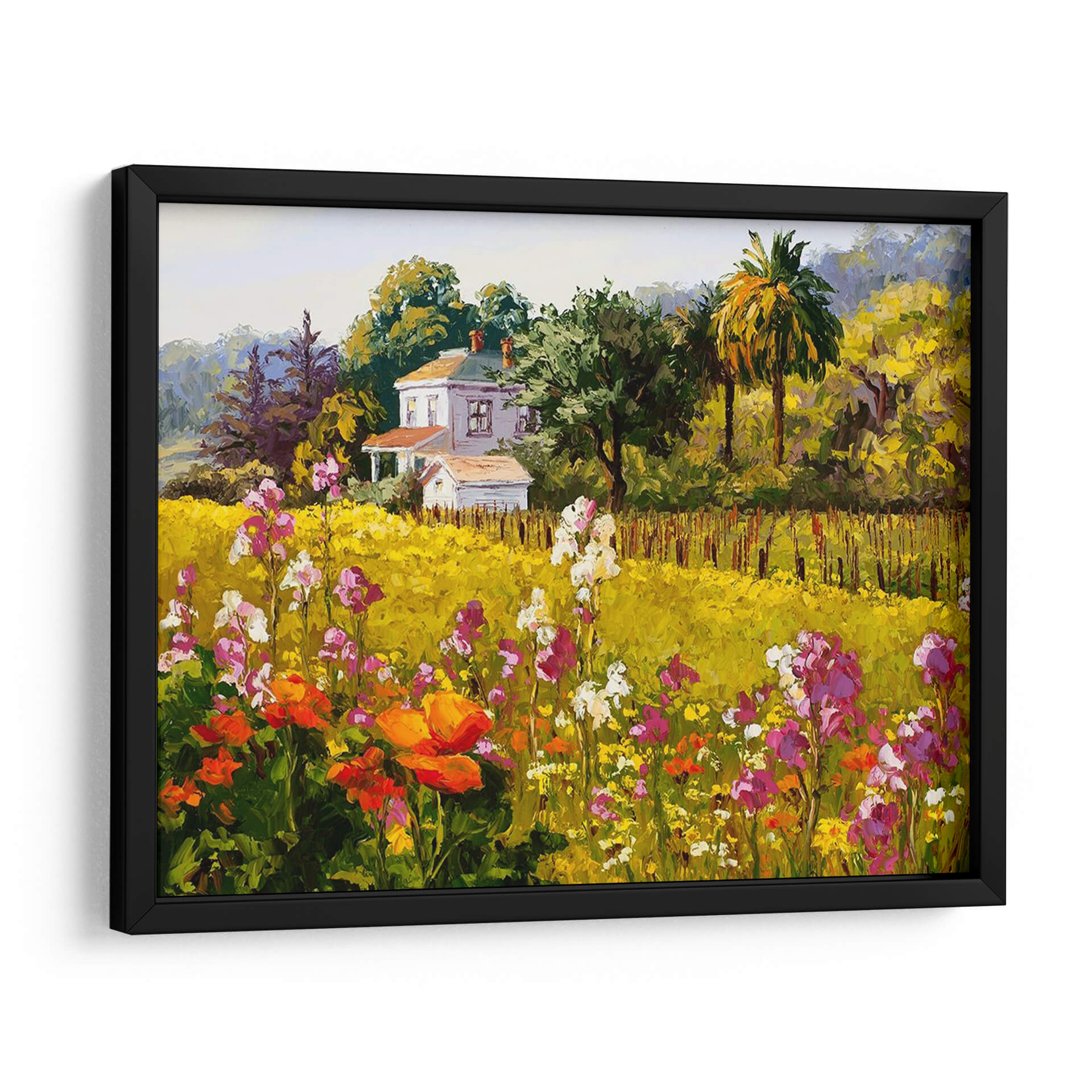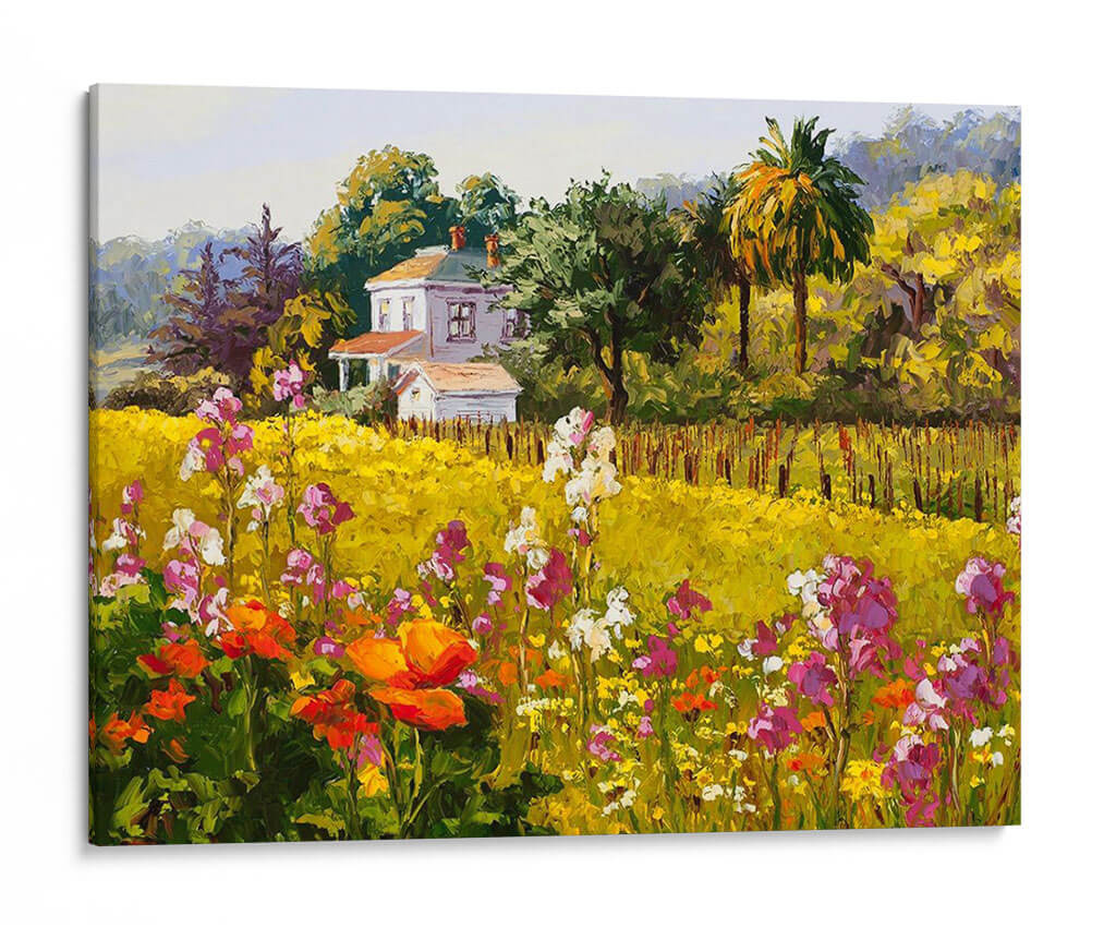 Sumérgete en la vibrante "Sinfonía De Primavera" de Erin Dertner, un cuadro decorativo que captura la esencia de una estación exuberante y llena de vida. Esta obra maestra visual presenta un paisaje rural idílico, dominado por un campo de flores silvestres en plena floración, con tonos que van desde el vibrante naranja y el delicado rosa hasta el blanco puro y el amarillo sol. Al fondo, una encantadora casa blanca se alza rodeada de árboles frondosos y palmeras, creando un escenario pintoresco que evoca paz y serenidad. El estilo pictórico, con pinceladas audaces y una paleta de colores rica y saturada, transmite una sensación de alegría y vitalidad, propia de la primavera. Es la pieza de arte perfecta para añadir un toque de color y optimismo a tu hogar u oficina, ideal para salones, comedores o dormitorios que buscan una atmósfera acogedora y luminosa. Este cuadro decorativo es una invitación a contemplar la belleza de la naturaleza y a sentir la renovación que trae consigo la primavera, convirtiéndose en un punto focal inspirador en cualquier espacio.