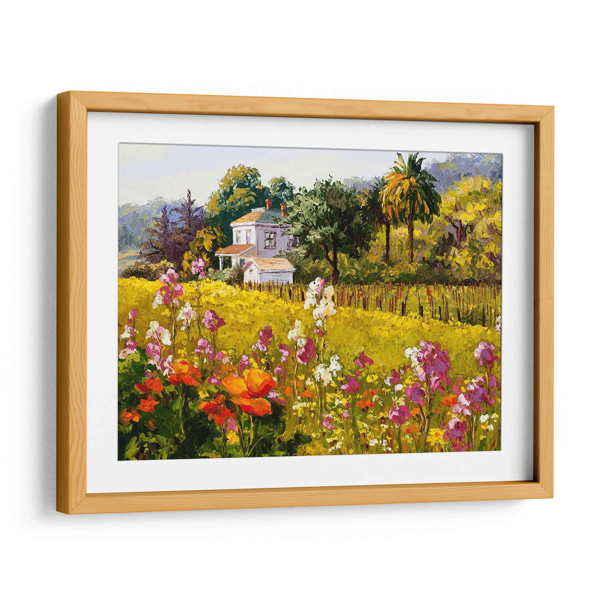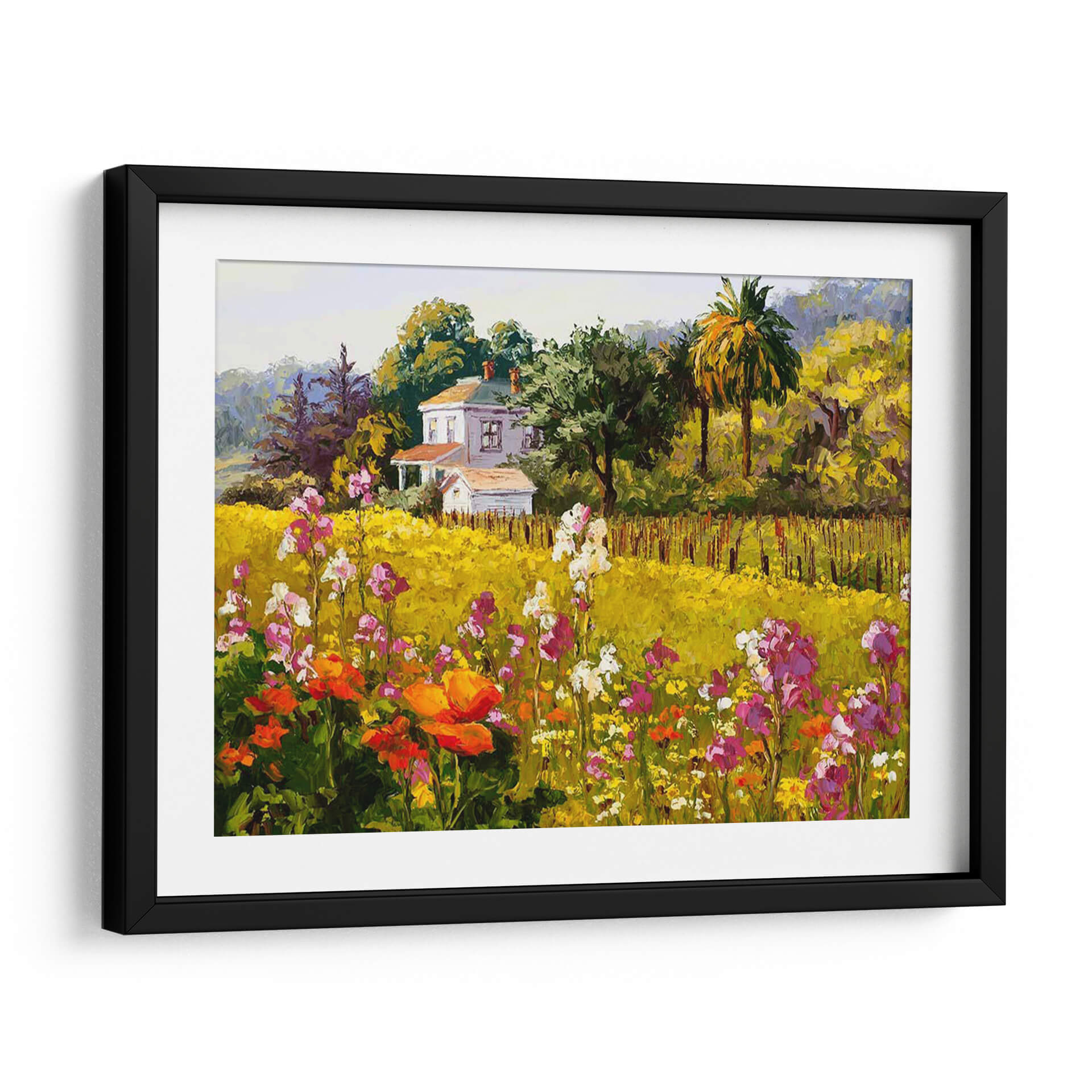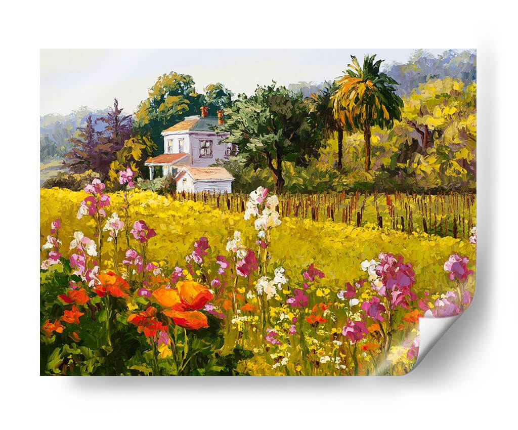 Sumérgete en la vibrante "Sinfonía De Primavera" de Erin Dertner, un cuadro decorativo que captura la esencia de una estación exuberante y llena de vida. Esta obra maestra visual presenta un paisaje rural idílico, dominado por un campo de flores silvestres en plena floración, con tonos que van desde el vibrante naranja y el delicado rosa hasta el blanco puro y el amarillo sol. Al fondo, una encantadora casa blanca se alza rodeada de árboles frondosos y palmeras, creando un escenario pintoresco que evoca paz y serenidad. El estilo pictórico, con pinceladas audaces y una paleta de colores rica y saturada, transmite una sensación de alegría y vitalidad, propia de la primavera. Es la pieza de arte perfecta para añadir un toque de color y optimismo a tu hogar u oficina, ideal para salones, comedores o dormitorios que buscan una atmósfera acogedora y luminosa. Este cuadro decorativo es una invitación a contemplar la belleza de la naturaleza y a sentir la renovación que trae consigo la primavera, convirtiéndose en un punto focal inspirador en cualquier espacio.