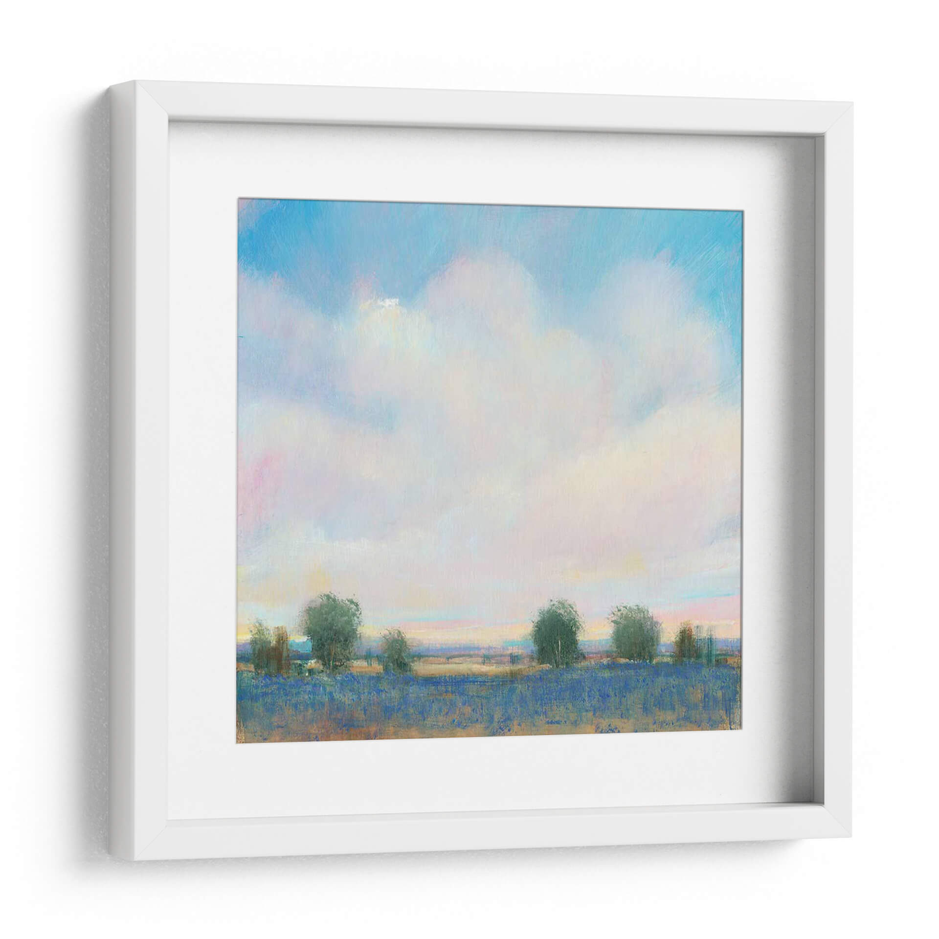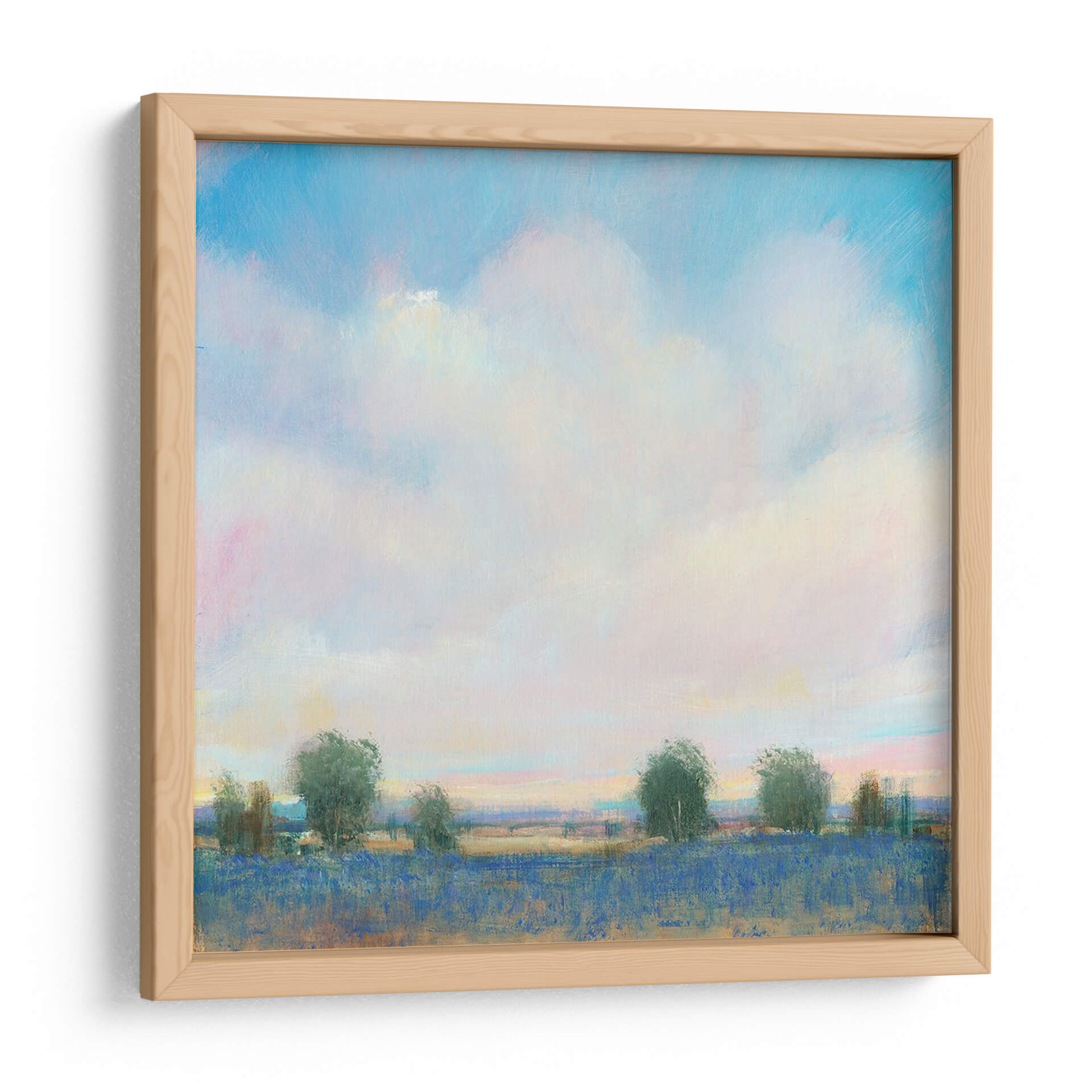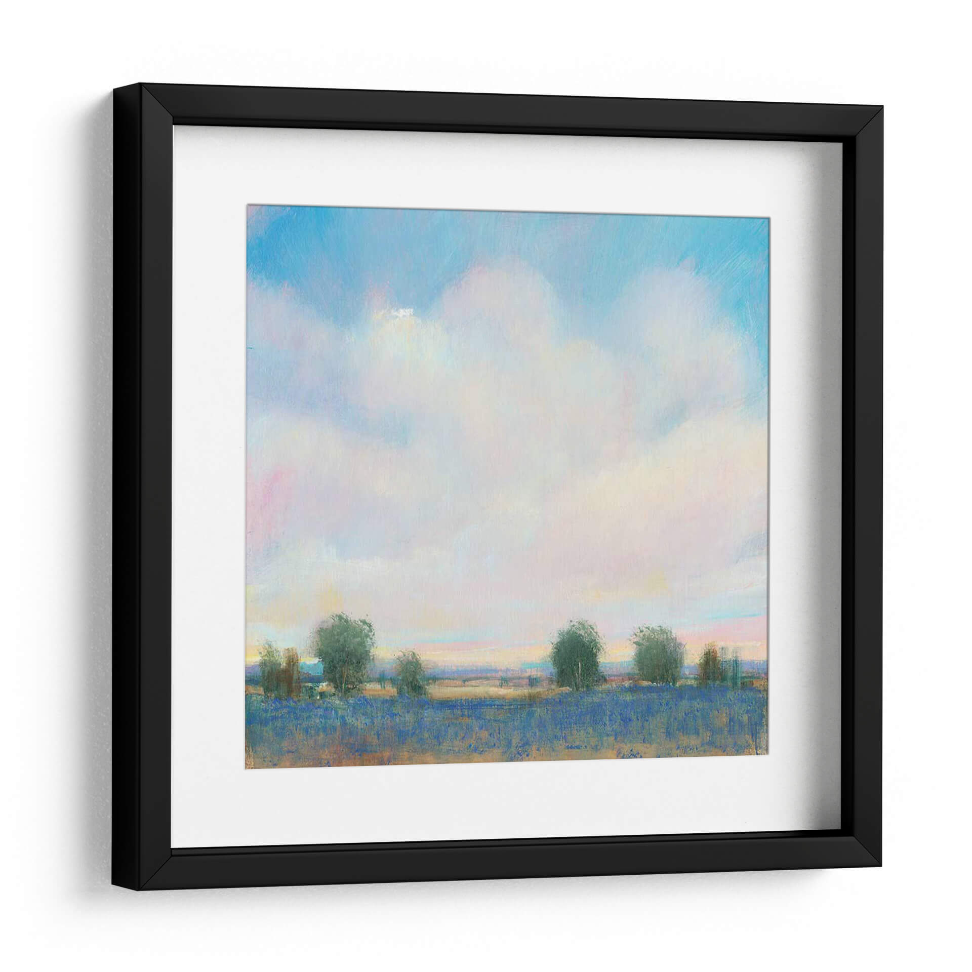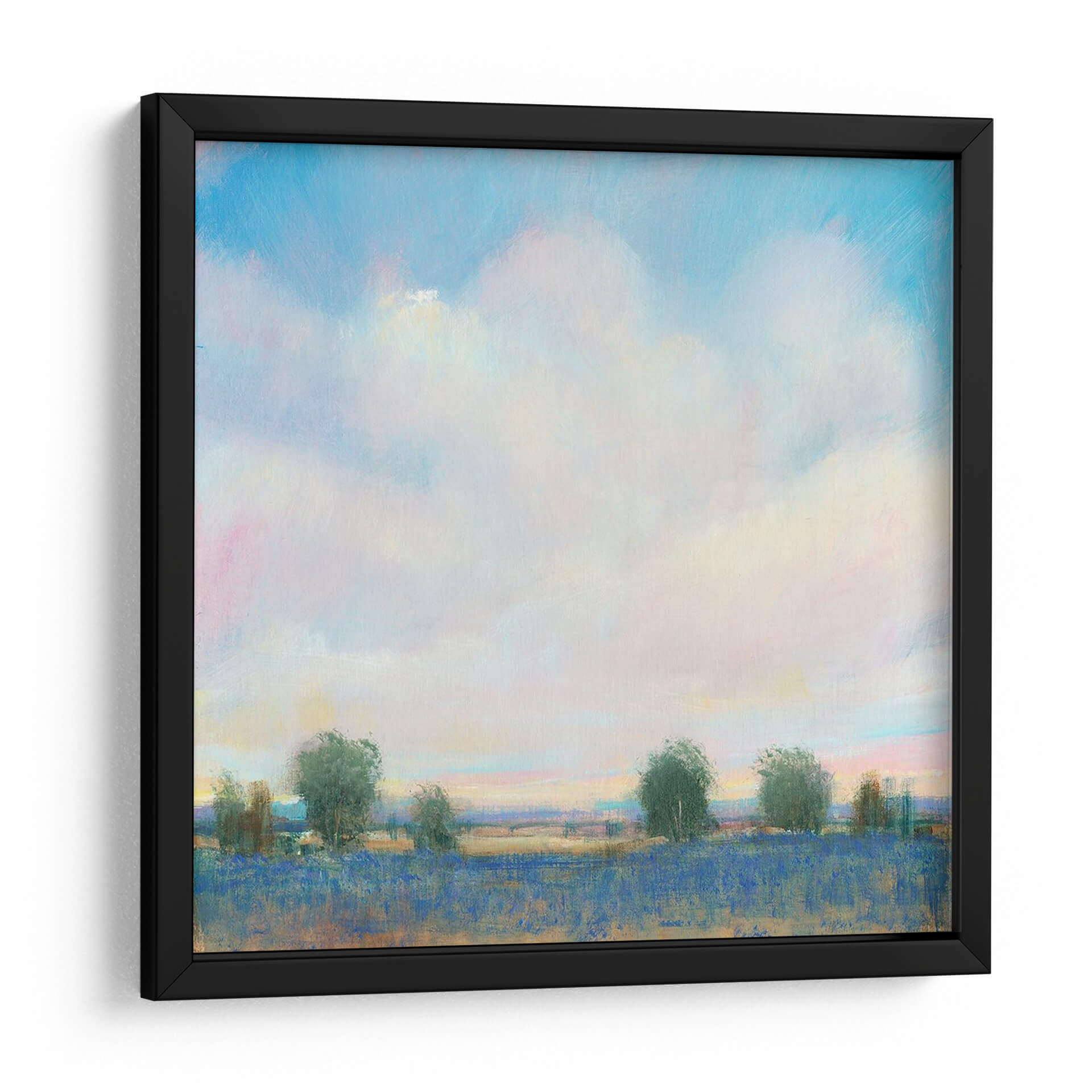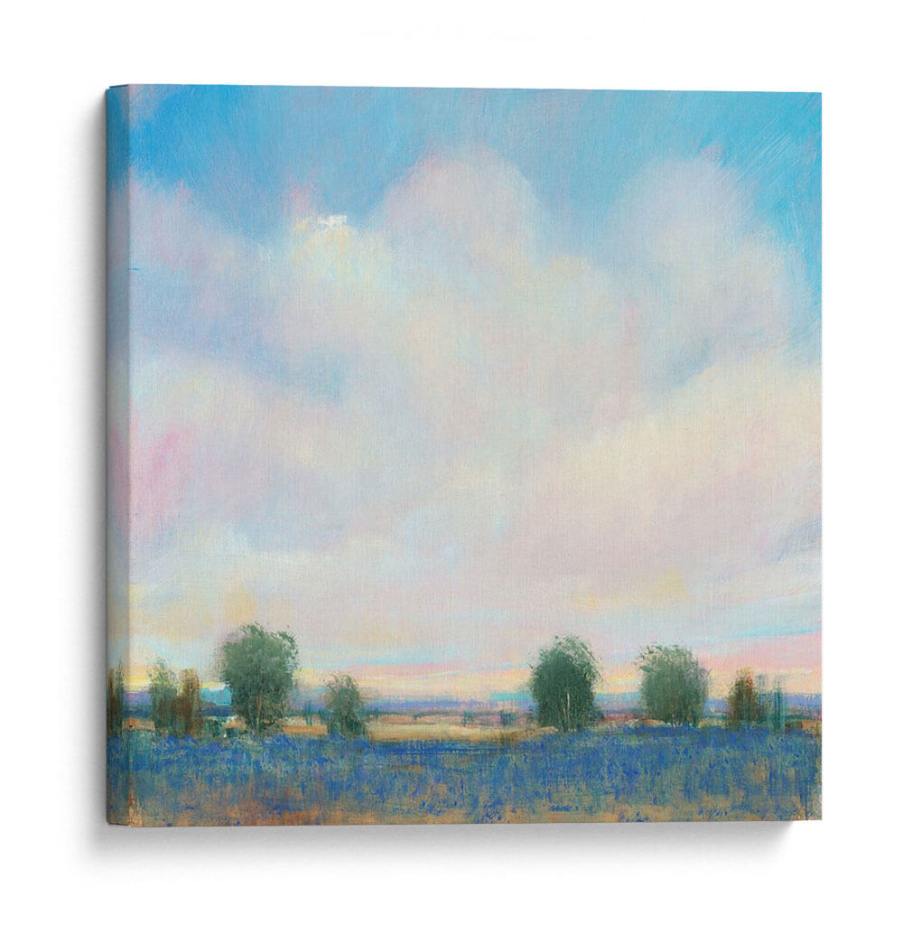Sumérgete en la serenidad del 'Sky Summer II' de Tim O'Toole, un cuadro decorativo que captura la esencia efímera de un día de verano con una paleta de colores etérea. La obra presenta un vasto cielo lleno de nubes esponjosas, teñidas sutilmente con tonos rosados y amarillos que sugieren la calidez del sol poniente o naciente. Debajo, un campo vibrante de un intenso azul, posiblemente lavanda o flores silvestres, se extiende hasta el horizonte, bordeado por una línea de árboles esbeltos y estilizados que añaden profundidad y un toque de naturaleza salvaje. El estilo impresionista-contemporáneo de O'Toole se manifiesta en sus pinceladas sueltas y la forma en que la luz juega en la escena, creando una atmósfera de paz y contemplación. Este cuadro decorativo es ideal para añadir un toque de tranquilidad y color a cualquier espacio, desde una sala de estar luminosa hasta un dormitorio acogedor o una oficina que necesite una ventana a la naturaleza. Su composición equilibrada y su temática universal lo convierten en una pieza versátil que evoca nostalgia y la belleza simple de los días de verano. El 'Sky Summer II' no es solo una obra de arte, sino una invitación a la calma y a la apreciación de los momentos efímeros.