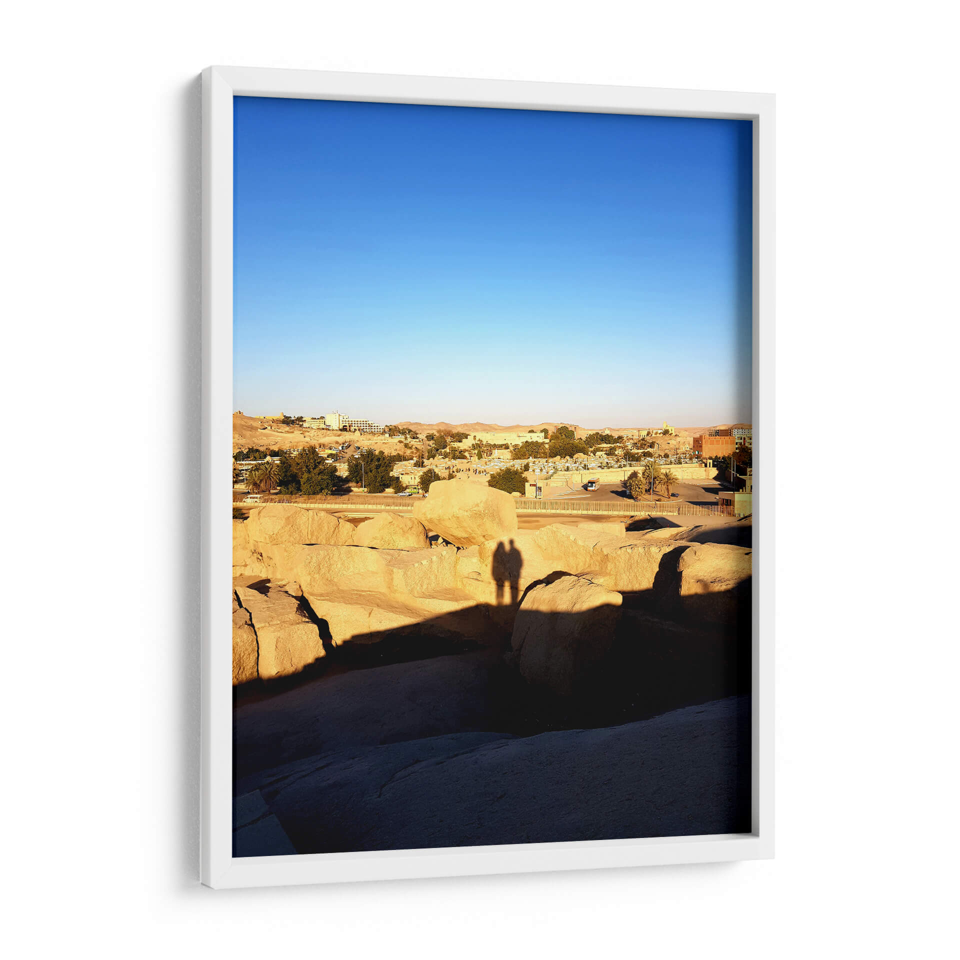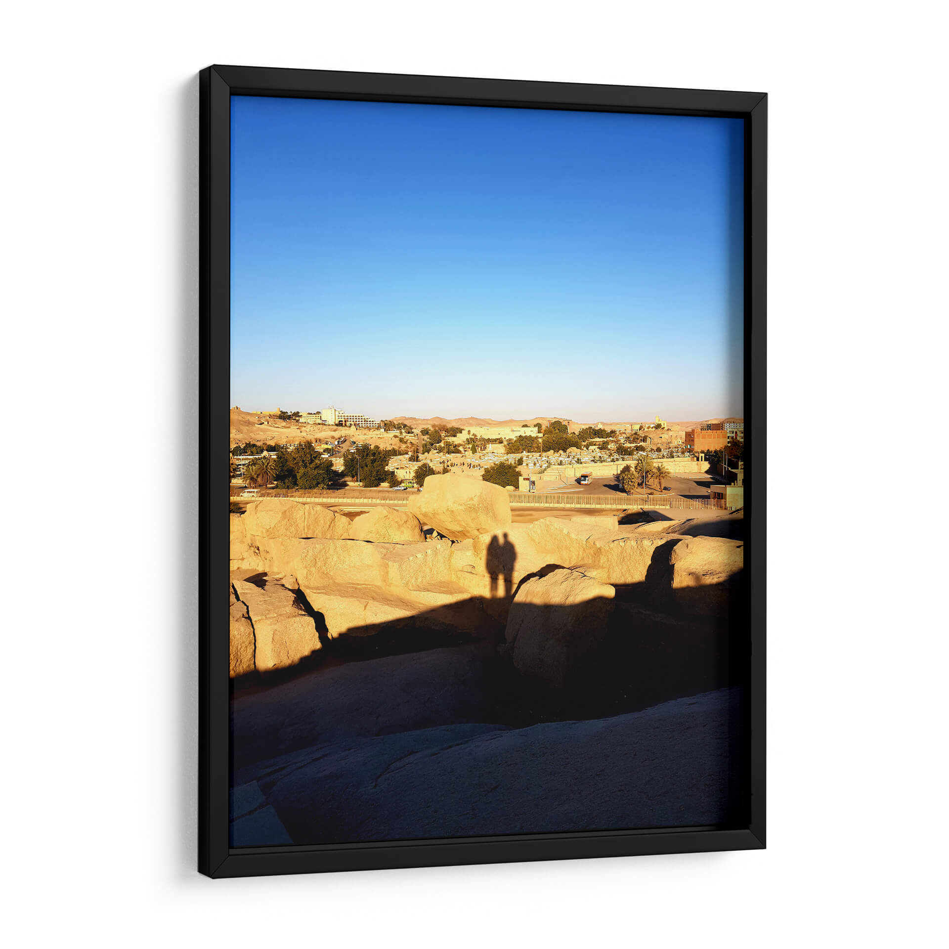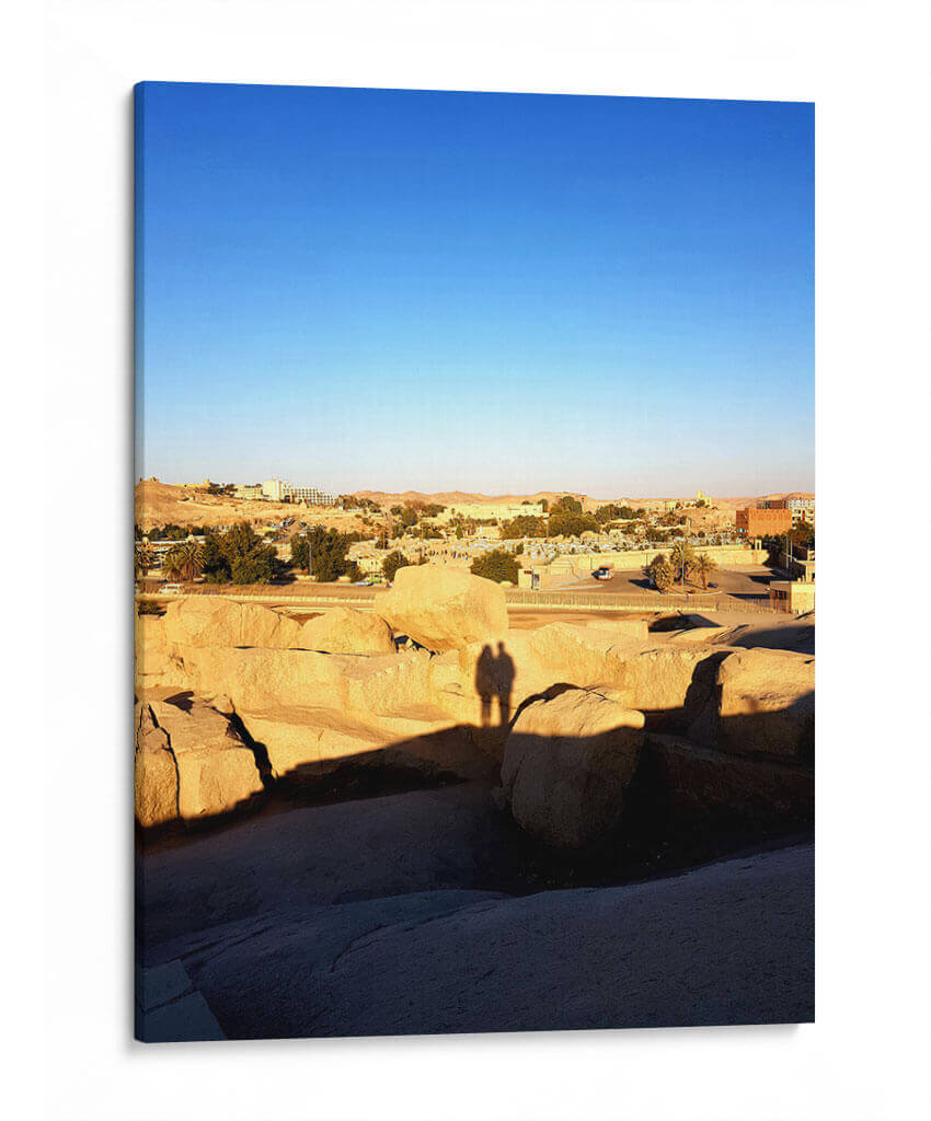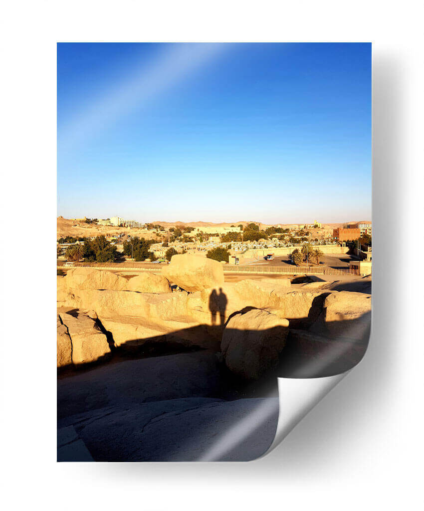 Captura la esencia de un atardecer sereno con "Sombra de amor en El Obelisco sin acabar", una obra que evoca la calidez y la conexión humana en un paisaje atemporal. Este cuadro decorativo presenta una vista panorámica de un asentamiento árido, bañado por la luz dorada del sol poniente, que proyecta largas sombras sobre formaciones rocosas monumentales. El cielo despejado de un azul intenso contrasta con los tonos ocres y terrosos de la tierra y las edificaciones, creando una atmósfera de paz y contemplación. Destaca la silueta de dos personas, sus sombras entrelazadas sobre las rocas, sugiriendo intimidad y compañerismo en medio de la vastedad. La composición, con sus líneas horizontales y la profundidad del paisaje, invita a la reflexión y a la apreciación de los momentos sencillos. Es una pieza ideal para añadir un toque de serenidad y calidez a tu hogar u oficina, transportándote a un lugar de calma y conexión. El estilo fotográfico captura la belleza efímera de la luz y la sombra, convirtiendo esta escena en una representación universal del amor y la presencia.
