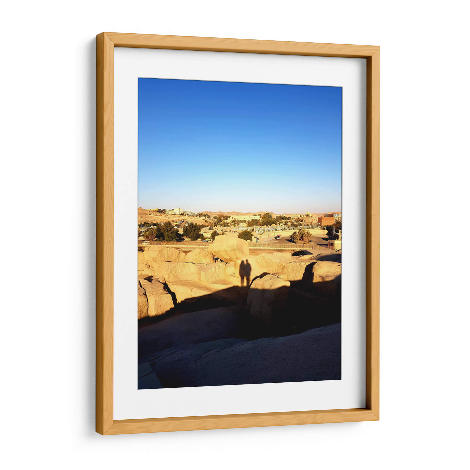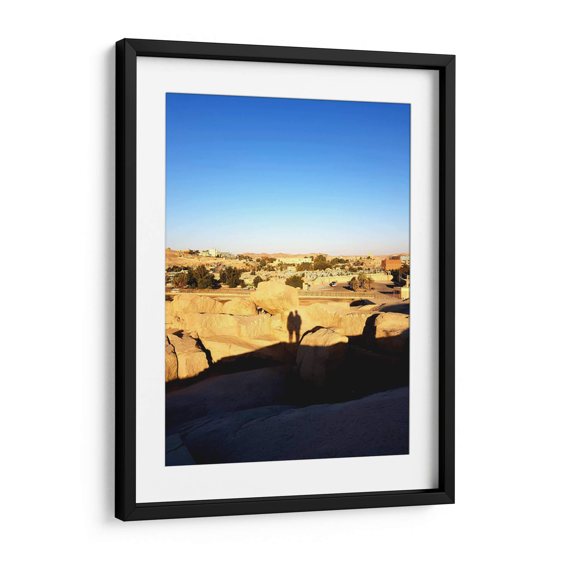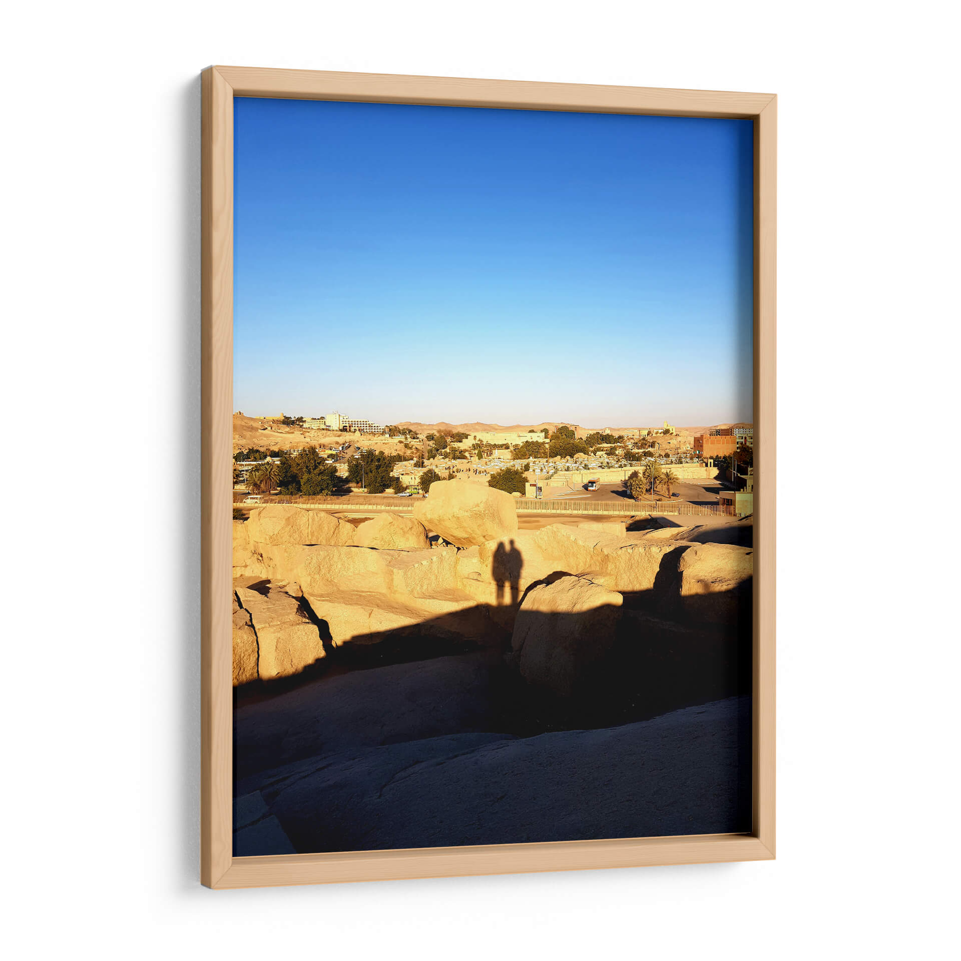 Captura la esencia de un atardecer sereno con "Sombra de amor en El Obelisco sin acabar", una obra que evoca la calidez y la conexión humana en un paisaje atemporal. Este cuadro decorativo presenta una vista panorámica de un asentamiento árido, bañado por la luz dorada del sol poniente, que proyecta largas sombras sobre formaciones rocosas monumentales. El cielo despejado de un azul intenso contrasta con los tonos ocres y terrosos de la tierra y las edificaciones, creando una atmósfera de paz y contemplación. Destaca la silueta de dos personas, sus sombras entrelazadas sobre las rocas, sugiriendo intimidad y compañerismo en medio de la vastedad. La composición, con sus líneas horizontales y la profundidad del paisaje, invita a la reflexión y a la apreciación de los momentos sencillos. Es una pieza ideal para añadir un toque de serenidad y calidez a tu hogar u oficina, transportándote a un lugar de calma y conexión. El estilo fotográfico captura la belleza efímera de la luz y la sombra, convirtiendo esta escena en una representación universal del amor y la presencia.
