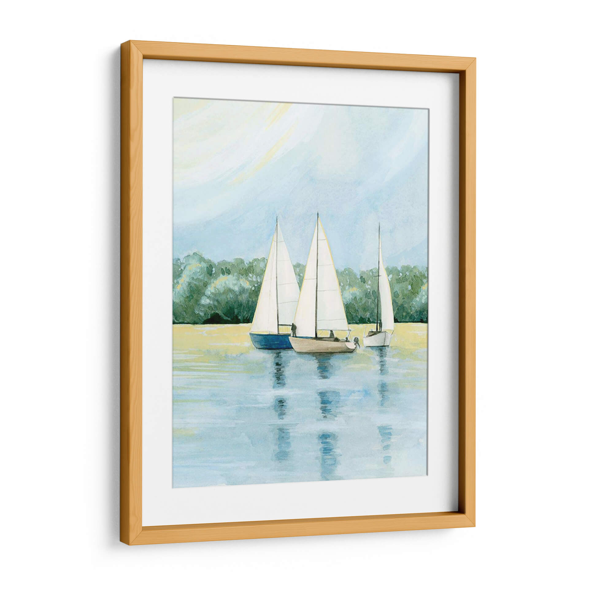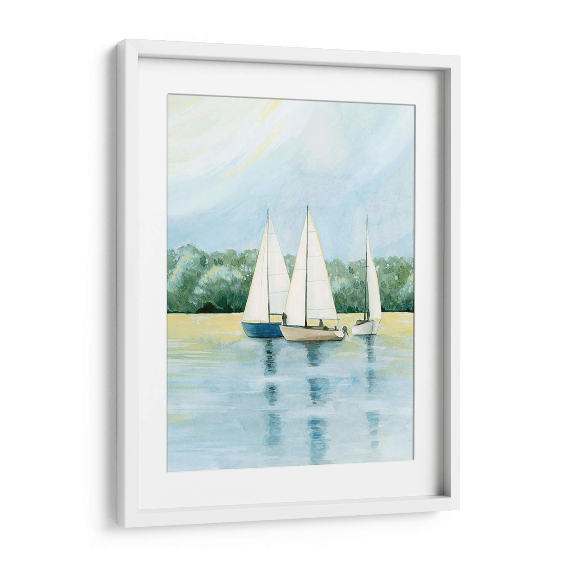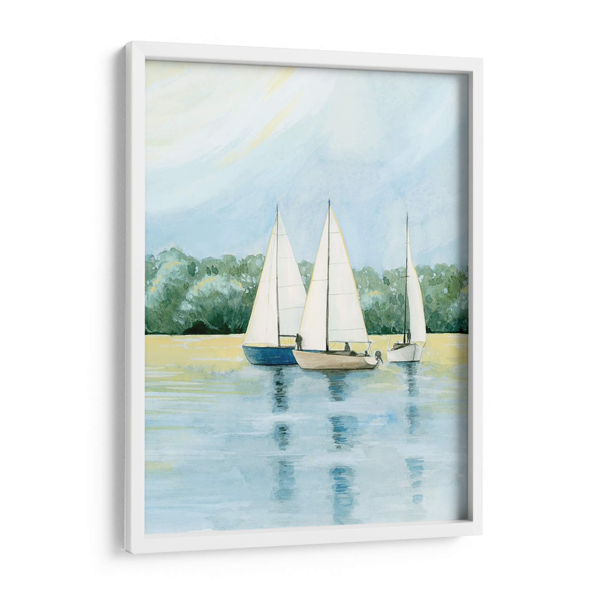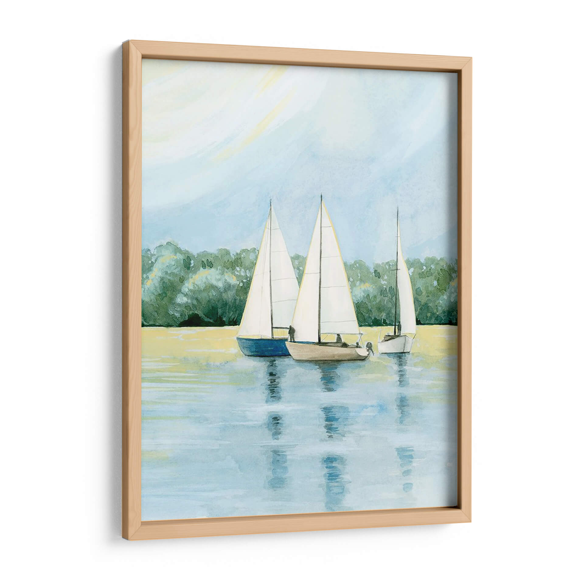 Embárquese en un viaje sereno con "Tarde Zarpa Yo" de Grace Popp, una obra de arte que captura la tranquilidad de un día de navegación. Esta pieza presenta tres veleros navegando juntos en aguas tranquilas, con un exuberante fondo de árboles verdes que se funden con un cielo azul pálido y un toque de sol amarillo pálido. La paleta de colores, dominada por tonos azules, verdes y amarillos suaves, crea una atmósfera de calma y contemplación. El estilo, que recuerda a la acuarela, aporta una ligereza etérea a la escena, invitando a la reflexión y al escape. "Tarde Zarpa Yo" es ideal para añadir un toque de paz y naturaleza a cualquier espacio, ya sea una sala de estar, un dormitorio o una oficina. Este cuadro decorativo evoca la libertad del mar y la belleza de un momento de tranquilidad, convirtiéndolo en una adición perfecta para quienes buscan un refugio visual y una conexión con la naturaleza en su hogar. Su composición equilibrada y su temática náutica la hacen versátil para diversos estilos de decoración, desde el costero hasta el contemporáneo, aportando una dosis de serenidad y elegancia.