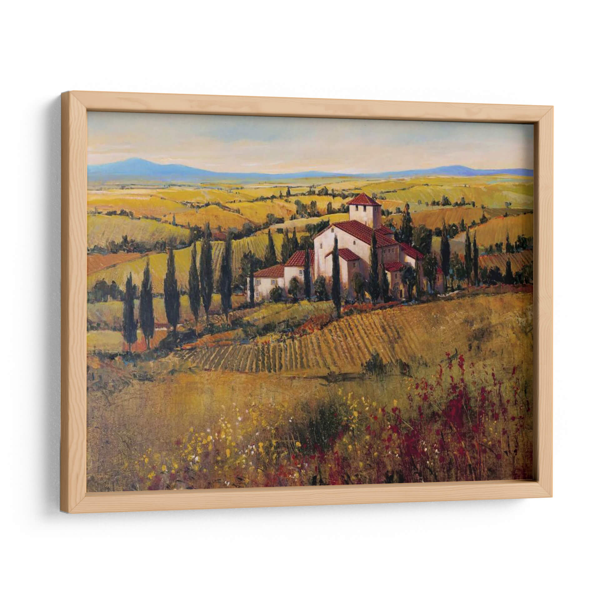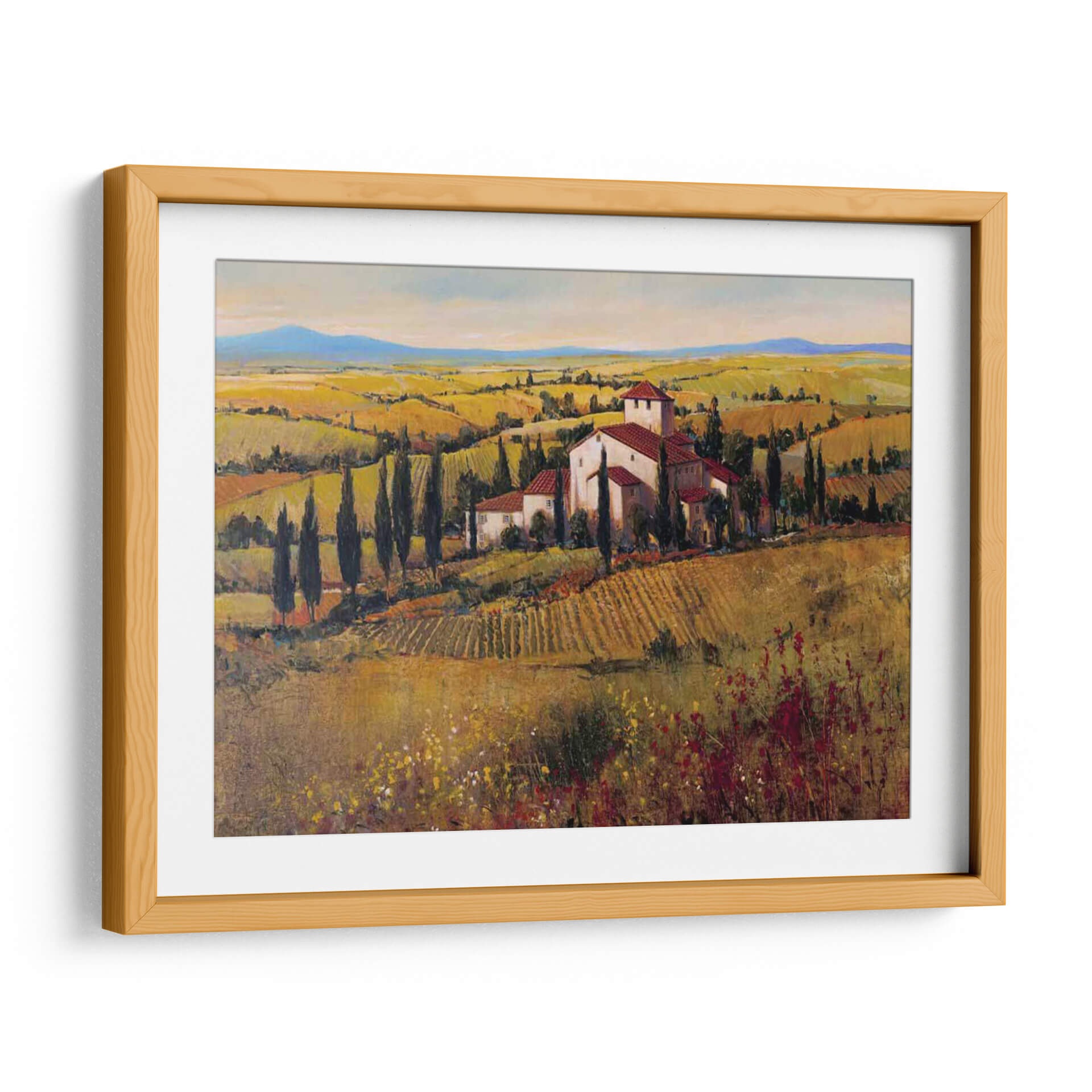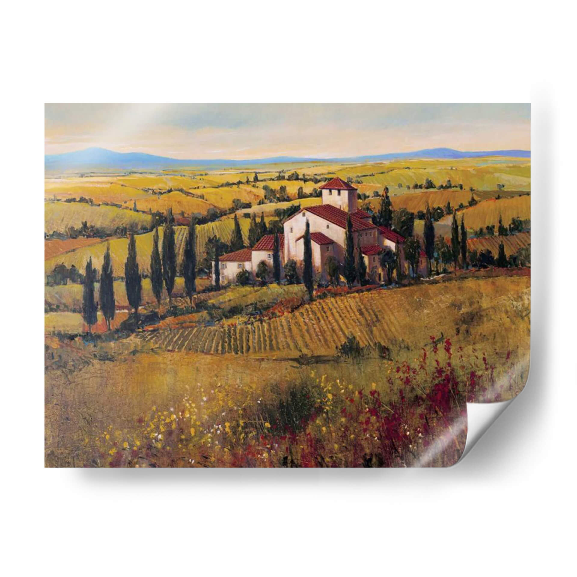 Transporta tus sentidos a las pintorescas colinas de la Toscana con "Toscana III", una obra de arte que captura la esencia de un idílico paisaje rural italiano. Este cuadro decorativo presenta una majestuosa villa con tejados rojos, enclavada entre campos de cultivo y viñedos ondulantes bajo un cielo sereno. La paleta de colores, dominada por cálidos tonos ocres, dorados y verdes, evoca una sensación de paz y abundancia, perfecta para infundir calidez y sofisticación en cualquier estancia. Los esbeltos cipreses que flanquean el camino a la villa añaden un toque de elegancia clásica, mientras que las flores silvestres en primer plano aportan vitalidad y color. El estilo pictórico, con pinceladas expresivas y una atmósfera casi impresionista, invita a la contemplación y al disfrute de la belleza atemporal. Ideal para salones, comedores o estudios que buscan una conexión con la naturaleza y un aire de escapismo campestre. Este lienzo es más que una decoración; es una ventana a un mundo de tranquilidad y belleza rural, una pieza que enriquecerá tu hogar con carácter y estilo.