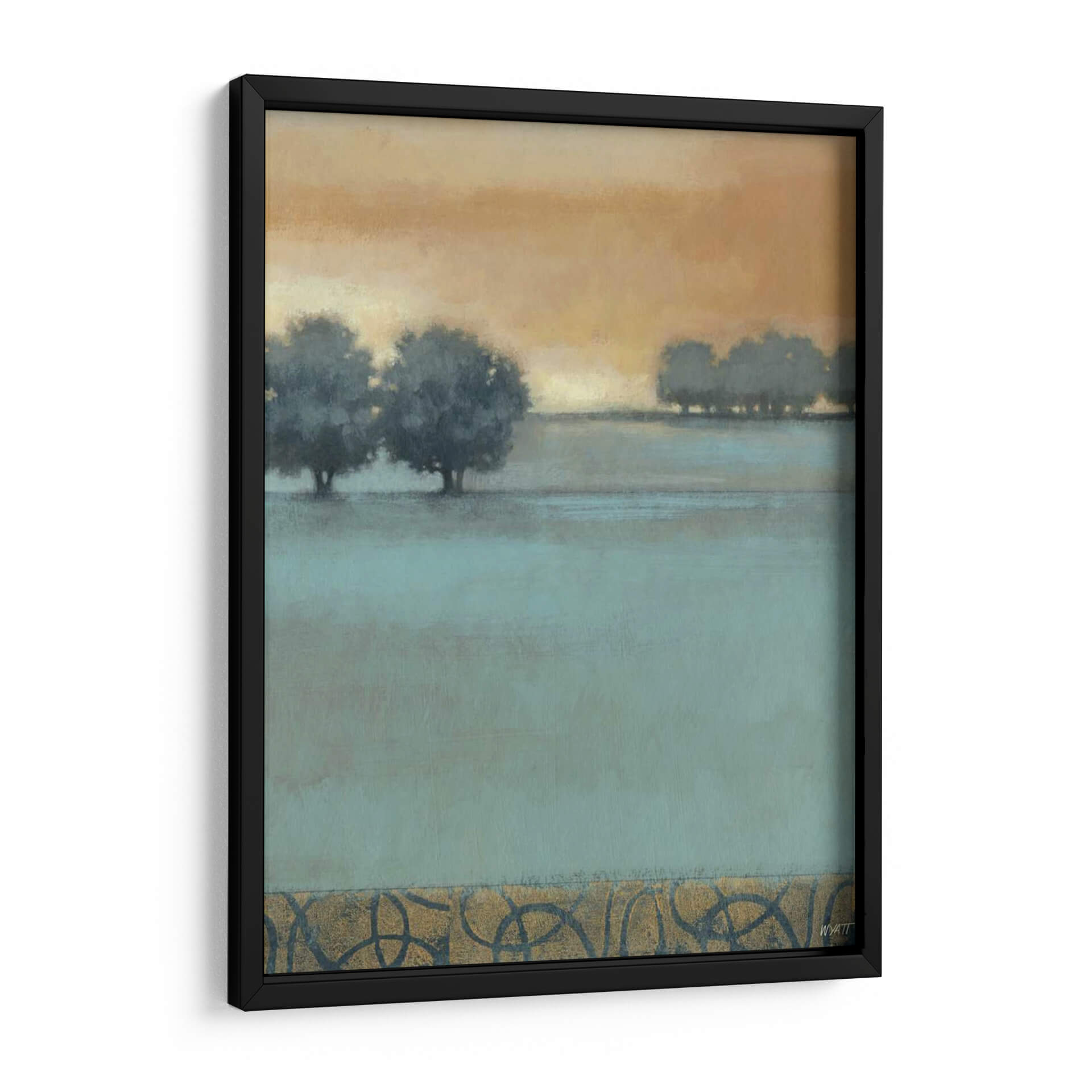 Sumérgete en la serenidad de "Tranquilo Paisaje I", una obra de arte evocadora del artista Norman Wyatt Jr. Este cuadro decorativo captura la esencia de un atardecer sereno con su paleta de colores cálidos y terrosos que se funden suavemente con el azul acuático del primer plano. La composición presenta siluetas de árboles dispersos, creando una sensación de profundidad y calma, mientras que un borde texturizado con un patrón abstracto en tonos dorados y azul marino añade un toque contemporáneo y sofisticado. La técnica utilizada evoca una atmósfera de paz y contemplación, perfecta para transformar cualquier espacio en un santuario de tranquilidad. Ideal para salones modernos, dormitorios o estudios, este lienzo decorativo invita a la reflexión y aporta una nota de elegancia natural a tu hogar u oficina. Deja que las sutiles pinceladas y la armonía cromática de "Tranquilo Paisaje I" aporten equilibrio y serenidad a tu decoración.