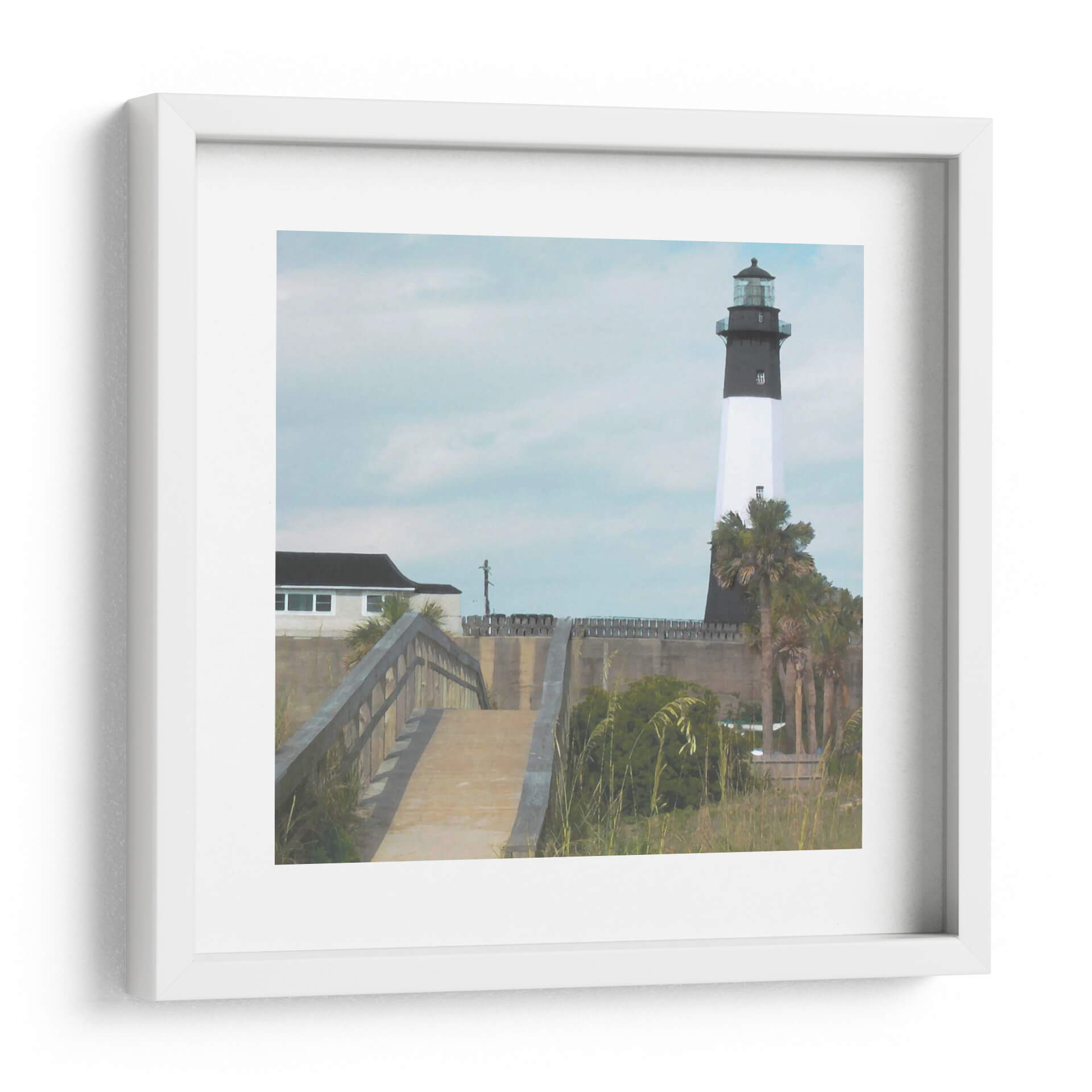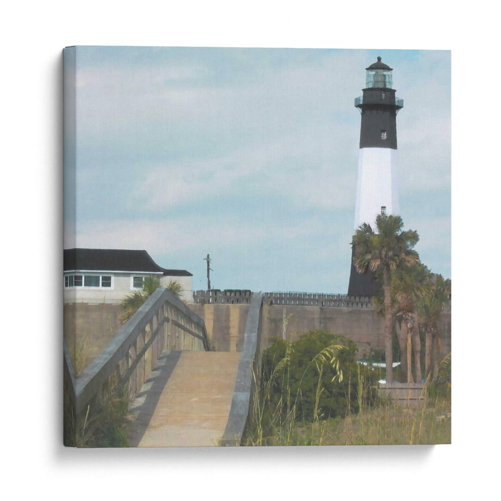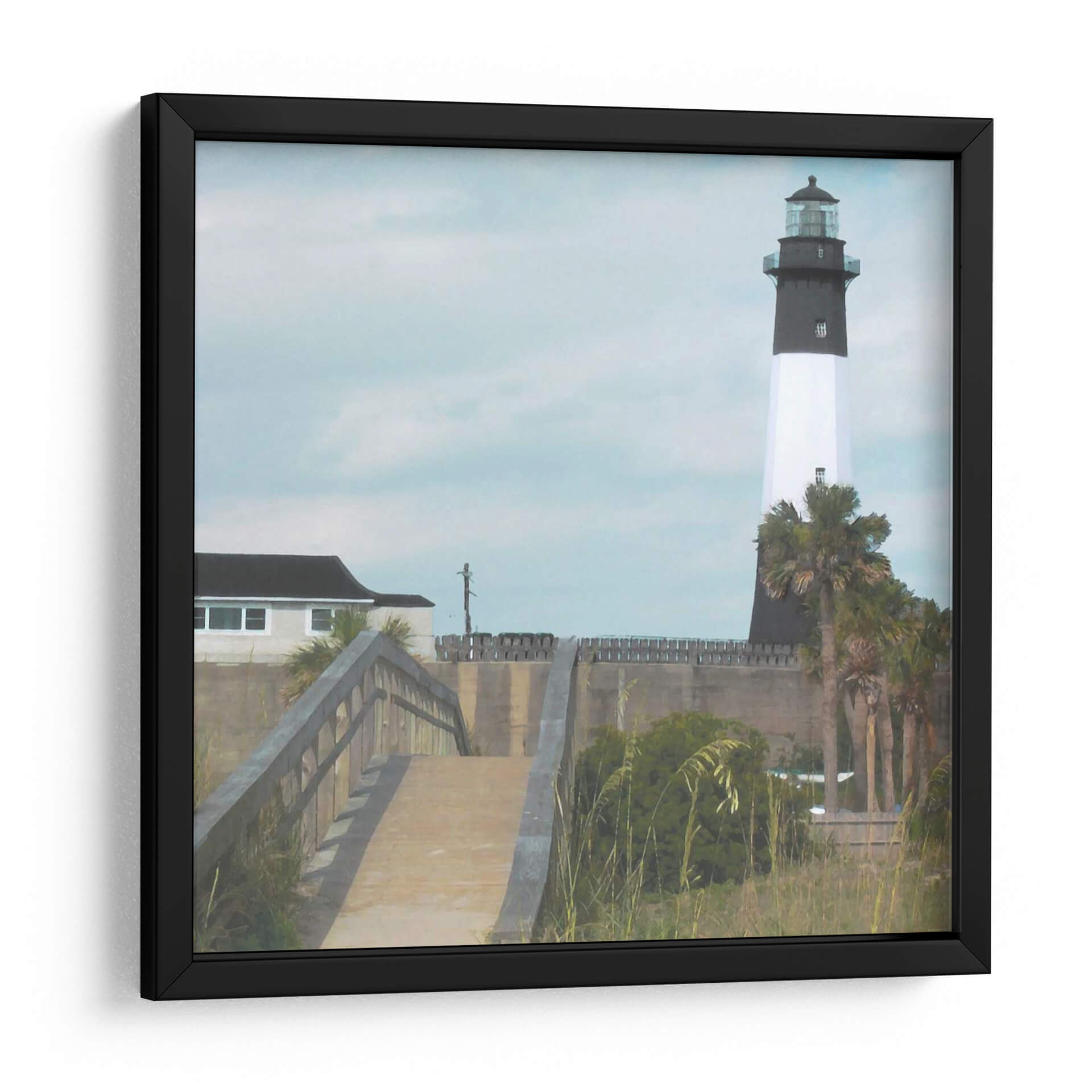 Sumérgete en la serenidad costera con "Tybee Fighthouse II", una obra de arte que captura la esencia de un día tranquilo junto al mar. Este cuadro decorativo presenta un faro icónico en el horizonte, flanqueado por palmeras que susurran con la brisa marina y una pasarela de madera que invita a adentrarse en la escena. La paleta de colores, dominada por tonos celestes suaves, grises sutiles y verdes terrosos, crea una atmósfera de calma y contemplación. La composición, con el faro como punto focal, guía la mirada a través de la textura suave de las nubes y la línea del horizonte, evocando una sensación de paz y descubrimiento. "Tybee Fighthouse II" es una pieza ideal para transformar cualquier espacio en un santuario de tranquilidad, perfecta para salones, dormitorios o estudios que busquen un toque de inspiración costera y elegancia atemporal. Añade esta joya artística a tu colección y deja que la magia del océano inunde tu hogar, creando un ambiente de relajación y belleza duradera que te transportará a la costa con cada mirada.
