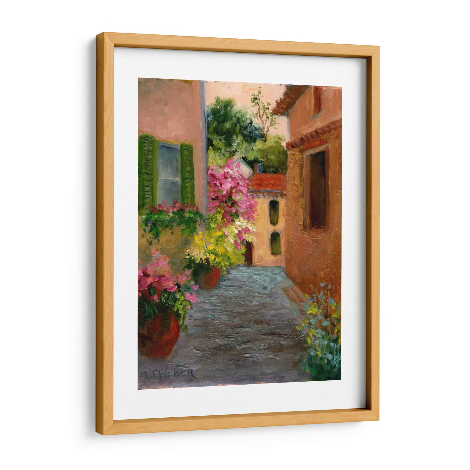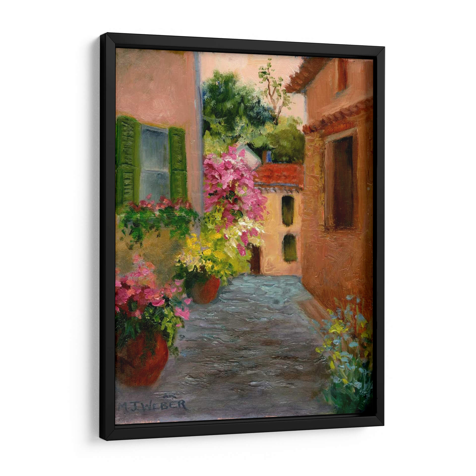 Sumérgete en la encantadora atmósfera de 'Un Pasaje Francés', una obra de arte que captura la esencia de un rincón pintoresco bañado por la luz del sol. La pintura presenta una callejuela adoquinada flanqueada por edificaciones con fachadas de tonos cálidos, adornadas con contraventanas verdes vibrantes y macetas rebosantes de flores rosadas y amarillas. El artista, Mary Jean Weber, utiliza pinceladas sueltas y expresivas, reminiscentes del impresionismo, para dar vida a las texturas de los muros, la piedra del camino y el follaje exuberante de los árboles y las flores. La paleta de colores, dominada por los ocres, rosas empolvados, verdes intensos y toques de azul y amarillo, crea una sensación de calidez y serenidad, transportando al espectador a un momento de tranquilidad mediterránea. Este cuadro decorativo es perfecto para añadir un toque de color y vitalidad a cualquier espacio, evocando la sensación de un paseo relajado y las vacaciones. Ideal para salones, comedores o incluso para dar vida a un rincón de lectura en un dormitorio, 'Un Pasaje Francés' es una invitación a la contemplación y al disfrute de la belleza cotidiana, convirtiéndose en un punto focal cautivador y una fuente constante de inspiración.
