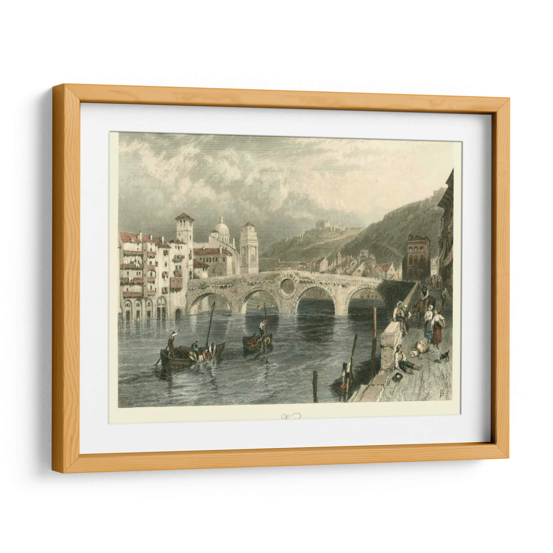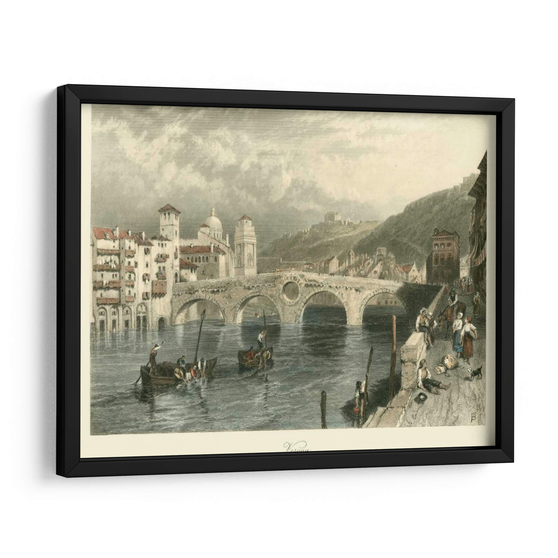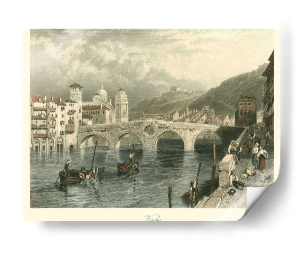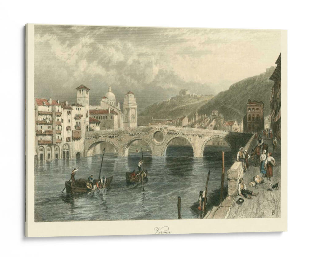 Transporta tus sentidos a la romántica ciudad de Verona con este evocador cuadro decorativo. La obra captura la majestuosidad del Ponte Pietra, un antiguo puente de piedra que se alza sobre el río Adigio, flanqueado por edificios históricos de tonos ocres y terracota. El agua, representada con sutiles tonalidades azules y grises, refleja el cielo nublado y la arquitectura circundante, creando una atmósfera serena y ligeramente melancólica. Pequeñas embarcaciones navegan tranquilamente por el río, y en la orilla, figuras de época pasean, añadiendo un toque de vida y narrativa a la escena. La paleta de colores, dominada por tonos tierra, grises, azules pálidos y acentos rojizos, confiere a la pieza una sensación de antigüedad y sofisticación. Ideal para aquellos que buscan infundir a su hogar u oficina un aire de historia, cultura y belleza clásica, este cuadro decorativo es una ventana a un pasado pintoresco que invita a la contemplación y al ensueño, convirtiéndose en un punto focal elegante en cualquier espacio.