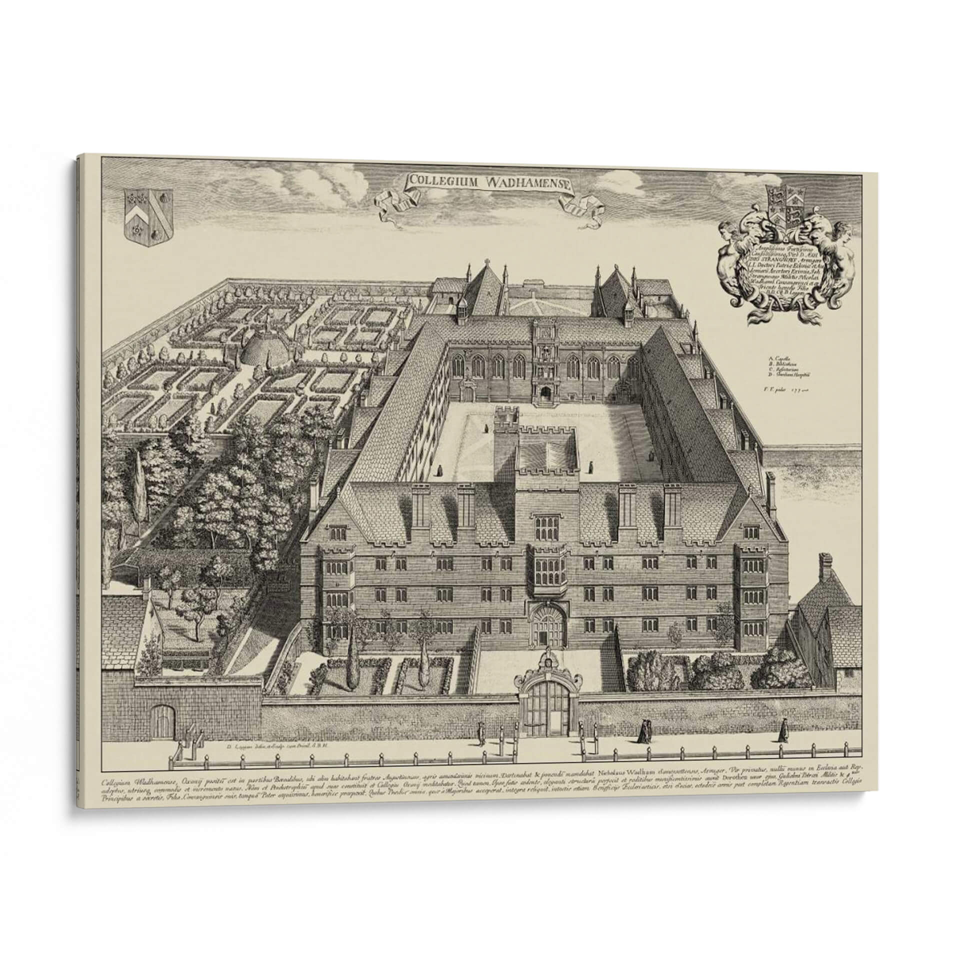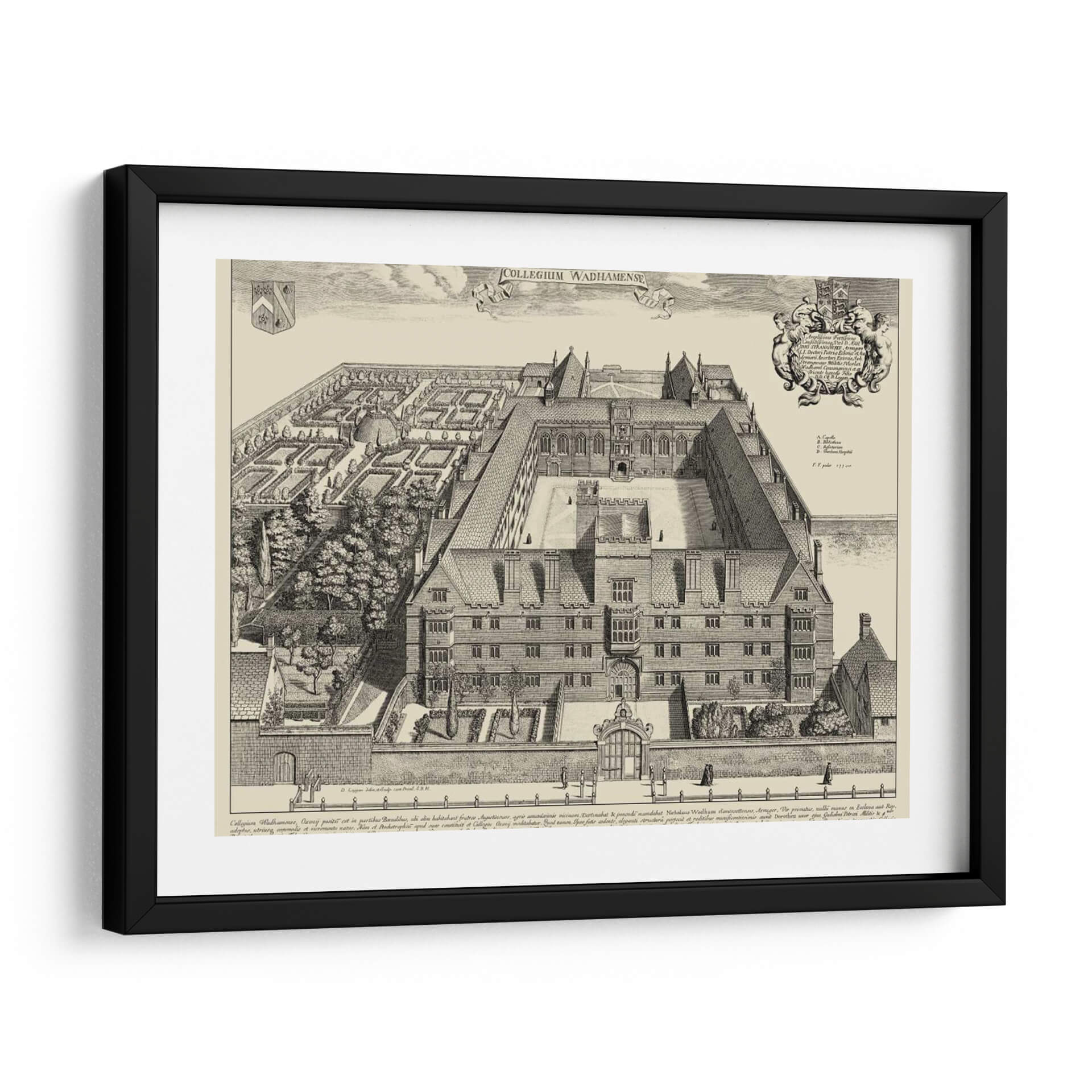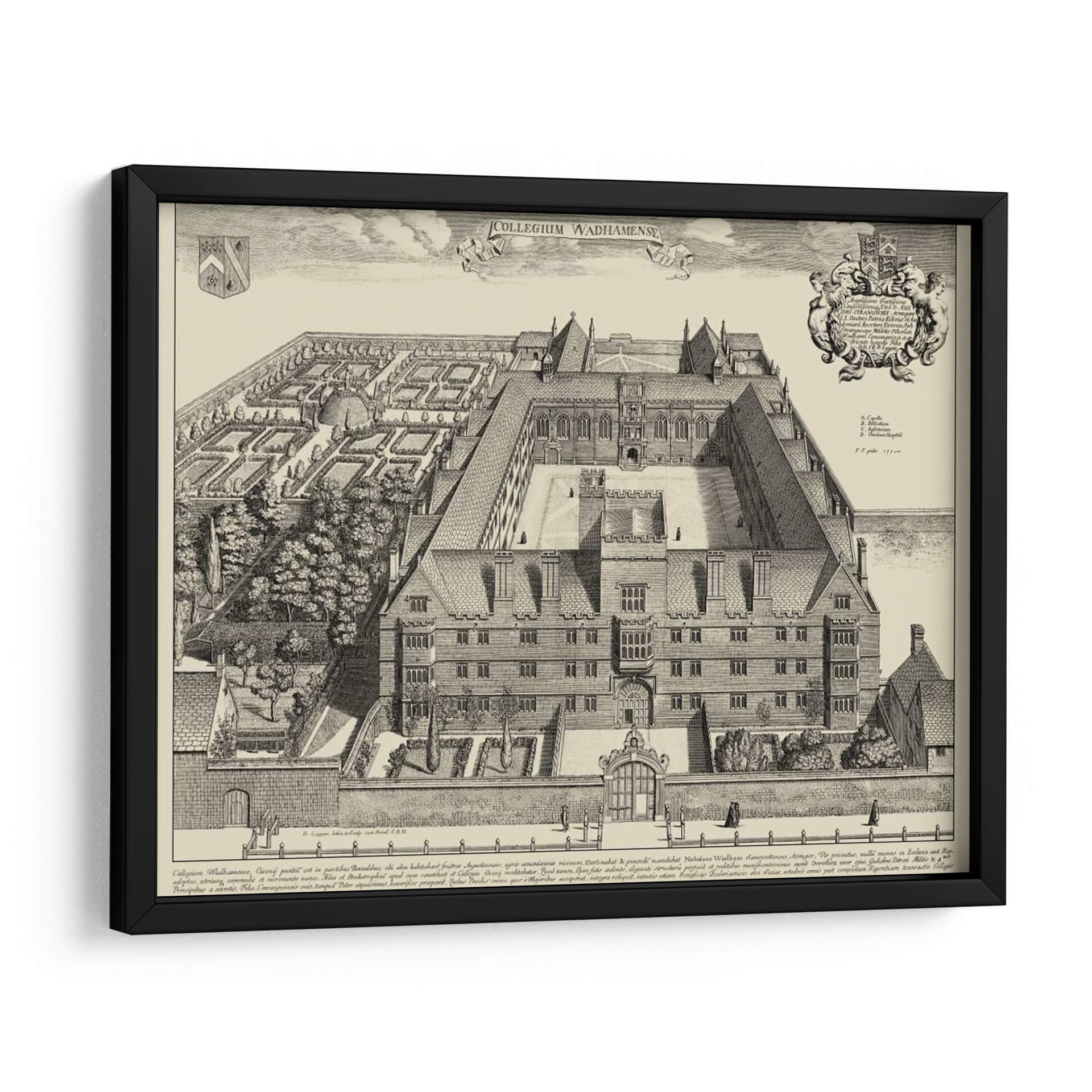 Emb acrcate en un viaje visual al pasado con esta detallada representaci 3n de "Vista De Cambridge". Esta obra, de estilo grabado antiguo, captura la majestuosidad arquitect 3nica de un colegio hist 3rico, con sus intrincados patios, fachadas sim 3tricas y jardines cuidadosamente dise 3ados. La paleta de colores monocrom 3tica en tonos sepia evoca una sensaci 3n de nostalgia y elegancia atemporal, ideal para espacios que buscan un toque de historia y sofisticaci 3n. La composici 3n detallada, con figuras humanas de escala reducida, ancla la arquitectura en una perspectiva realista, invitando al espectador a explorar cada rinc 3n de la escena. Este cuadro decorativo es perfecto para infundir car 3cter y un aire intelectual a tu hogar u oficina. Su dise 3o cl 3sico y la representaci 3n de un entorno acad 3mico lo convierten en una pieza focal ideal para bibliotecas, estudios, despachos o salones que aprecian la arquitectura y la historia. La "Vista De Cambridge" no es solo una imagen, es una ventana a otra 3poca, un testimonio de la grandeza arquitect 3nica y un punto de partida para conversaciones. Aporta profundidad y un sentido 3nico de lugar a tu decoraci 3n interior con esta impresionante representaci 3n art 3stica.