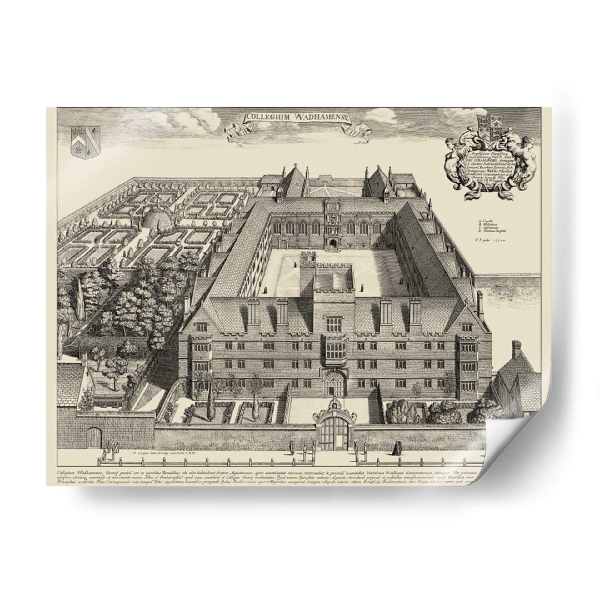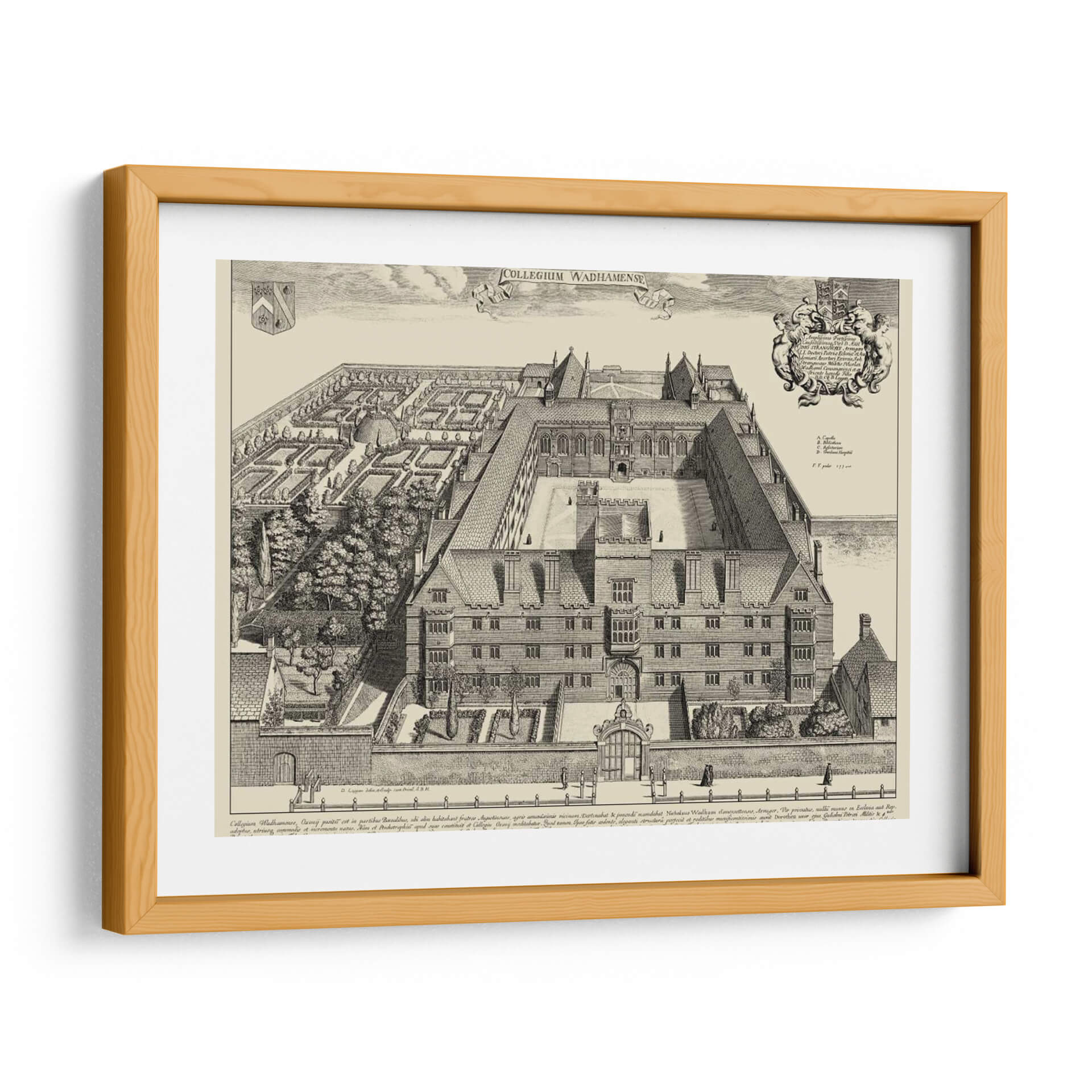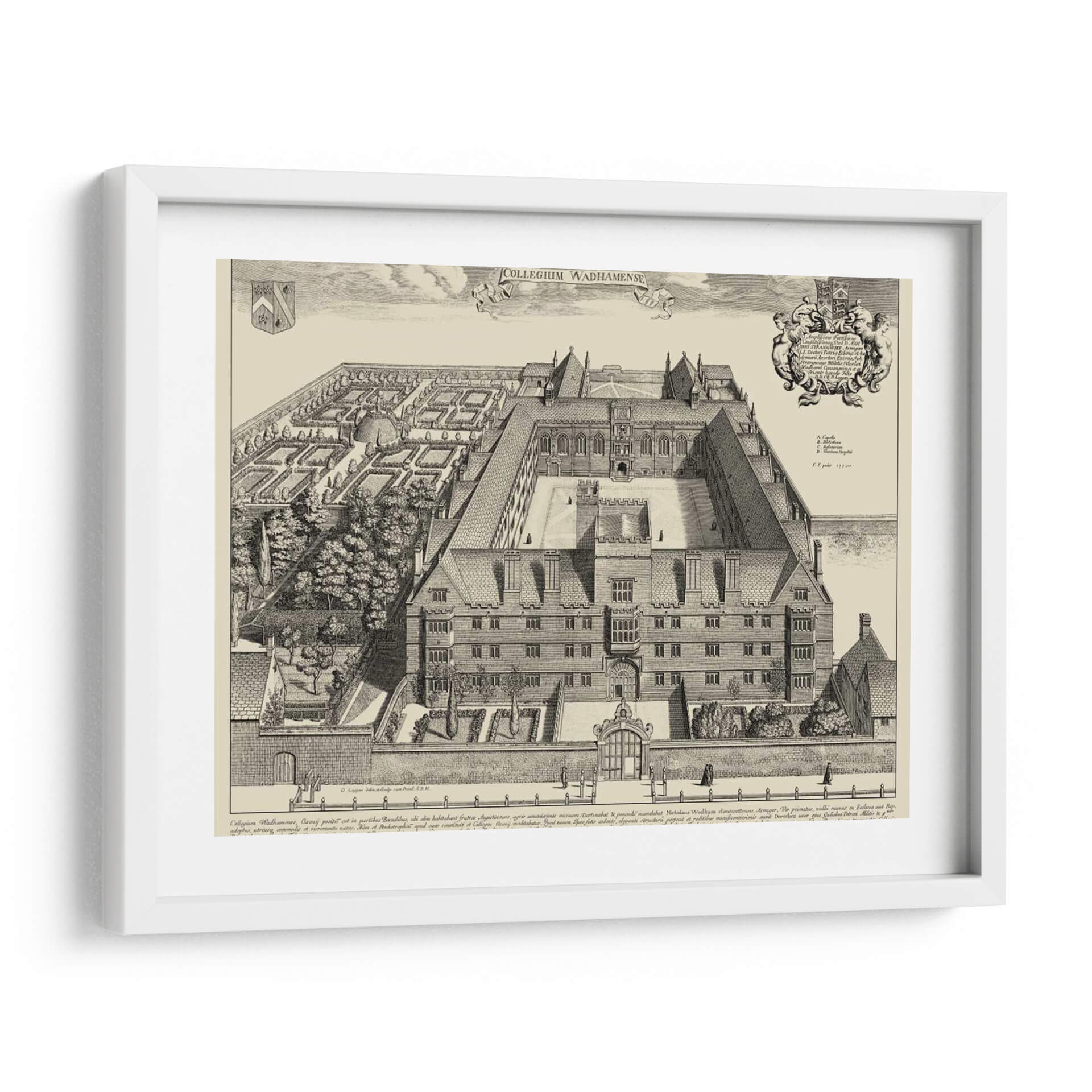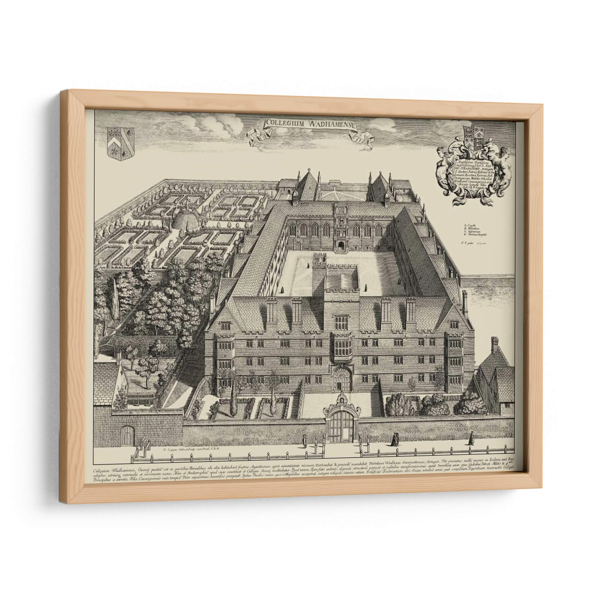 Emb acrcate en un viaje visual al pasado con esta detallada representaci 3n de "Vista De Cambridge". Esta obra, de estilo grabado antiguo, captura la majestuosidad arquitect 3nica de un colegio hist 3rico, con sus intrincados patios, fachadas sim 3tricas y jardines cuidadosamente dise 3ados. La paleta de colores monocrom 3tica en tonos sepia evoca una sensaci 3n de nostalgia y elegancia atemporal, ideal para espacios que buscan un toque de historia y sofisticaci 3n. La composici 3n detallada, con figuras humanas de escala reducida, ancla la arquitectura en una perspectiva realista, invitando al espectador a explorar cada rinc 3n de la escena. Este cuadro decorativo es perfecto para infundir car 3cter y un aire intelectual a tu hogar u oficina. Su dise 3o cl 3sico y la representaci 3n de un entorno acad 3mico lo convierten en una pieza focal ideal para bibliotecas, estudios, despachos o salones que aprecian la arquitectura y la historia. La "Vista De Cambridge" no es solo una imagen, es una ventana a otra 3poca, un testimonio de la grandeza arquitect 3nica y un punto de partida para conversaciones. Aporta profundidad y un sentido 3nico de lugar a tu decoraci 3n interior con esta impresionante representaci 3n art 3stica.