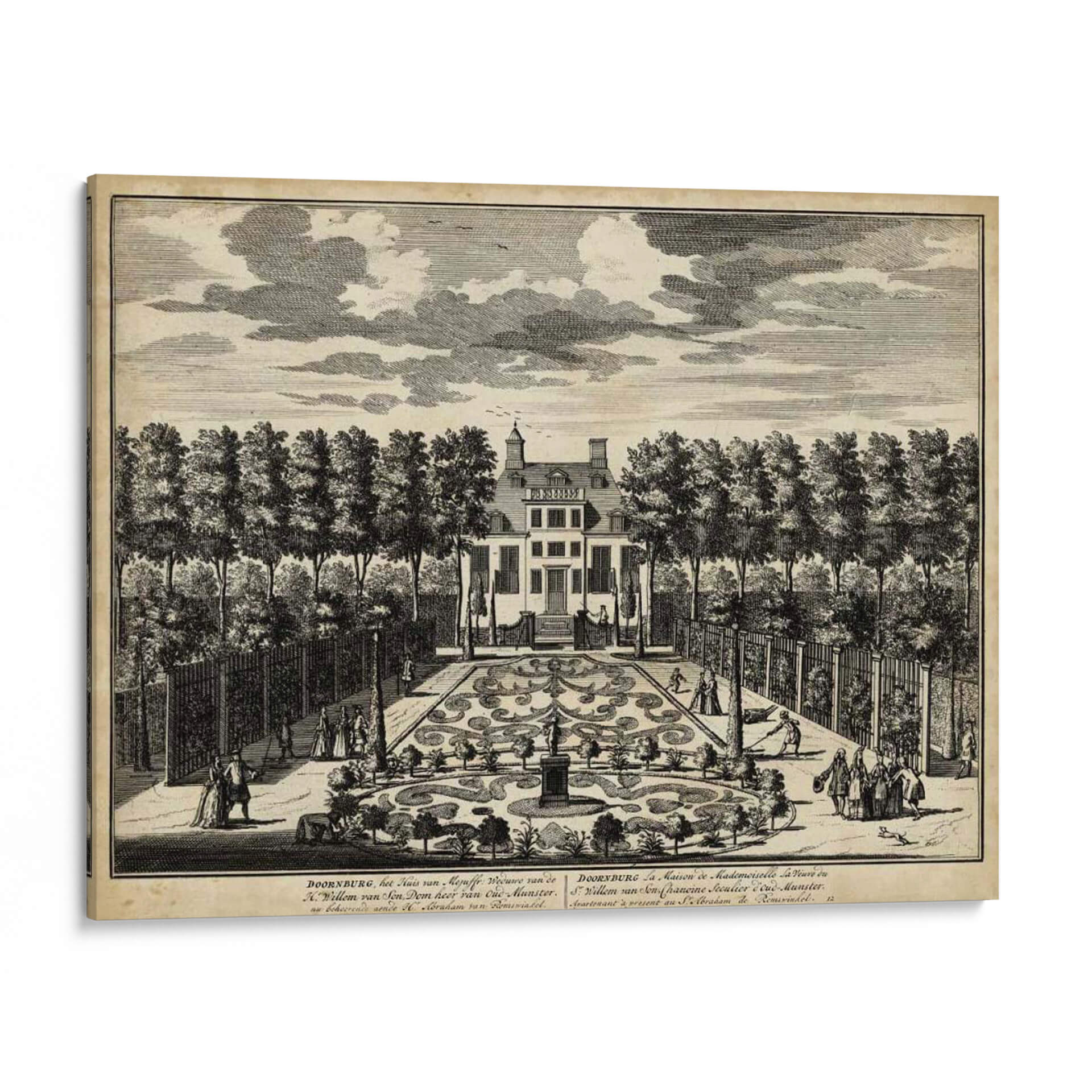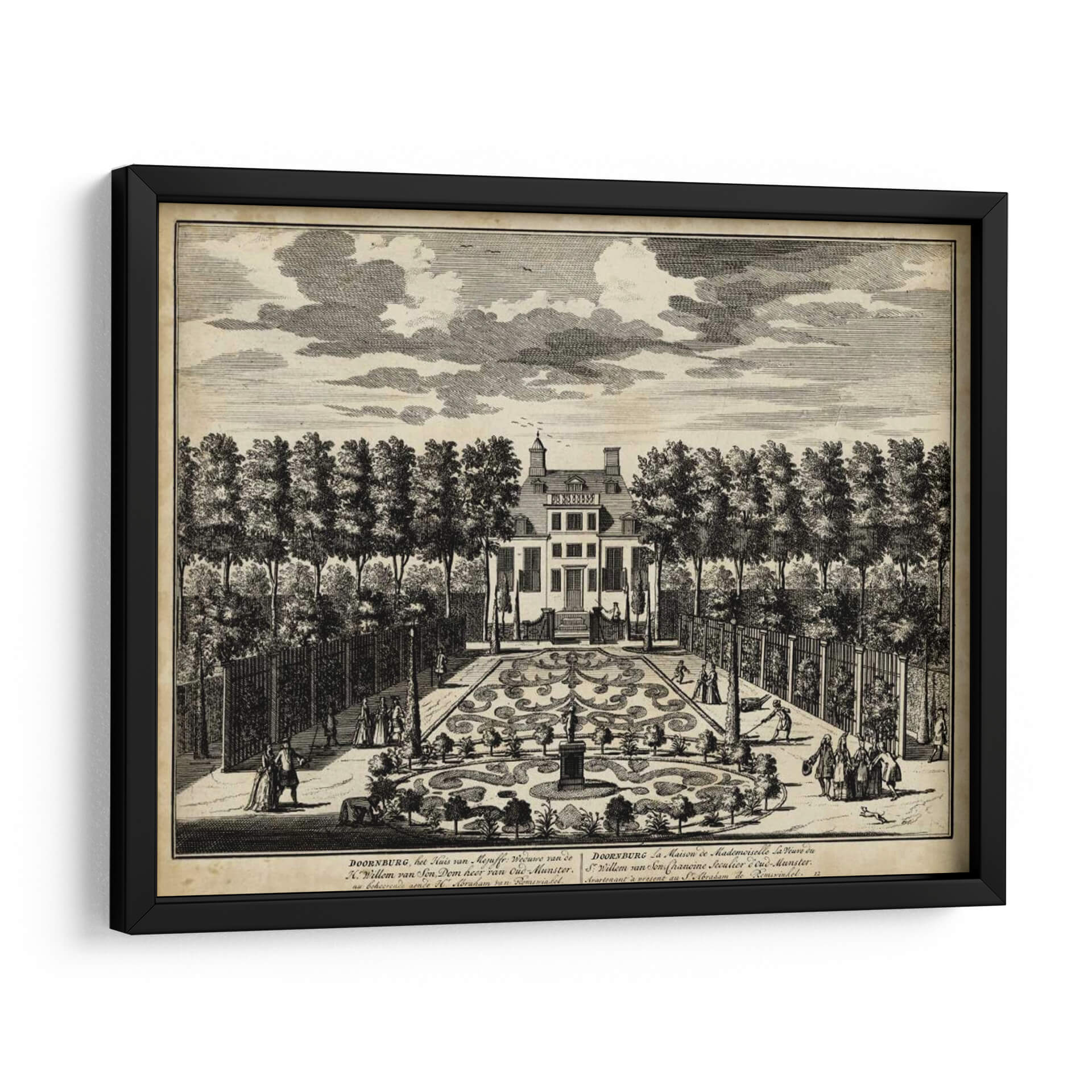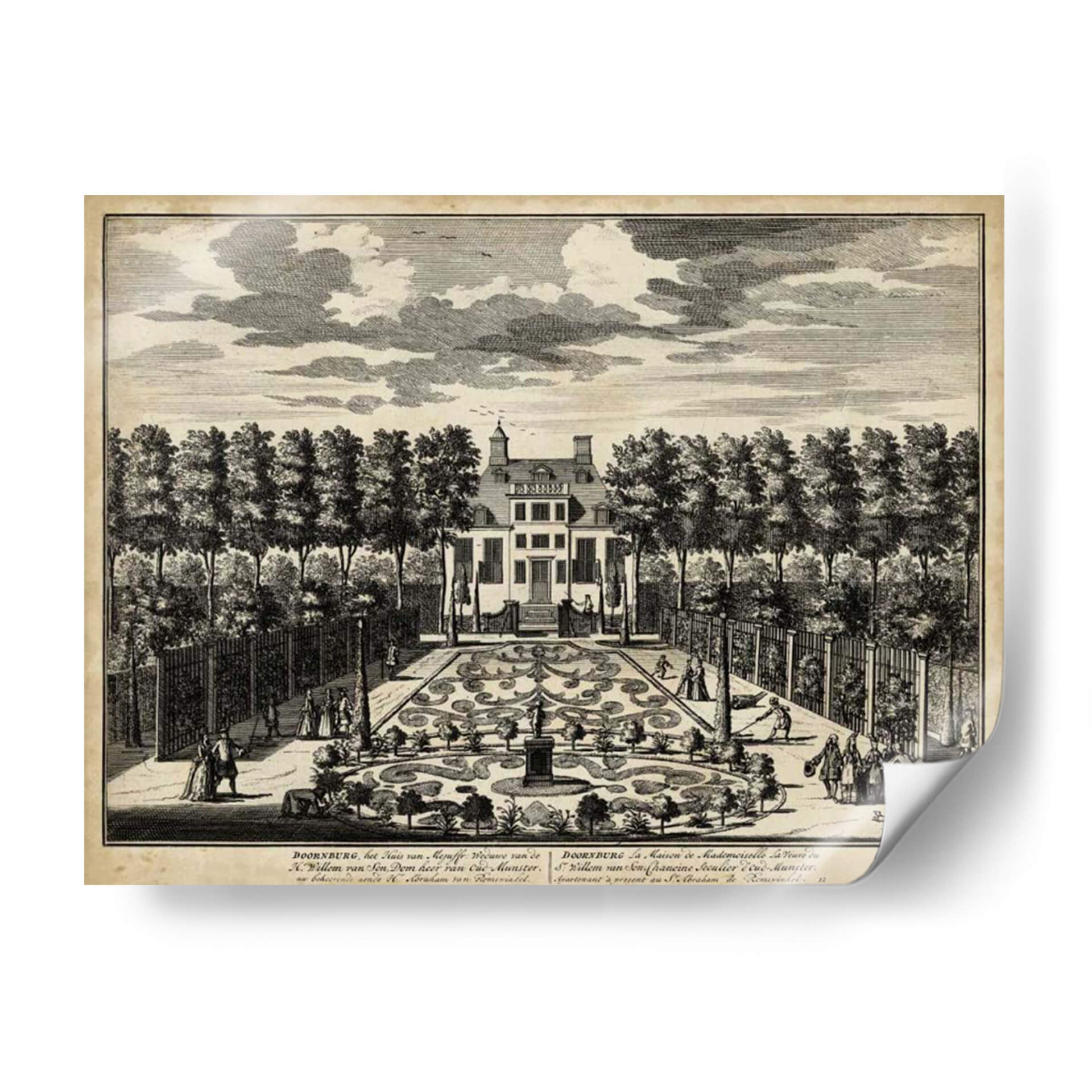 Sumérgete en la elegancia histórica con 'Vistas De Ámsterdam I' de Nicolaus Visher, una obra de arte que captura la esencia de la arquitectura clásica y los jardines formales. Este grabado detallado transporta al espectador a una época de esplendor, mostrando una majestuosa casa flanqueada por árboles simétricamente plantados y un intrincado jardín de parterres. Las figuras humanas en trajes de época añaden vida a la escena, invitando a la contemplación de la vida social y la arquitectura paisajística del siglo XVIII. La paleta de tonos sepia y blanco y negro evoca una sensación de nostalgia y refinamiento, perfecta para añadir un toque de sofisticación atemporal a cualquier espacio. Ideal para amantes de la historia, la arquitectura y el arte clásico, este cuadro decorativo es una pieza central que invita a la conversación y eleva la estética de salones, estudios u oficinas. Su composición equilibrada y el exquisito detalle lo convierten en una adición valiosa para coleccionistas y decoradores que buscan piezas con profundidad y carácter. Transforma tu hogar en una galería personal con este evocador grabado que rinde homenaje al legado artístico y arquitectónico.