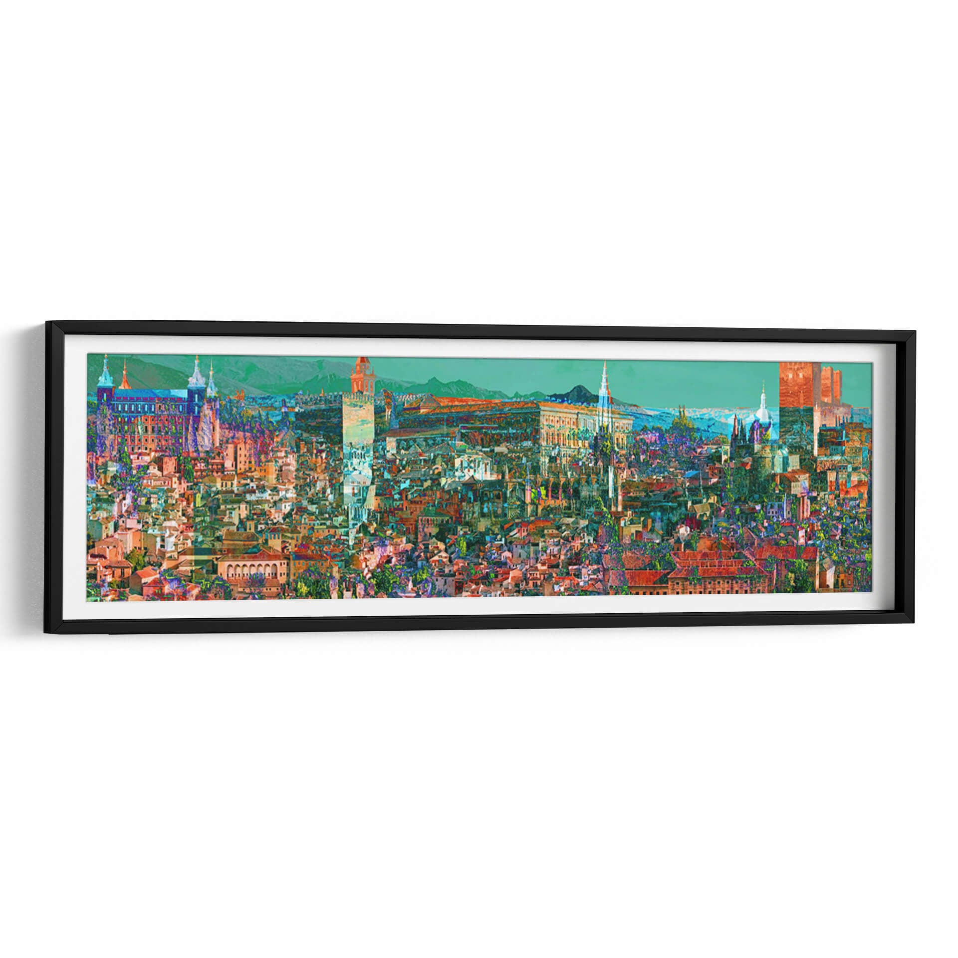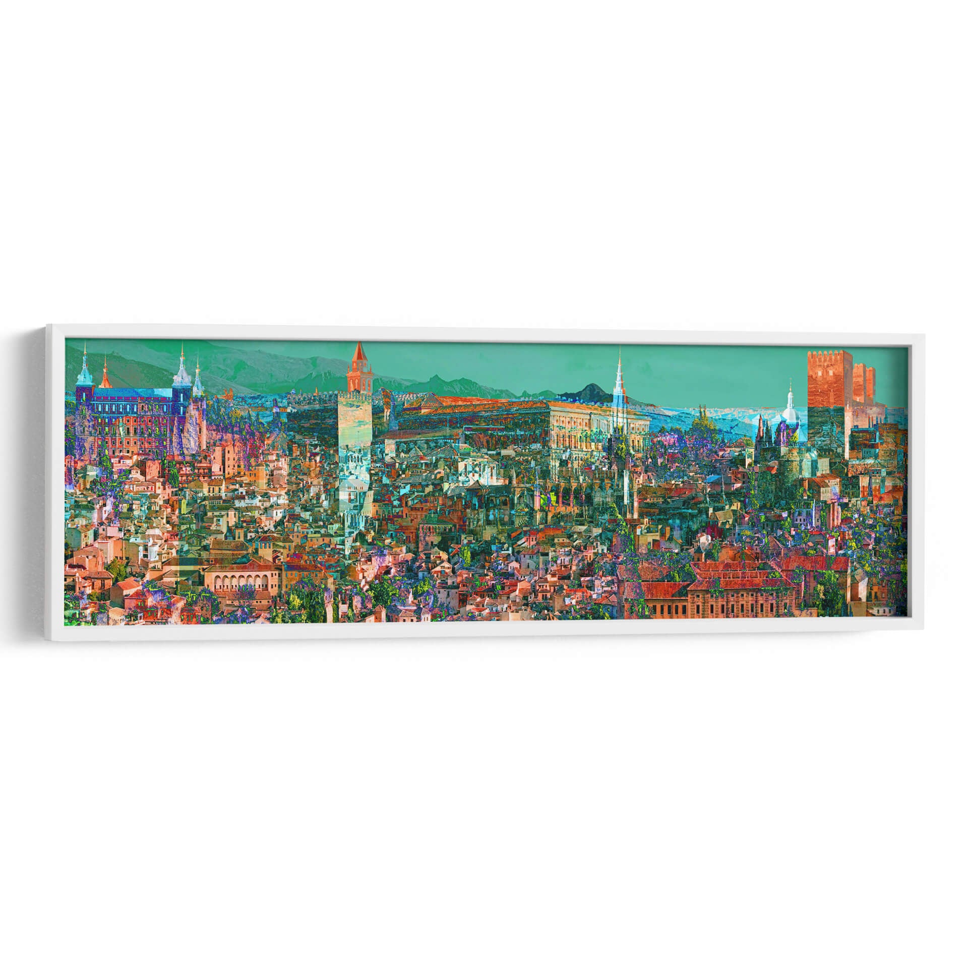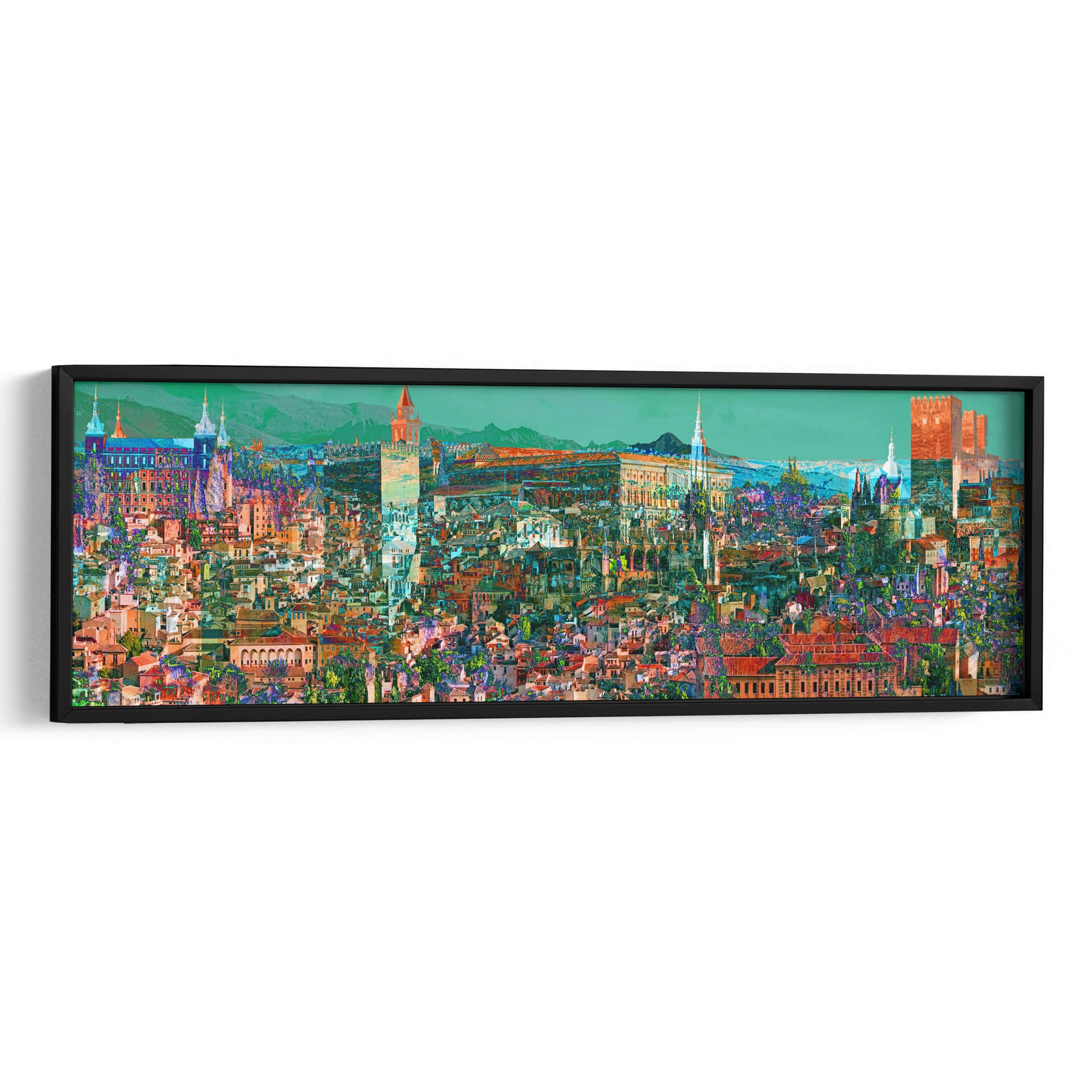 Sumérgete en la vibrante energía de "España a color", una obra de arte que captura la esencia de un paisaje urbano español con una explosión de tonos vibrantes y una composición dinámica. Los detalles arquitectónicos de edificios históricos y modernas estructuras se entrelazan en un tapiz visual, creado con una técnica que parece fusionar múltiples perspectivas y momentos en uno solo. Predominan los azules turquesa en el cielo y el fondo, contrastando audazmente con los cálidos naranjas, rojos y amarillos de los tejados y fachadas. Los toques de púrpura y verde añaden profundidad y complejidad a esta representación impresionista y ligeramente abstracta de una ciudad española. Esta pieza evoca una sensación de vitalidad, movimiento y una profunda apreciación por la riqueza cultural y la arquitectura. "España a color" es ideal para infundir vida y personalidad a tu sala de estar, comedor o estudio, actuando como un punto focal que invita a la contemplación y la conversación. Añade un toque de audacia y sofisticación a tu decoración con este lienzo cautivador, perfecto para quienes buscan una decoración de pared que sea tanto expresiva como estéticamente impactante.