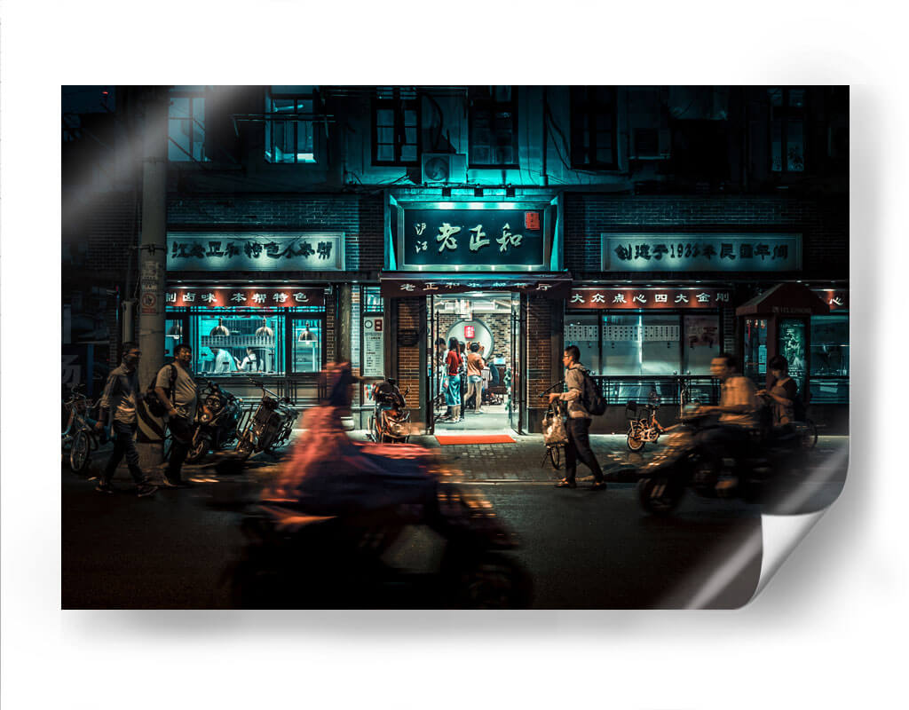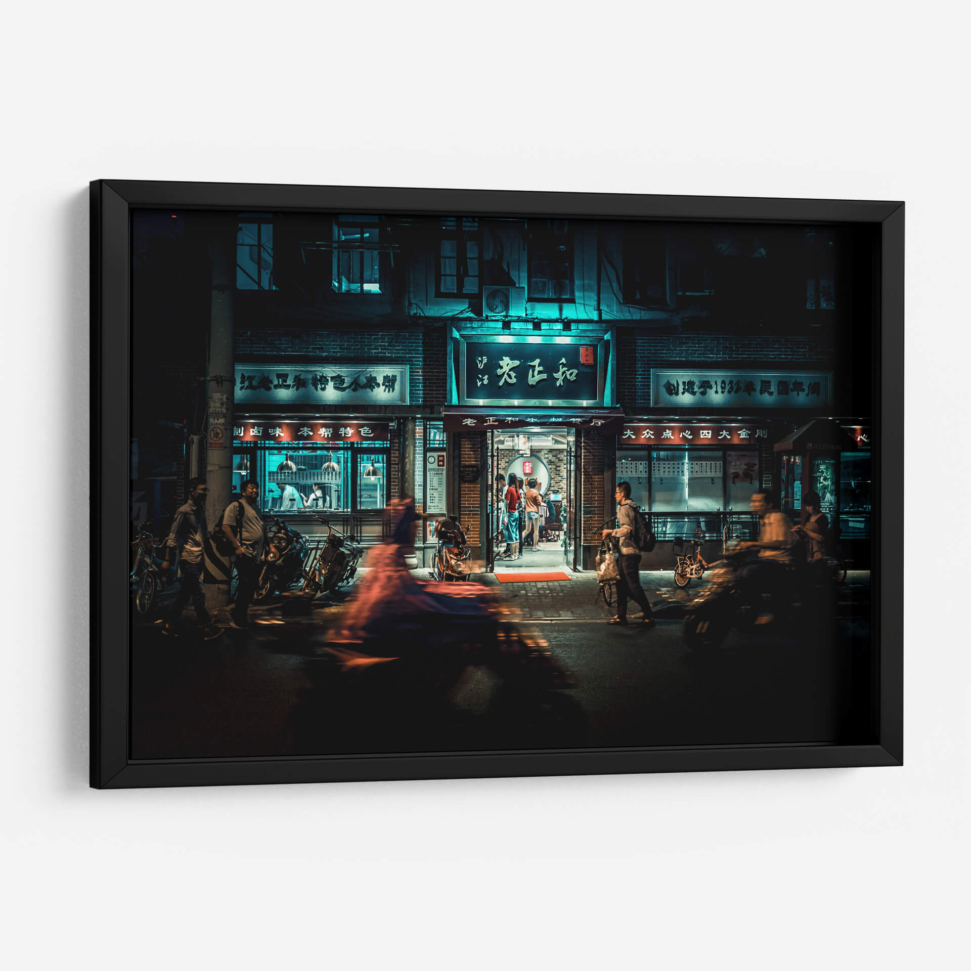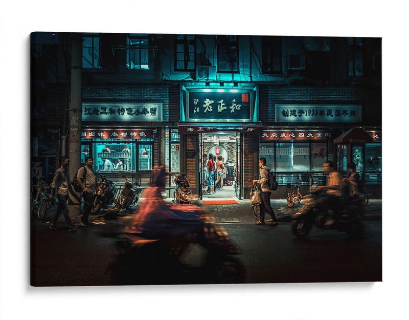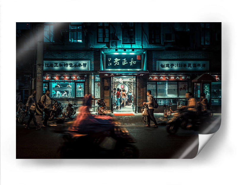 Sumérgete en la atmósfera vibrante y nocturna de 'Old Shanghai' con este cautivador cuadro decorativo. La obra captura la esencia de una calle urbana asiática al anochecer, con luces de neón brillantes que contrastan con las sombras profundas, creando una sensación de misterio y movimiento. Personas y vehículos capturados en un instante borroso añaden dinamismo a la escena, invitando al espectador a imaginar las historias que transcurren en este bullicioso escenario. Los tonos azules y cian dominantes, salpicados por el cálido resplandor de los interiores de los locales, generan una paleta de colores rica y envolvente, perfecta para añadir un toque de sofisticación y exotismo a cualquier espacio. Este cuadro decorativo es ideal para salas de estar modernas, comedores o incluso oficinas, actuando como un punto focal que evoca conversaciones y evoca la energía de la vida urbana. Su estilo, que fusiona la fotografía urbana con un toque artístico, lo convierte en una pieza única para aquellos que aprecian la belleza en la vida cotidiana y buscan una decoración de pared que cuente una historia. Añade un toque de carácter y personalidad a tu hogar u oficina con esta evocadora representación de 'Old Shanghai'.