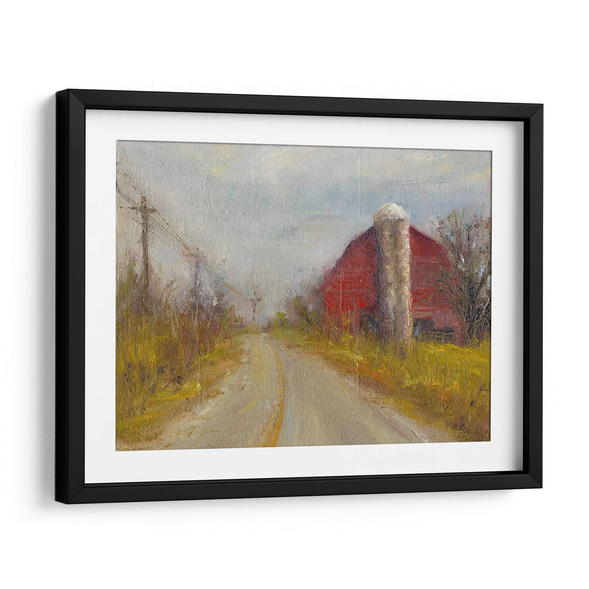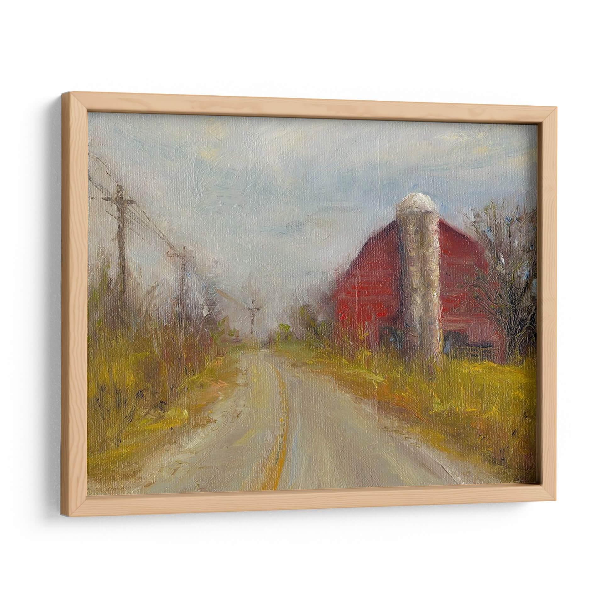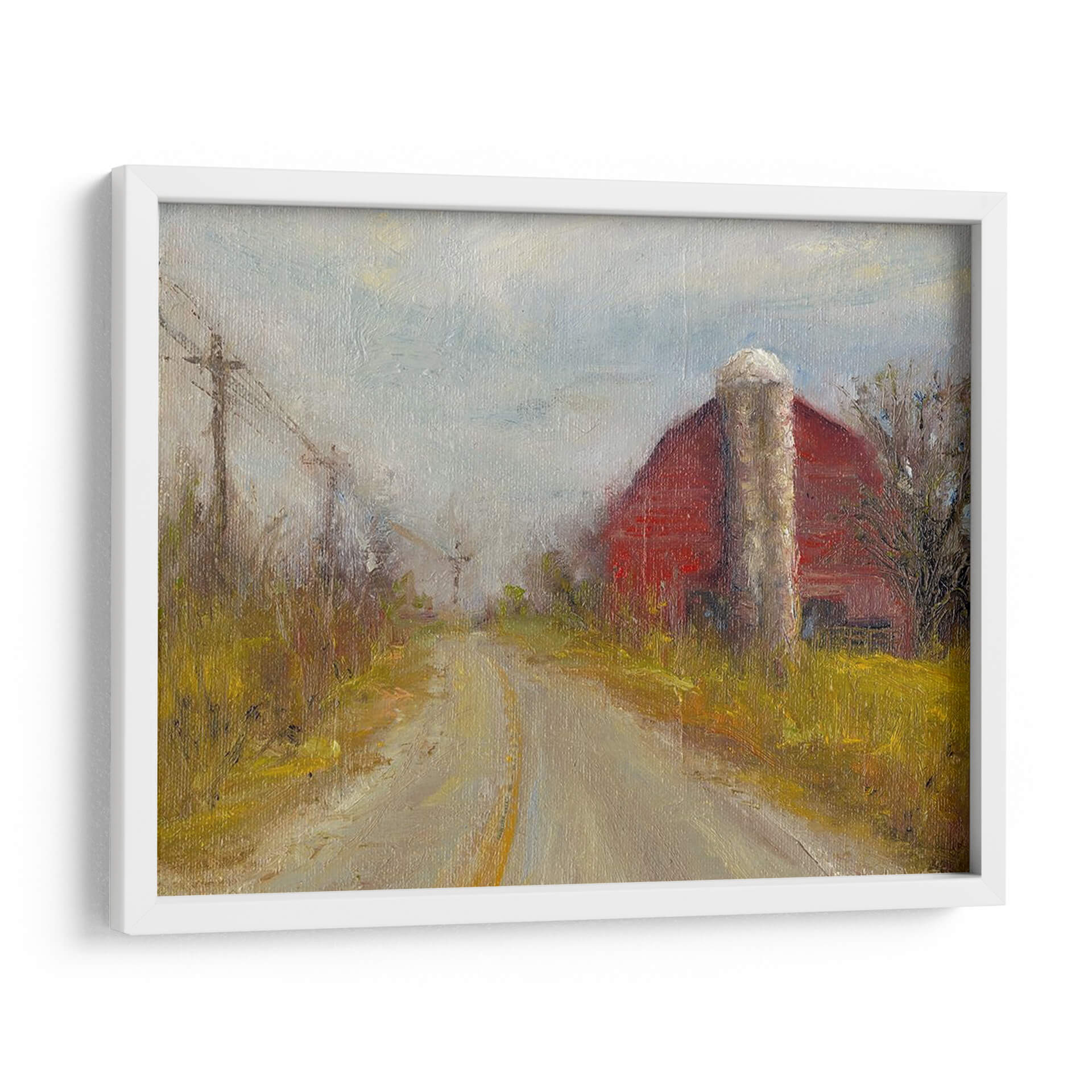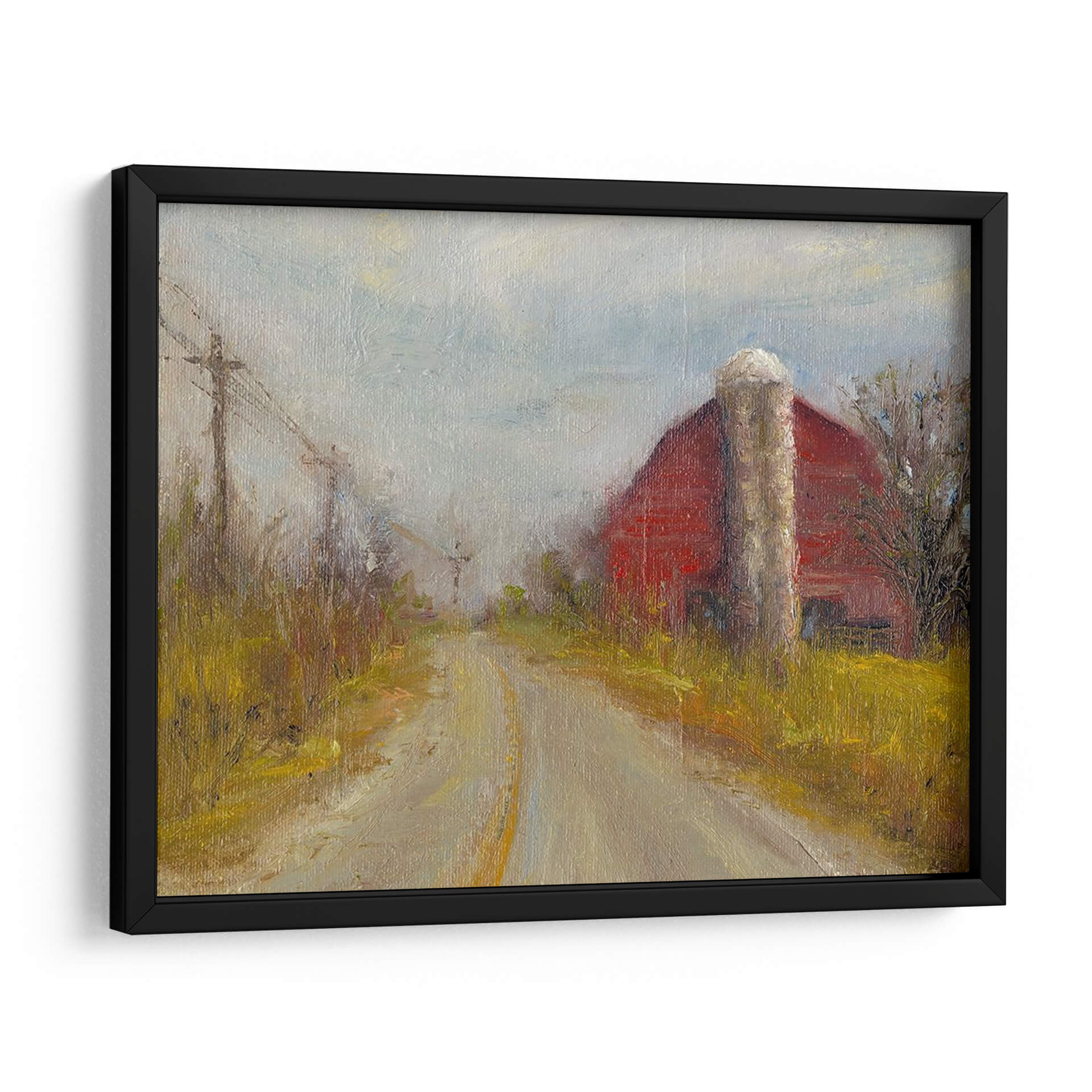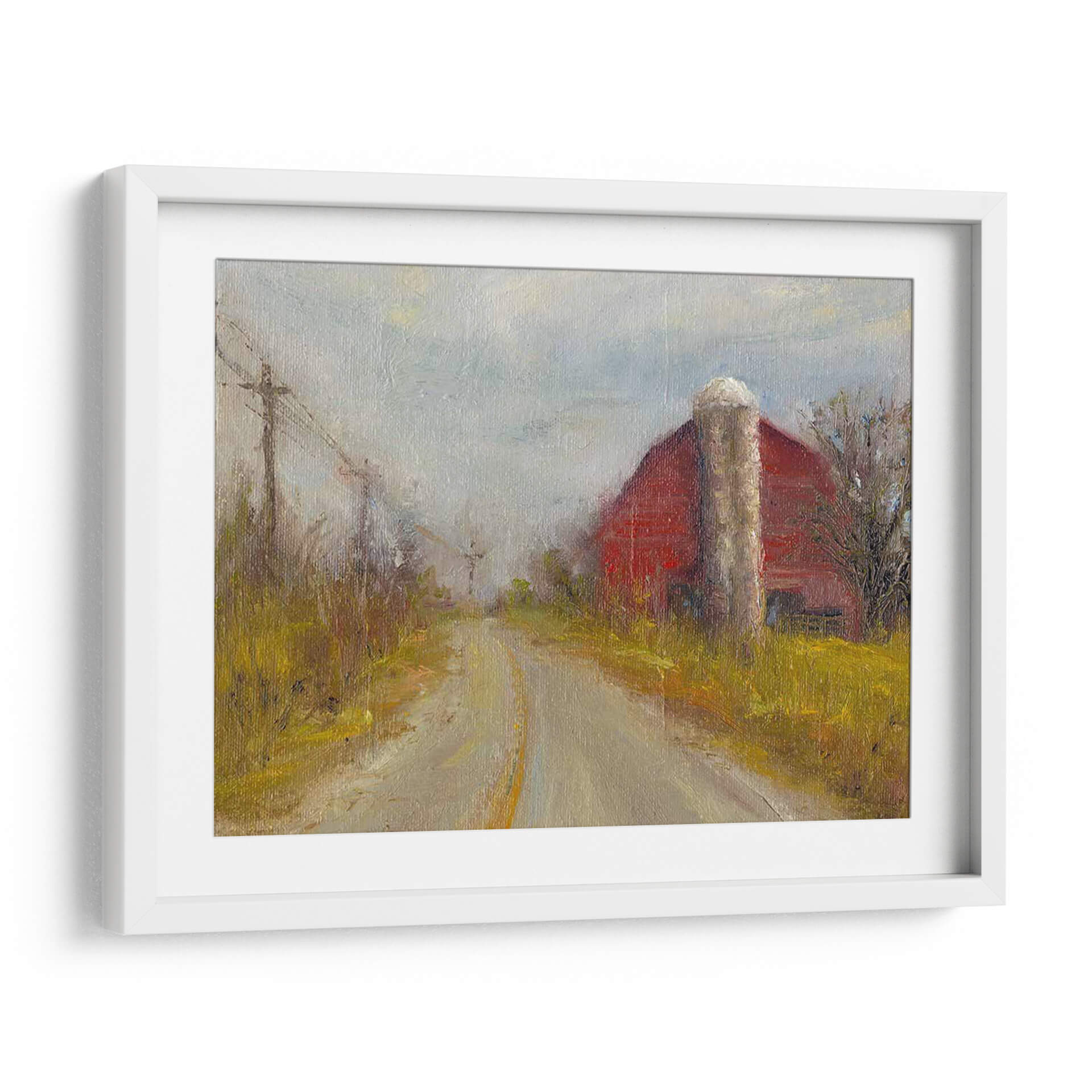 Sumérgete en la serenidad de la vida rural con "Silo De País", una evocadora obra de arte de Marilyn Wendling. Este cuadro decorativo captura la esencia de un camino de tierra que serpentea hacia un icónico granero rojo, flanqueado por un robusto silo y la vegetación otoñal. La paleta de colores, dominada por tonos tierra cálidos, ocres amarillos y el vibrante rojo del granero, crea una atmósfera nostálgica y acogedora. La pincelada impresionista de Wendling aporta textura y vida, haciendo que la luz del cielo nublado parezca filtrarse a través de la escena. La composición, con la perspectiva del camino guiando la mirada hacia el horizonte, invita a la contemplación y a la reflexión sobre la belleza de los paisajes sencillos. "Silo De País" es una pieza ideal para añadir un toque de calidez y carácter a tu sala de estar, comedor o incluso a un espacio de oficina que busque una conexión con la naturaleza y la tranquilidad. Transforma tu hogar en un refugio de paz con este lienzo que evoca recuerdos y sensaciones de un entorno campestre idílico, aportando una narrativa visual única que resuena con la simplicidad y la fuerza de la vida rural. Es una invitación a desconectar y apreciar la belleza en lo cotidiano.