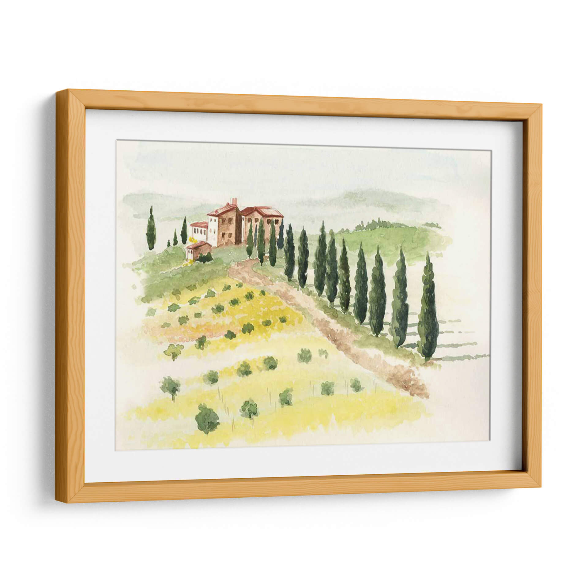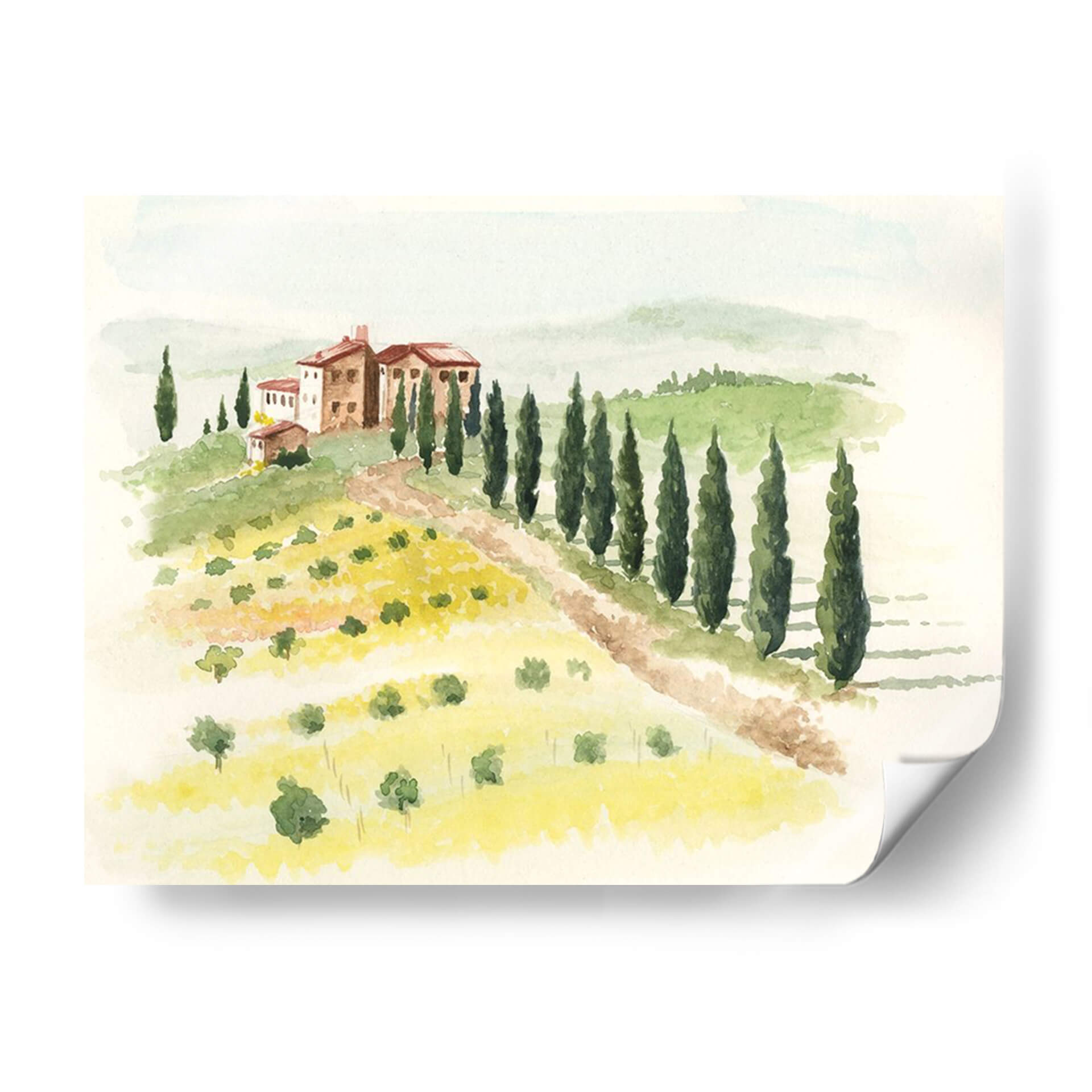 Sumérgete en la serenidad de la campiña italiana con 'Villa Toscana II', una obra de arte que captura la esencia de un idílico paisaje toscano. Realizada con una delicada técnica de acuarela, esta pieza evoca una sensación de paz y tranquilidad, transportándote a un refugio rural bañado por la luz dorada del sol. La composición presenta una encantadora villa toscana en lo alto de una colina, flanqueada por hileras de esbeltos cipreses que guían la mirada a través de campos ondulantes salpicados de vibrantes flores amarillas y olivos dispersos. La paleta de colores, dominada por tonos tierra cálidos, verdes exuberantes y toques de amarillo brillante, crea una atmósfera acogedora y nostálgica. El estilo pictórico, con sus pinceladas fluidas y suaves, imparte una cualidad etérea a la escena, ideal para añadir un toque de sofisticación rústica a tu hogar u oficina. Este cuadro decorativo es perfecto para crear un oasis de calma en tu sala de estar, aportar calidez a tu dormitorio o infundir serenidad en tu espacio de trabajo. Deja que 'Villa Toscana II' sea tu ventana a la belleza atemporal de la Toscana.