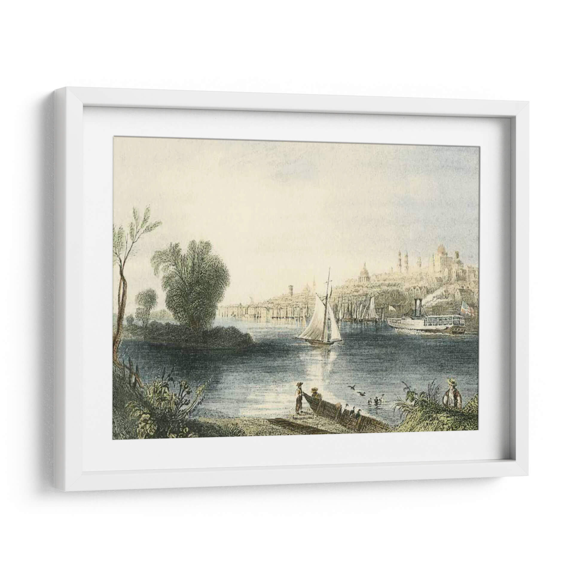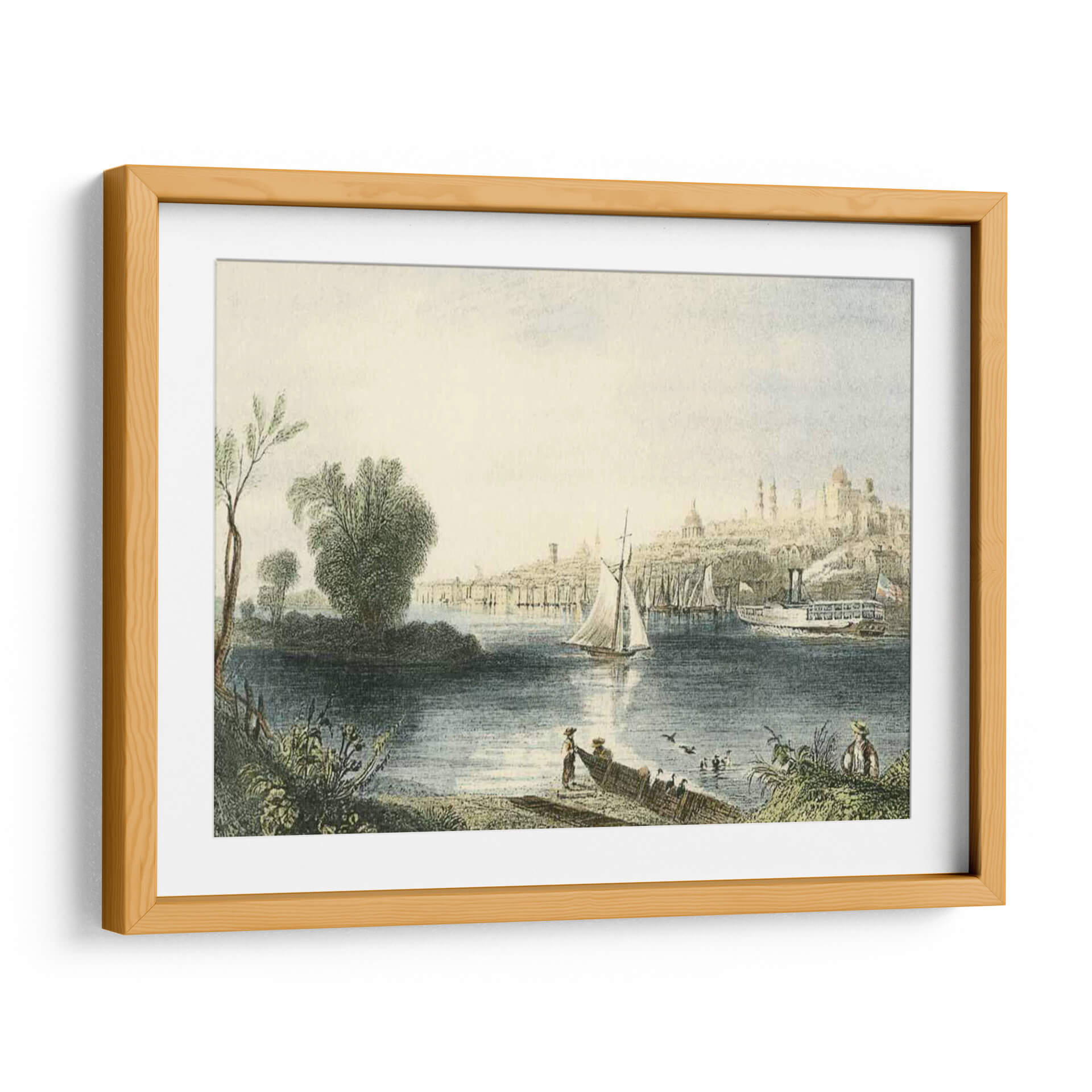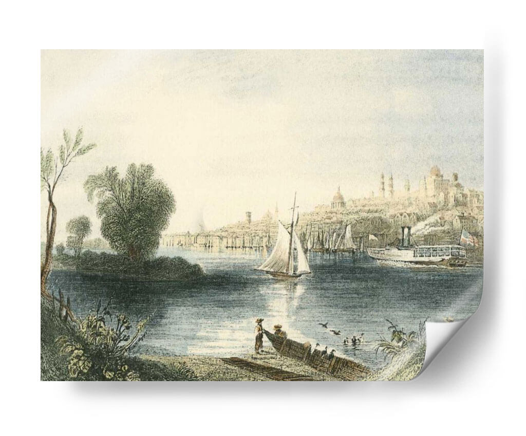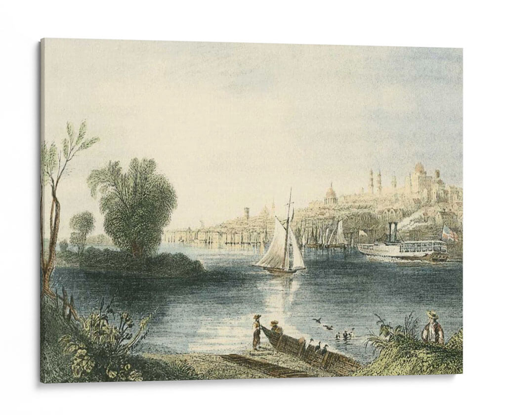 Transporta tu mente a la pintoresca orilla de Albany, Nueva York, con este cautivador cuadro decorativo que captura la esencia de una bulliciosa escena fluvial de antaño. La obra presenta una serena masa de agua, dominada por la silueta de una ciudad histórica al fondo, adornada con cúpulas y edificios que evocan un pasado de esplendor. Un elegante velero navega con gracia, mientras que un imponente barco de vapor traza una estela en las tranquilas aguas, sugiriendo un vibrante comercio y movimiento. La paleta de colores, compuesta por suaves tonos azules para el agua, verdes terrosos para la vegetación ribereña y blancos y ocres para la arquitectura urbana, crea una atmósfera de calma y nostalgia. La composición detallada, con figuras humanas en primer plano observando el paisaje y aves revoloteando, añade un toque de vida y perspectiva a la escena. Este cuadro decorativo es ideal para añadir un toque de historia y serenidad a tu sala de estar, estudio u oficina, invitando a la contemplación y al aprecio por la belleza del paisaje urbano histórico y la navegación.
