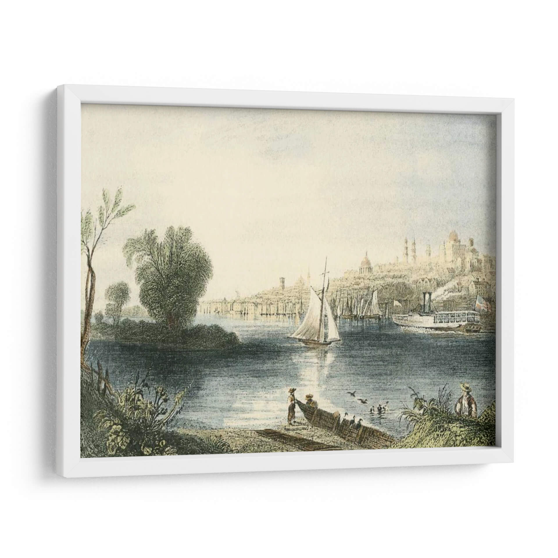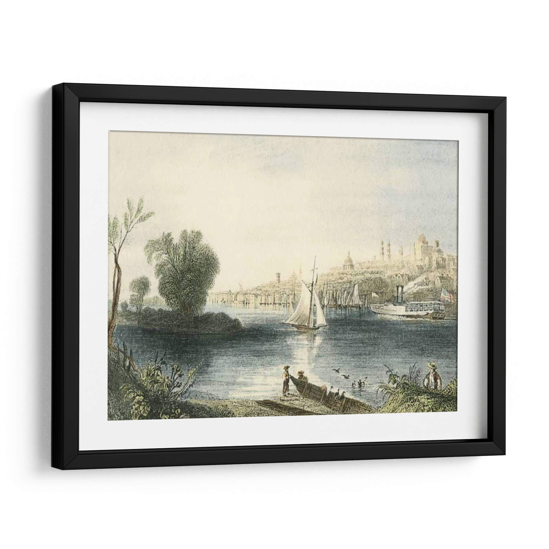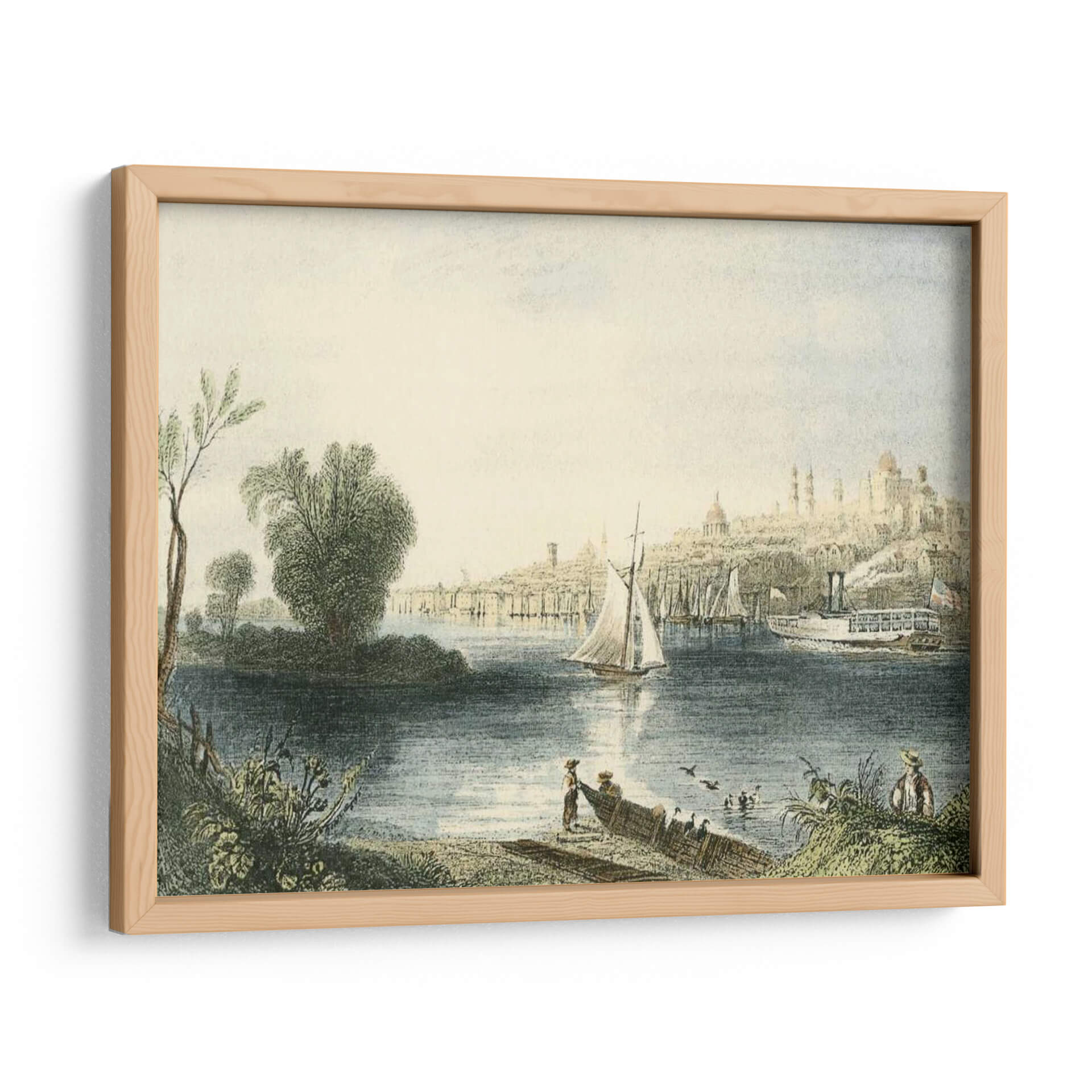 Transporta tu mente a la pintoresca orilla de Albany, Nueva York, con este cautivador cuadro decorativo que captura la esencia de una bulliciosa escena fluvial de antaño. La obra presenta una serena masa de agua, dominada por la silueta de una ciudad histórica al fondo, adornada con cúpulas y edificios que evocan un pasado de esplendor. Un elegante velero navega con gracia, mientras que un imponente barco de vapor traza una estela en las tranquilas aguas, sugiriendo un vibrante comercio y movimiento. La paleta de colores, compuesta por suaves tonos azules para el agua, verdes terrosos para la vegetación ribereña y blancos y ocres para la arquitectura urbana, crea una atmósfera de calma y nostalgia. La composición detallada, con figuras humanas en primer plano observando el paisaje y aves revoloteando, añade un toque de vida y perspectiva a la escena. Este cuadro decorativo es ideal para añadir un toque de historia y serenidad a tu sala de estar, estudio u oficina, invitando a la contemplación y al aprecio por la belleza del paisaje urbano histórico y la navegación.