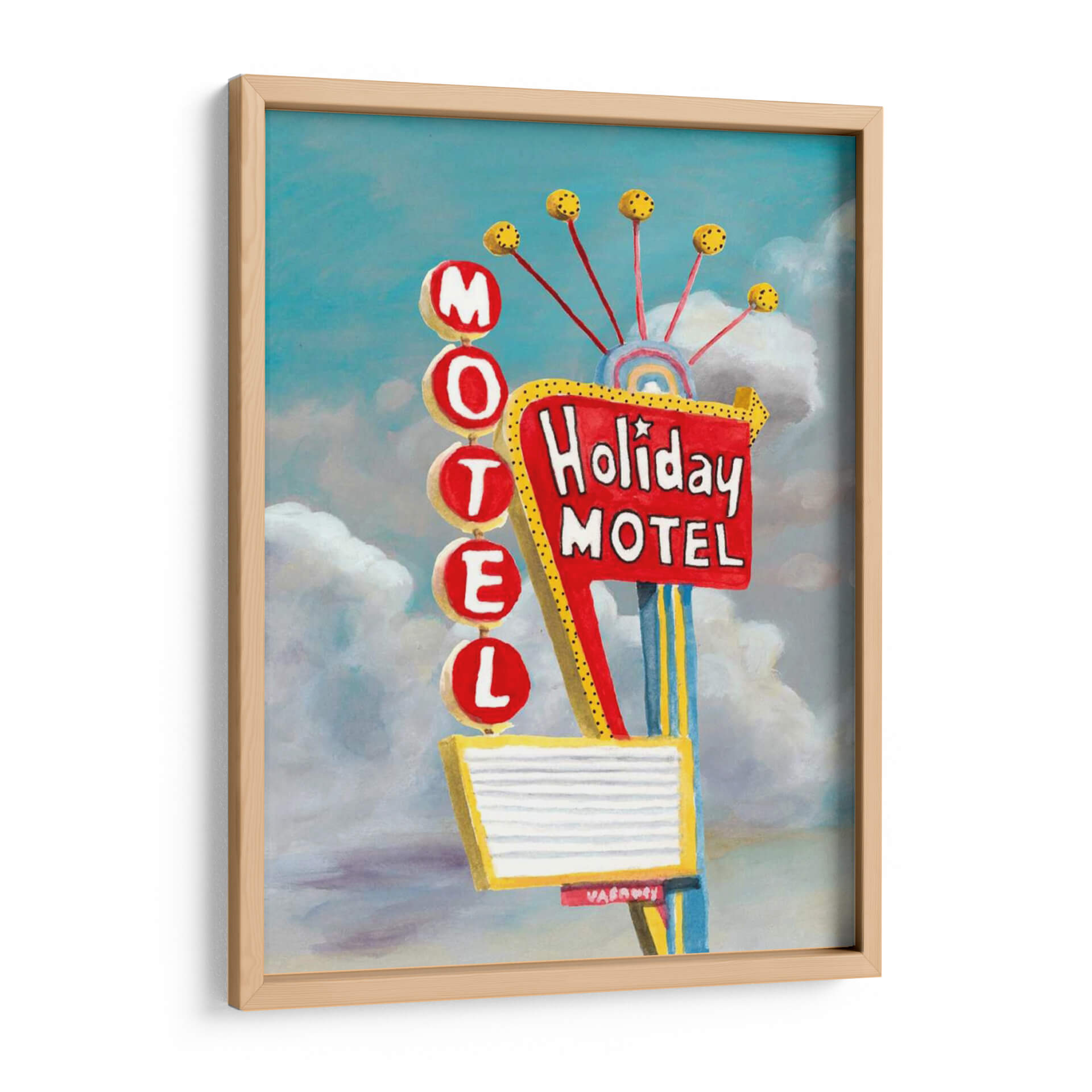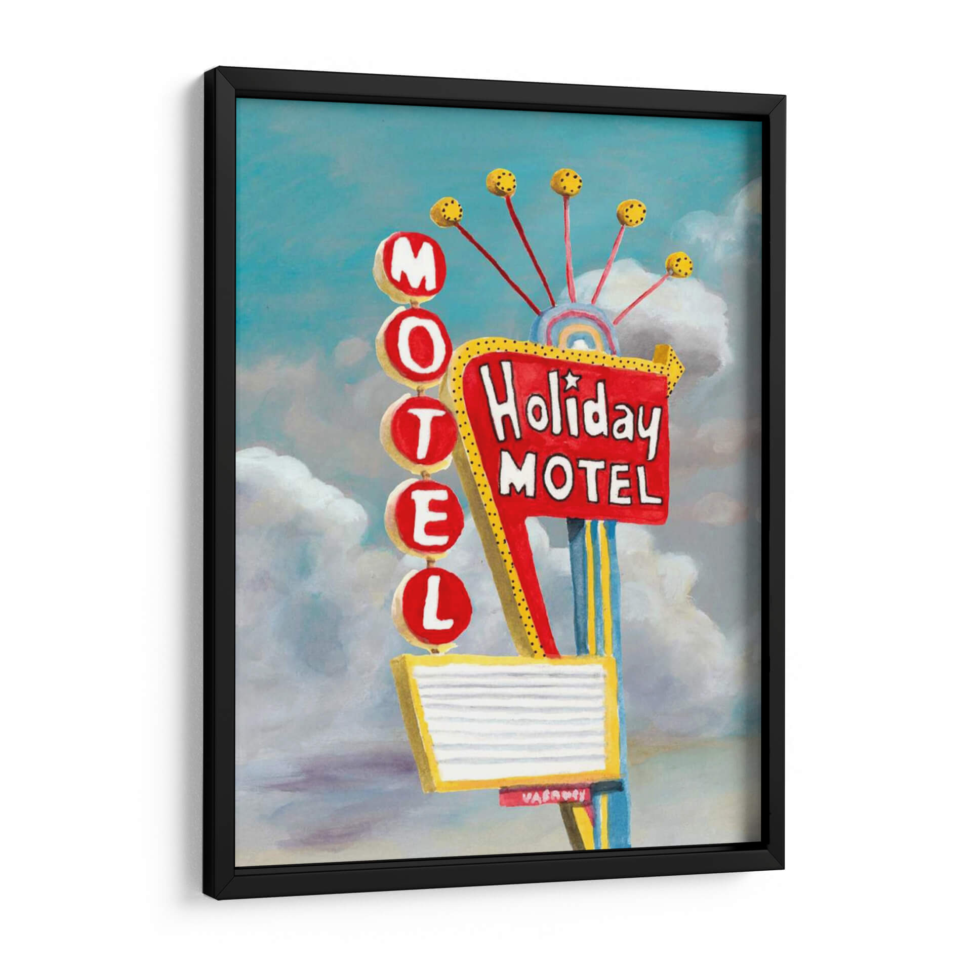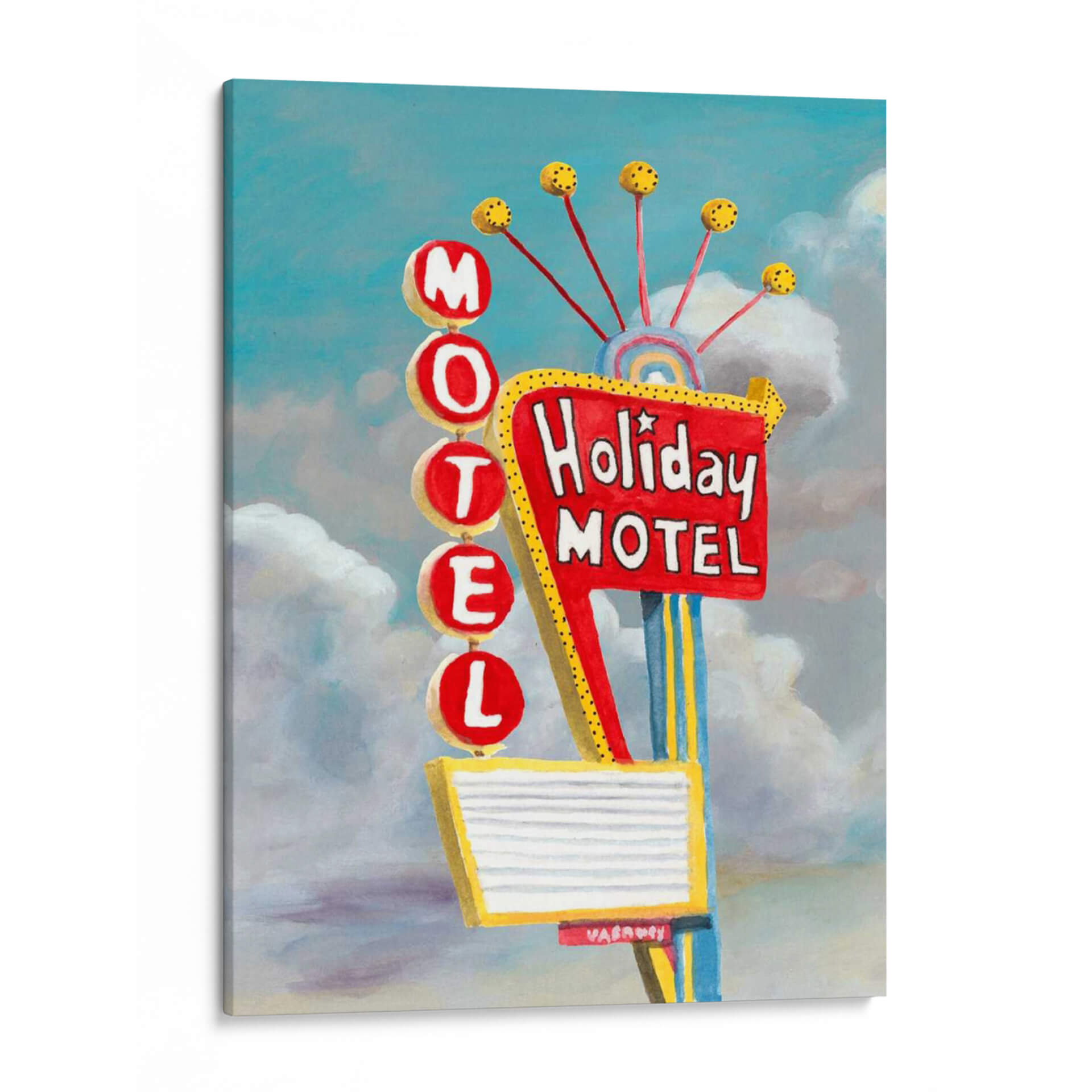 Revive la nostalgia y el encanto de la carretera con "American Roadside IV", una cautivadora obra de arte de Naomi McCavitt. Esta pieza evoca la icónica estética de los moteles de carretera de antaño, capturando la esencia de la aventura y el descubrimiento a lo largo de las vastas autopistas americanas. Los vibrantes colores, liderados por el rojo audaz de los letreros y el azul sereno del cielo, crean un contraste llamativo que atrae la mirada. La composición, centrada en el llamativo letrero del motel "Holiday Motel" y la secuencia vertical de luces circulares, transmite una sensación de bienvenida y promesa. Las nubes difuminadas en el fondo añaden una atmósfera etérea y soñadora, sugiriendo la infinidad de posibilidades que ofrece un viaje por carretera. El estilo pictórico de McCavitt, con sus trazos visibles y una paleta de colores rica, aporta una textura y calidez únicas a la escena. Este cuadro decorativo es perfecto para añadir un toque retro y lleno de carácter a cualquier espacio, desde una sala de estar moderna hasta un estudio o un rincón dedicado a la nostalgia. "American Roadside IV" no es solo una imagen, es una invitación a un viaje al pasado y a la libertad de la carretera abierta, ideal para quienes buscan arte con personalidad y una historia que contar. Su estilo único lo convierte en un punto focal ideal para espacios que buscan un acento nostálgico y vibrante.