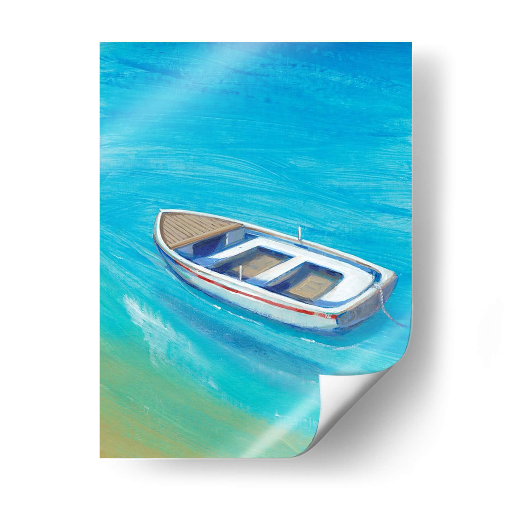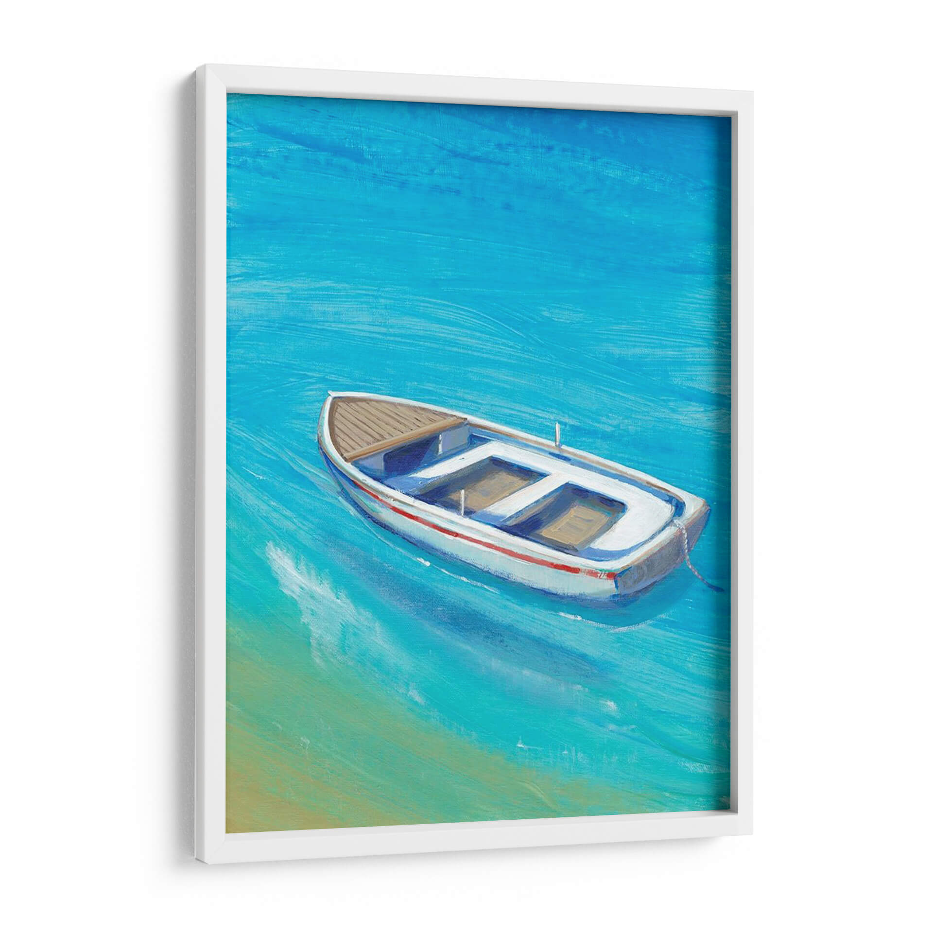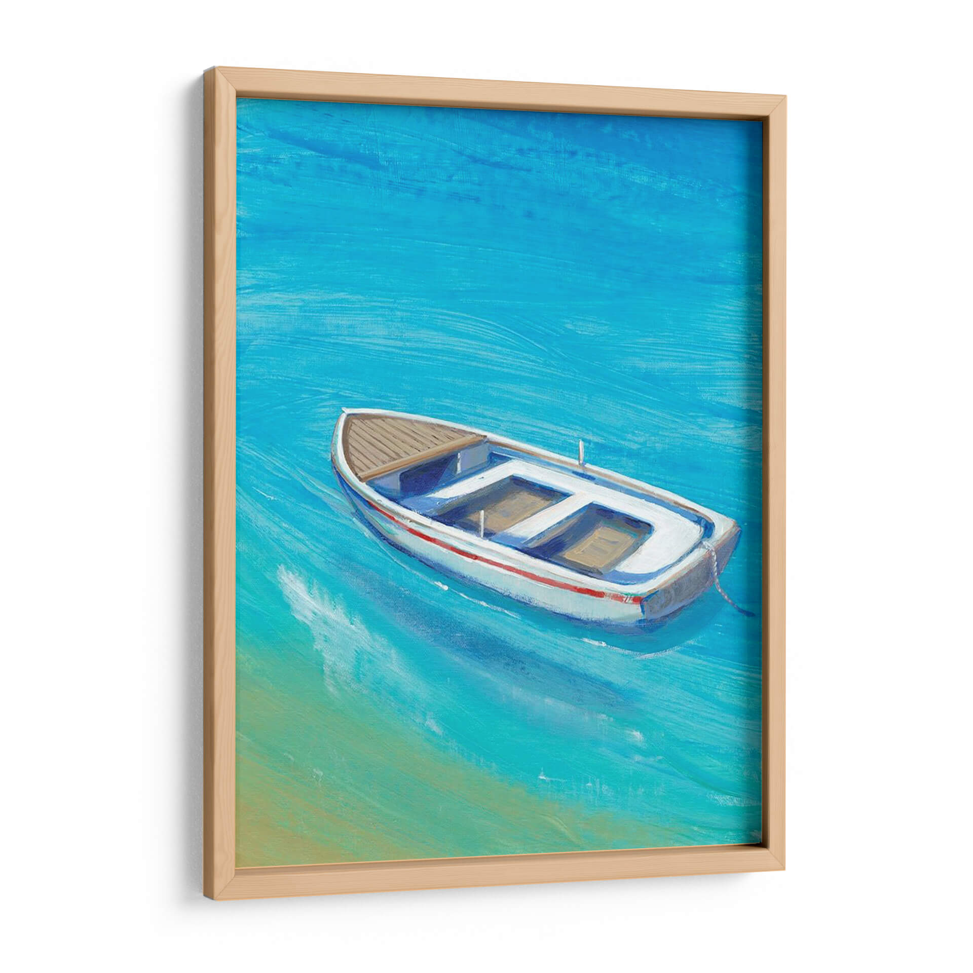 Sumérgete en la serenidad del mar con 'Anclada Sucio I', una obra de arte que captura la esencia de un día tranquilo junto al agua. Este cuadro decorativo presenta una embarcación solitaria flotando en aguas cristalinas de un vibrante tono azul turquesa, con sutiles pinceladas que evocan el movimiento suave de las olas. La paleta de colores, dominada por azules intensos y toques de arena dorada, crea una atmósfera de paz y evasión, transportando al espectador a un paraíso costero. La composición, centrada en el bote blanco con detalles en rojo y madera, invita a la contemplación y a la reflexión sobre la calma de la soledad. Ideal para salones modernos, dormitorios o incluso oficinas, 'Anclada Sucio I' es la pieza perfecta para añadir un toque de frescura y tranquilidad a cualquier espacio. Su estilo evocador y su temática marinera la convierten en una adición versátil y atemporal a tu colección de arte de pared, ideal para quienes buscan una conexión visual con la naturaleza y la serenidad.