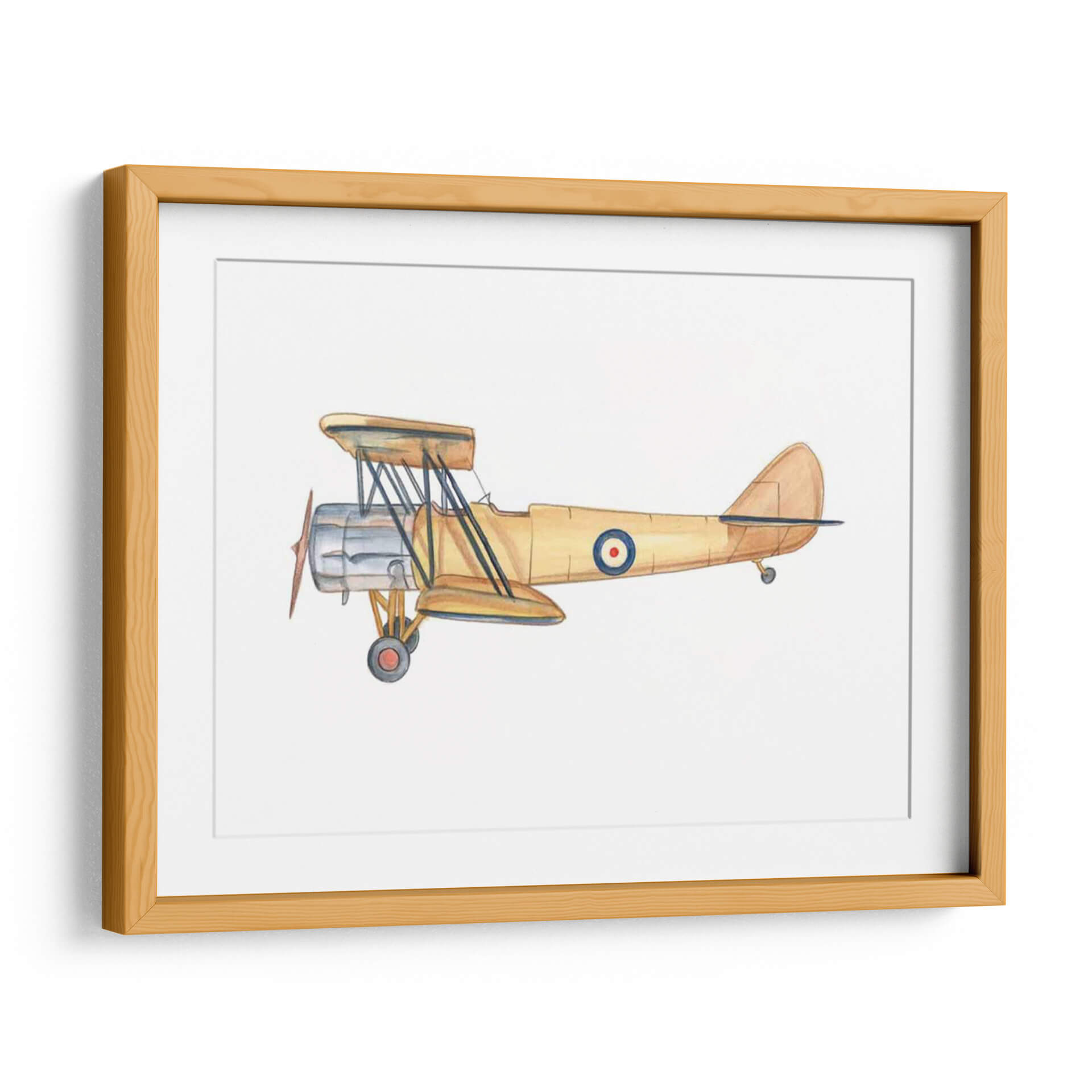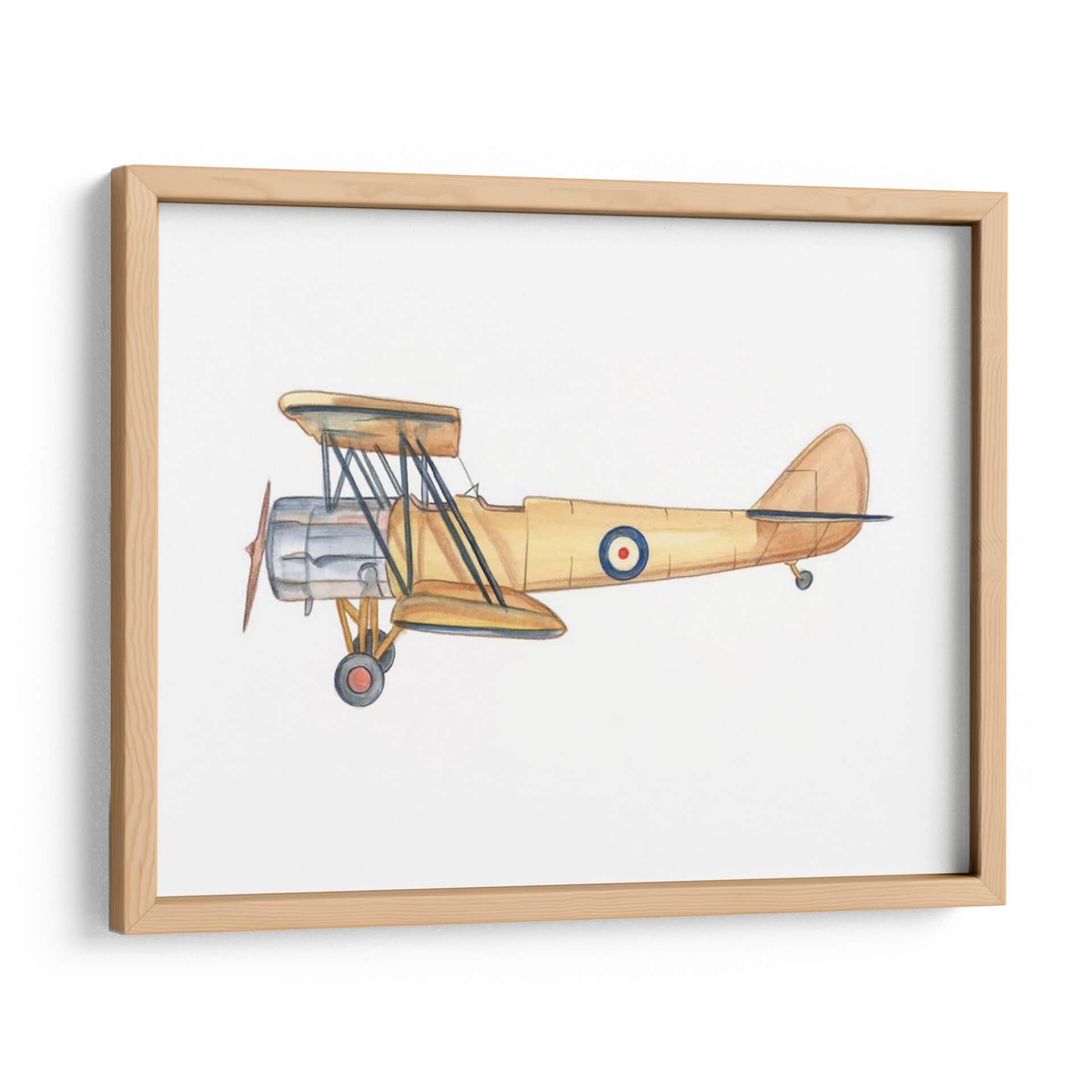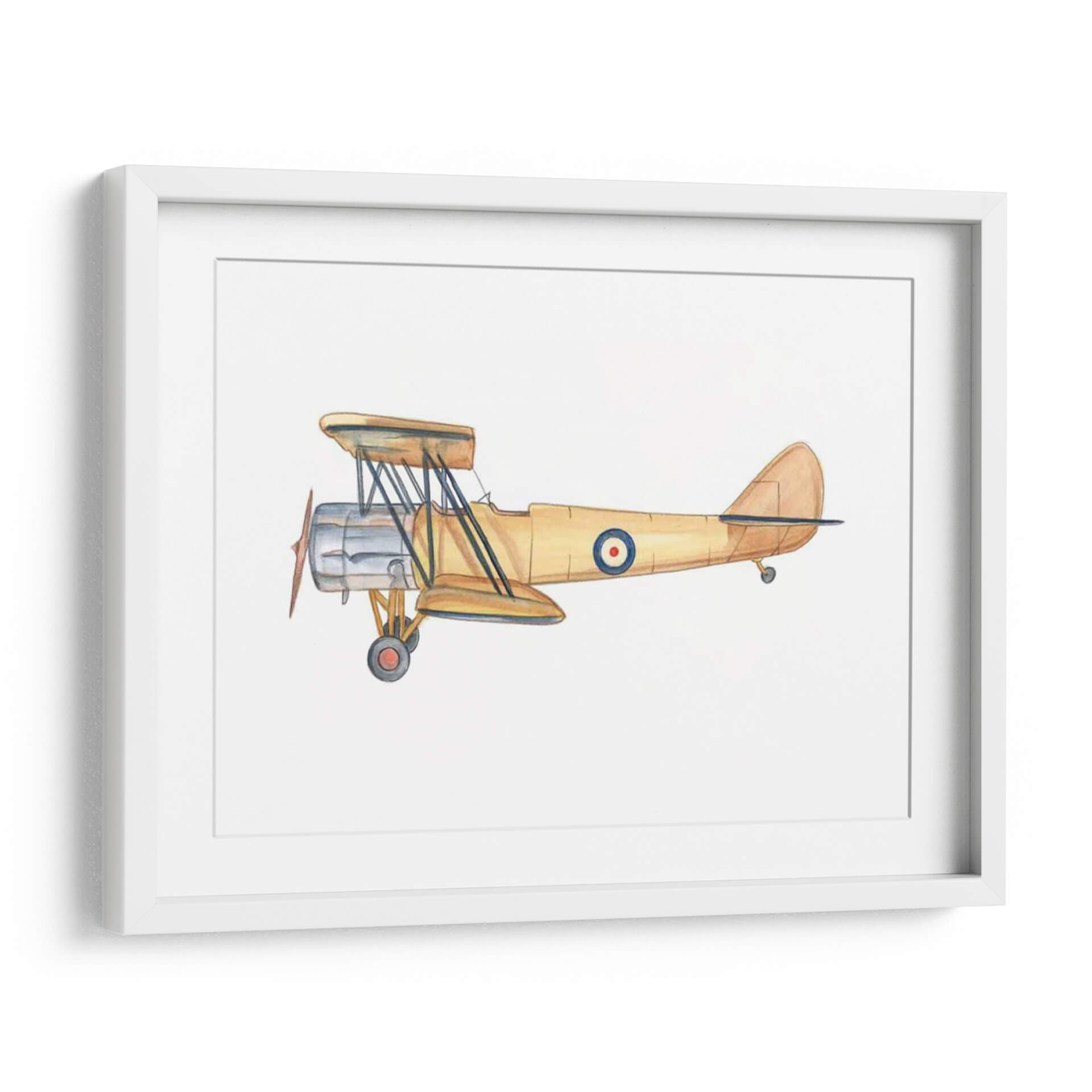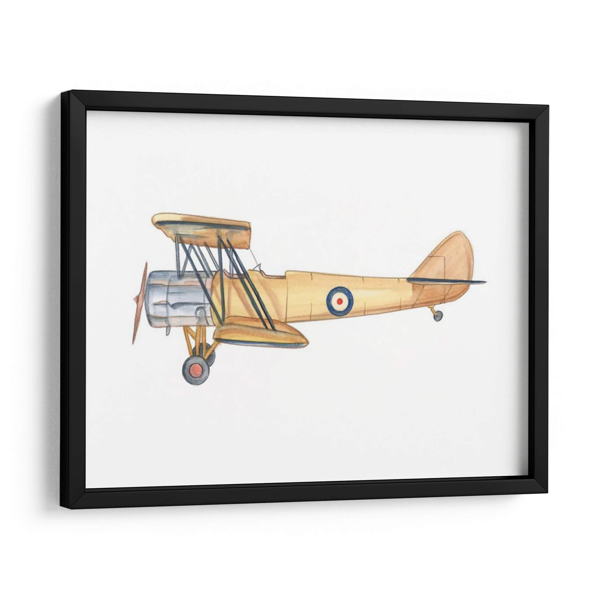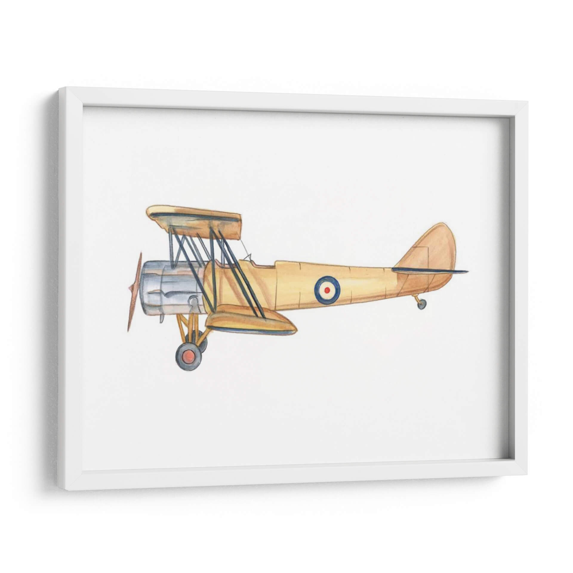 Capture la esencia de la aventura y la nostalgia con este evocador cuadro decorativo de un biplano clásico. La obra, titulada "Cielos Despejados III" por el artista Ethan Harper, presenta una detallada ilustración de una aeronave vintage en tonos tierra cálidos, predominantemente amarillos y ocres, con toques de plata metálica en el motor y un distintivo círculo azul y rojo en el fuselaje. La técnica acuarela aporta una suavidad y un encanto atemporal a la pieza, creando una atmósfera de ligereza y exploración. Este cuadro decorativo es perfecto para añadir un toque de carácter y estilo retro a cualquier espacio, desde una oficina en casa hasta la habitación de un entusiasta de la aviación. Su composición centrada y el fondo blanco puro hacen que el biplano sea el único protagonista, invitando a la contemplación de épocas pasadas y sueños de vuelo. Ideal para quienes buscan una pieza decorativa con historia y personalidad, este arte de pared transformará tu hogar u oficina en un santuario de inspiración y buen gusto.